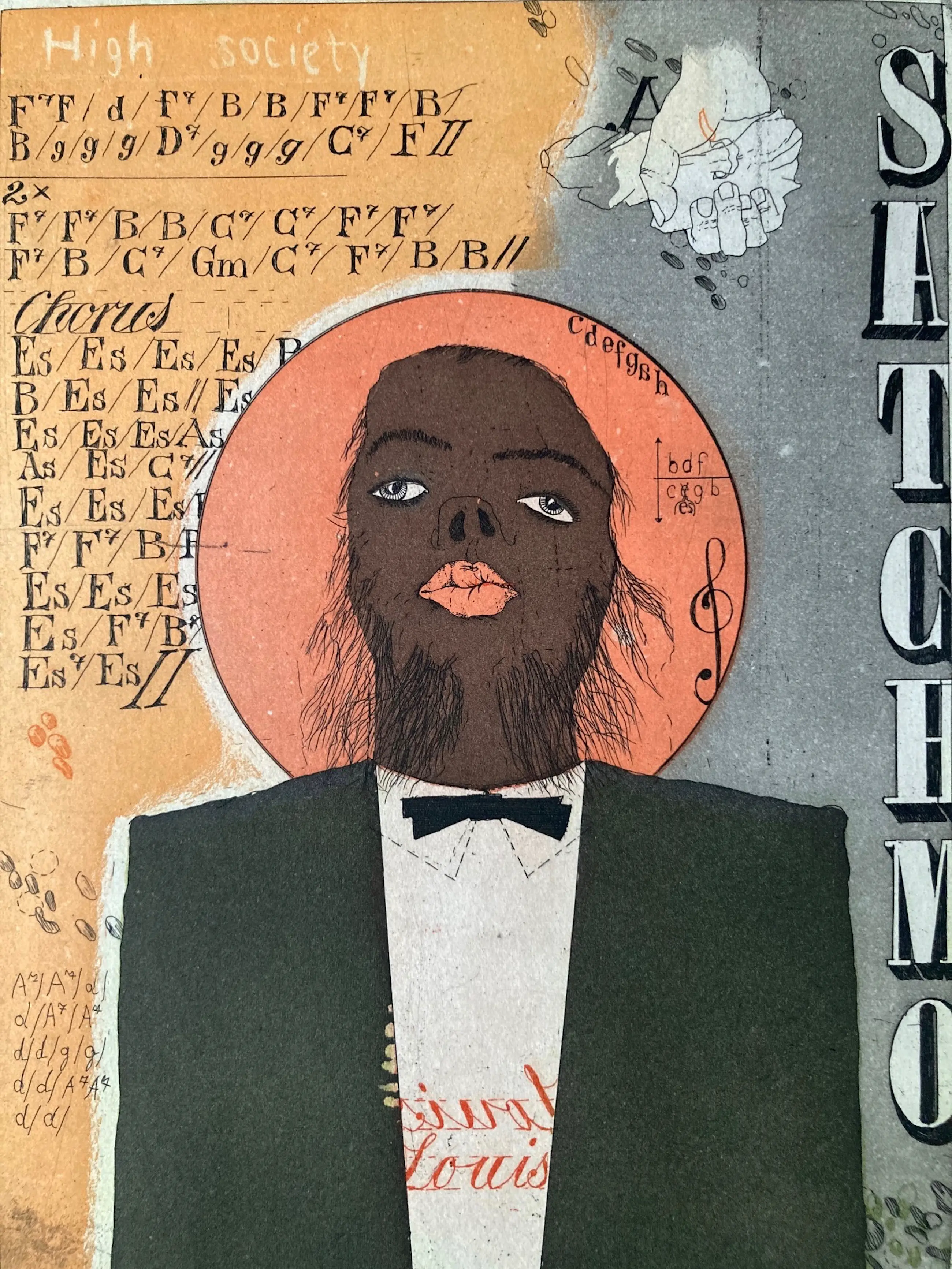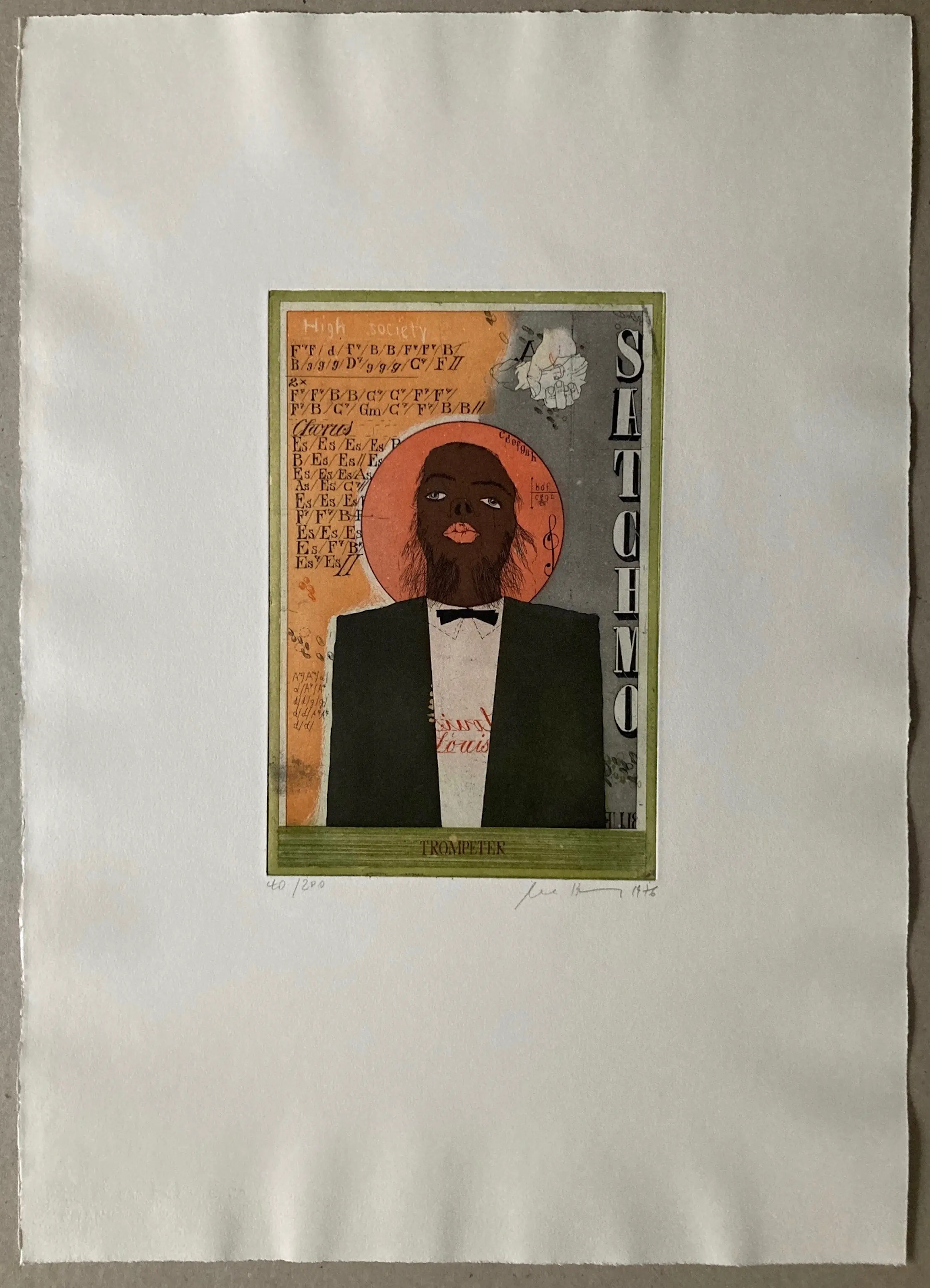 Een motief dat typerend is voor Uwe Bremer, de meester van de fantastische kunst: een portret van Louis Armstrong, maar op de een of andere manier ook van de kunstenaar zelf. Uitgebreid vervaardigd werk 63 x 45 cm (blad) 29,5 x 20 cm (bord) Heel goede staat