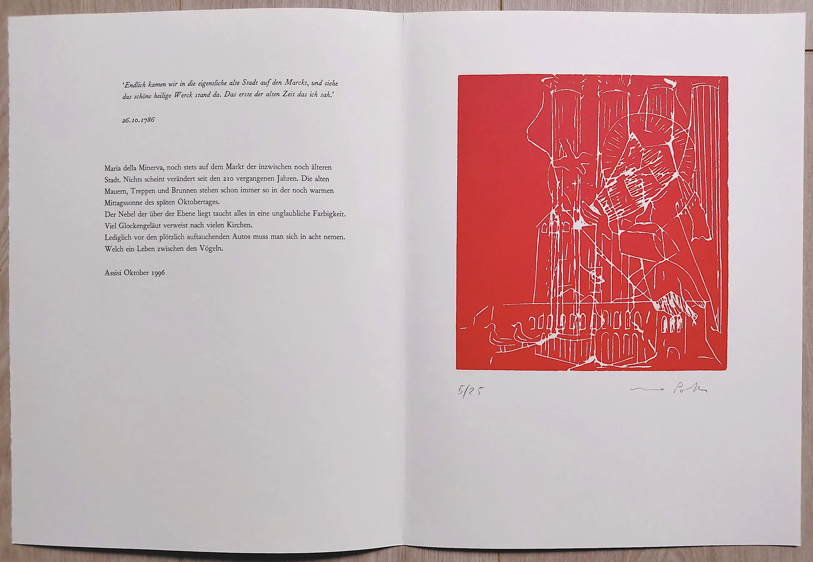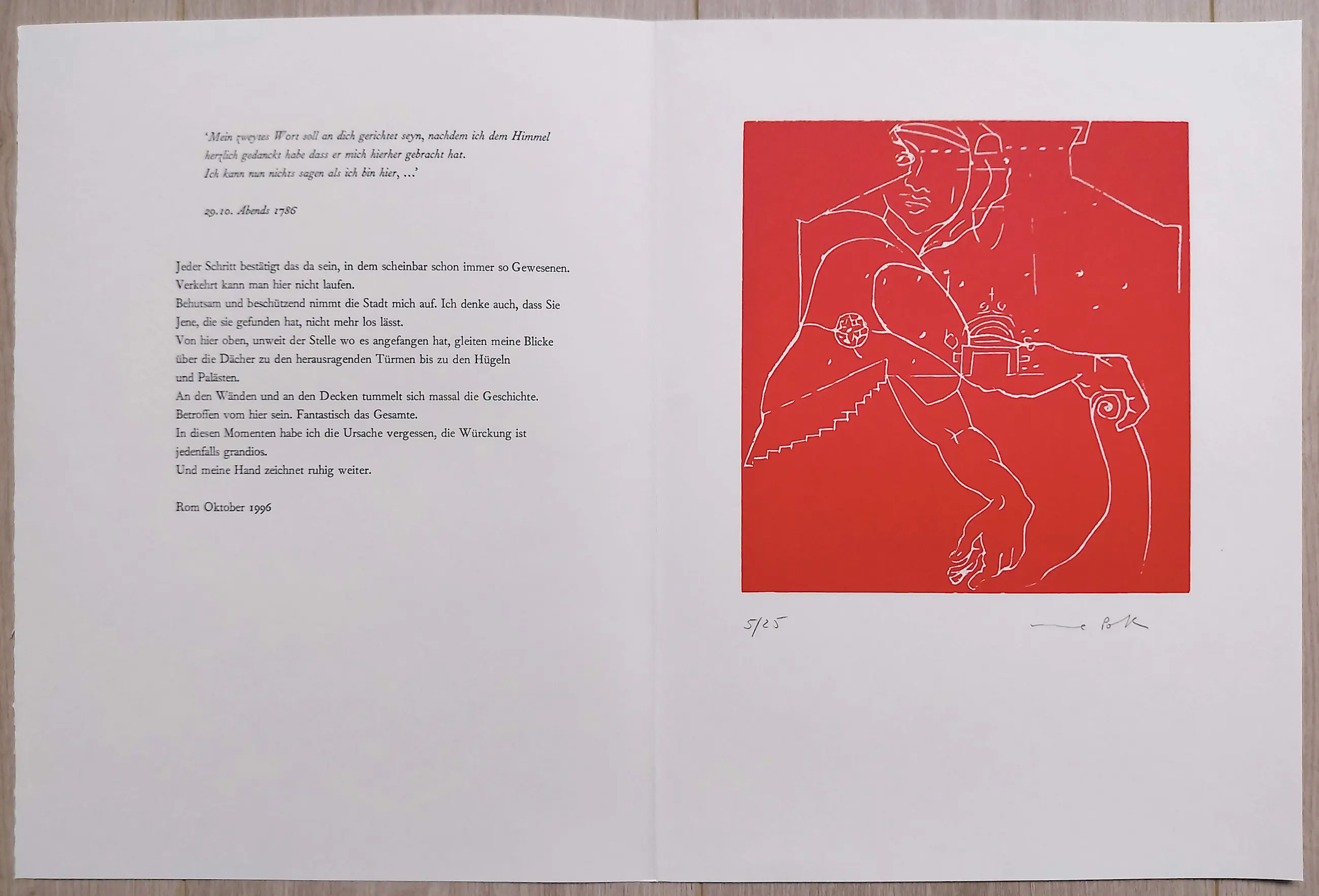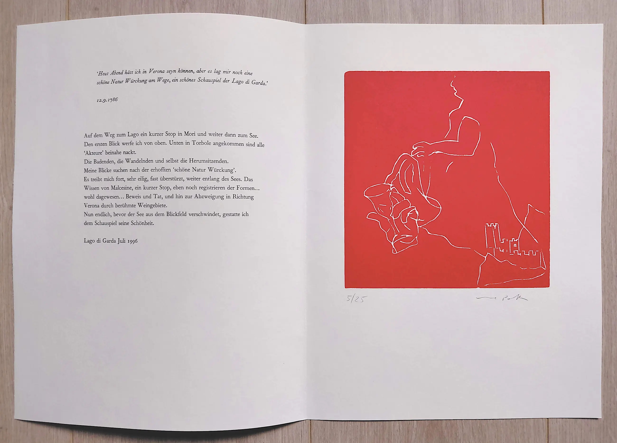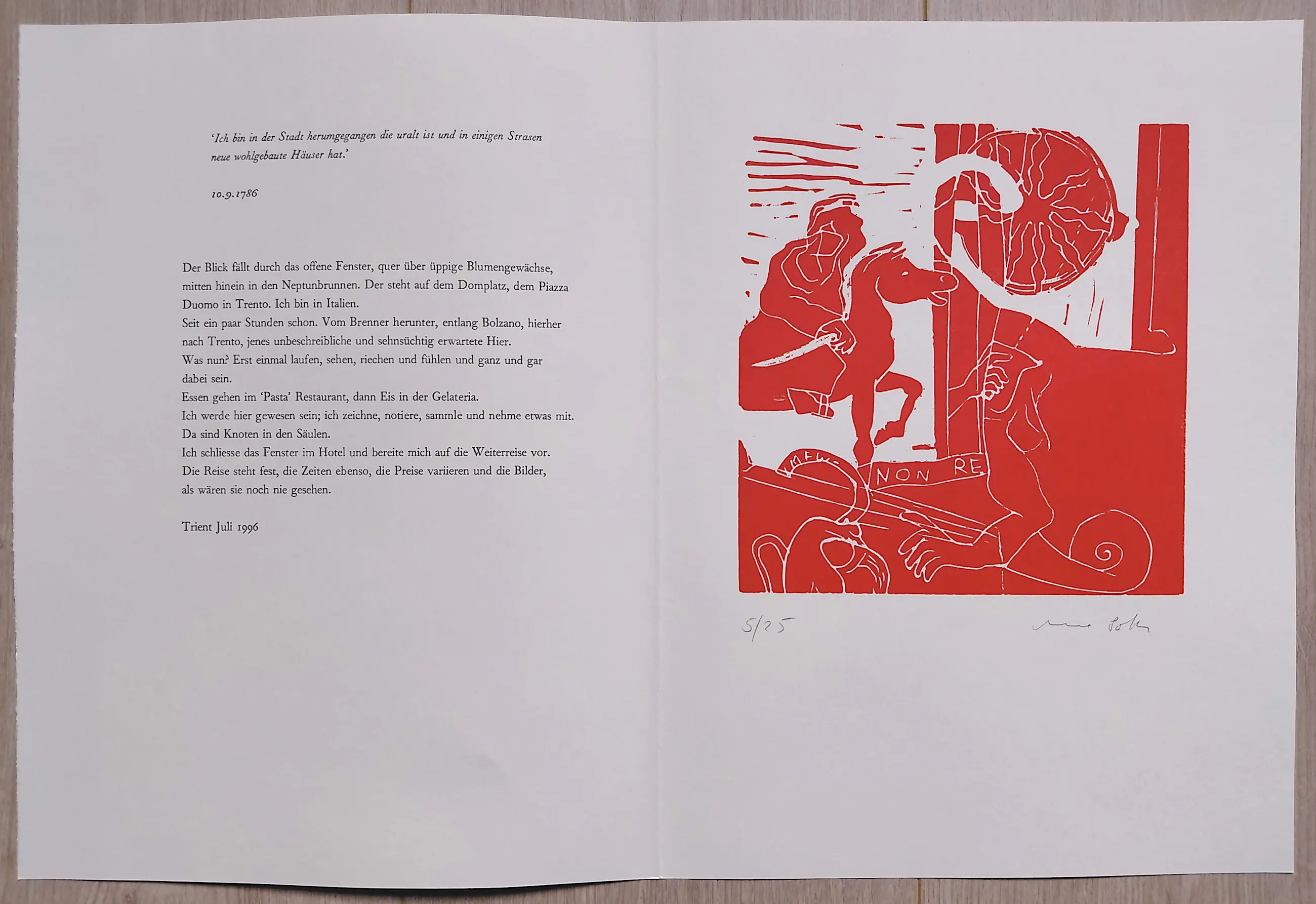 Elke linosnede op geschept papier is met potlood gesigneerd en genummerd (5/25) en wordt begeleid door een fragment uit het reisverslag van Goethe en een fragment van het reisverslag van Poth zelf. In mint conditie.