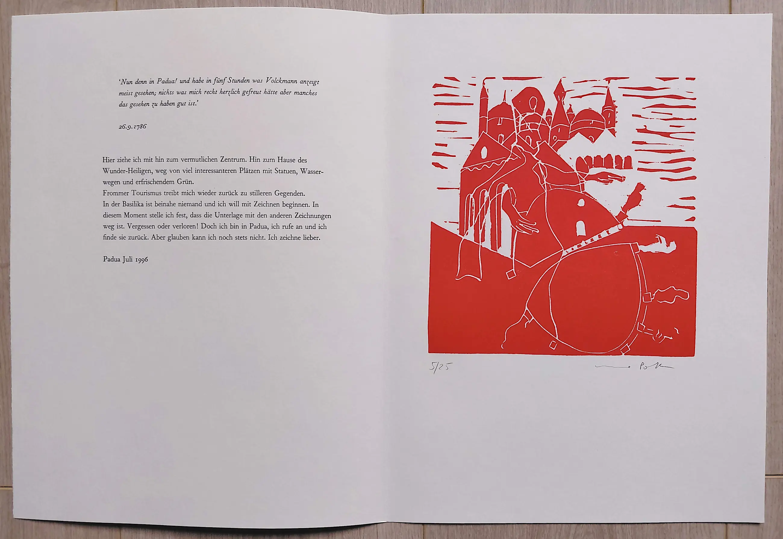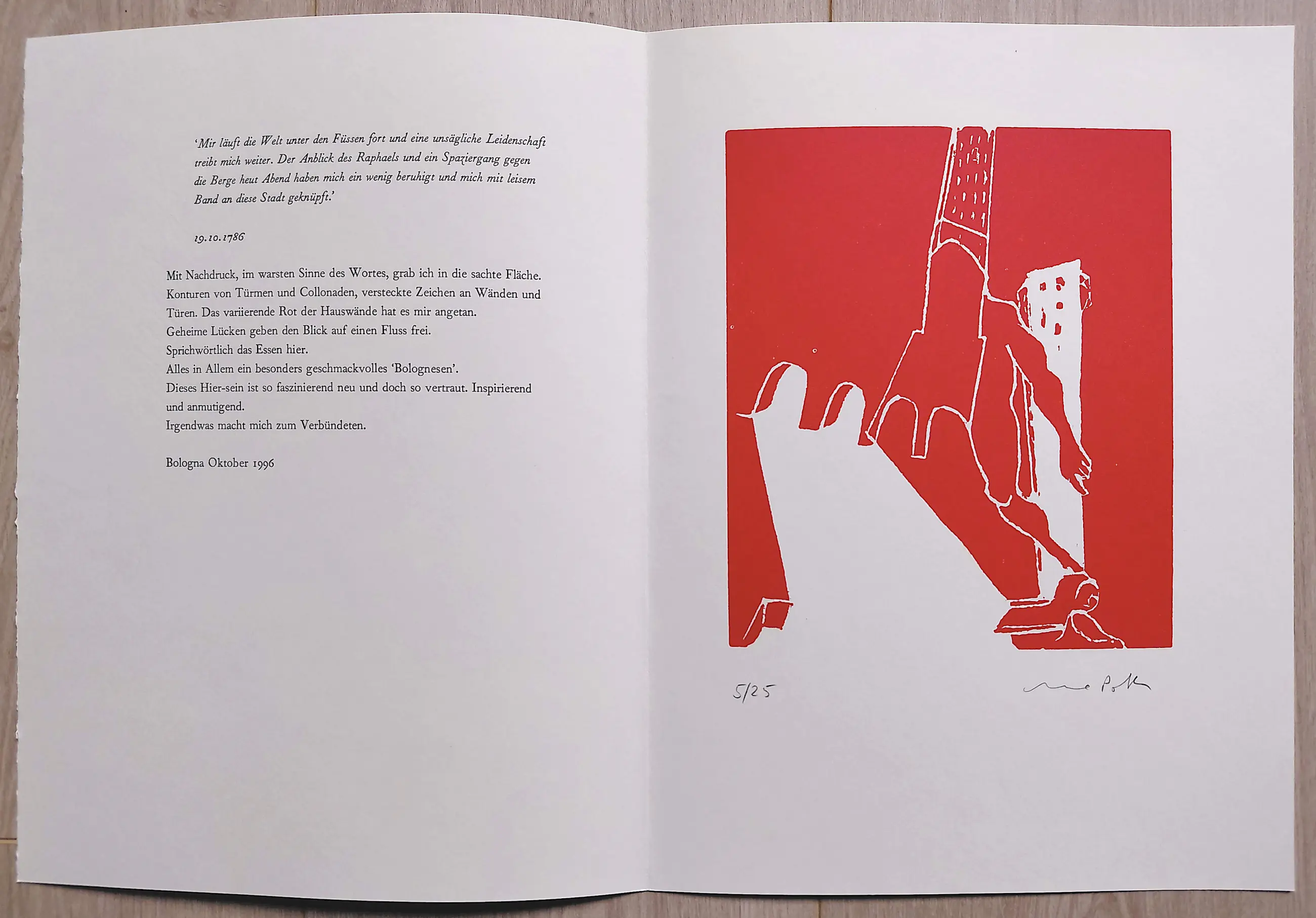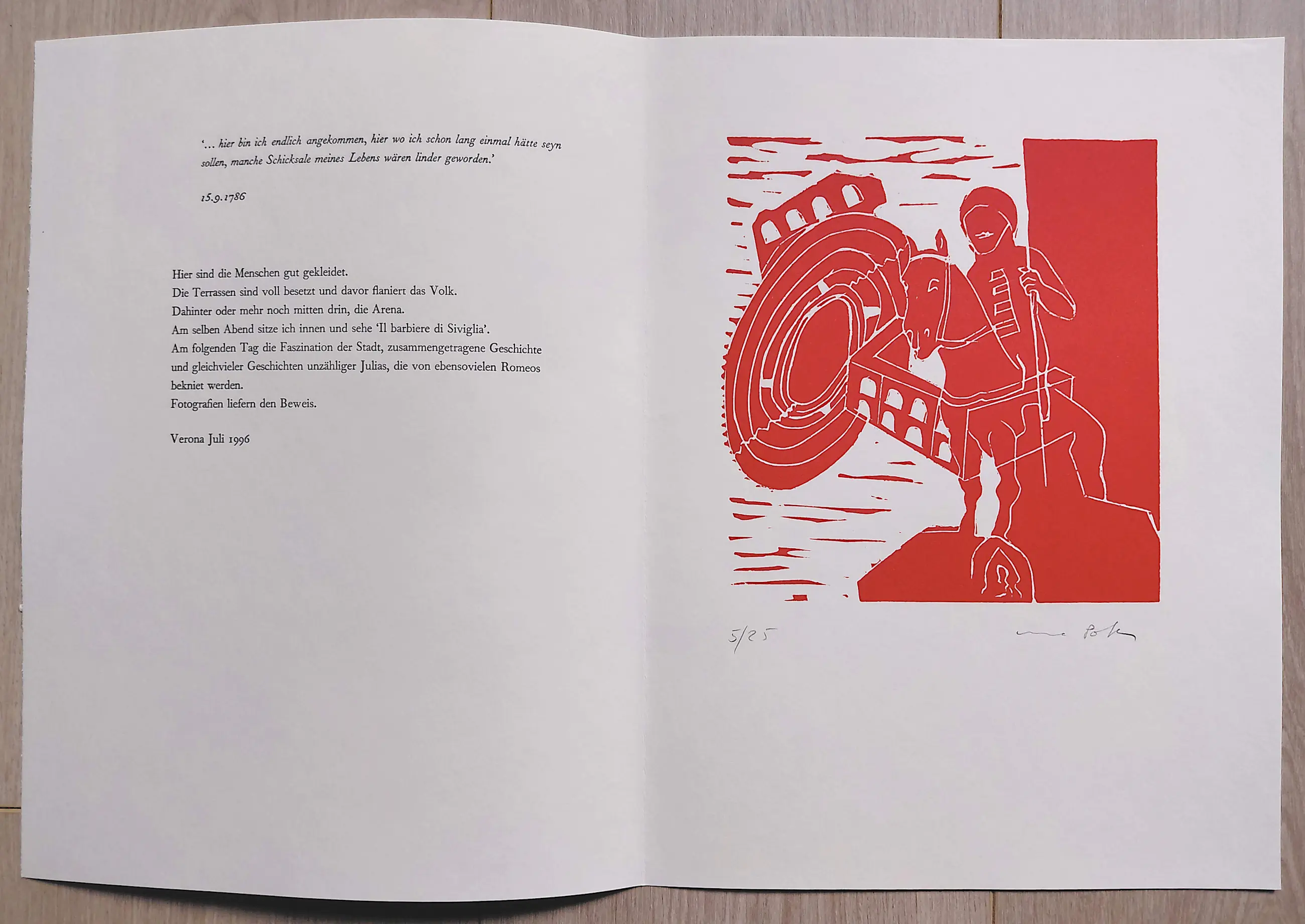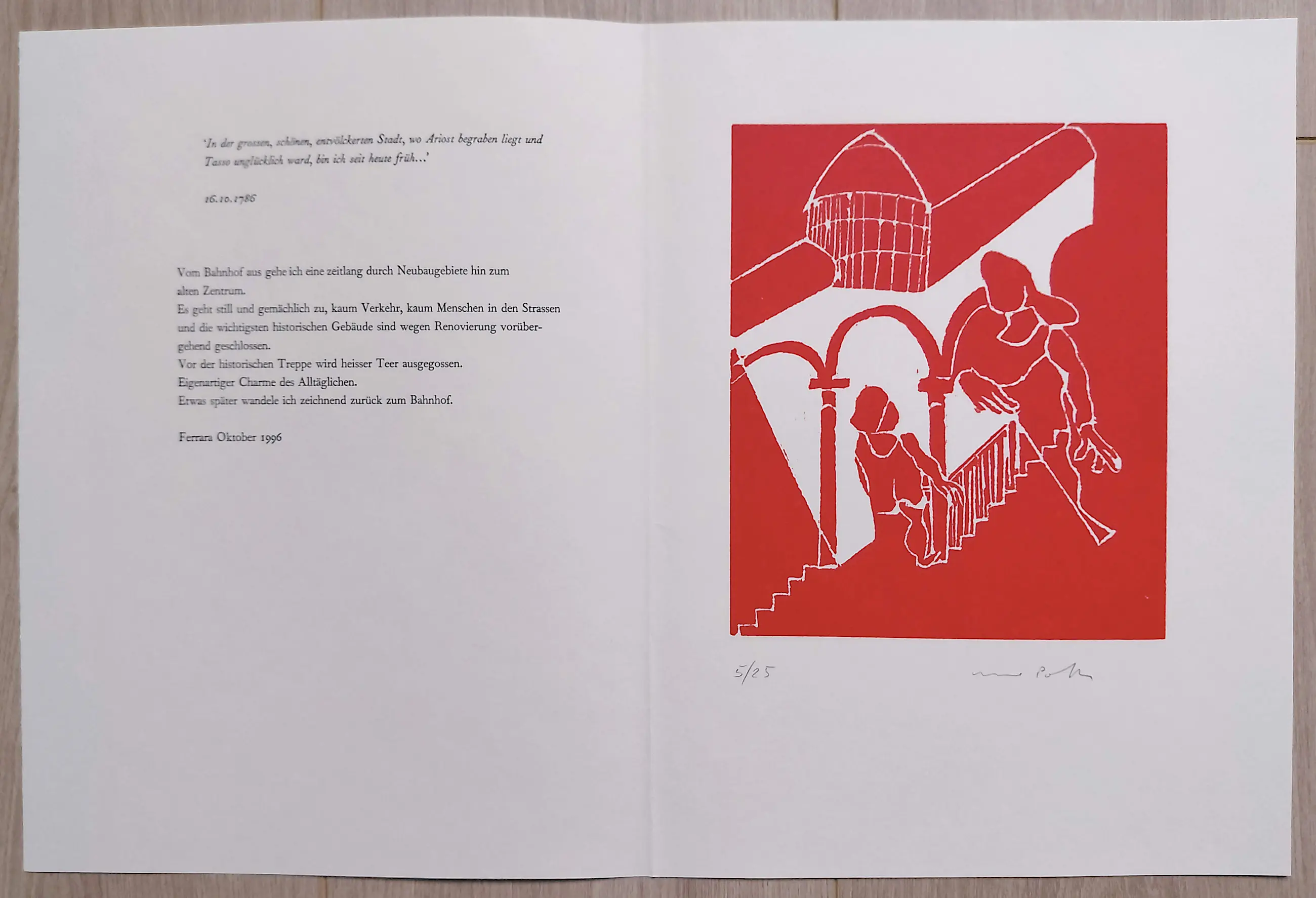Elke linosnede op geschept papier is met potlood gesigneerd en genummerd (5/25) en wordt begeleid door een fragment uit het reisverslag van Goethe en een fragment van het reisverslag van Poth zelf. In mint conditie.