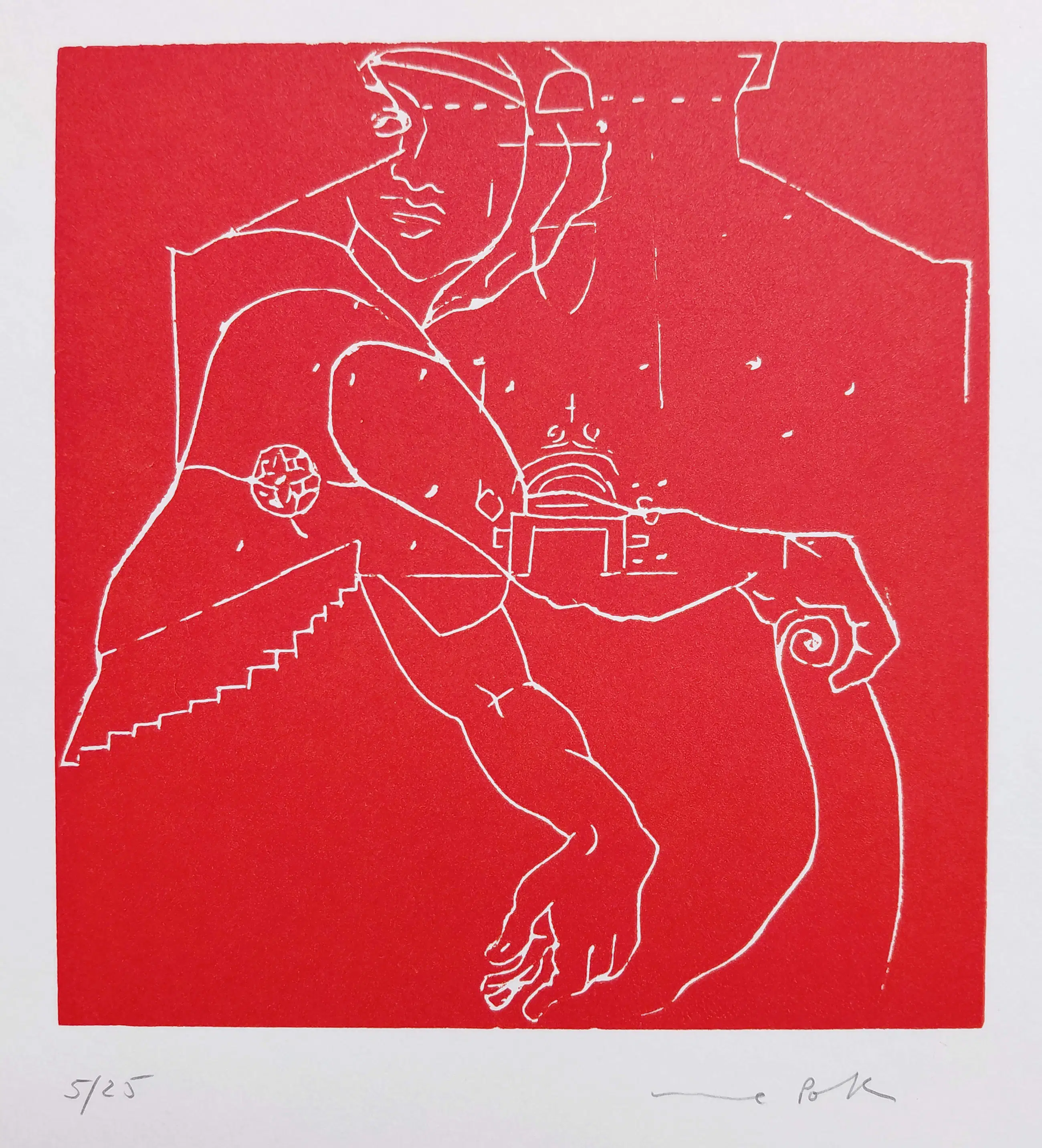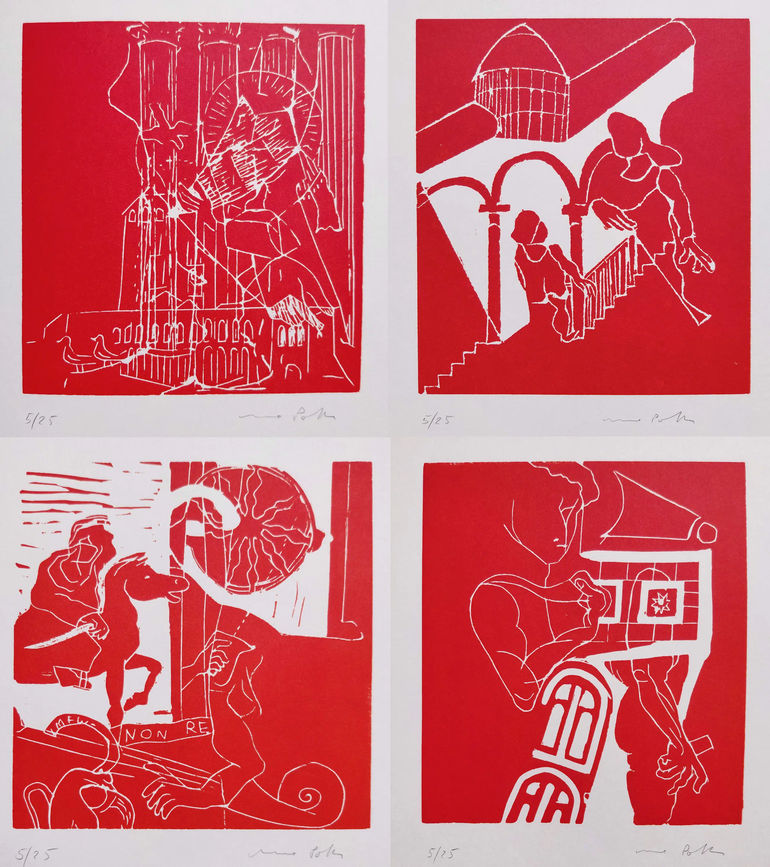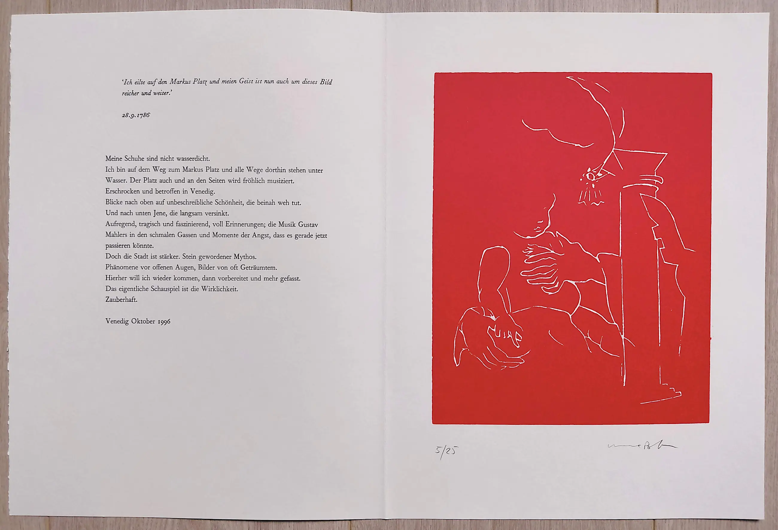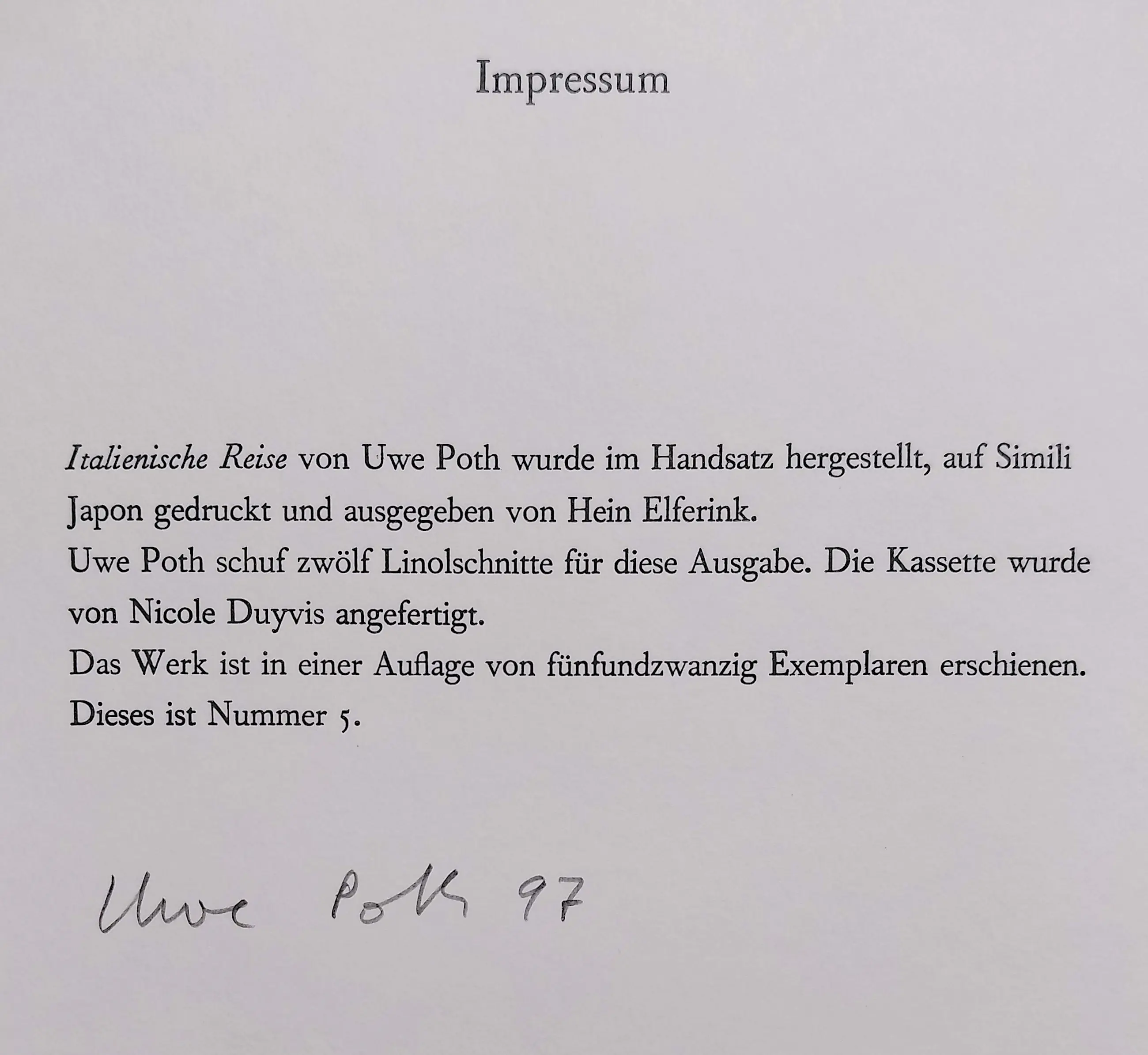 Elke linosnede op geschept papier is met potlood gesigneerd en genummerd (5/25) en wordt begeleid door een fragment uit het reisverslag van Goethe en een fragment van het reisverslag van Poth zelf. In mint conditie.