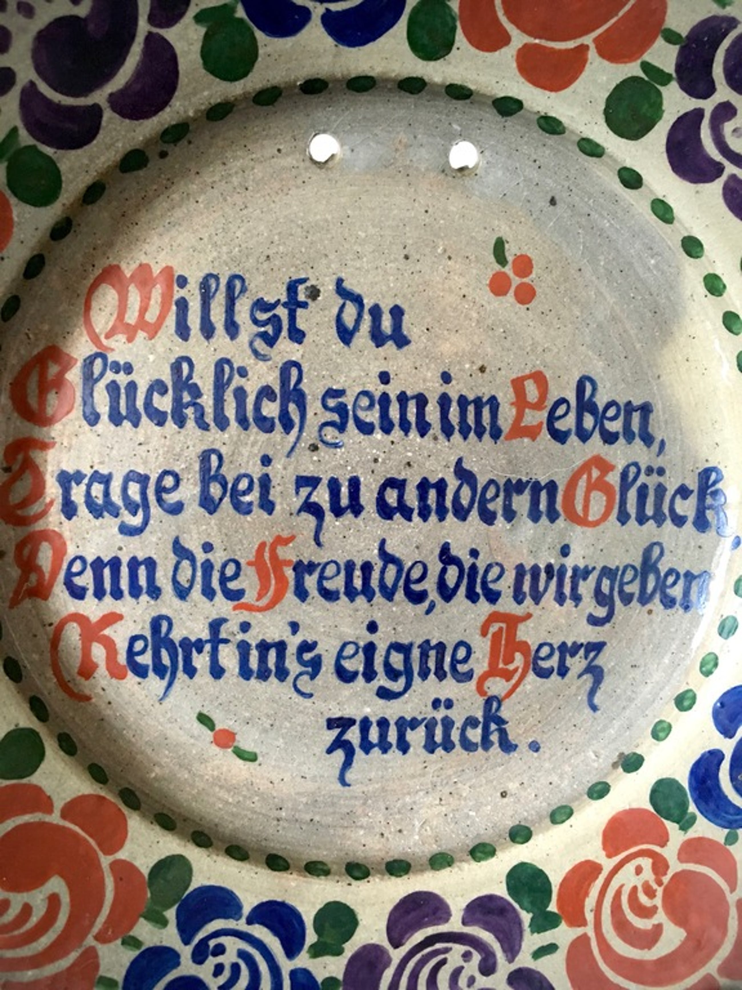 Interessant en zeldzaam antiek bord uit de beginperiode van de jugendstil. De rand is versierd met stilistische rozen. In het midden staat de Duitse spreuk: