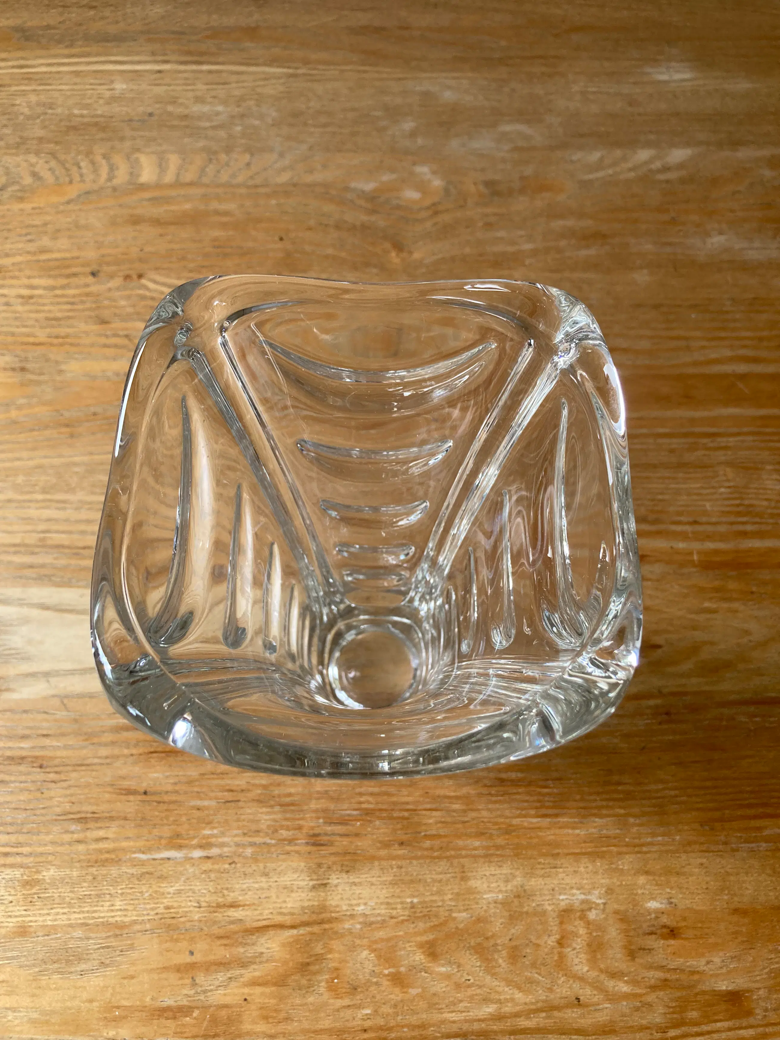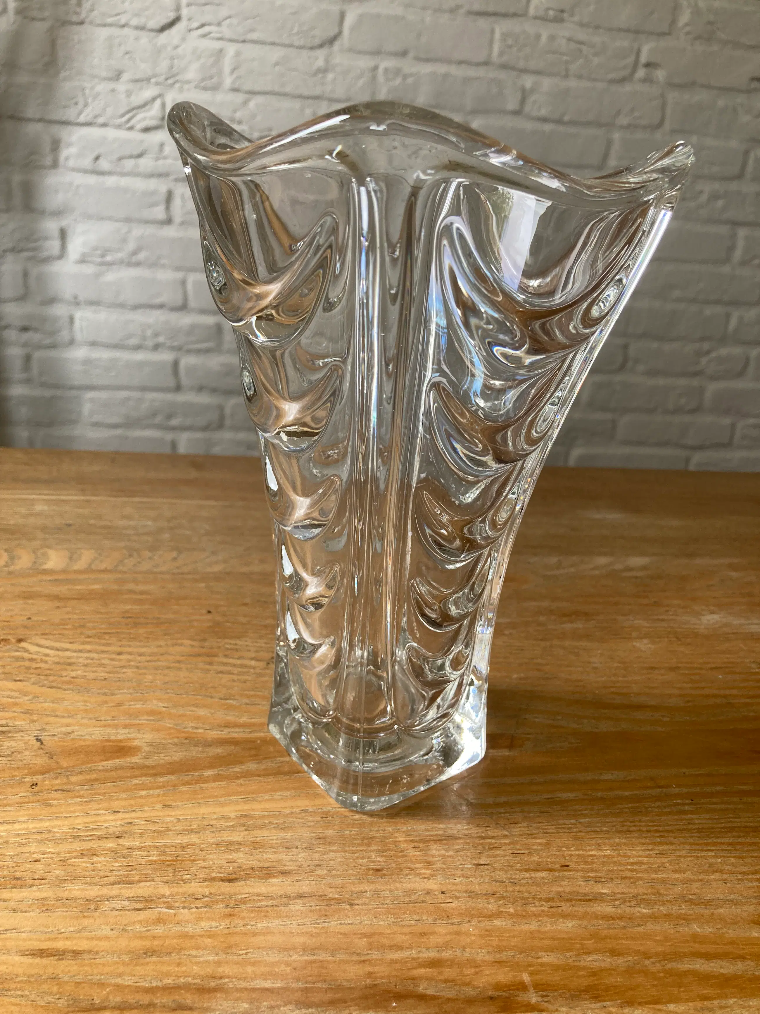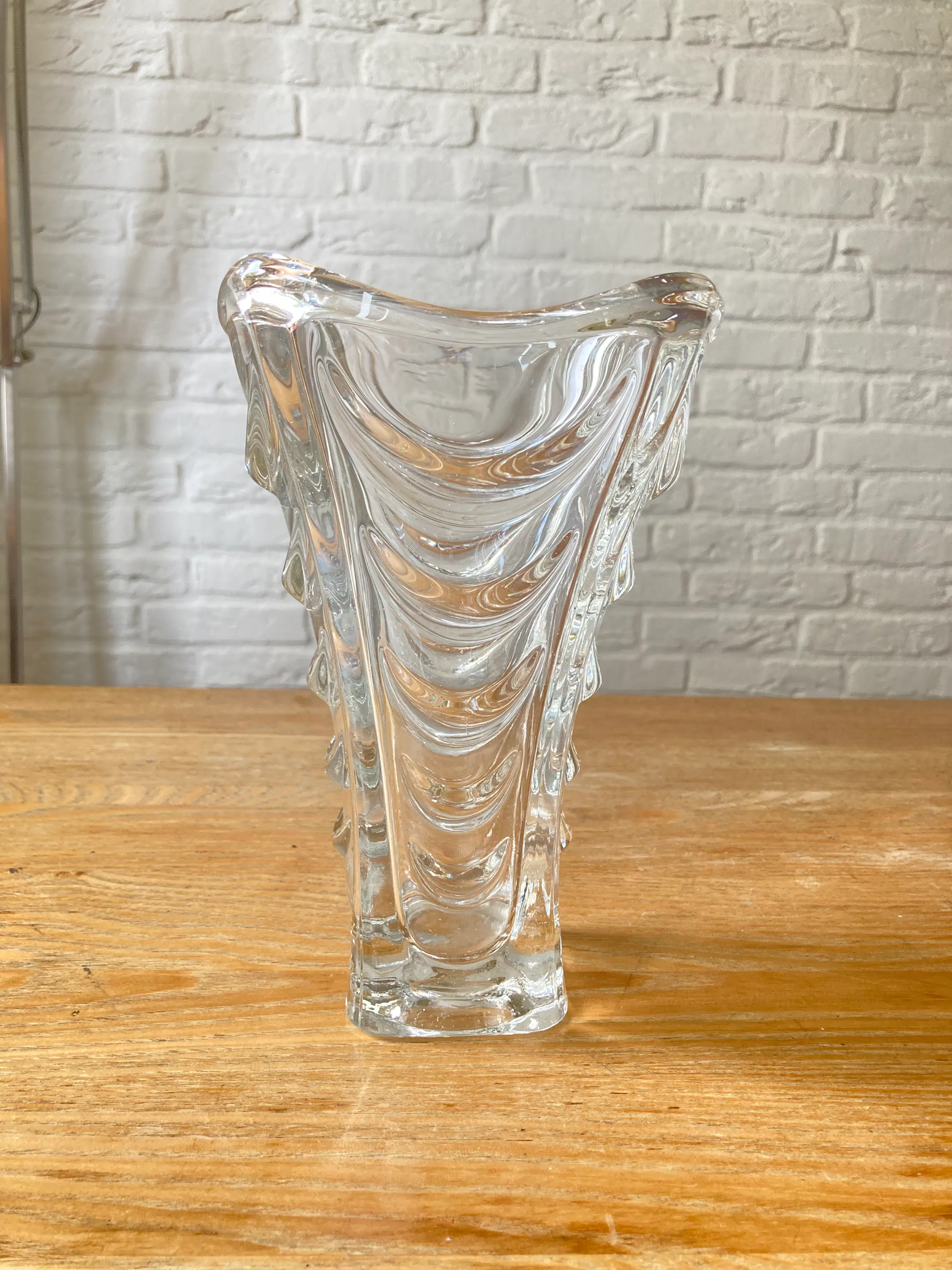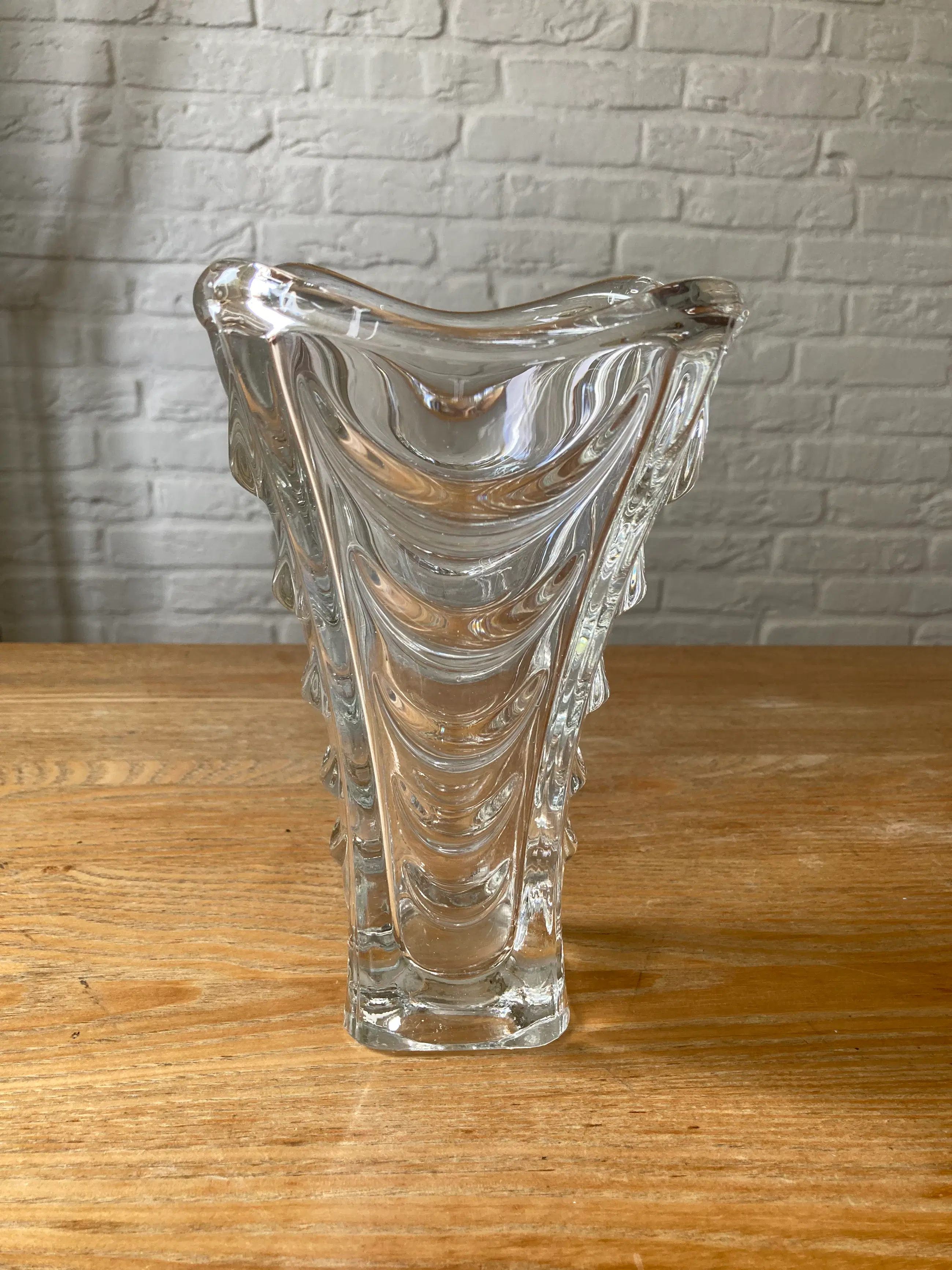Vaas gemaakt in Tsjecho-Slowakije in de jaren 1960 door Heřmanov Huť. De maker van het ontwerp is Václav Hanuš, die deze vaas ontwierp voor Jablonecké Sklárny uit 1963. Een stijl met de naam "Drapérie". Het catalogusnummer van het patroon is 20036. Een rechthoekige basis, wanden versierd met convexe golvingen. Item in originele staat, zeer goed met minimale gebruikssporen.