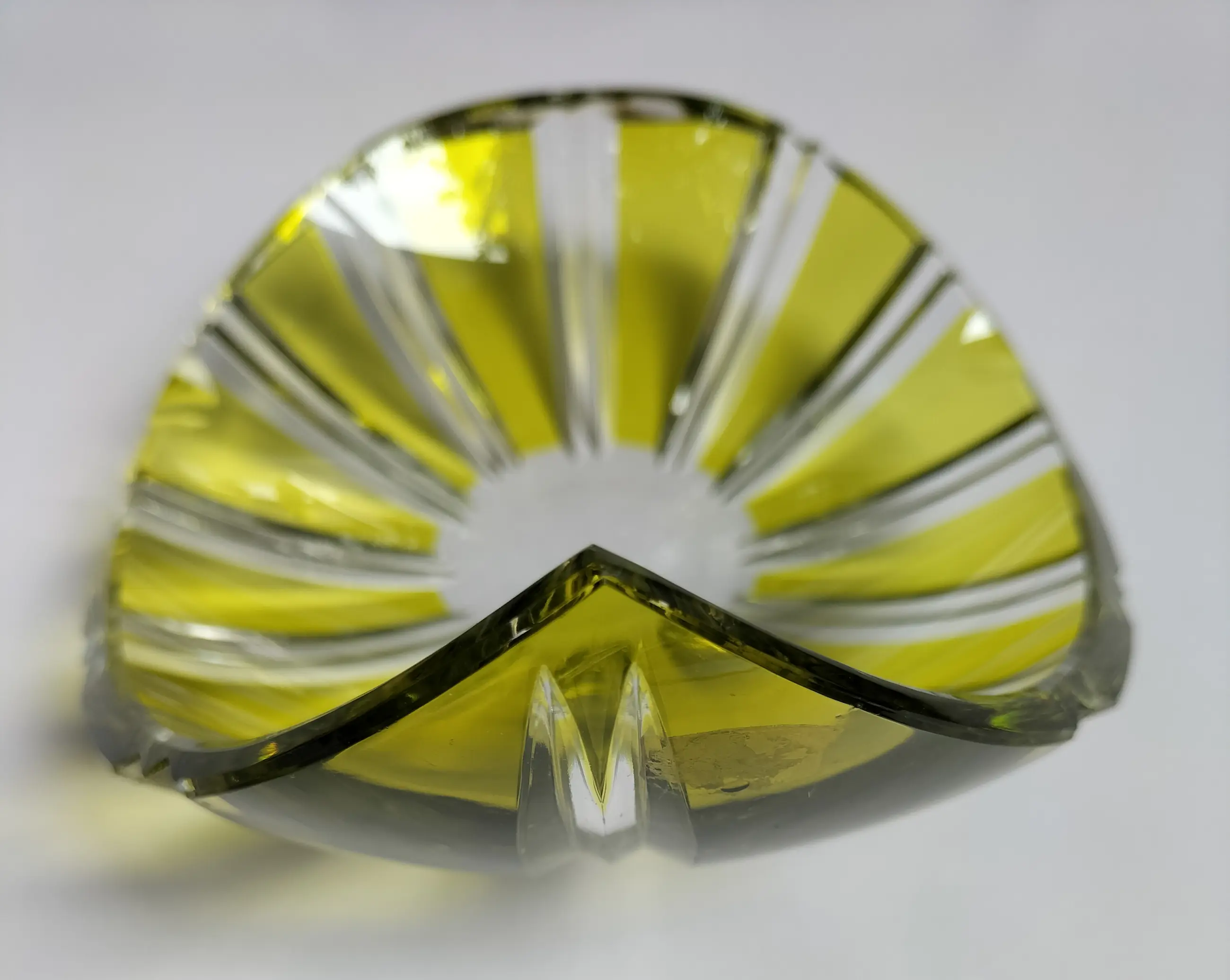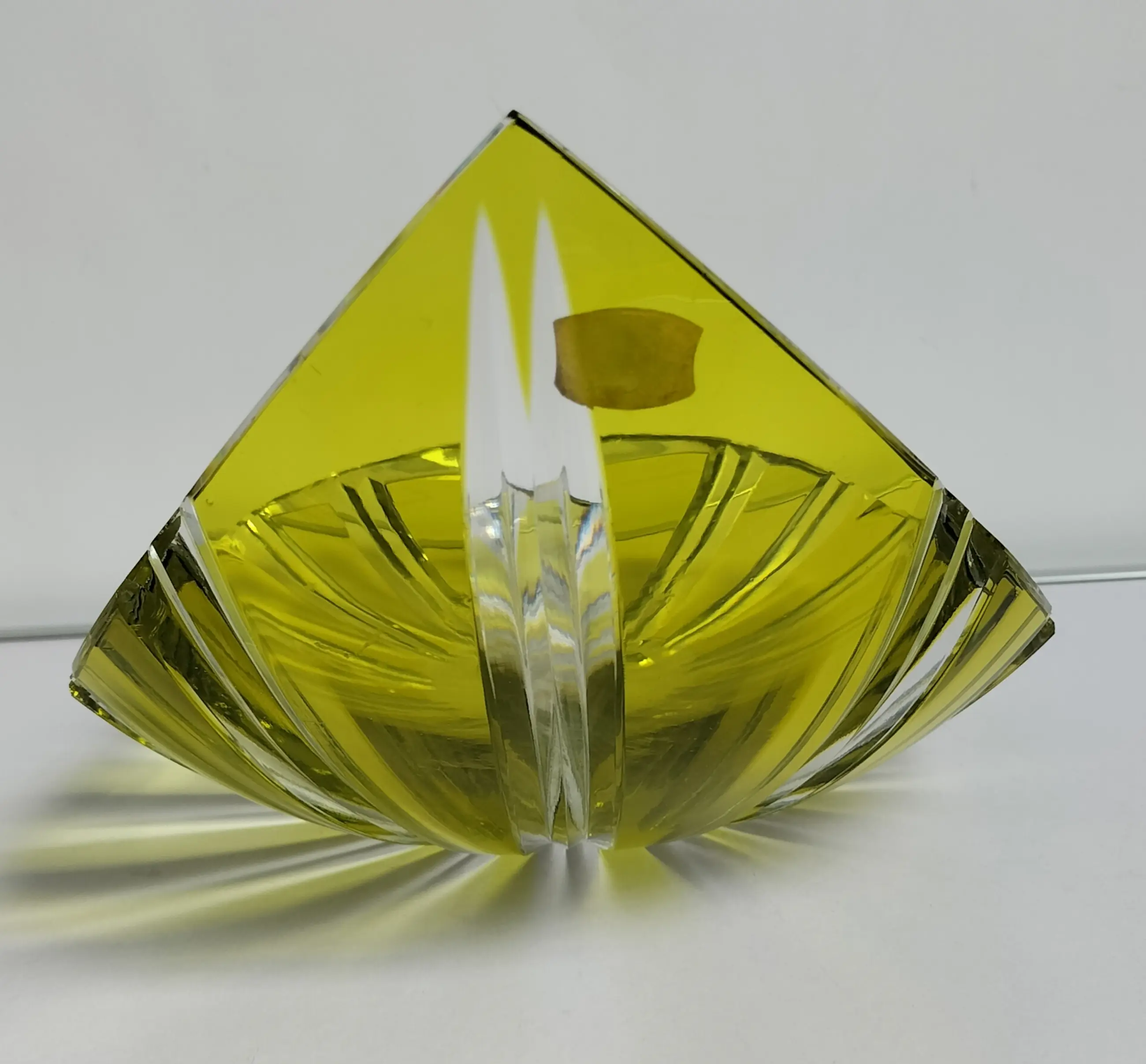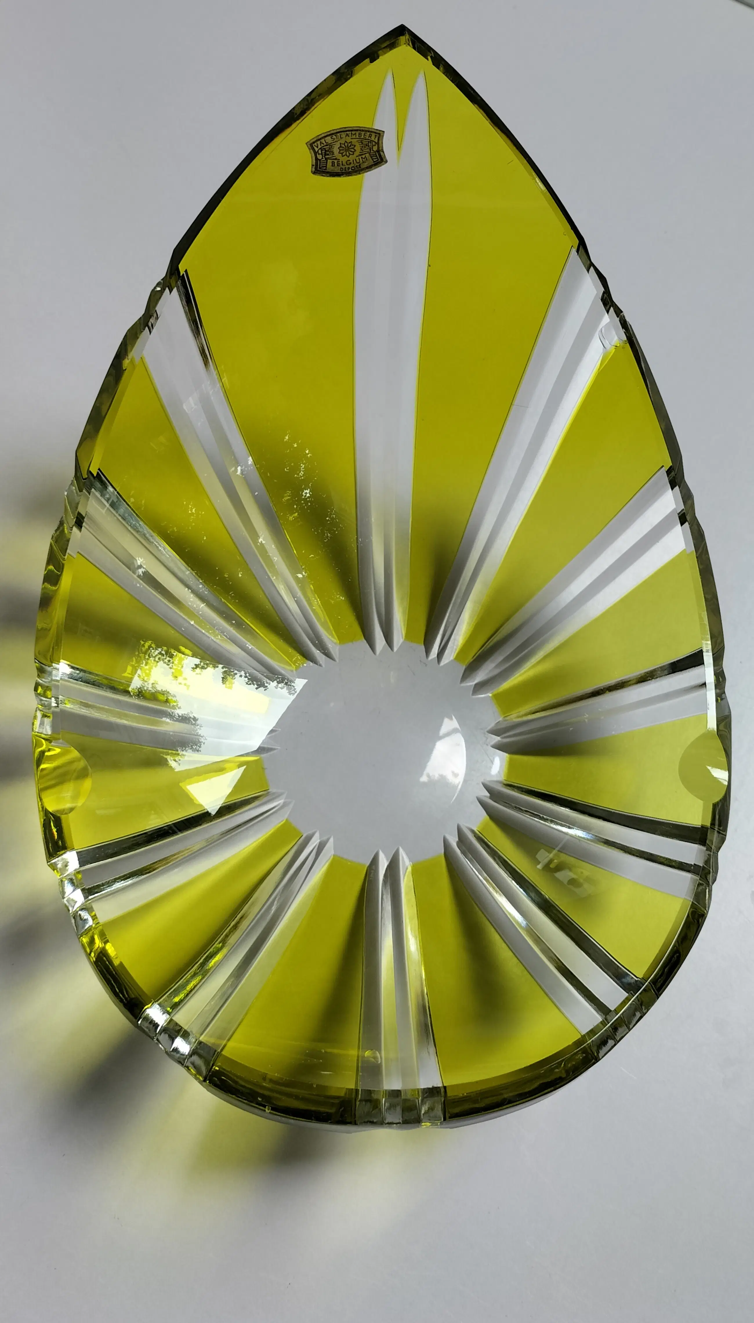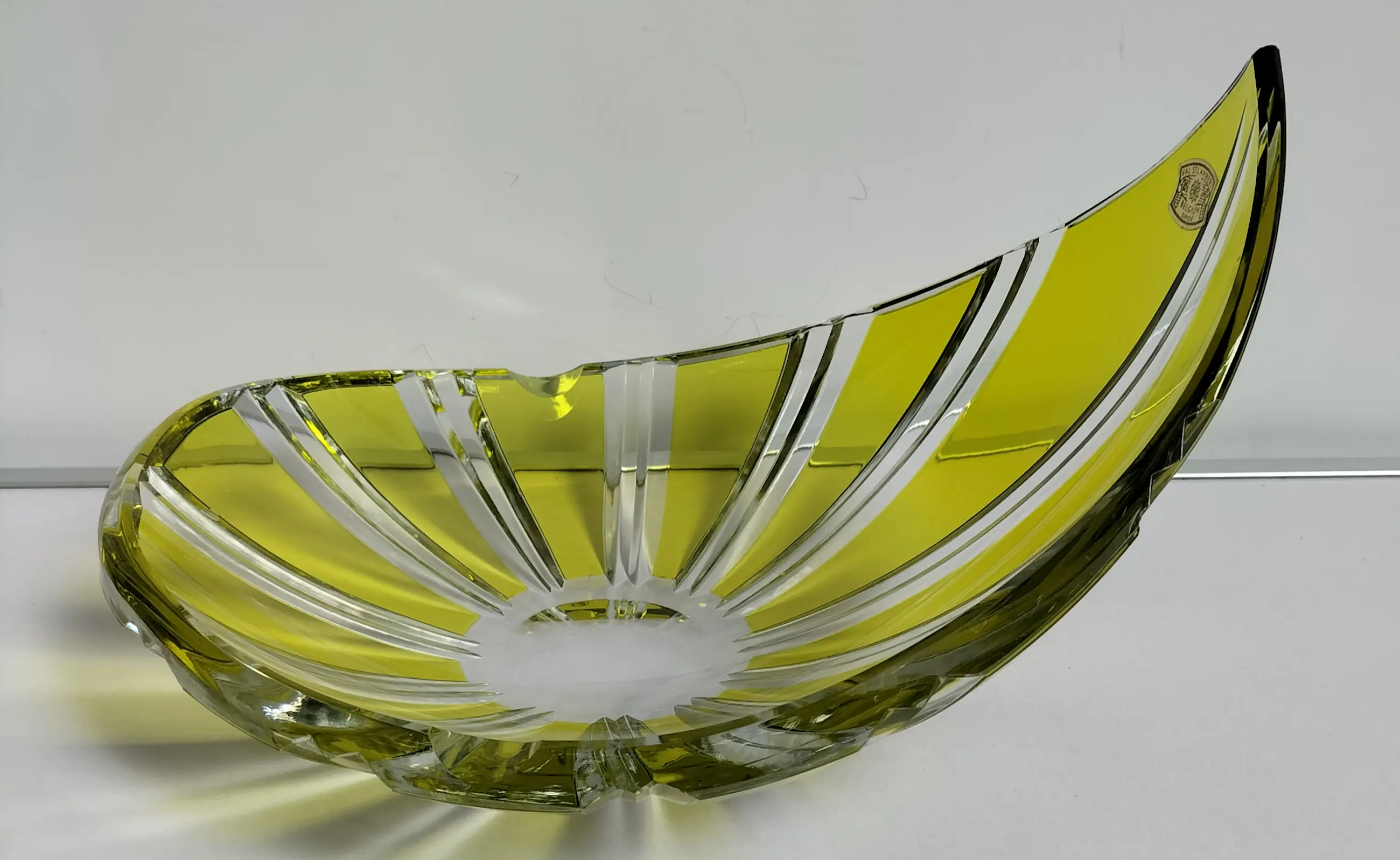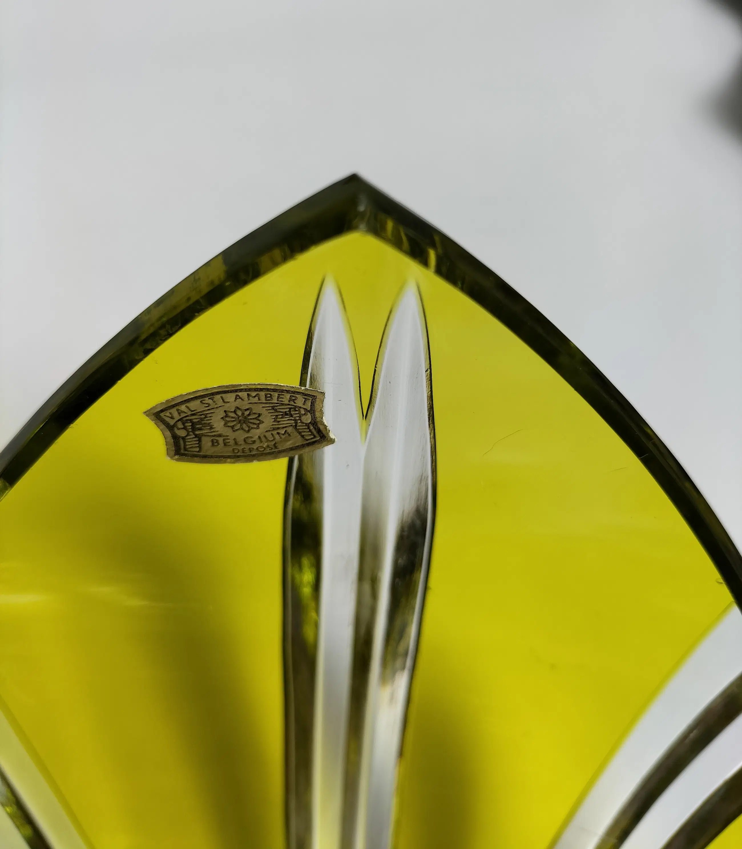 Bijzonder fraaie kristallen asbak (meer een schaal) van Val Saint-Lambert uit de jaren 60. Met de mond geblazen helder glas met een laag geelgroen kristal in een soort geometrisch dessin. De vormgeving is strak en modern, de relatief lage schaal (4/5 cm) loopt uit in een hoge punt (13 cm). Onderop niet gesigneerd, wel voorzien van een sticker. Helaas is er aan de achter-zijkant richting punt een chip (zie laatste 2 foto's). Deze is wel zichtbaar maar ook weer niet héél opvallend. Ondanks dat wil ik deze schaal toch te koop aanbieden vanwege de prachtige vorm en kleurschakering. De vraagprijs is dan ook aangepast. De schaal is verder in prima staat, met hier en daar wat lichte gebruikssporen(krasjes). Bekijkt u de foto's goed. Een mooie aparte schaal, die uiteraard met veel zorg verpakt en verzonden zal worden.