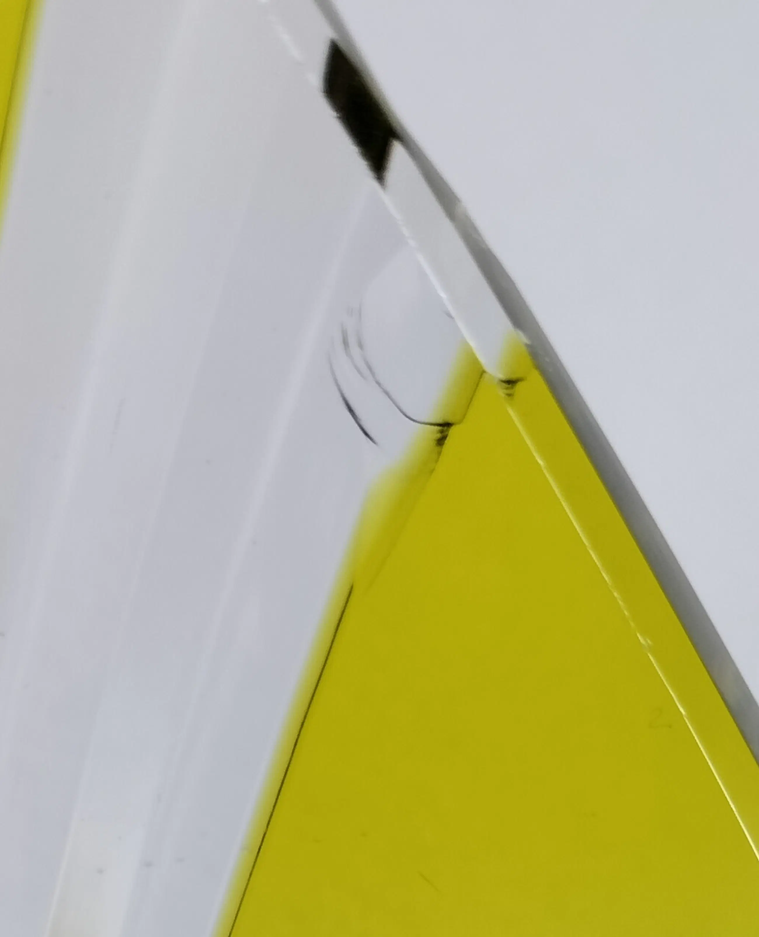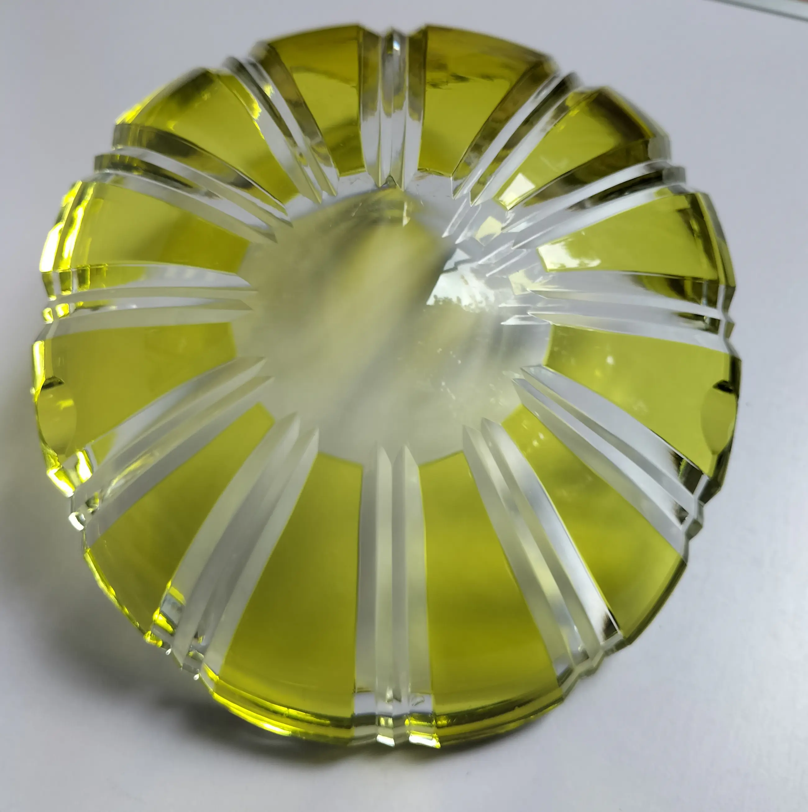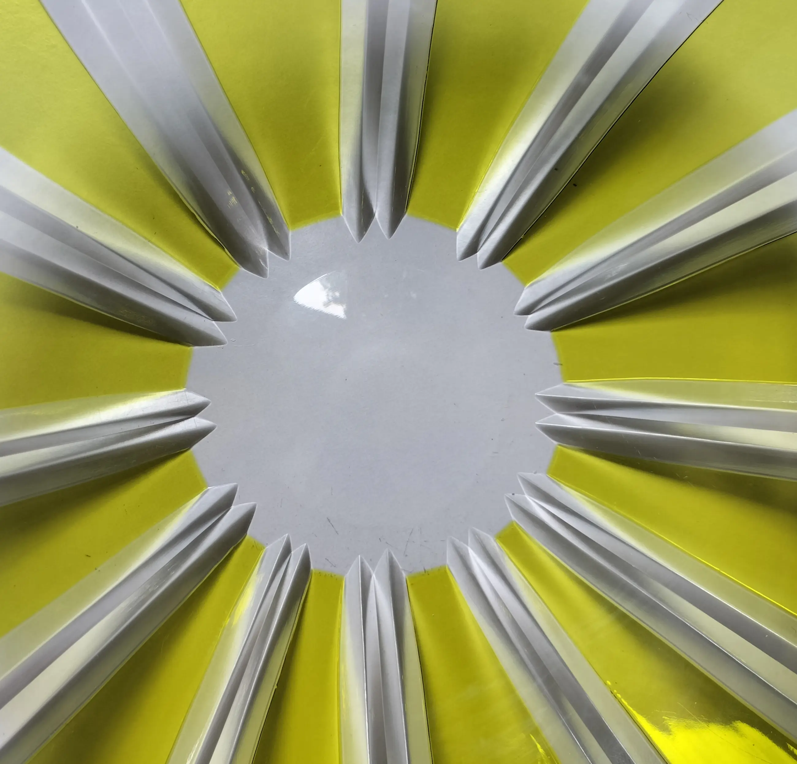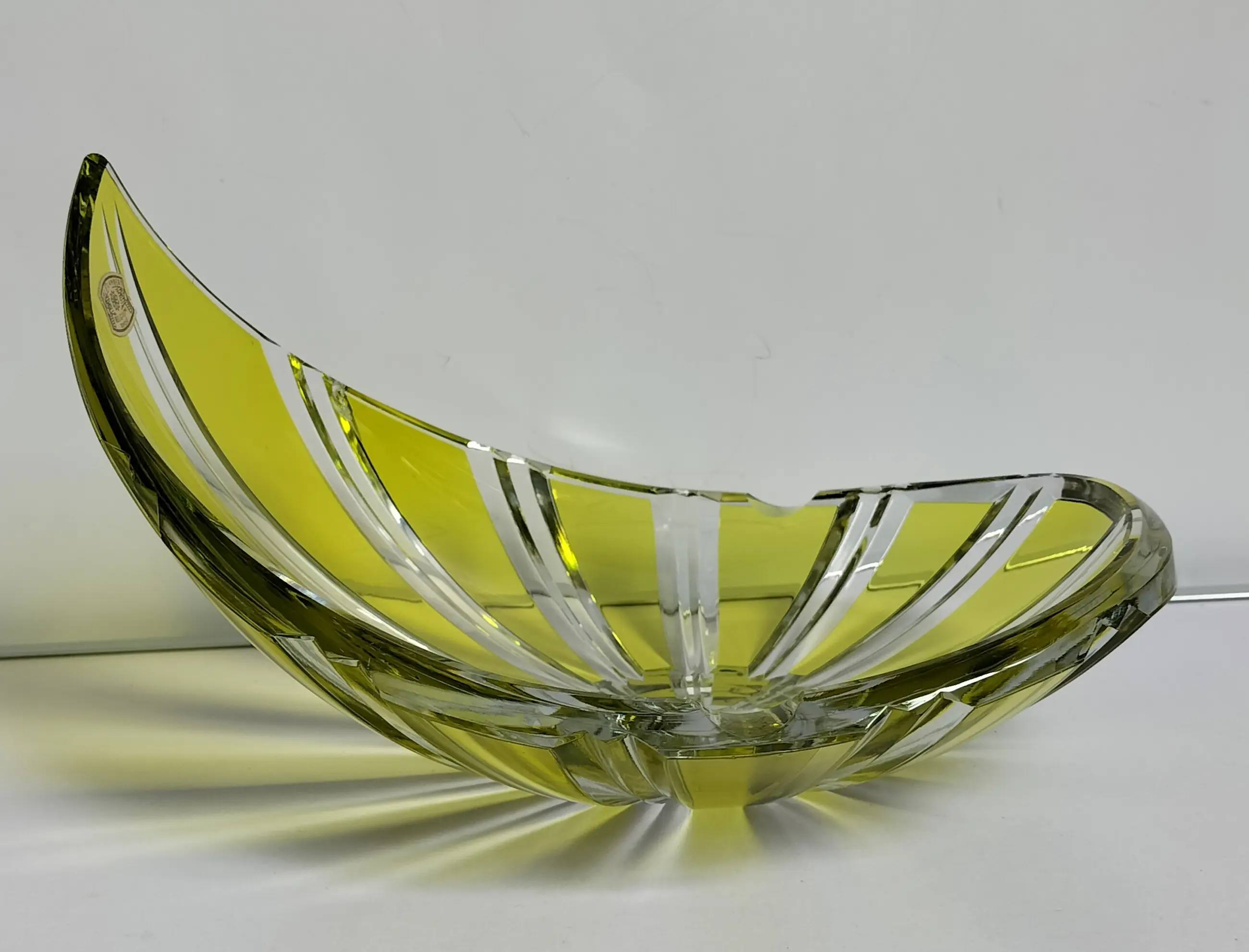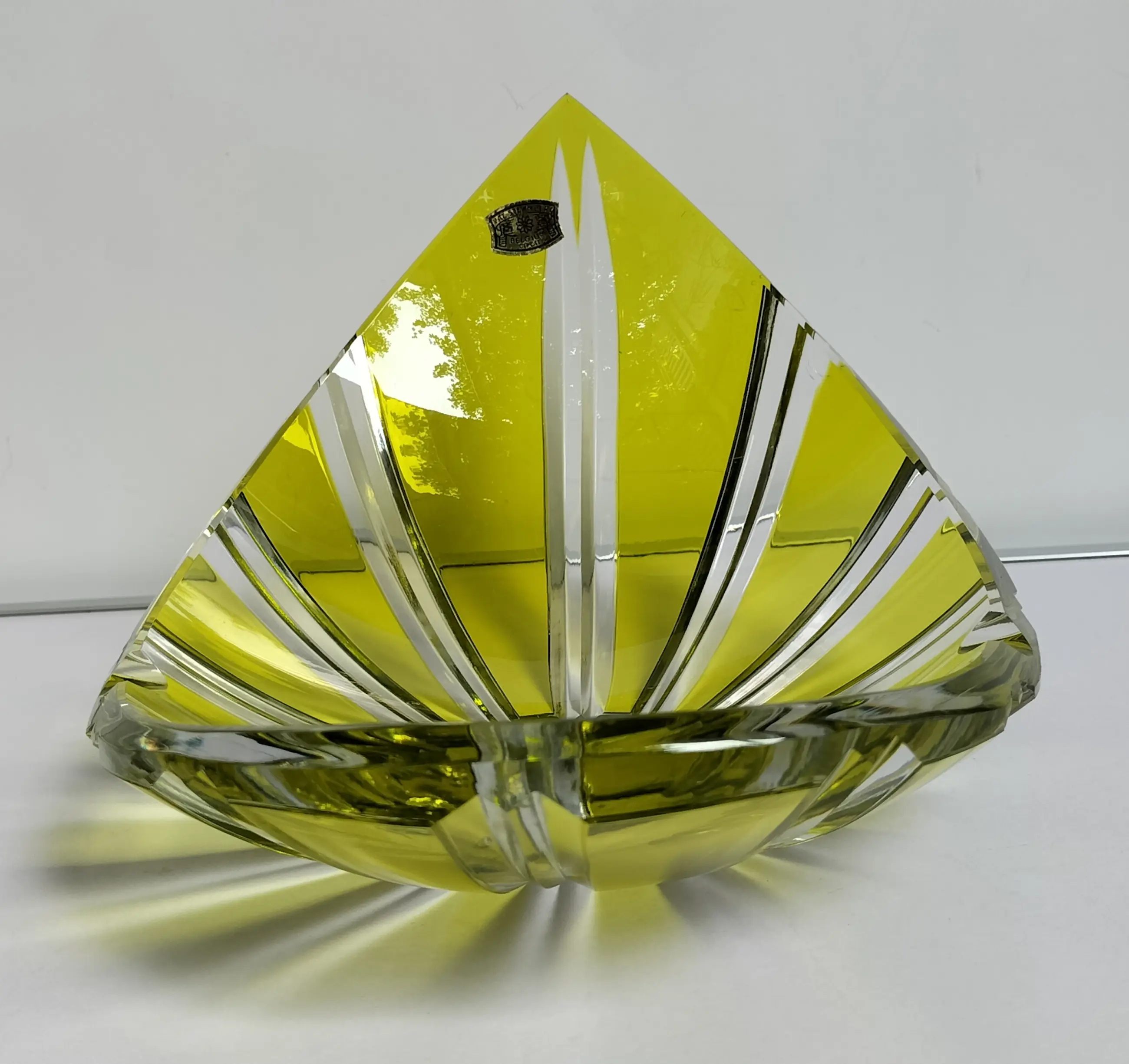 Bijzonder fraaie kristallen asbak (meer een schaal) van Val Saint-Lambert uit de jaren 60. Met de mond geblazen helder glas met een laag geelgroen kristal in een soort geometrisch dessin. De vormgeving is strak en modern, de relatief lage schaal (4/5 cm) loopt uit in een hoge punt (13 cm). Onderop niet gesigneerd, wel voorzien van een sticker. Helaas is er aan de achter-zijkant richting punt een chip (zie laatste 2 foto's). Deze is wel zichtbaar maar ook weer niet héél opvallend. Ondanks dat wil ik deze schaal toch te koop aanbieden vanwege de prachtige vorm en kleurschakering. De vraagprijs is dan ook aangepast. De schaal is verder in prima staat, met hier en daar wat lichte gebruikssporen(krasjes). Bekijkt u de foto's goed. Een mooie aparte schaal, die uiteraard met veel zorg verpakt en verzonden zal worden.