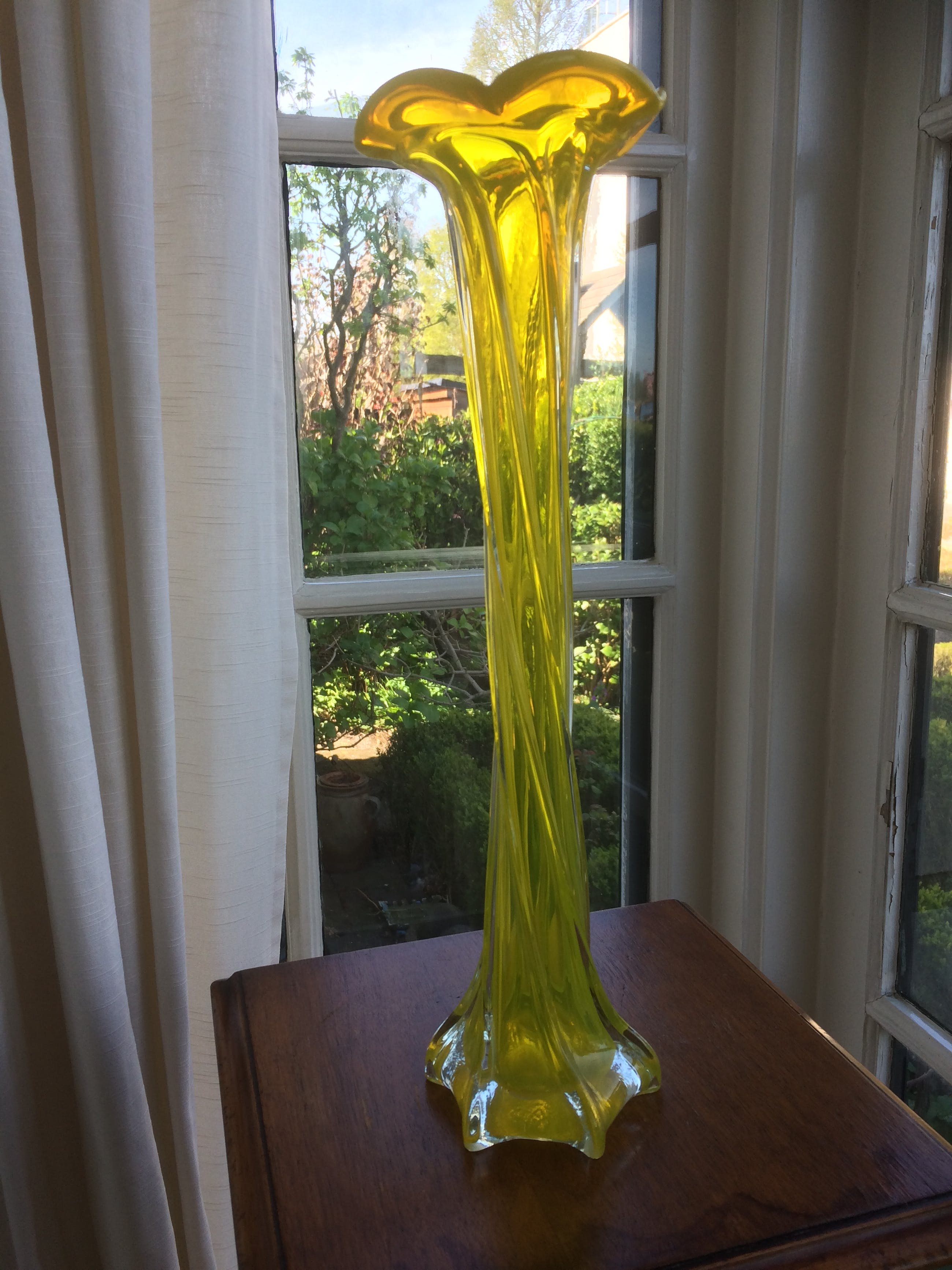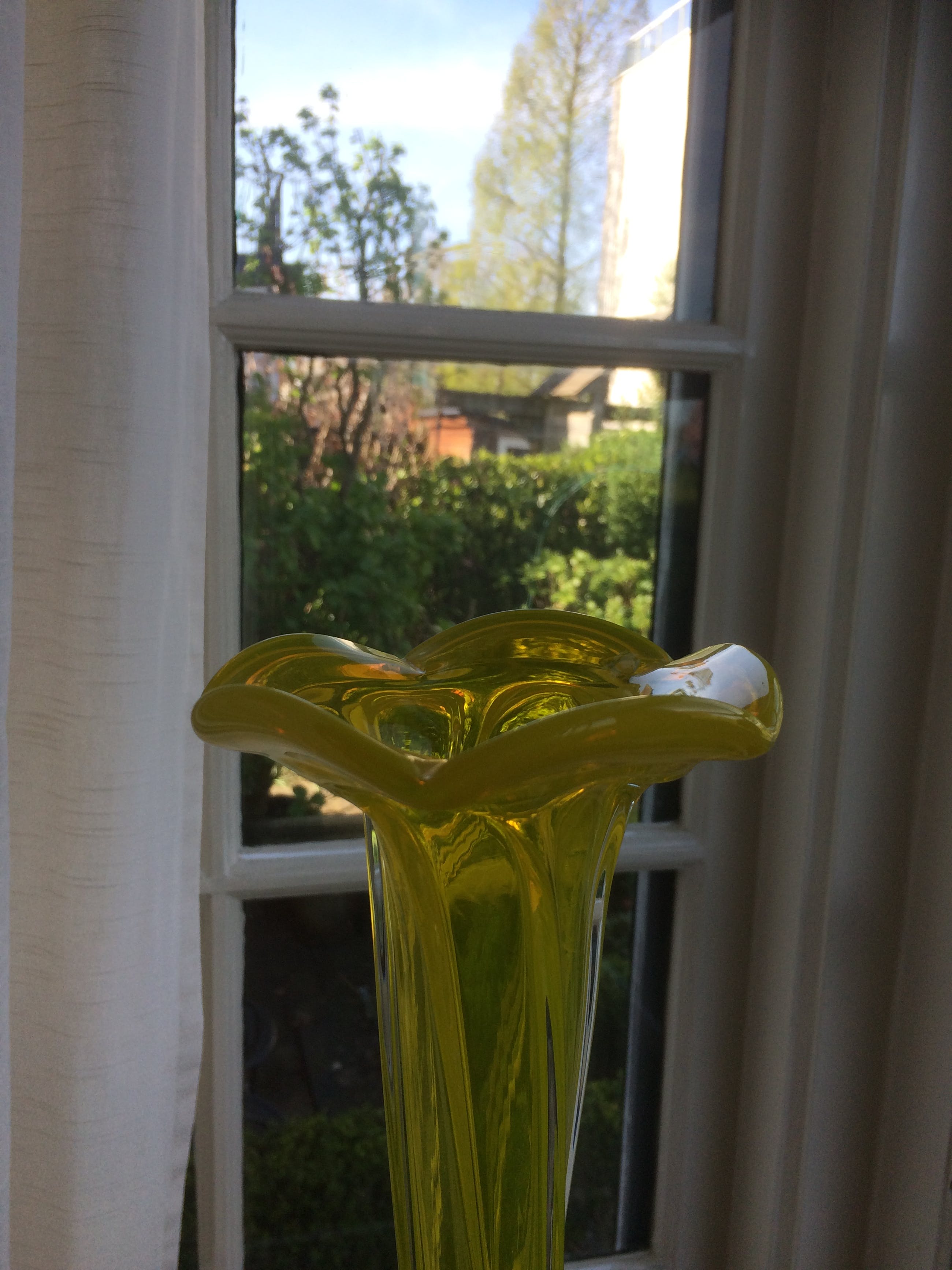 Prachtige citroengele grote hoedenvaas in mint conditie. Citroengele hoedenvazen zijn zeer zeldzaam. Deze kleur past alleen in mooie daarbij passende interieurs. Deze vaas is in uitzonderlijk fraaie conditie: geen chips en geen aanslag De vaas is fors en mede door de kleur echt opvallend, juist ook in een modern interieur.!! Aangetekende / verzekerde verzending per PostNL. Kosten koper: Nederland : € 10,00; buitenland: zie de internationale Verzekerde pakketposttarieven. Ophalen op afspraak na betaling.