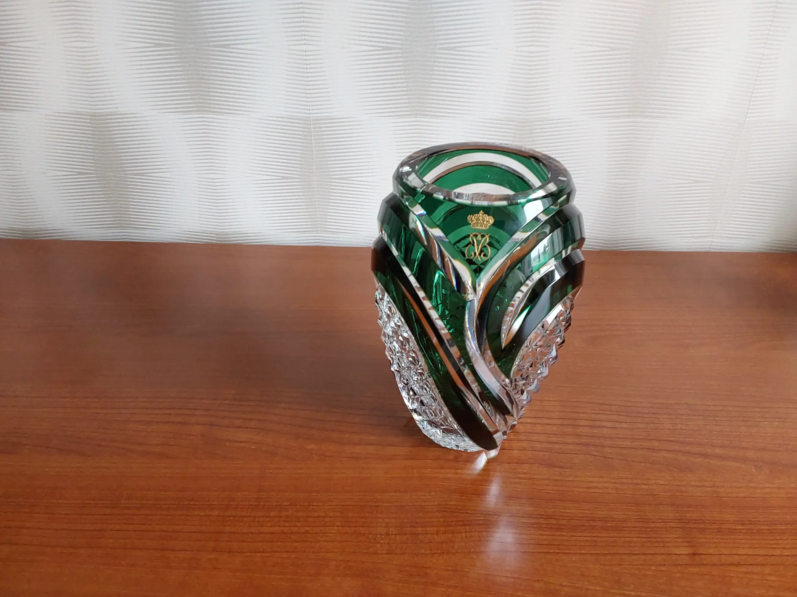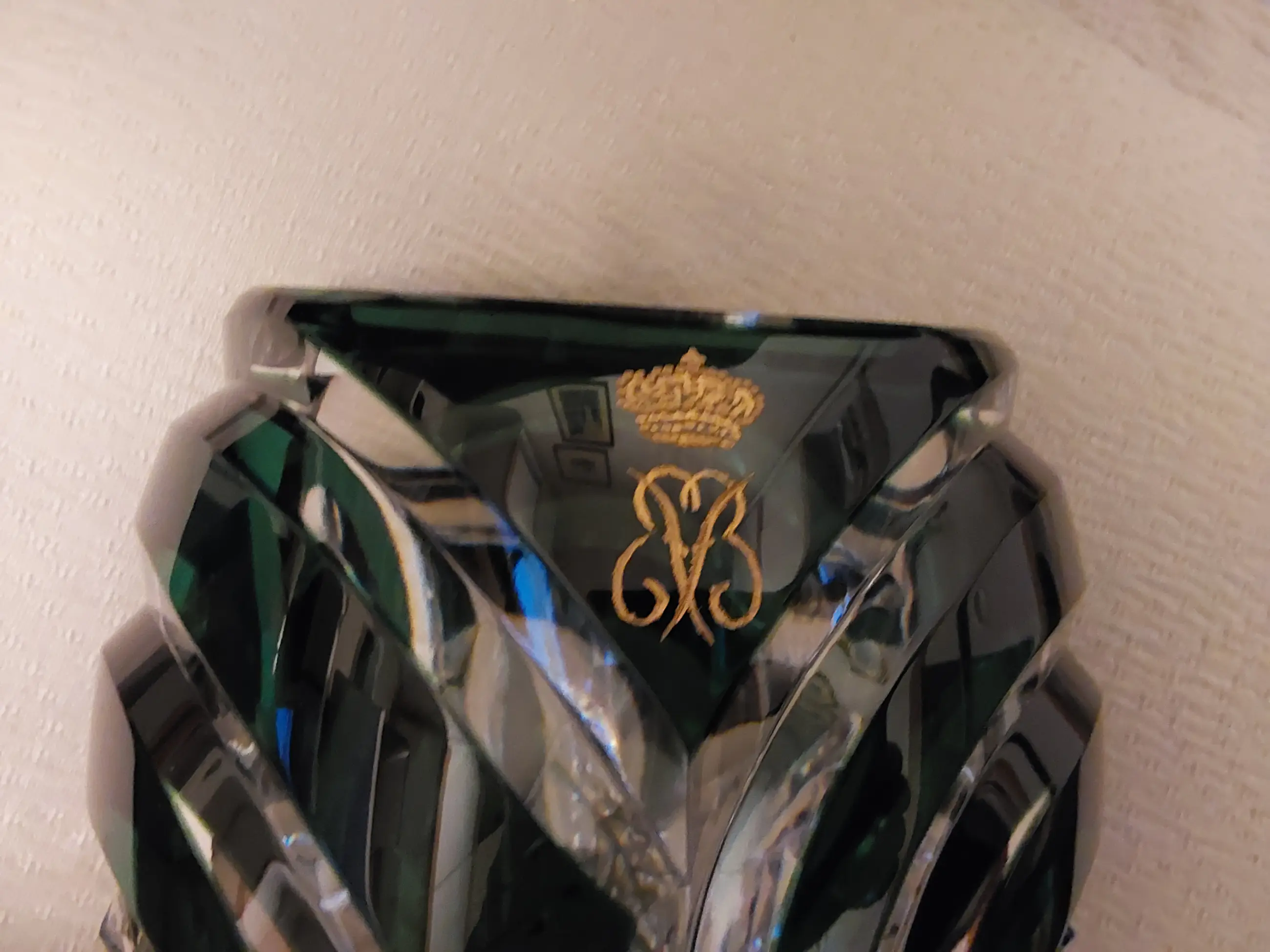 De vaas lijkt een combinatie van groen en helder glas met zilveren accenten, en draagt een gouden embleem met een kroon boven een monogram. Dit wijst op een mogelijk historisch en koninklijk belang.