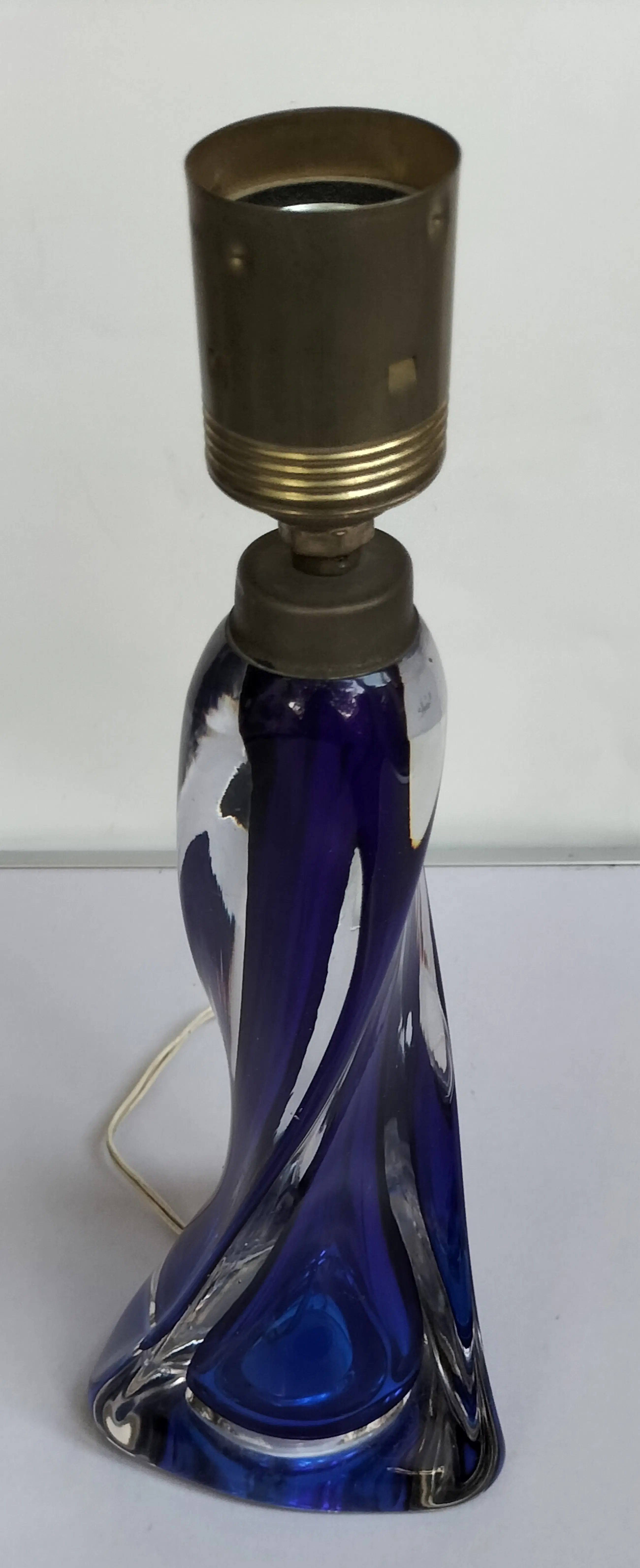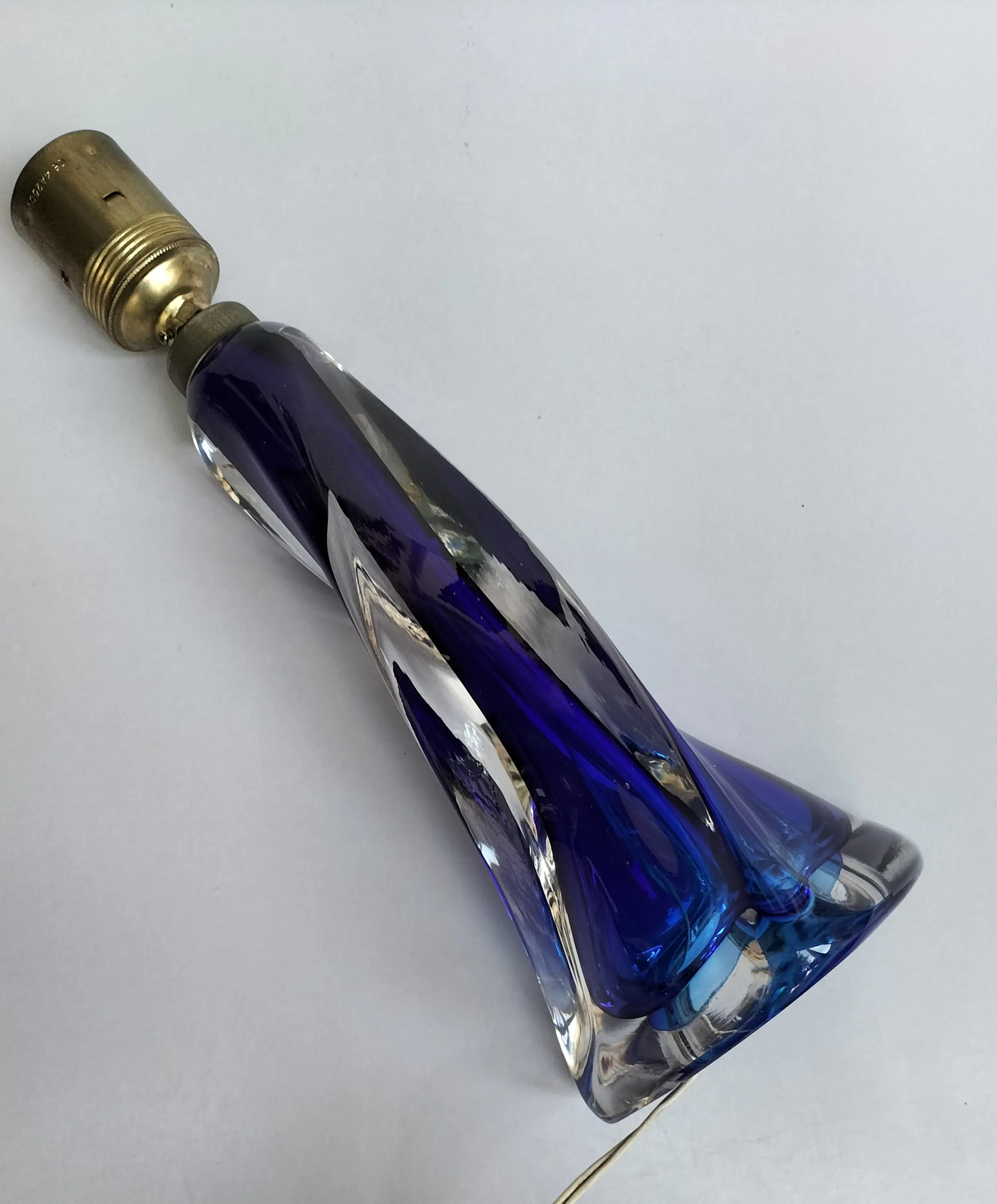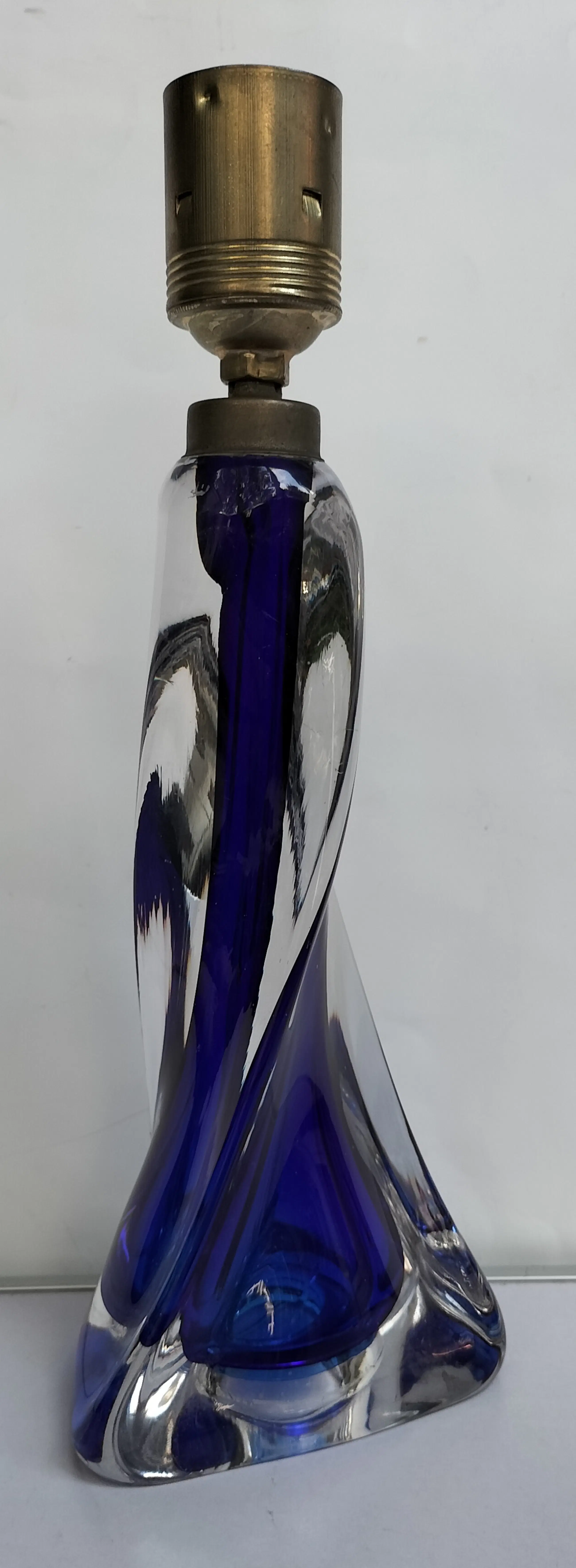 Bijzonder mooie zware kristallen voet voor een lamp, uitgevoerd in helder en kobaltblauw glas . De onderzijde heeft een soort driehoek-vorm, die geraffineerd in een draai naar boven loopt en smaller wordt. De kobaltblauwe kleur binnenin is werkelijk prachtig.
