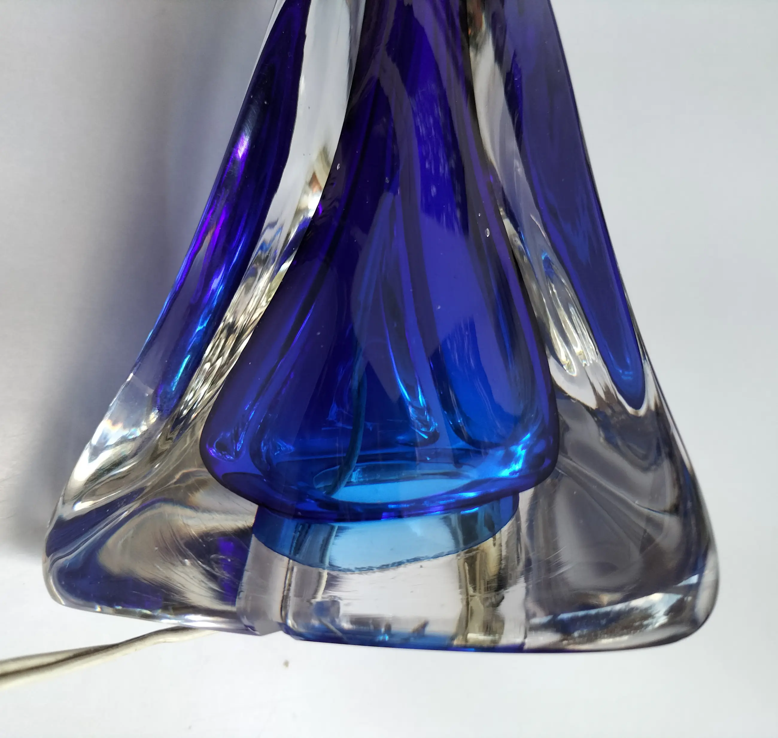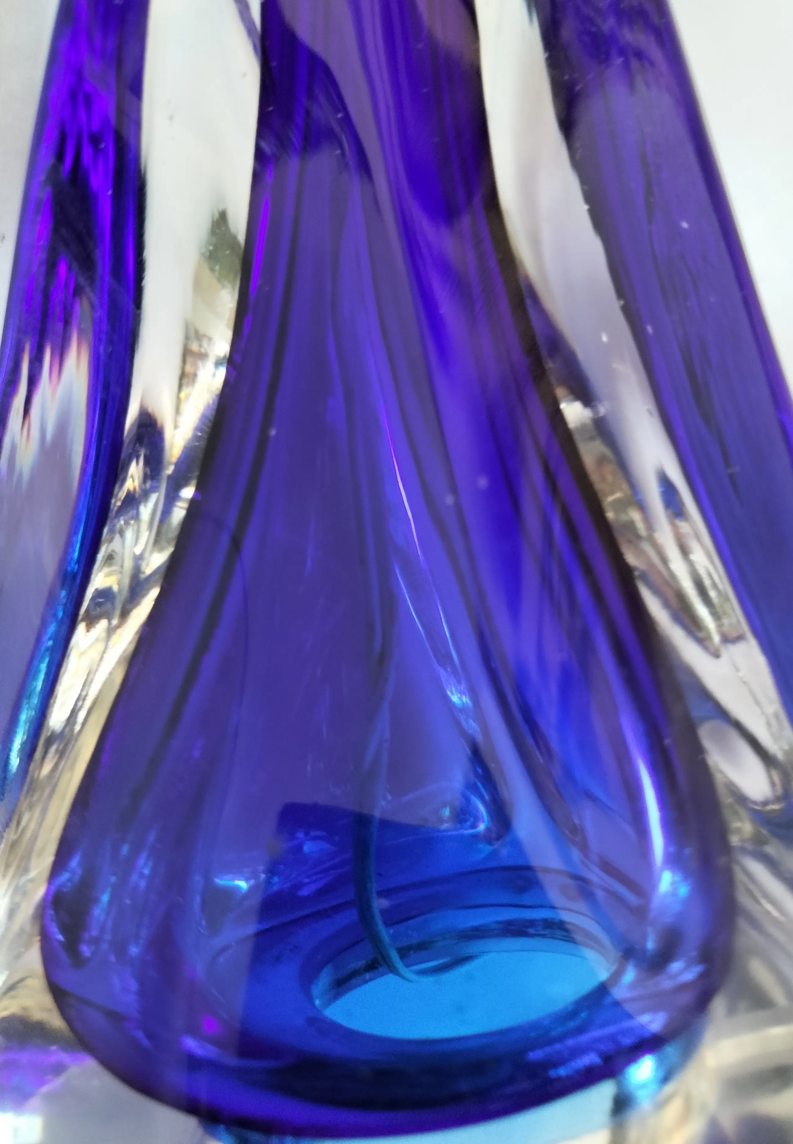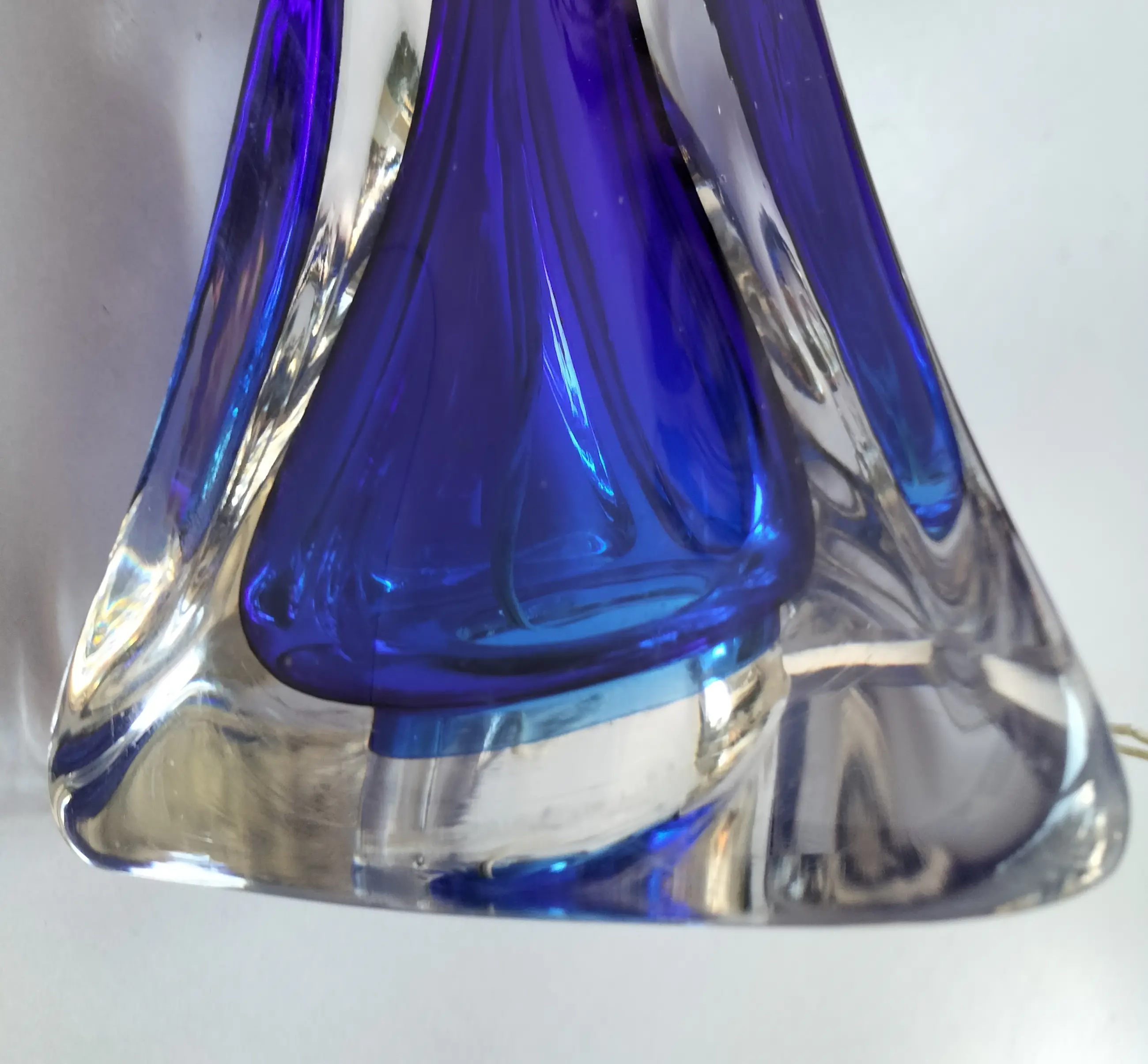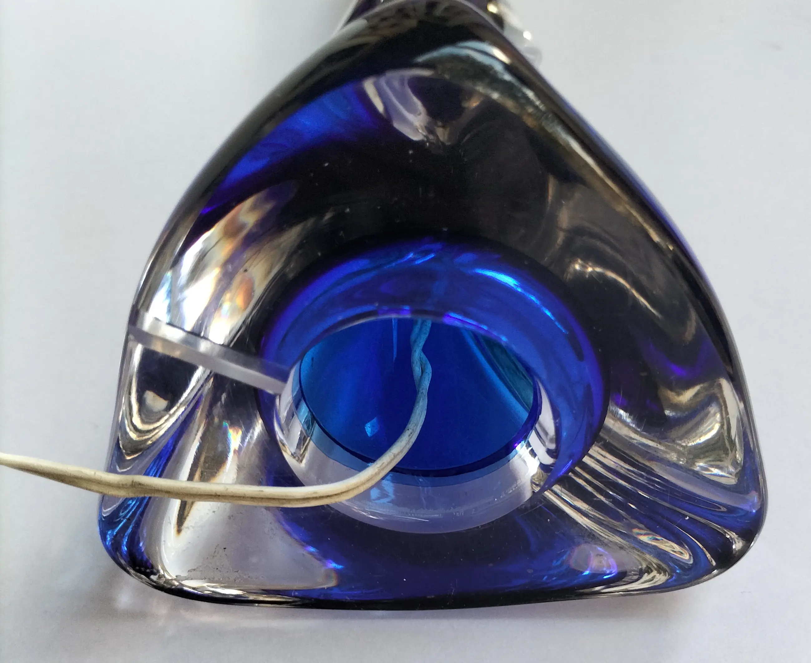 Bijzonder mooie zware kristallen voet voor een lamp, uitgevoerd in helder en kobaltblauw glas . De onderzijde heeft een soort driehoek-vorm, die geraffineerd in een draai naar boven loopt en smaller wordt. De kobaltblauwe kleur binnenin is werkelijk prachtig.