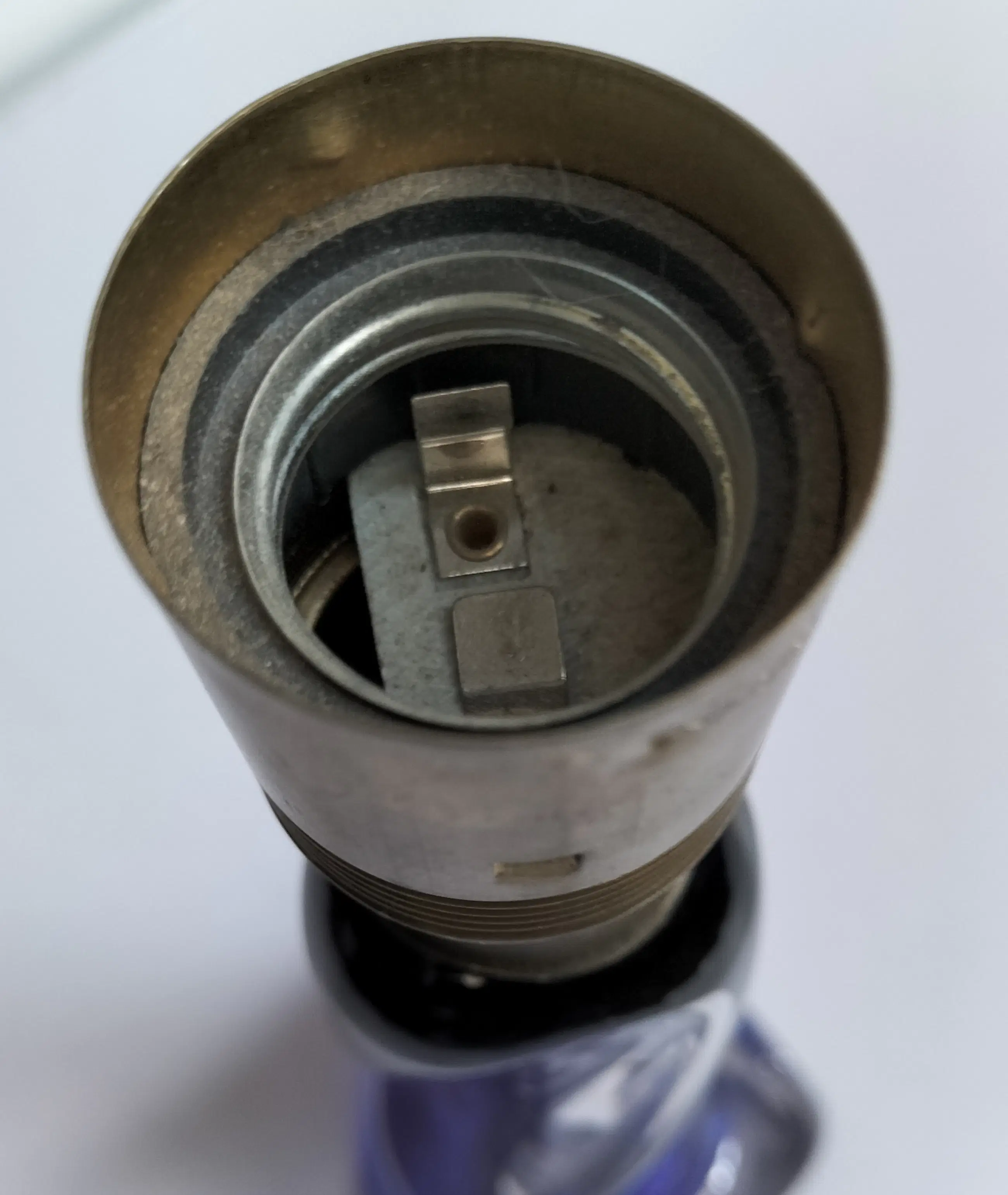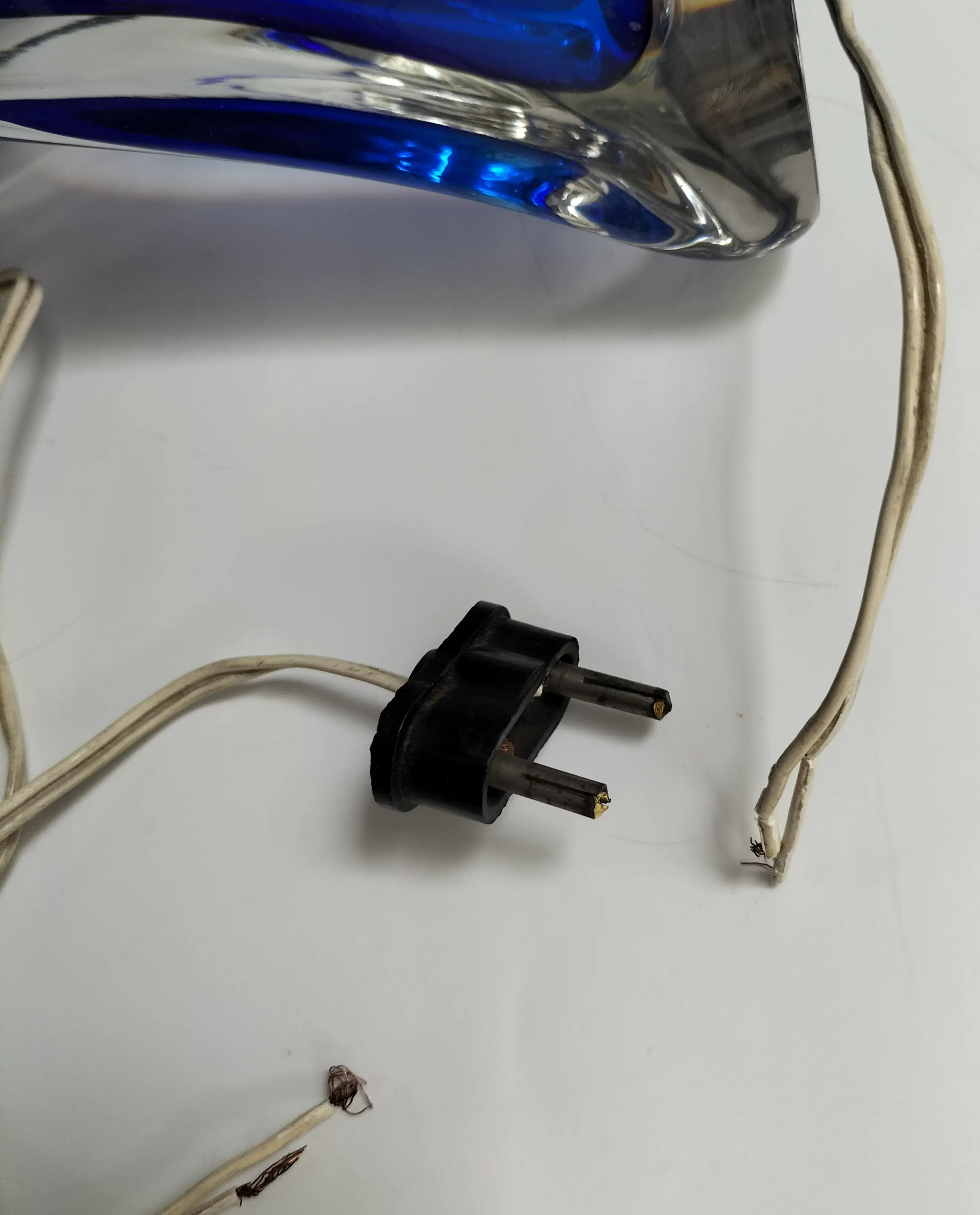 De lamp werkte, maar de draad was te verweerd en brak, en is daarna niet meer gemaakt. De draad en het zeer ouderstekkertje kunt u op de laatste foto zien. Een eenvoudig op te lossen probleem....