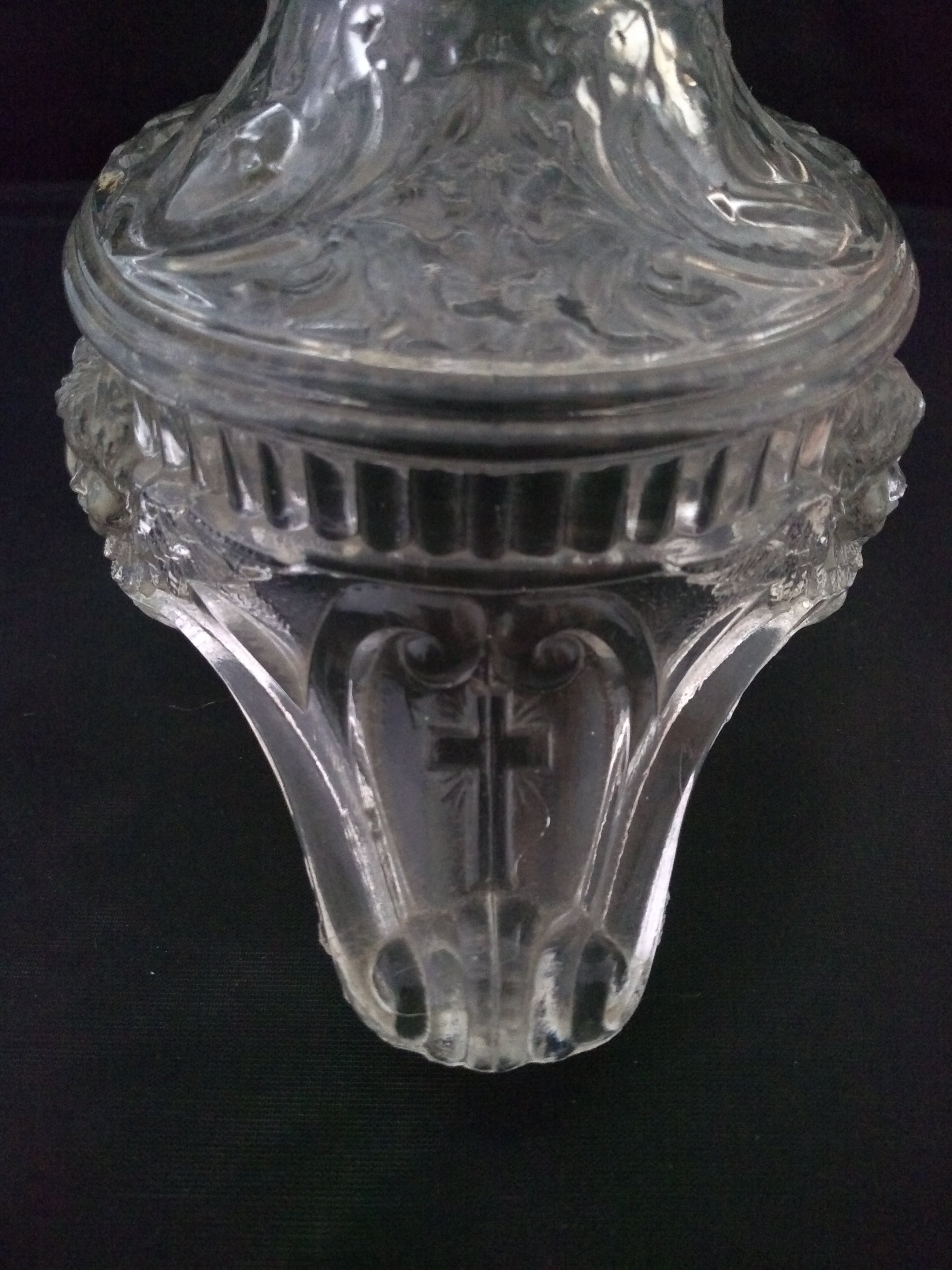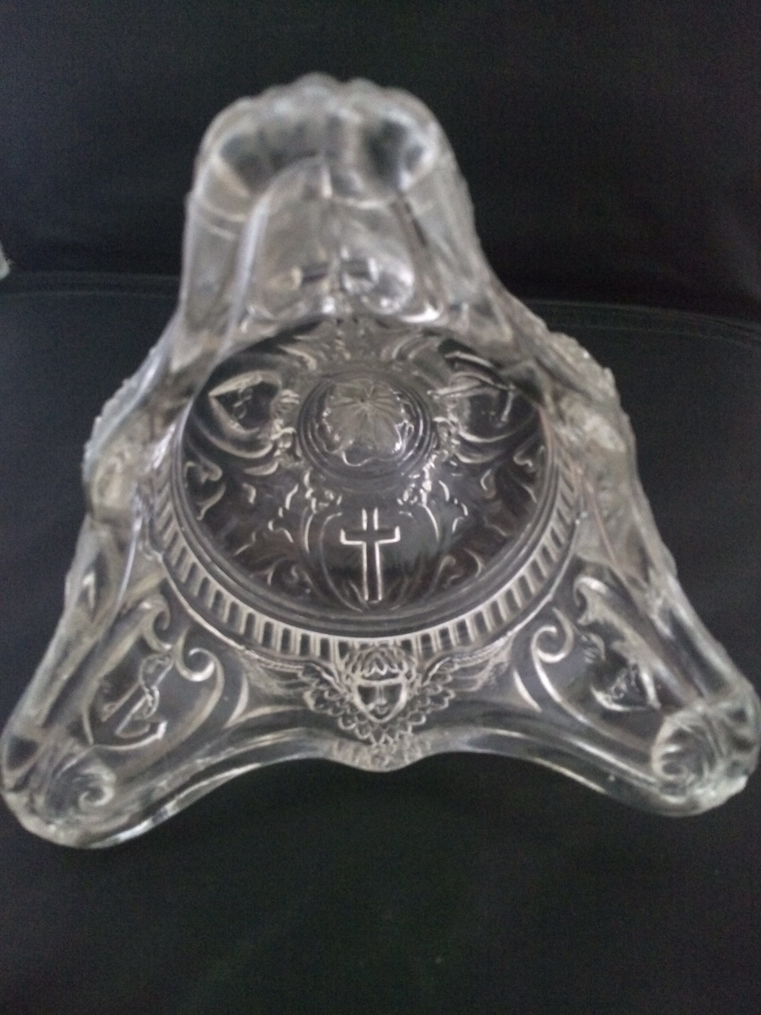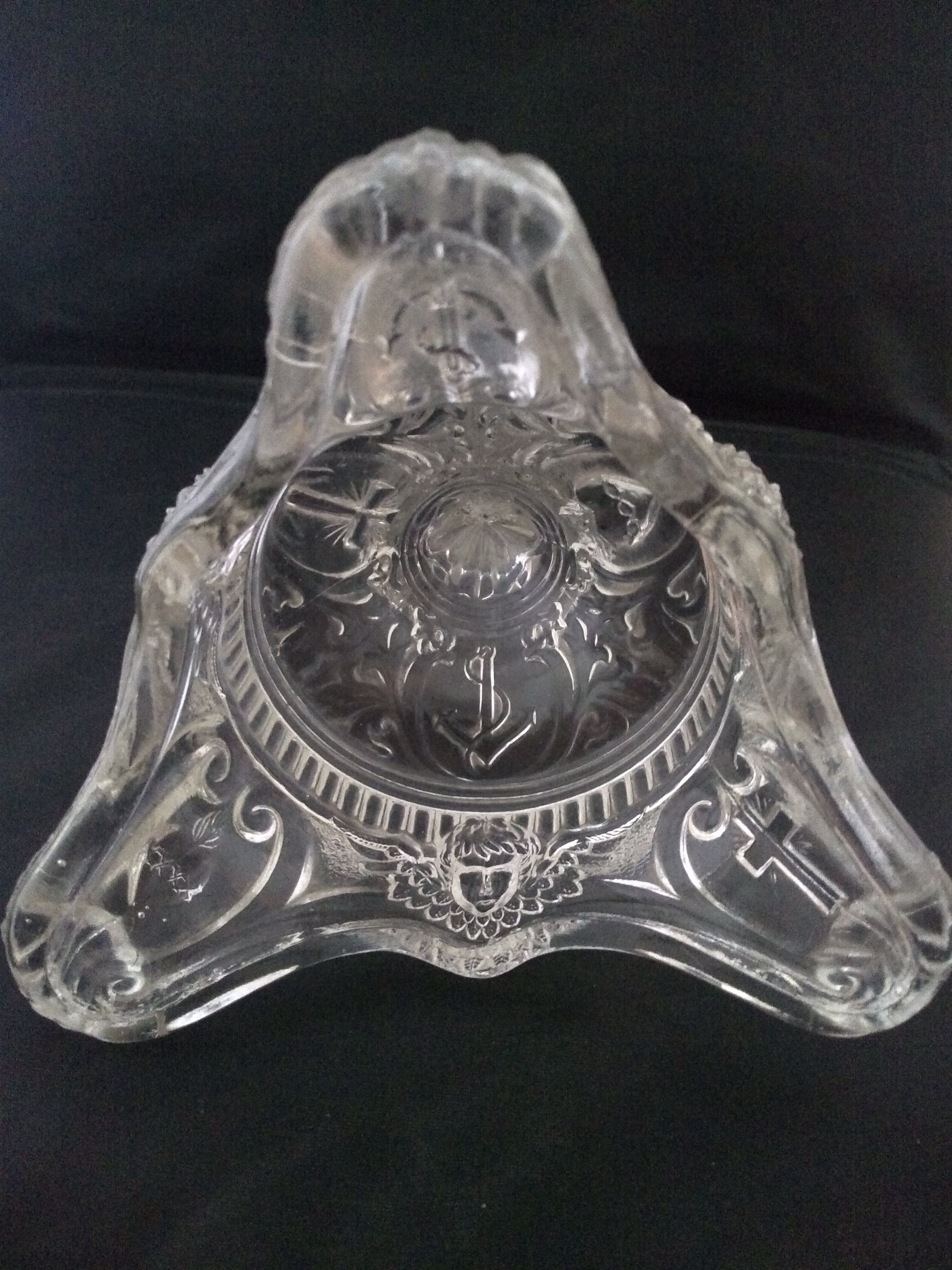 Beste volgens mij VSL ontwerp Rene Delvenne, Charles Graffart. In de voet engelenhoofd met vleugels in reliëf,kruis,anker,hart . Periode rond 1900. Zo goed mogelijk gefotografeerd. Mvg.