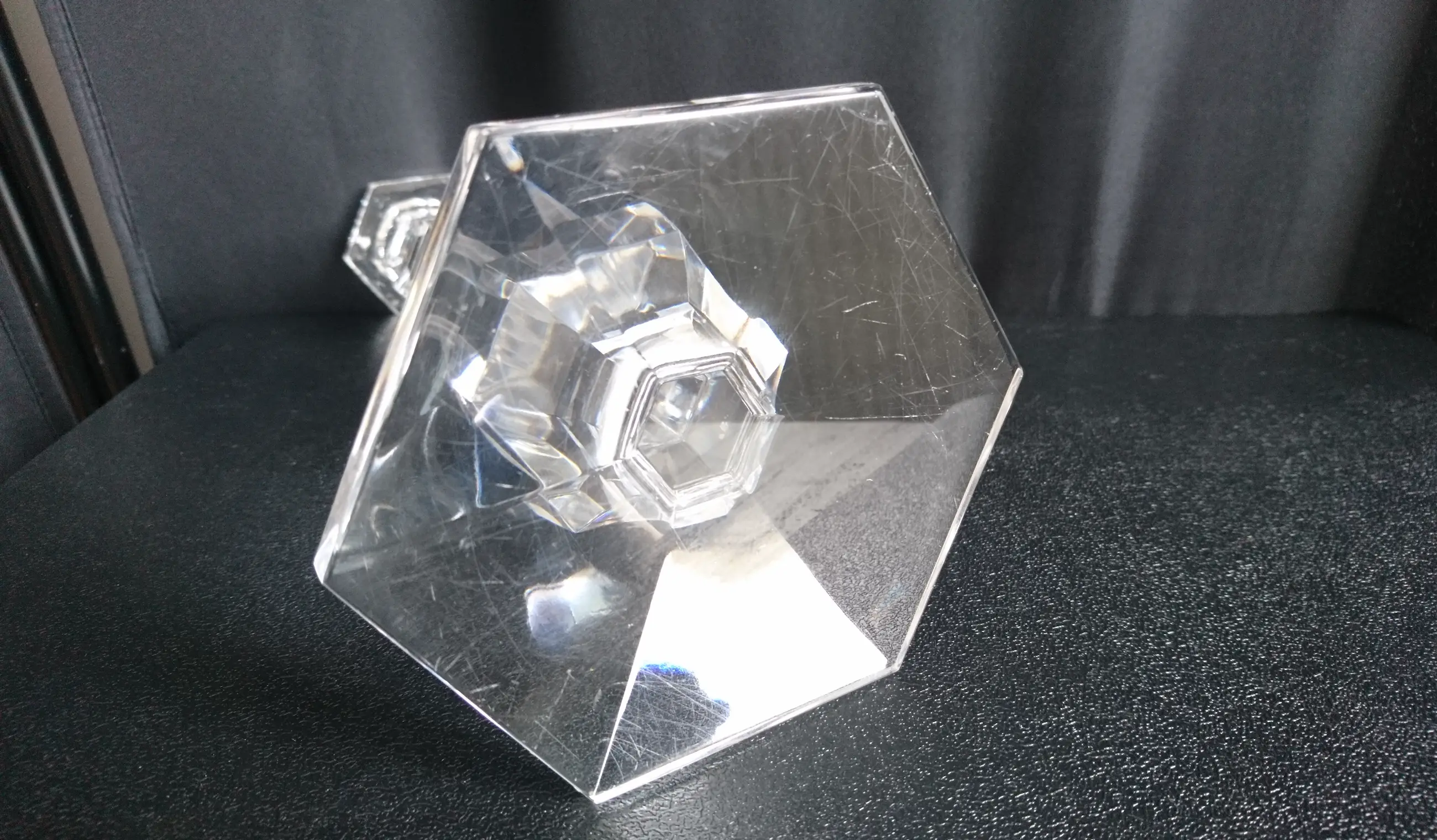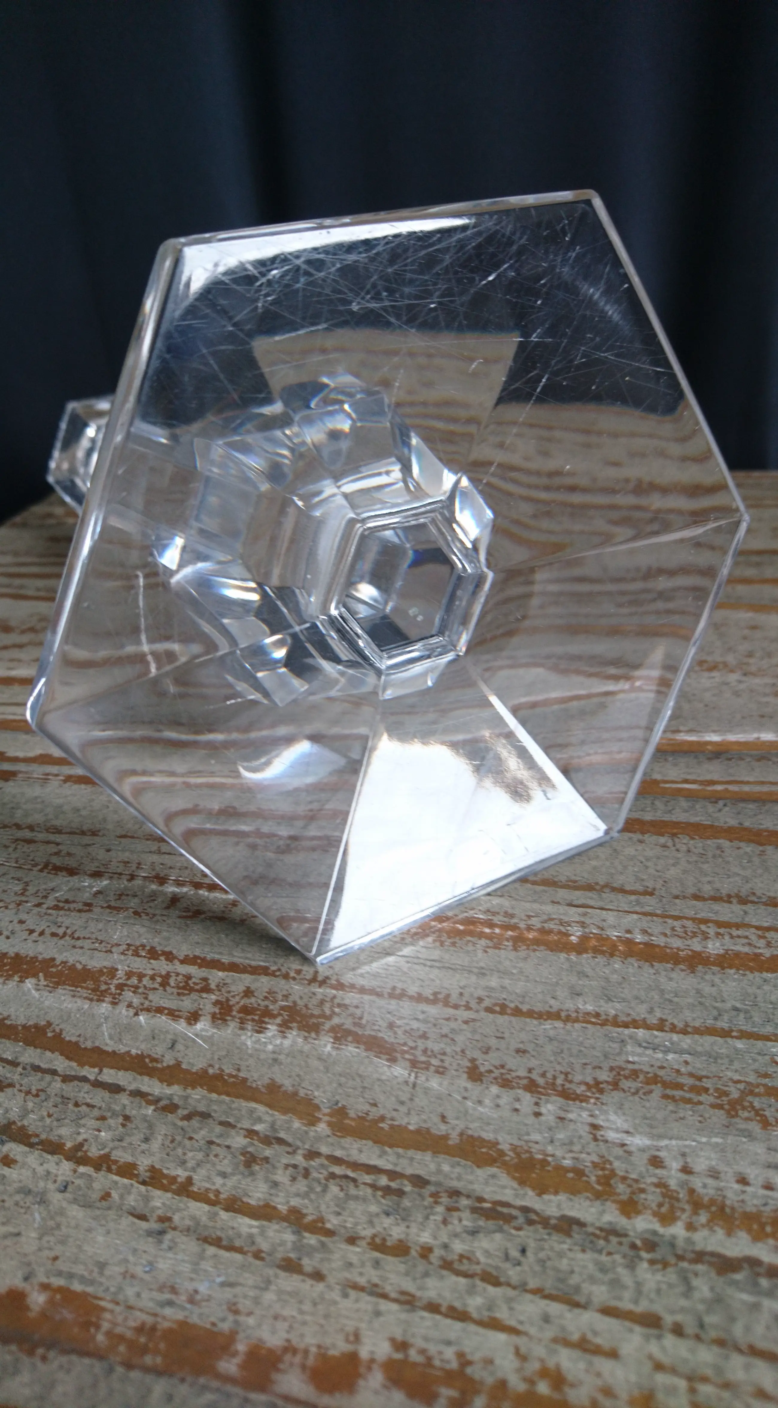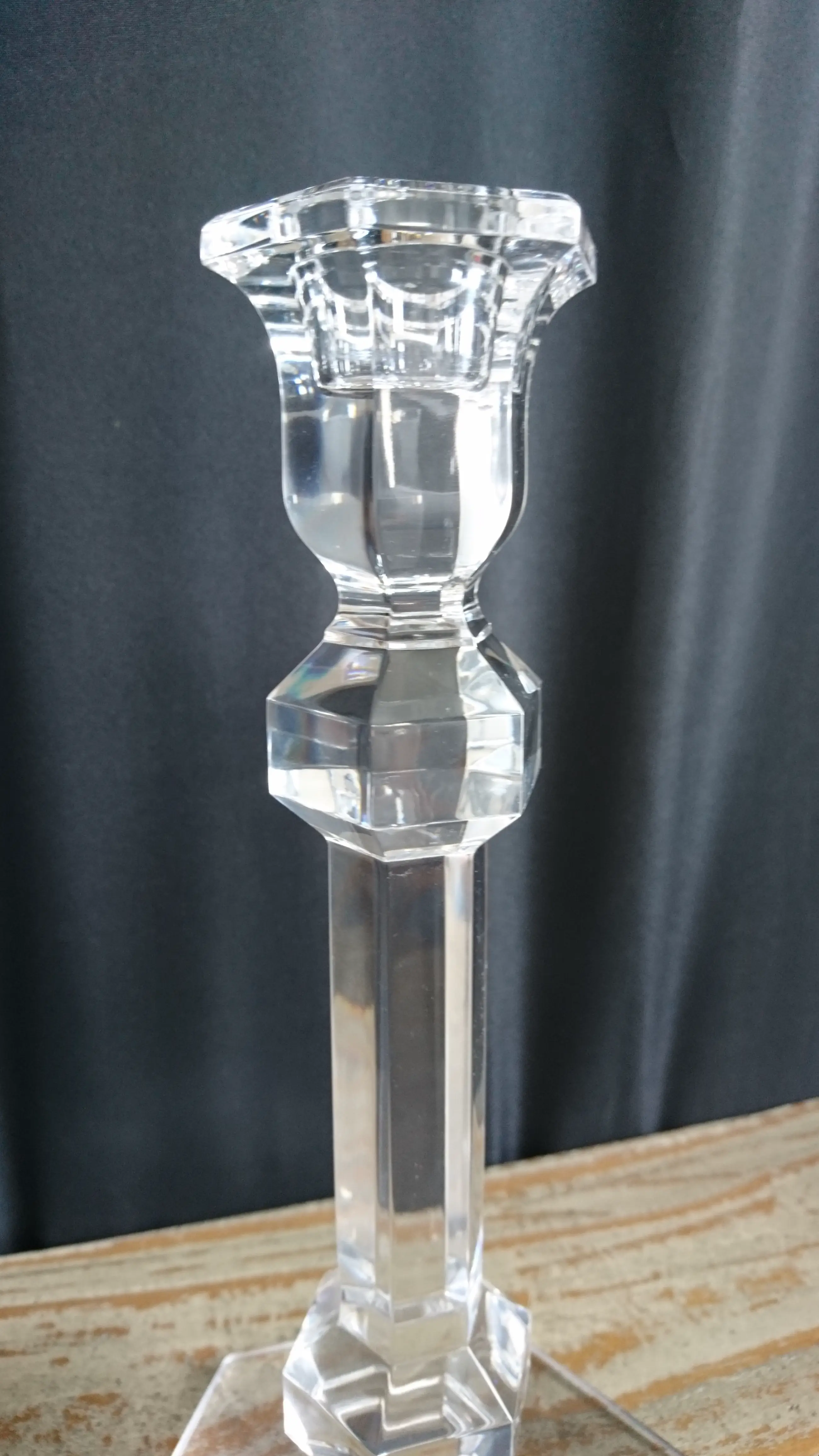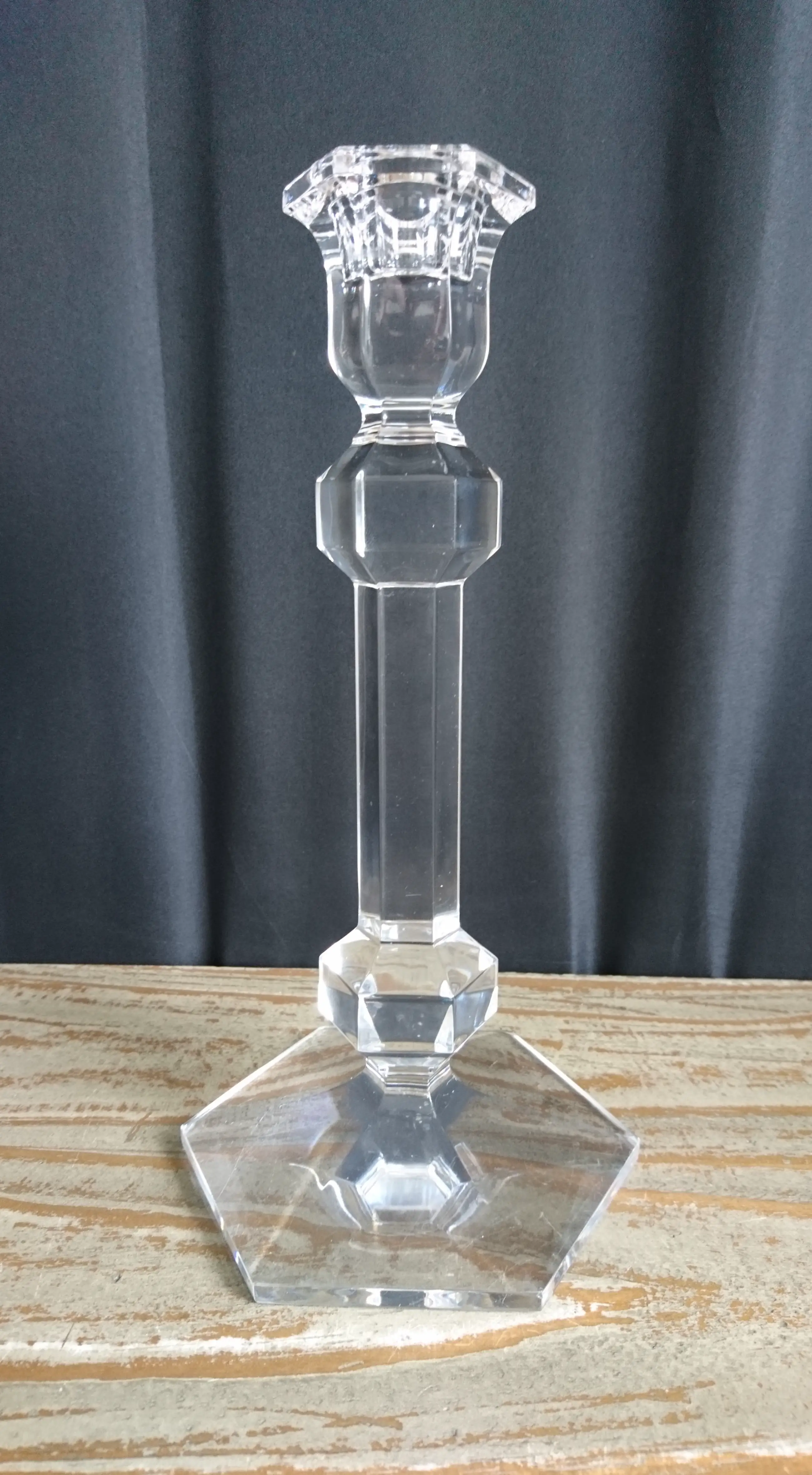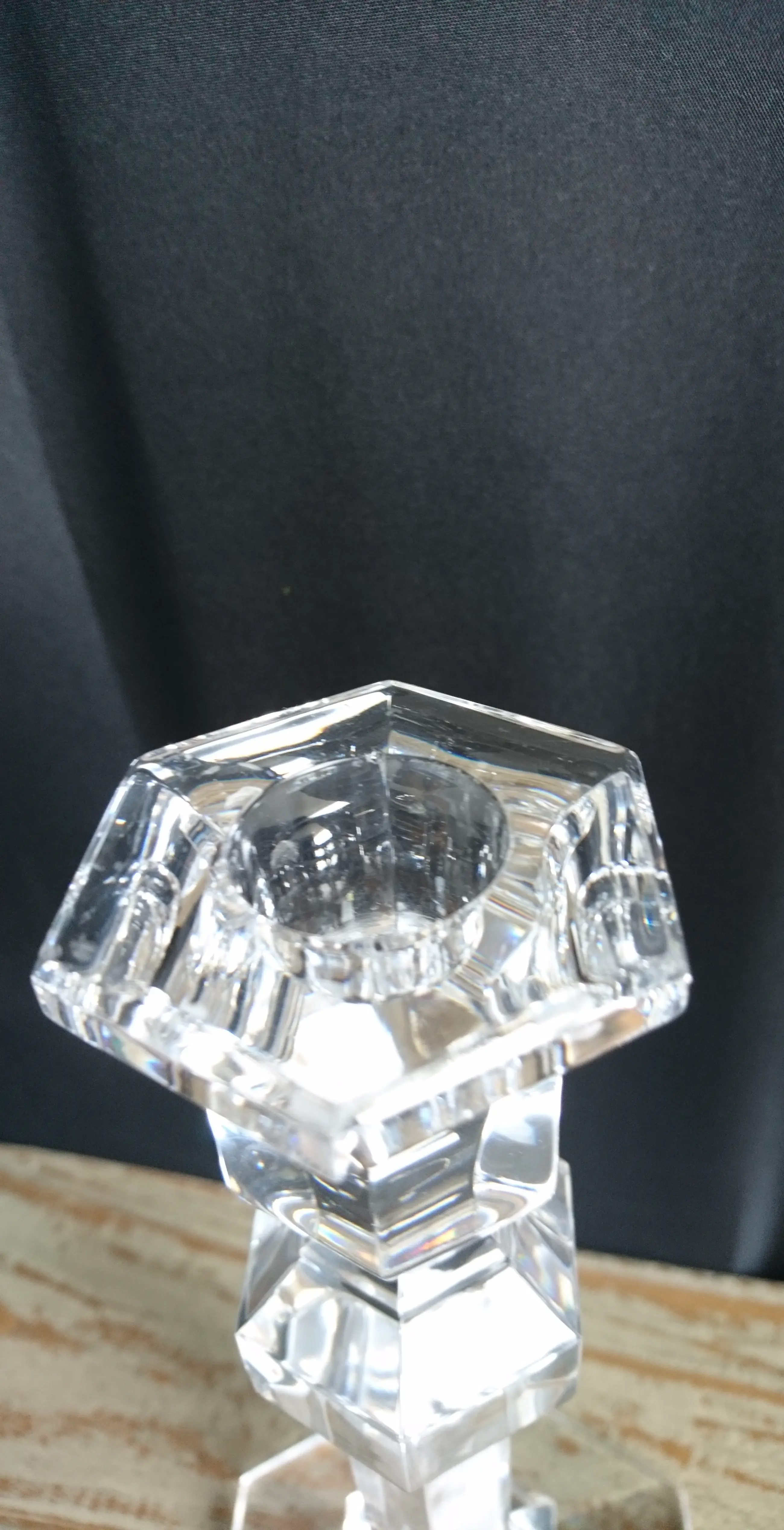 Luxe kristalen kandelaar "Galatée" van Val Saint Lambert. Geen breuk, minuscule vlooiebeetjes bij rand kaarsgat, en bij voet, gebruikskrassen op de onderkant voet (hoofdzakelijk zichtbaar op zwarte ondergrond), maar nog steeds een mooi en kostbaar object. Zie hiervoor de foto's.