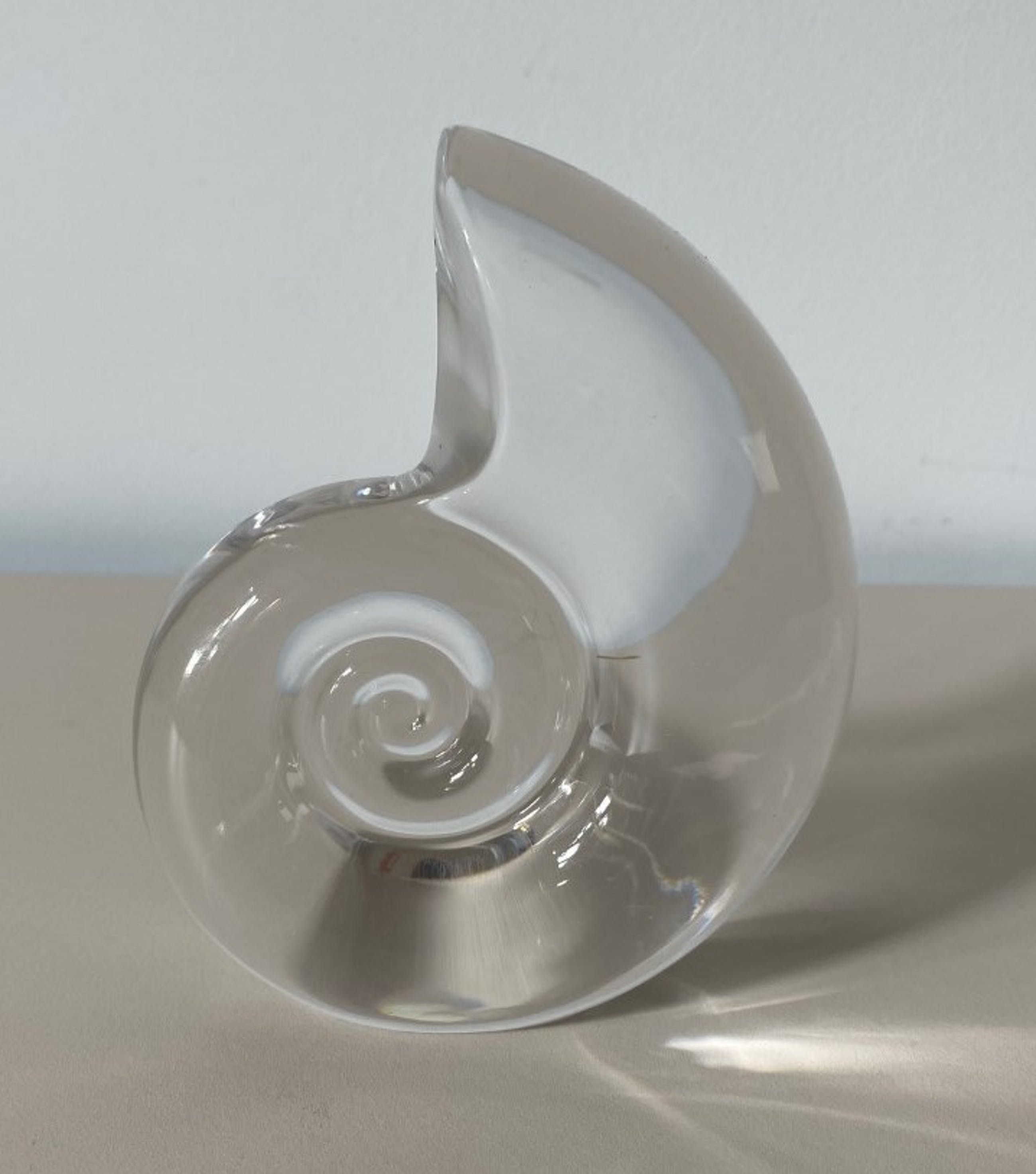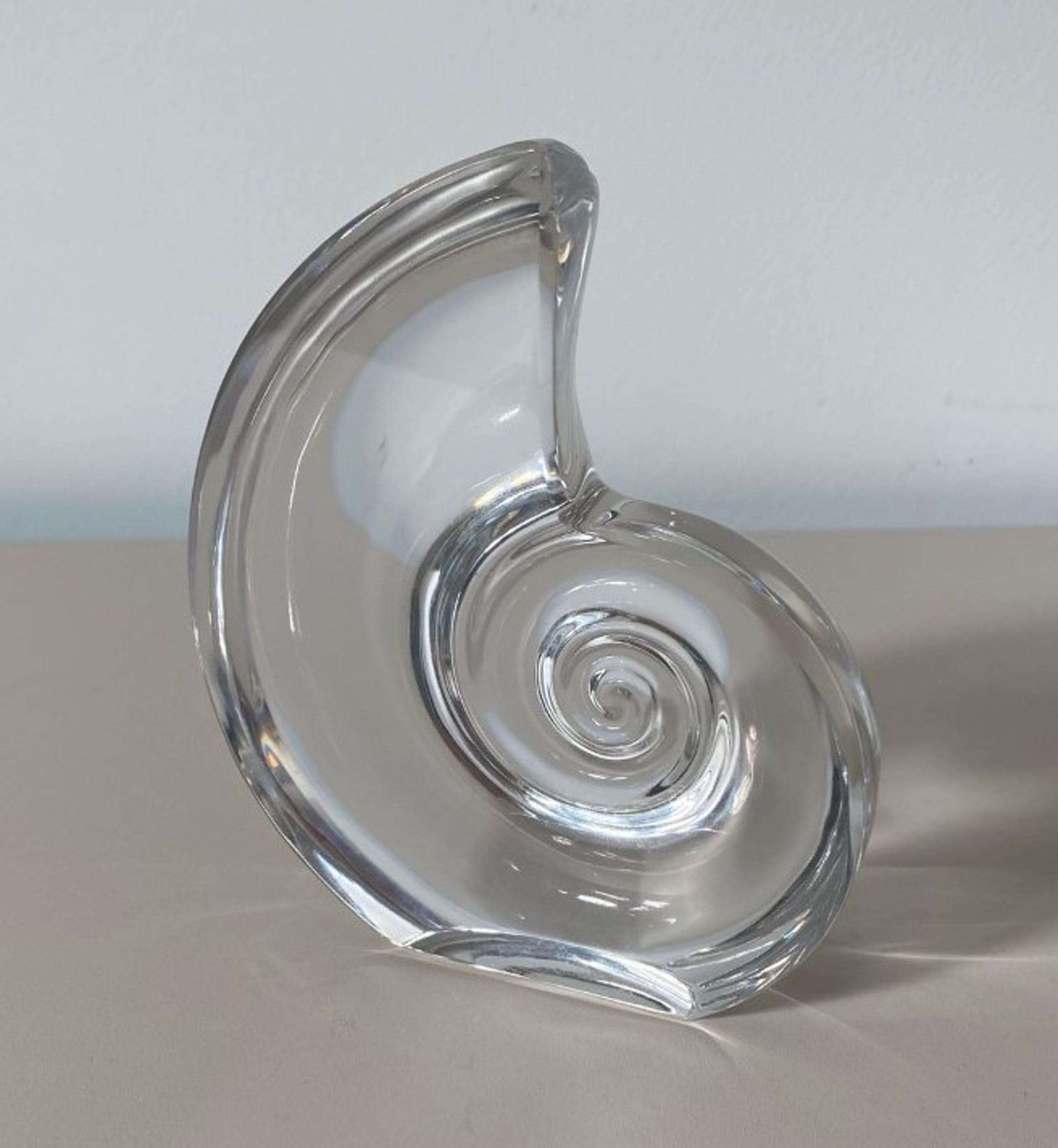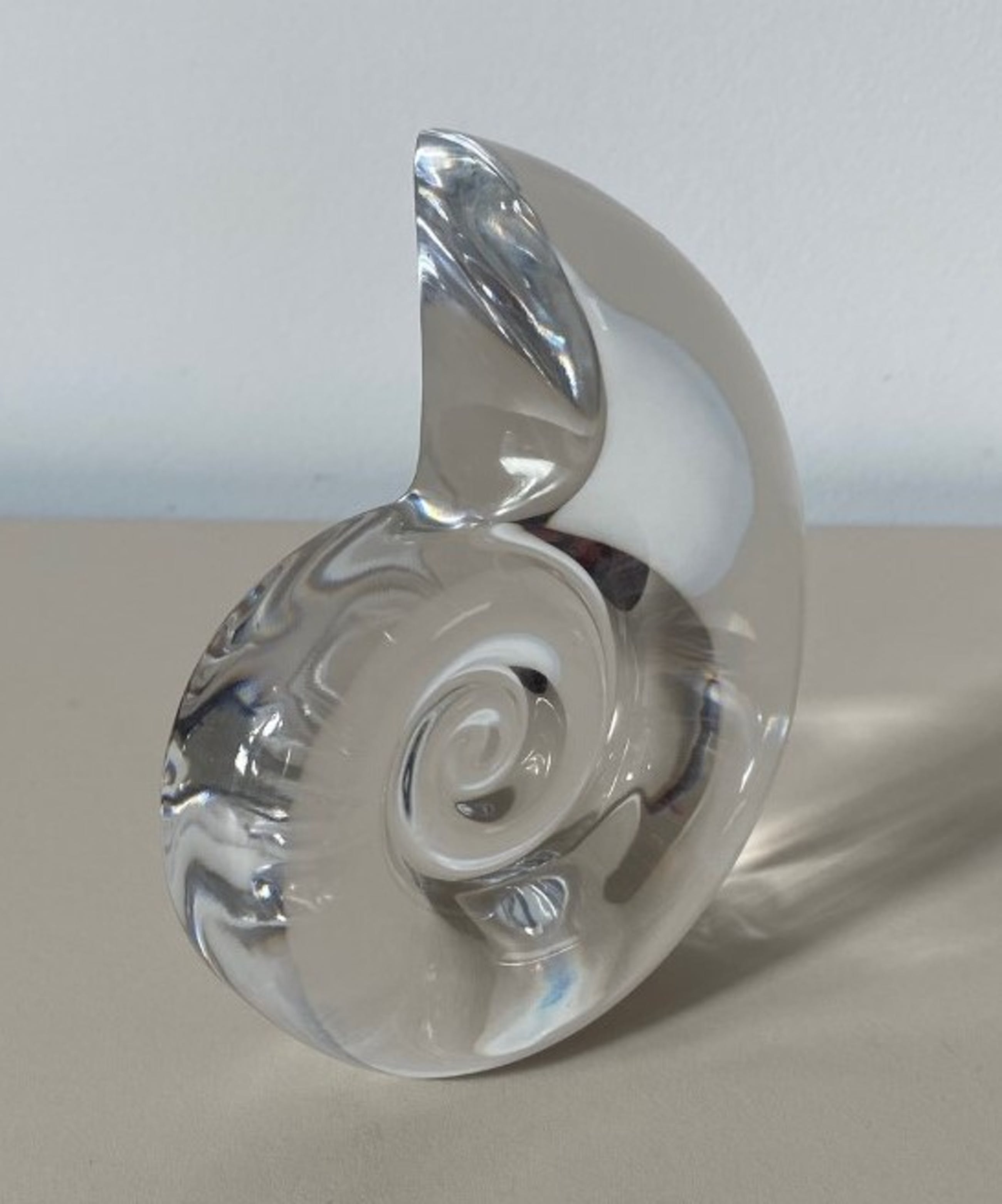 Kristallen presse papier in de vorm van een schelp van Val st. Lambert. In prima onbeschadigde conditie en gesigneerd aan de onderzijde.