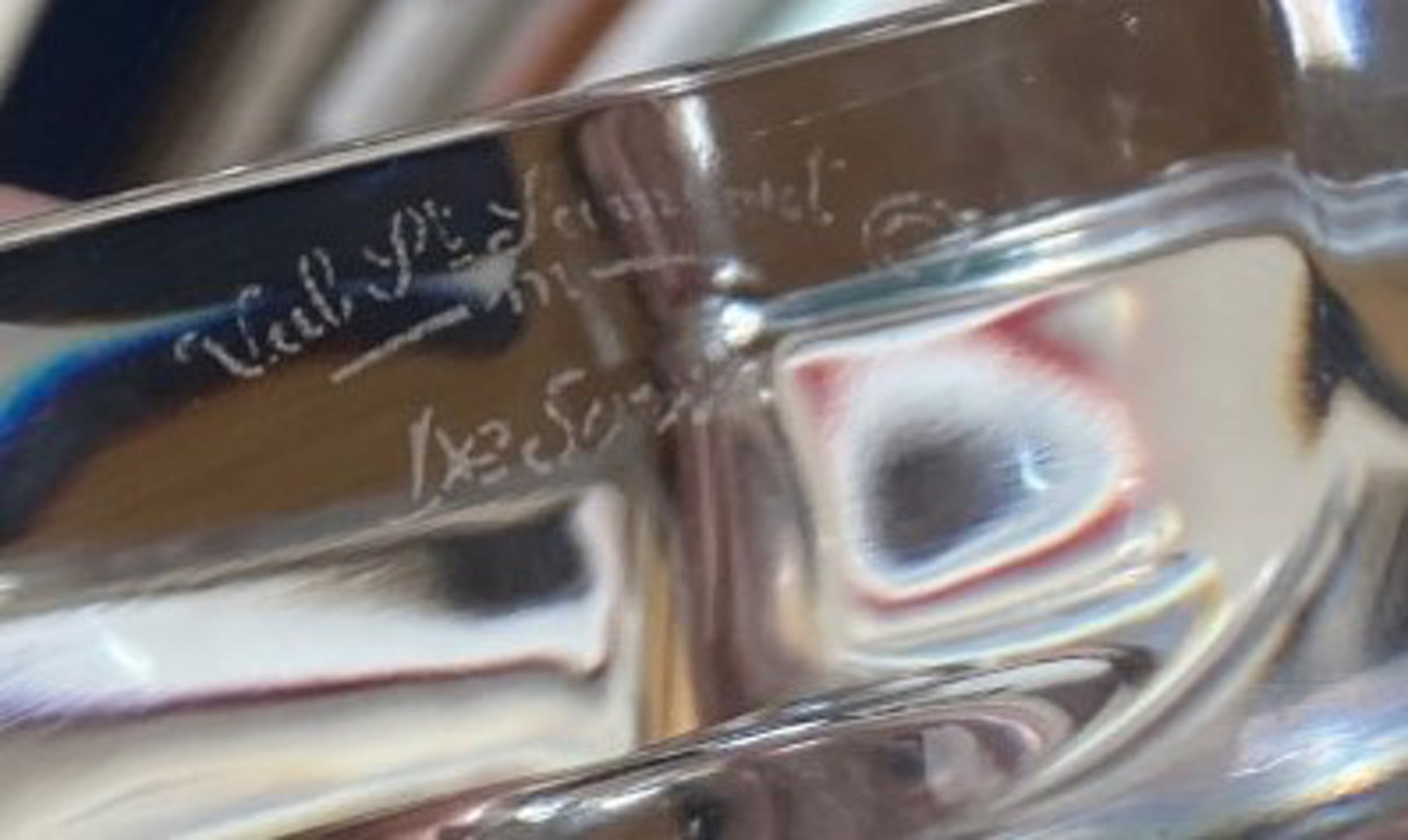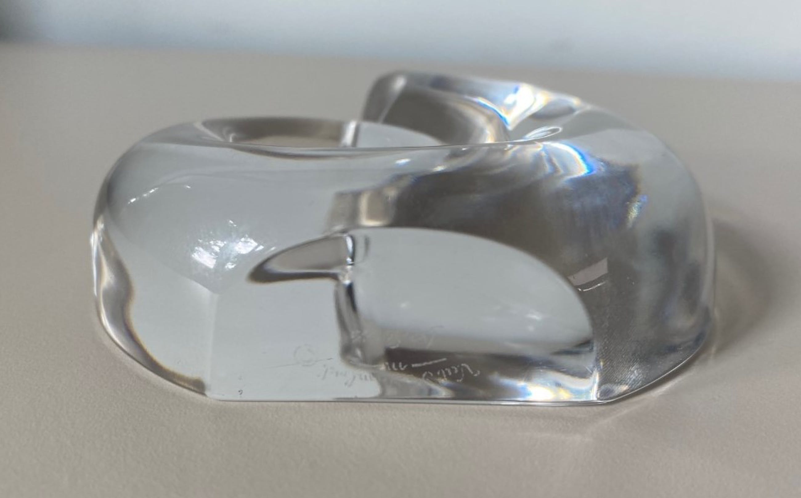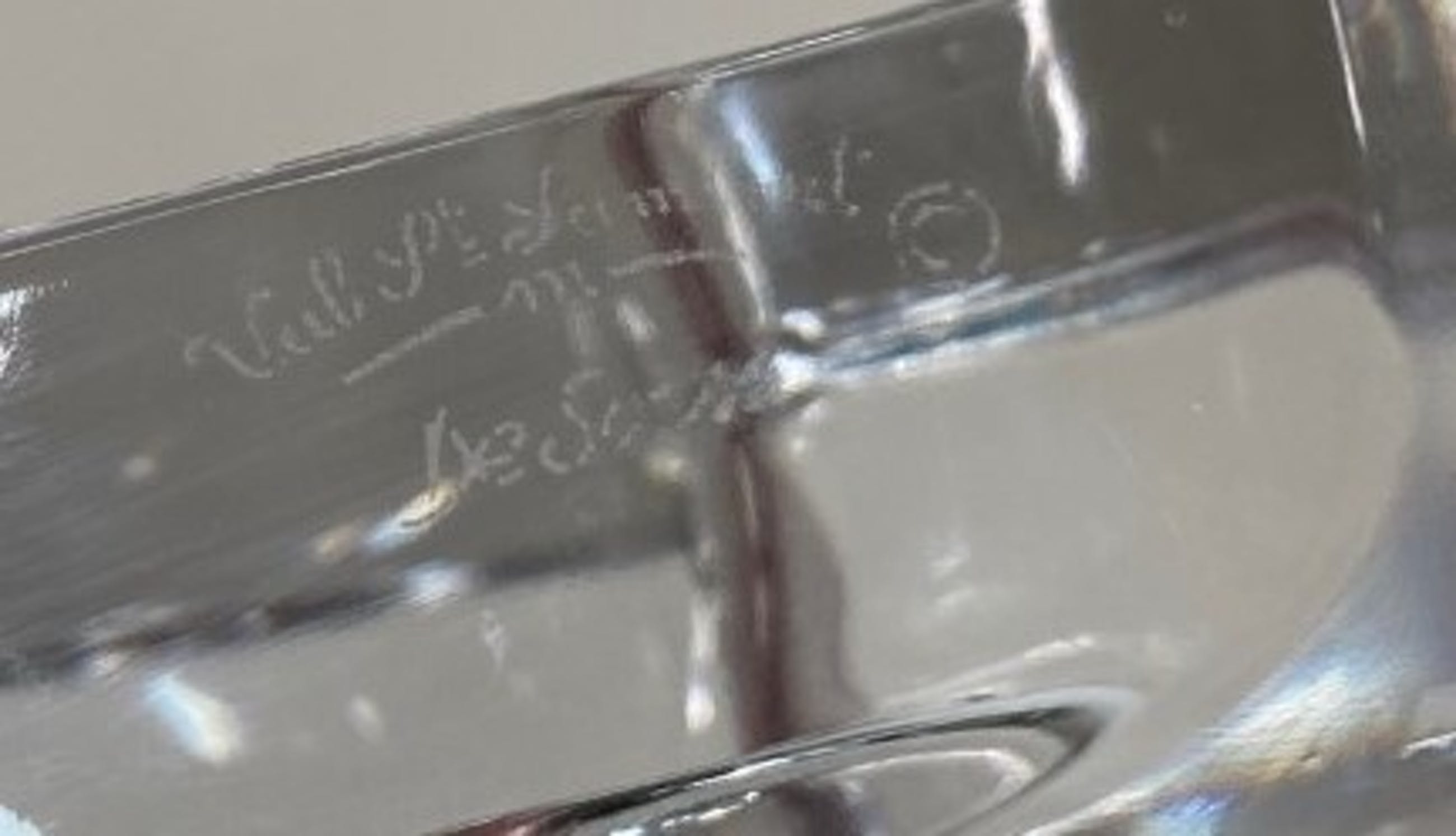 Kristallen presse papier in de vorm van een schelp van Val st. Lambert. In prima onbeschadigde conditie en gesigneerd aan de onderzijde.