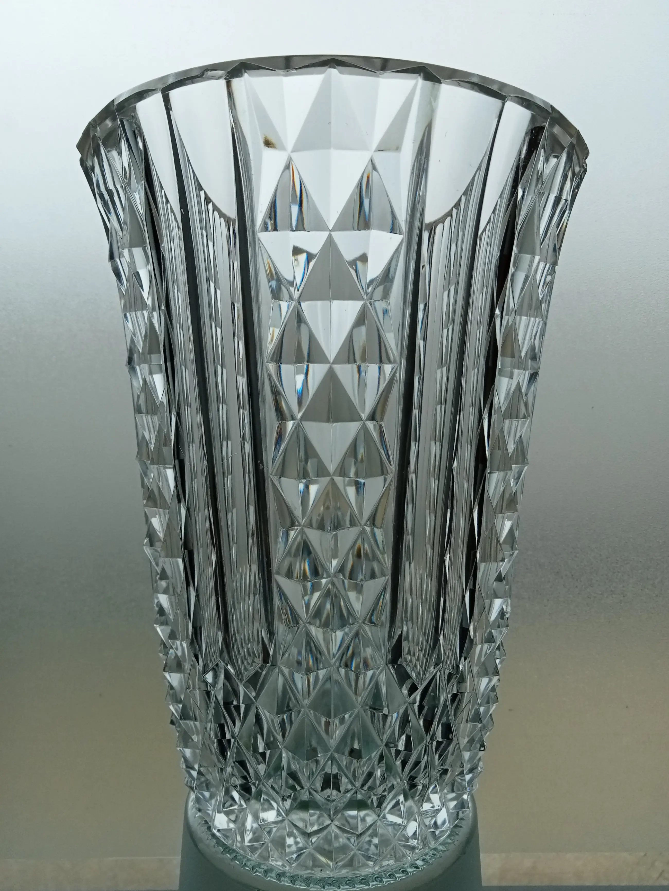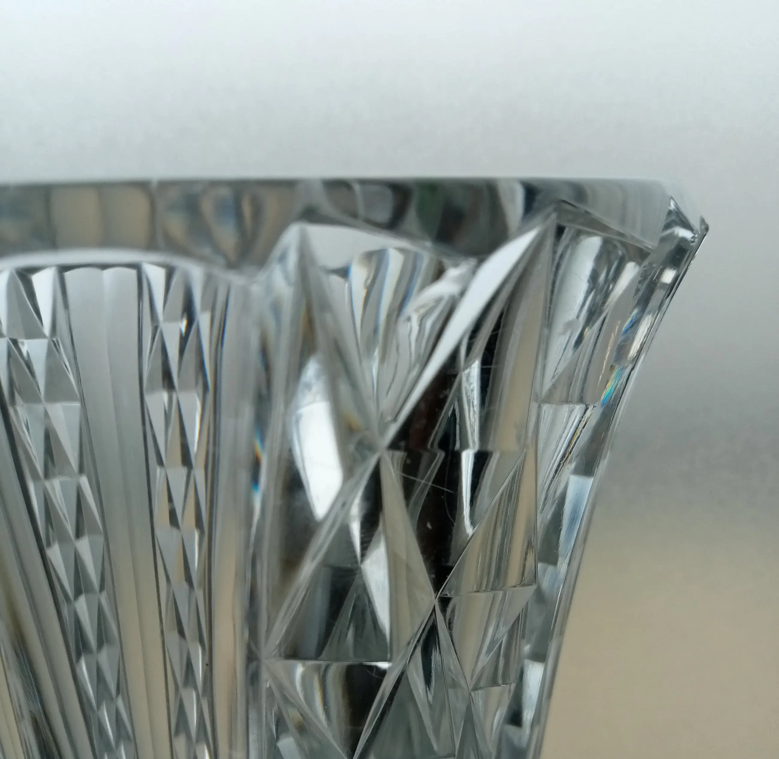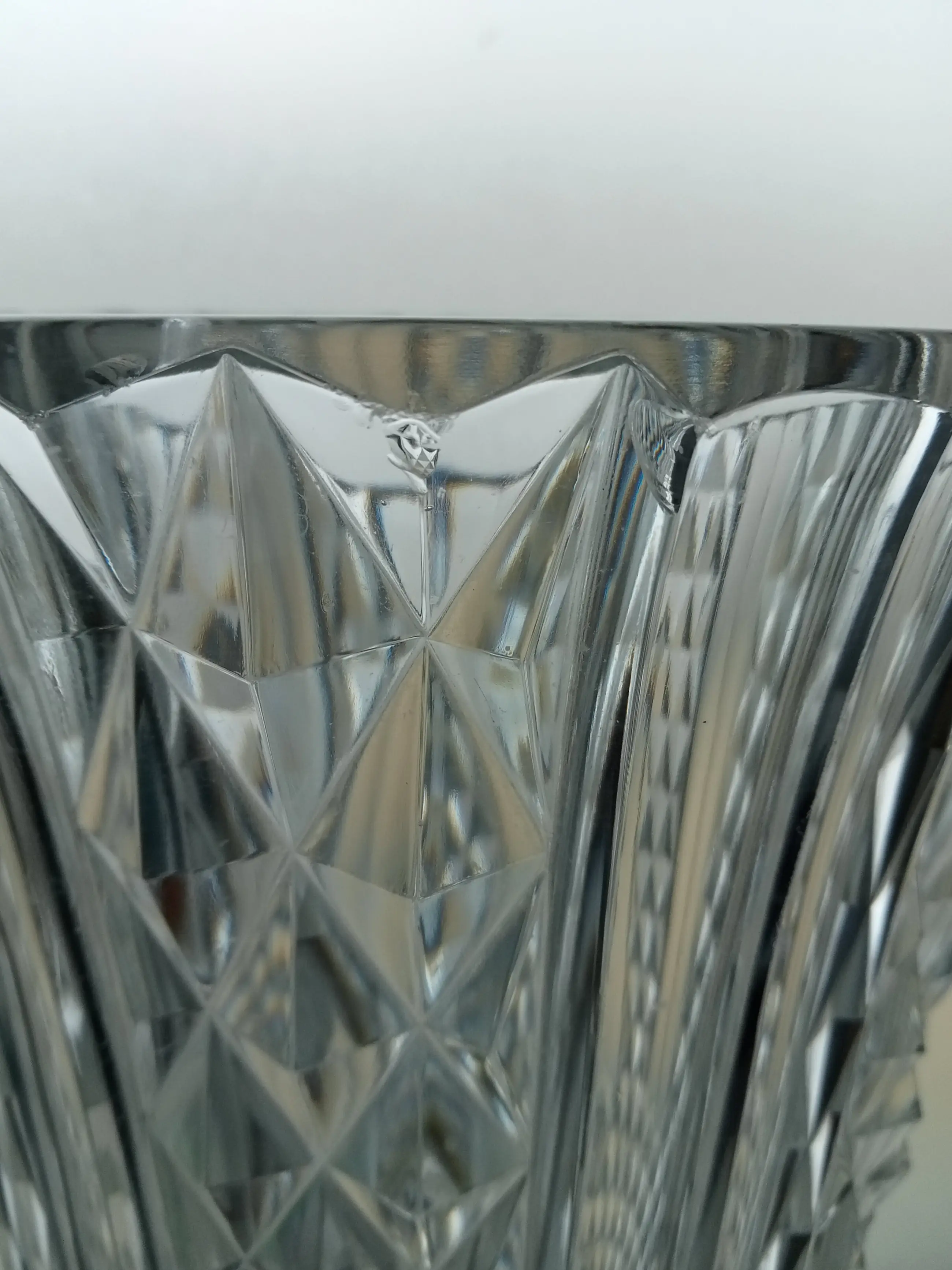 Zware vaas van geperst kristal. Prachtig tijdloos ontwerp 1957 Charles Graffart en Rene Delvenne voor Val Saint Lambert. Vaas komt voor in catalogus, zie foto's. Er zijn wat gebruiks sporen deze zijn duidelijk gefotografeerd. Prachtig ontwerp dat speelt met het licht
