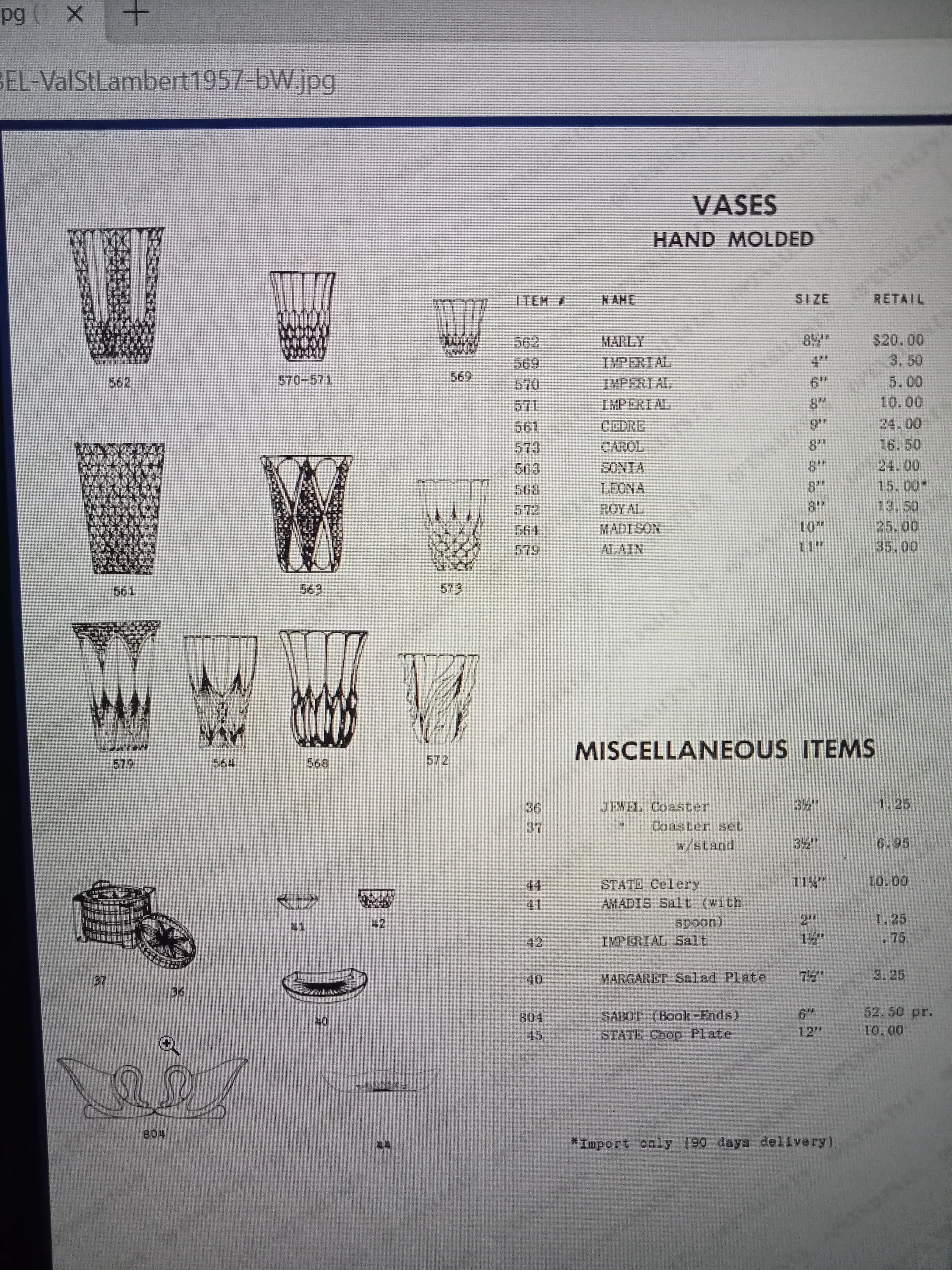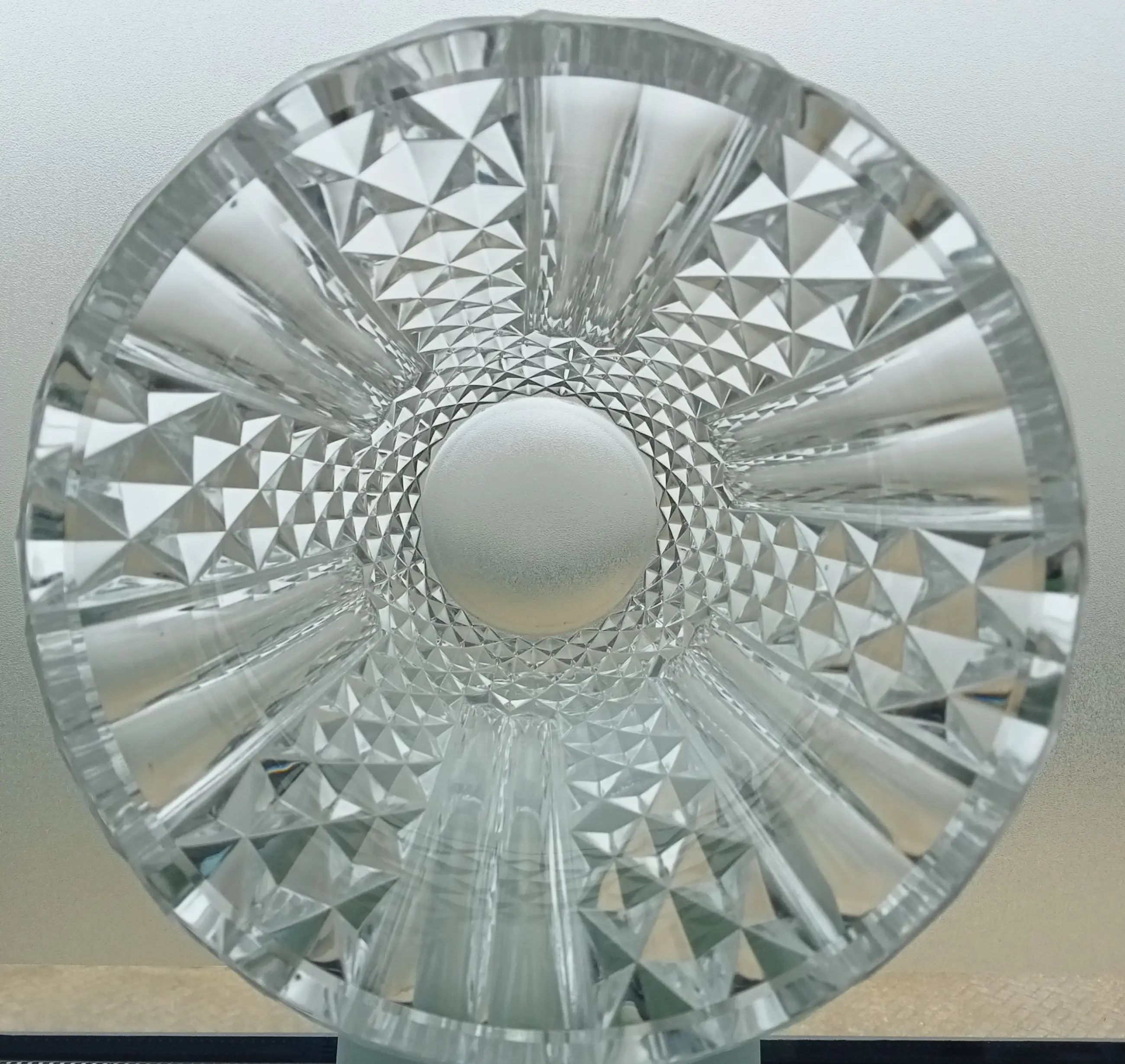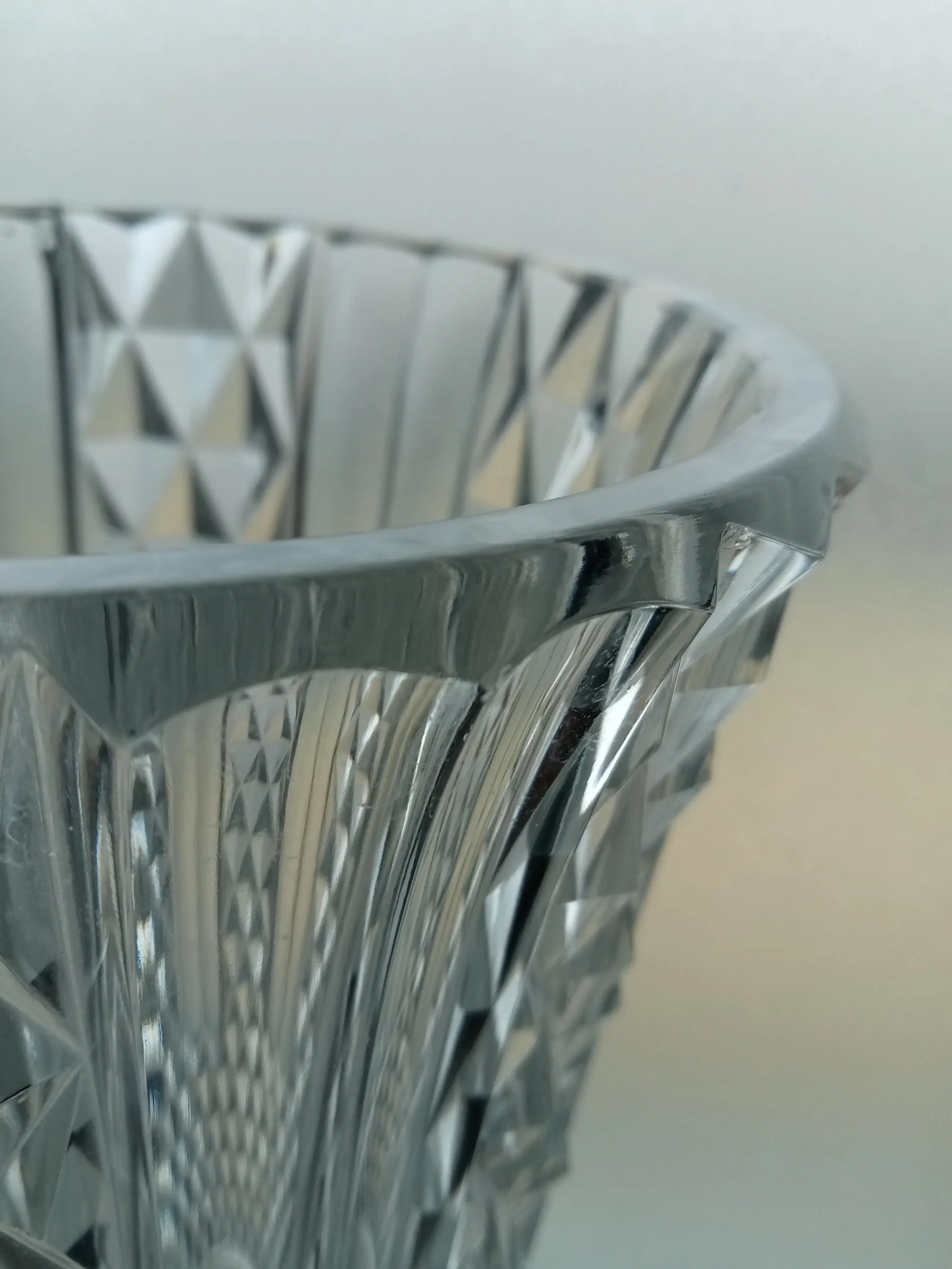 Zware vaas van geperst kristal. Prachtig tijdloos ontwerp 1957 Charles Graffart en Rene Delvenne voor Val Saint Lambert. Vaas komt voor in catalogus, zie foto's. Er zijn wat gebruiks sporen deze zijn duidelijk gefotografeerd. Prachtig ontwerp dat speelt met het licht