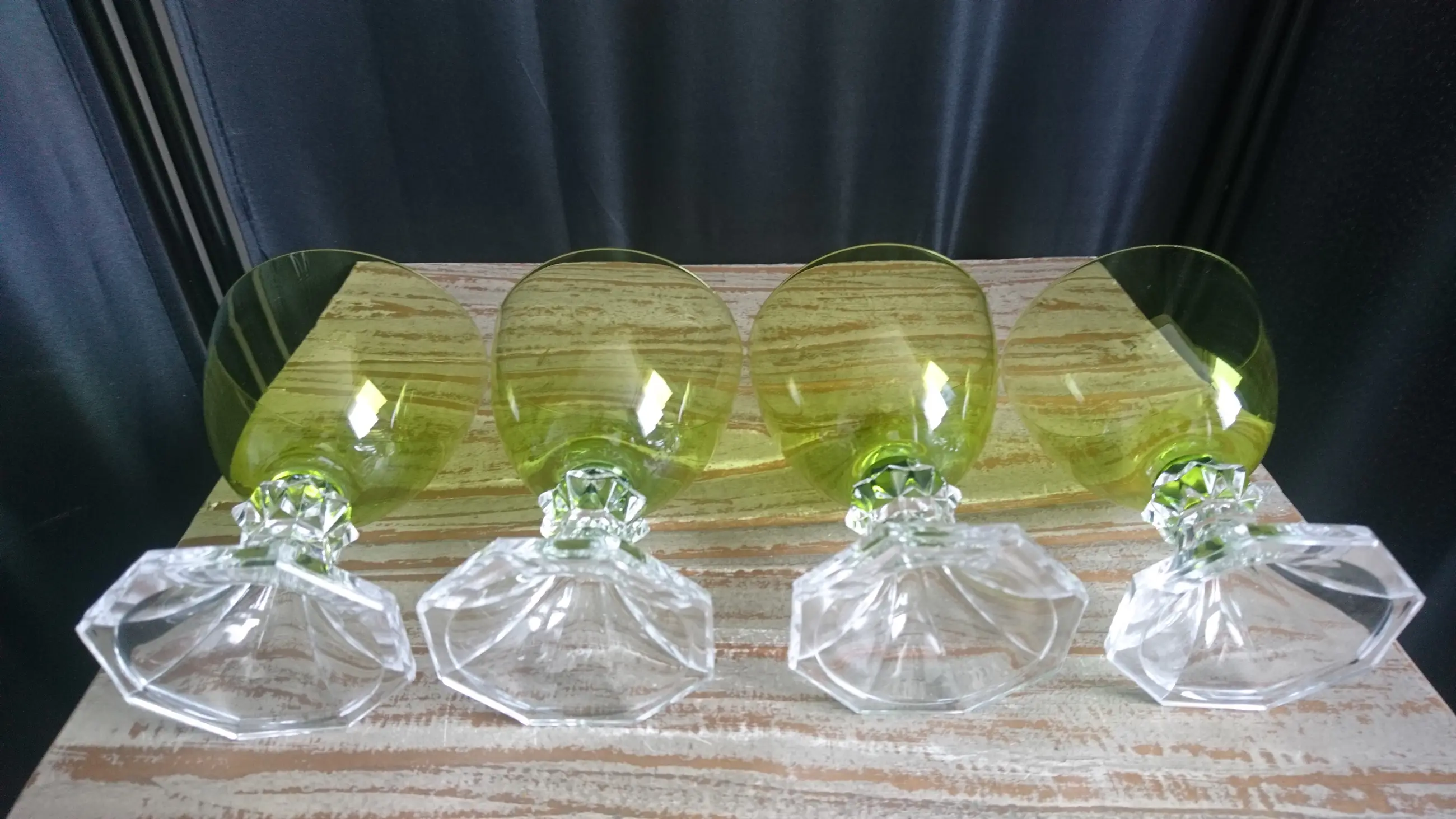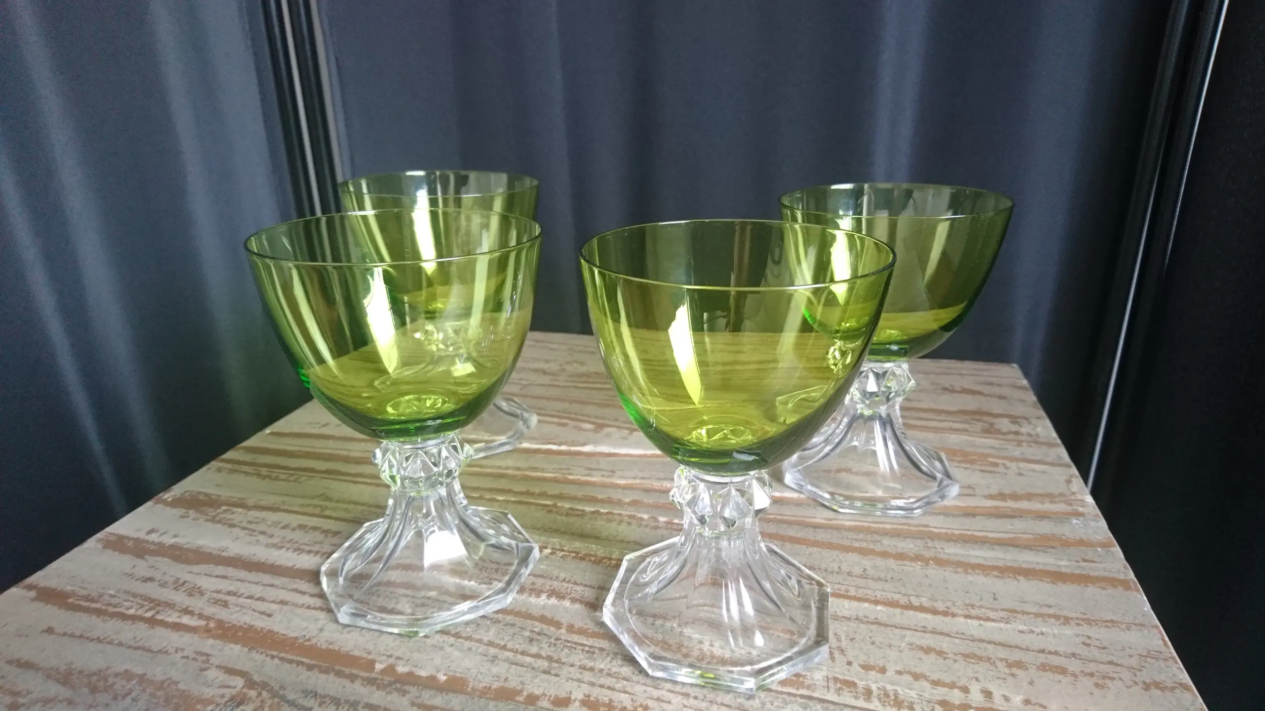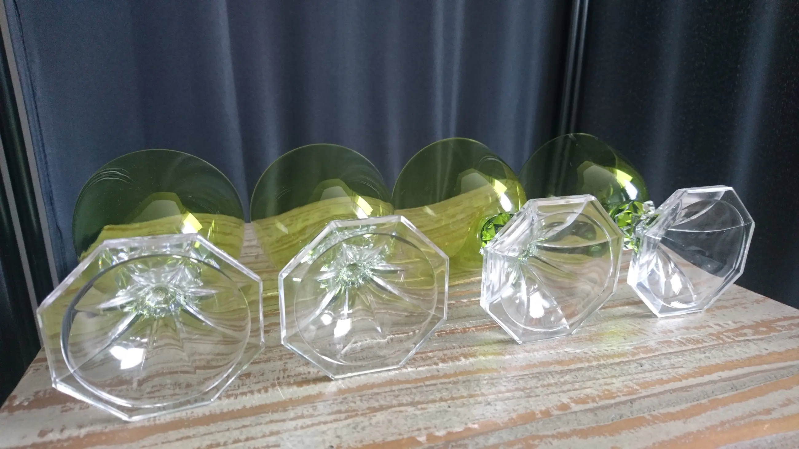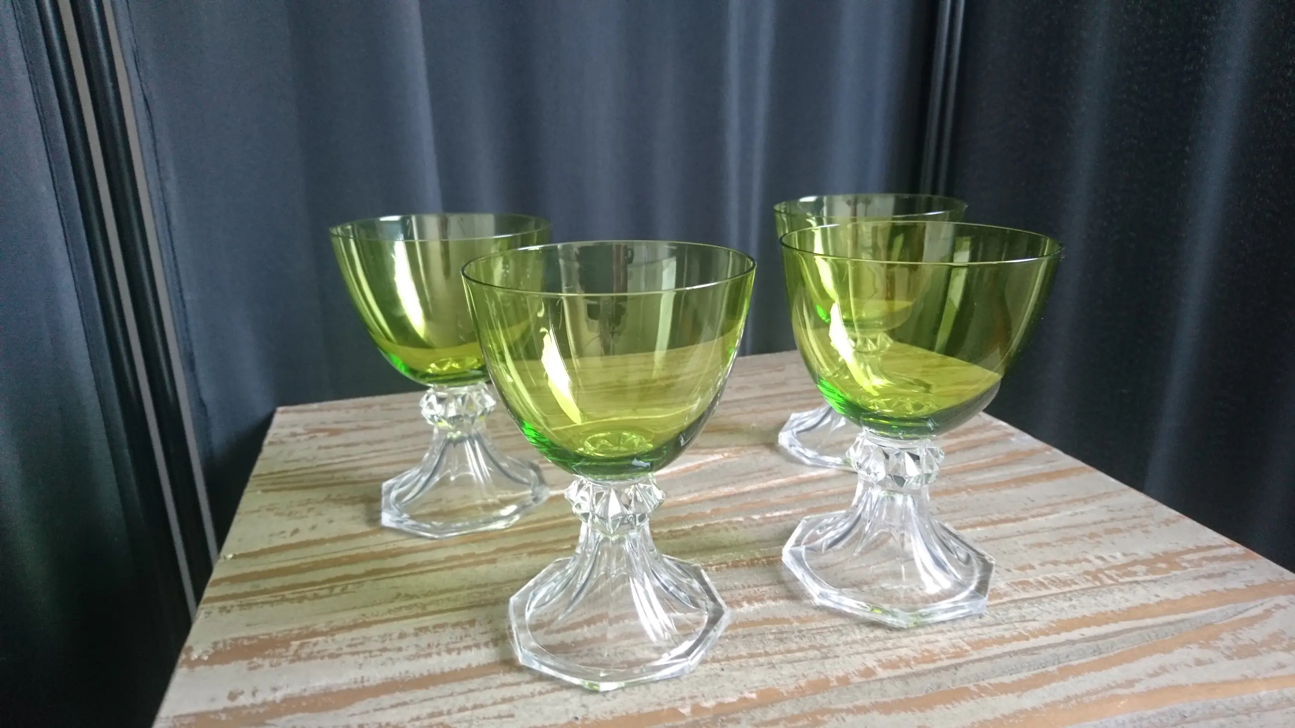 Val Saint-Lambert, model Yale, kristallen wijn/water glazen. Hoogte: 12,2 cm. Geproduceerd tussen 1960 en 1980. In mooie staat. Geen breuk of chips. Eéntje heeft er een klein krasje (zie de laatste foto).