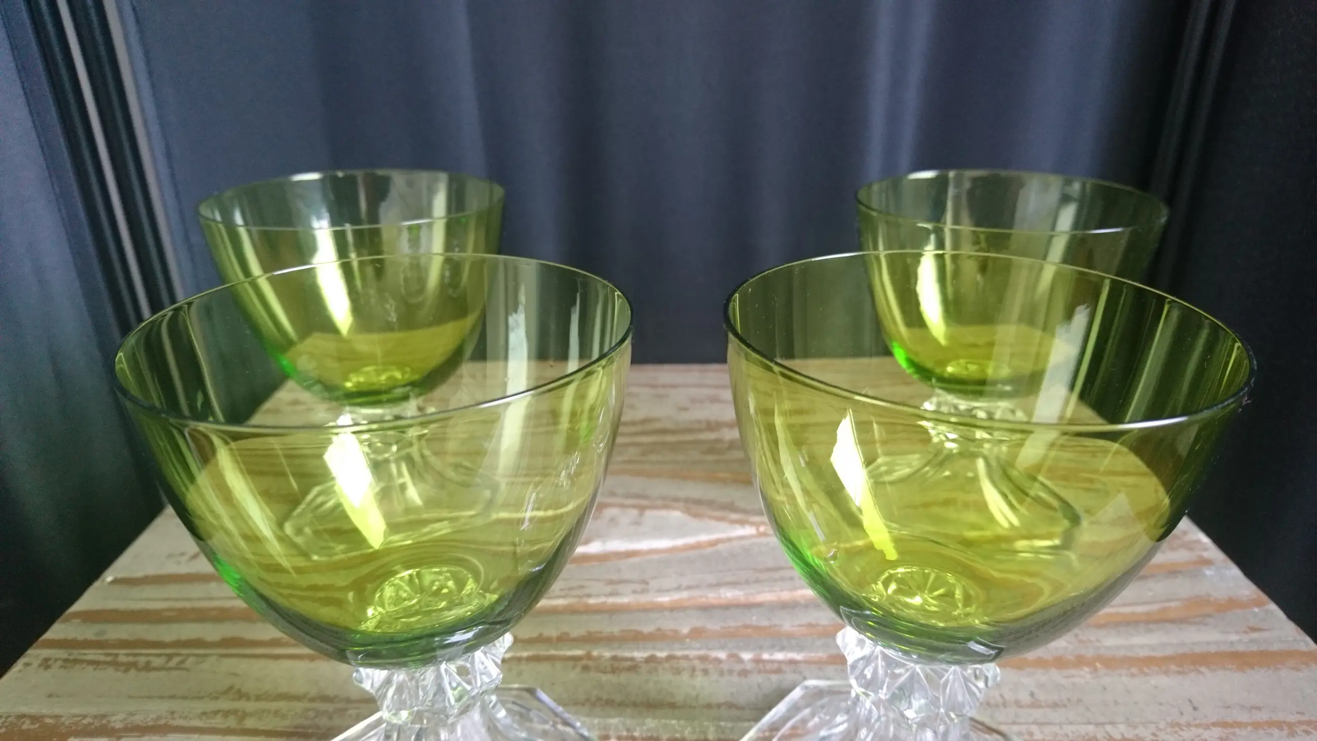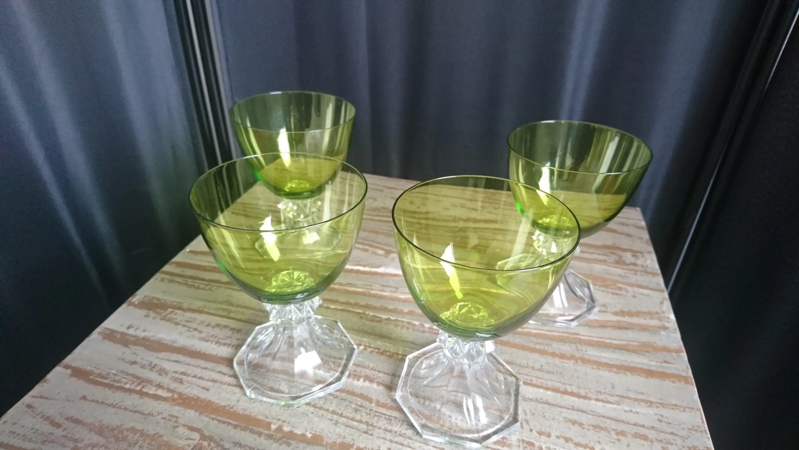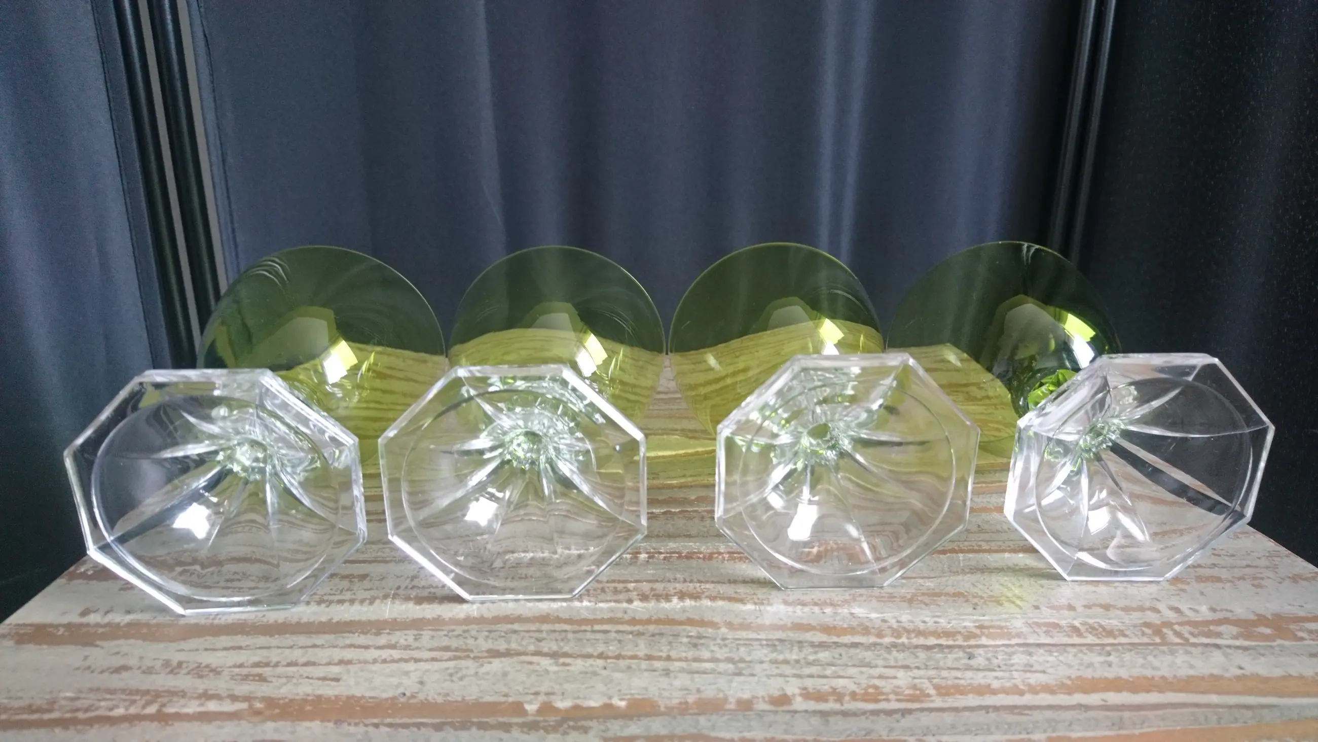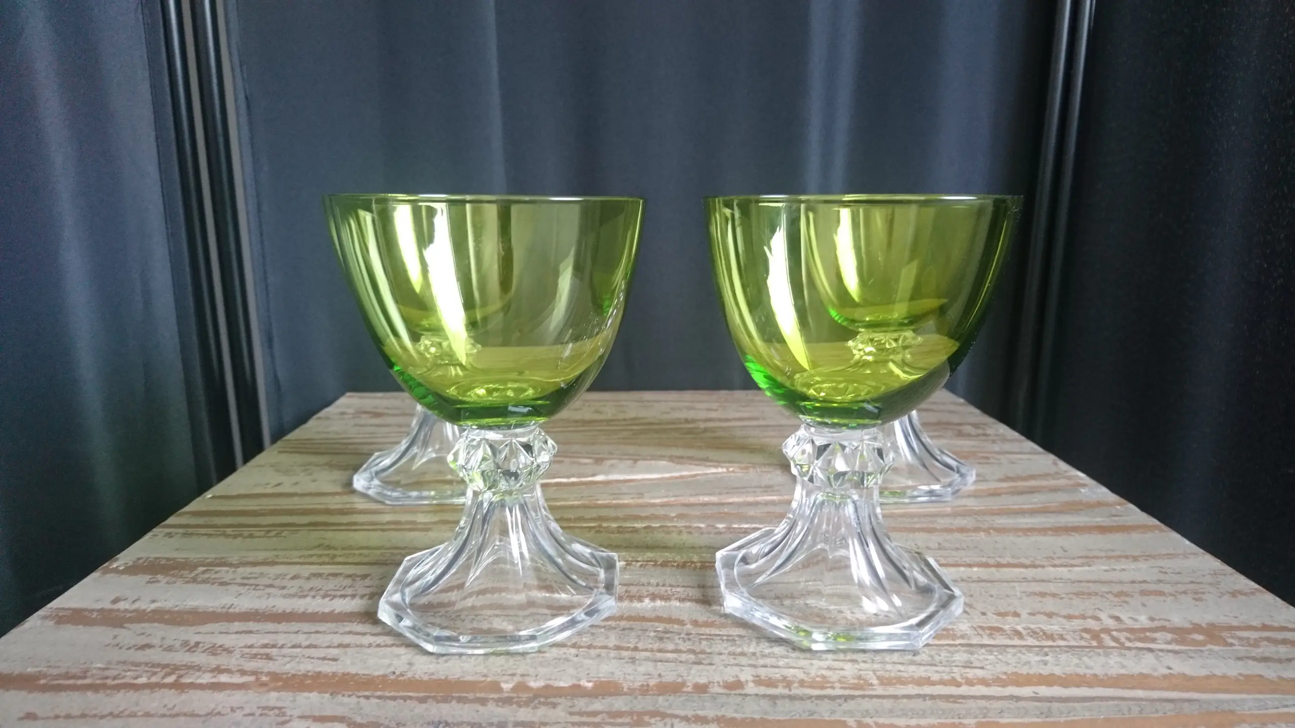 Val Saint-Lambert, model Yale, kristallen wijn/water glazen. Hoogte: 12,2 cm. Geproduceerd tussen 1960 en 1980. In mooie staat. Geen breuk of chips. Eéntje heeft er een klein krasje (zie de laatste foto).