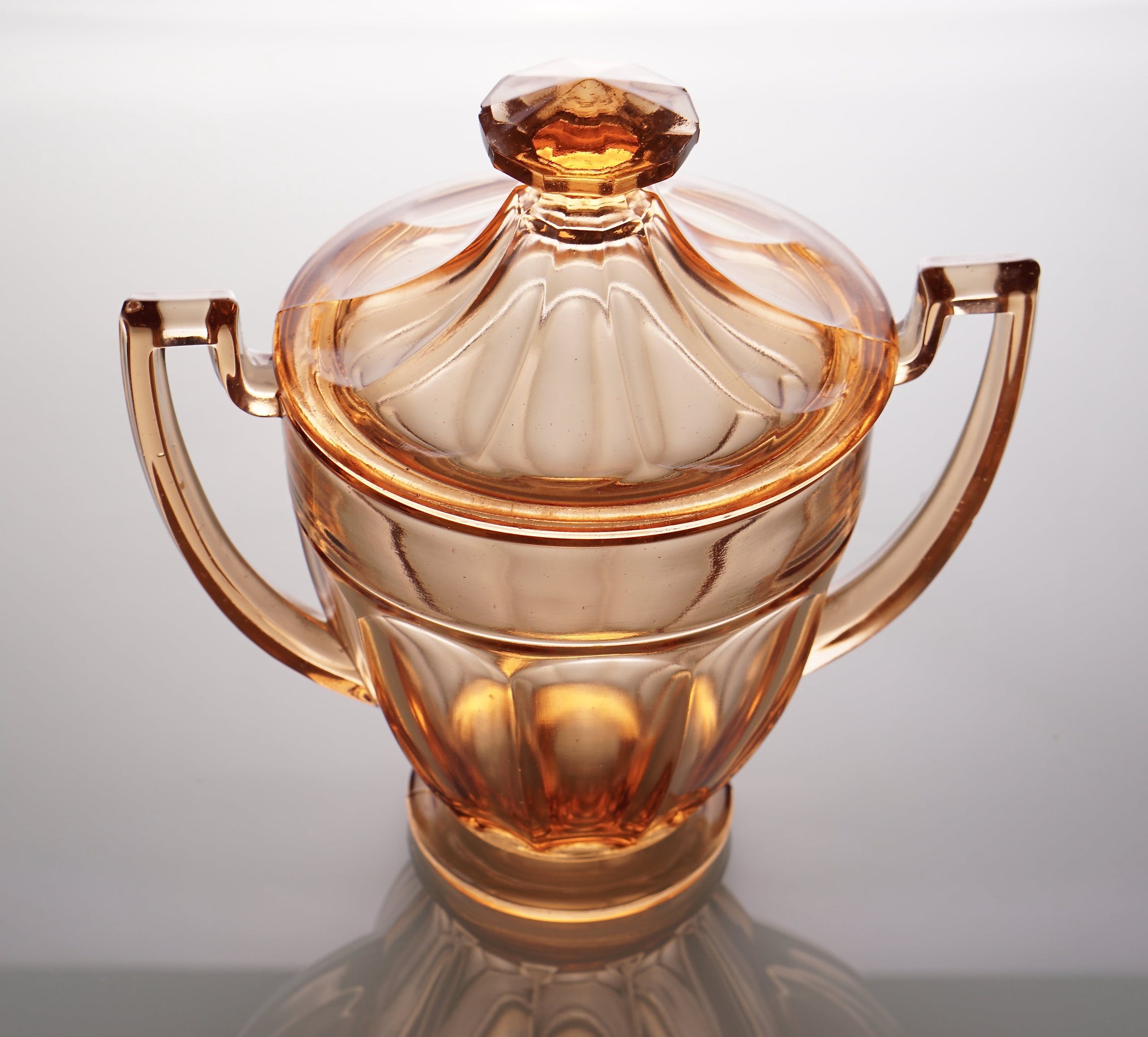 Zeldzame uitvoering van de Luxval Noémie coupe in Rosaline kleur: Compotier met deksel. Tijdens de jaren dertig voerde Val Saint-Lambert een productlijn-LUXVAL - van geperst decoratief art deco glaswerk, gemaakt door de in die tijd beste ontwerpers Charles Graffart en Rene Delvenne.