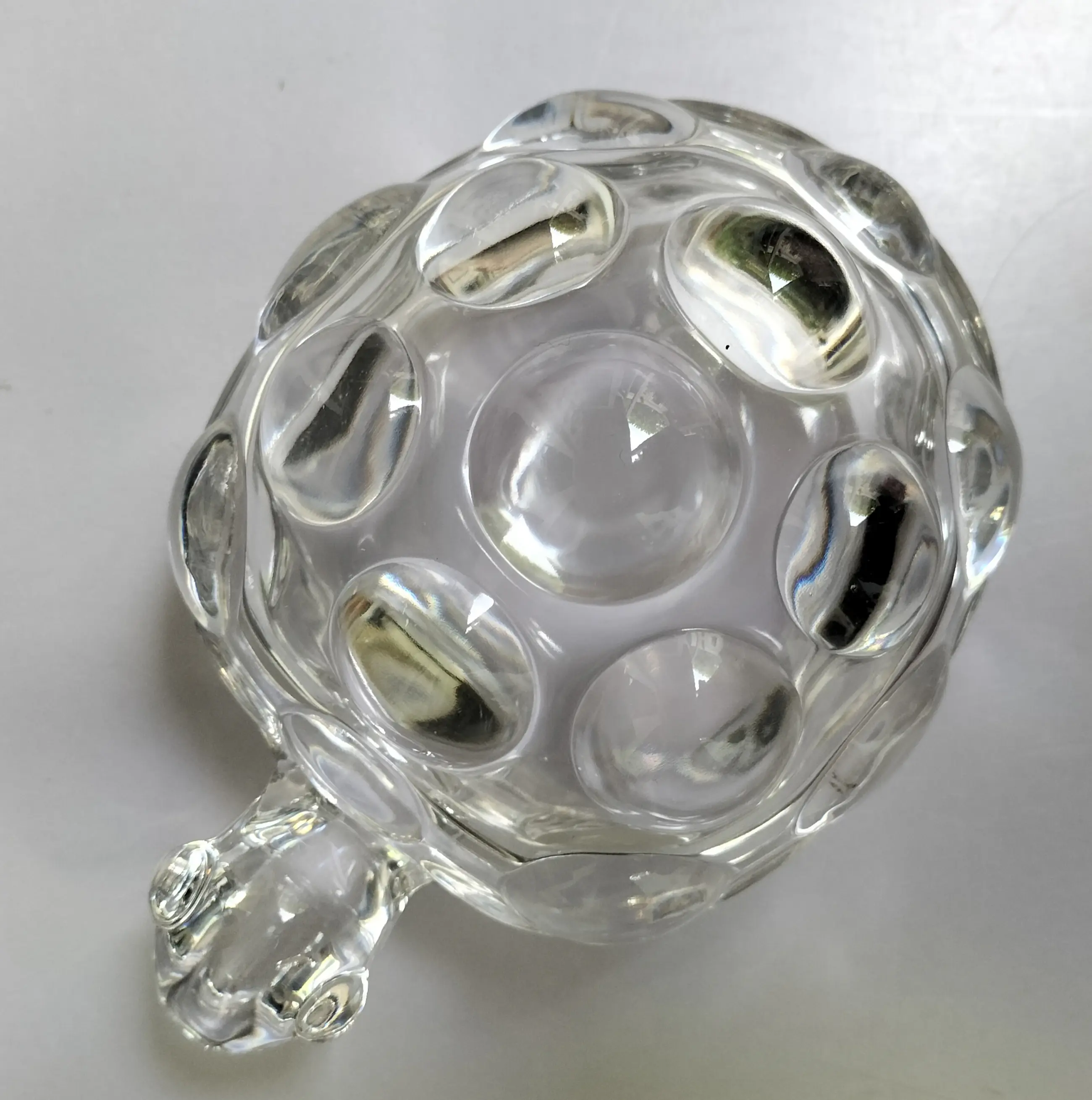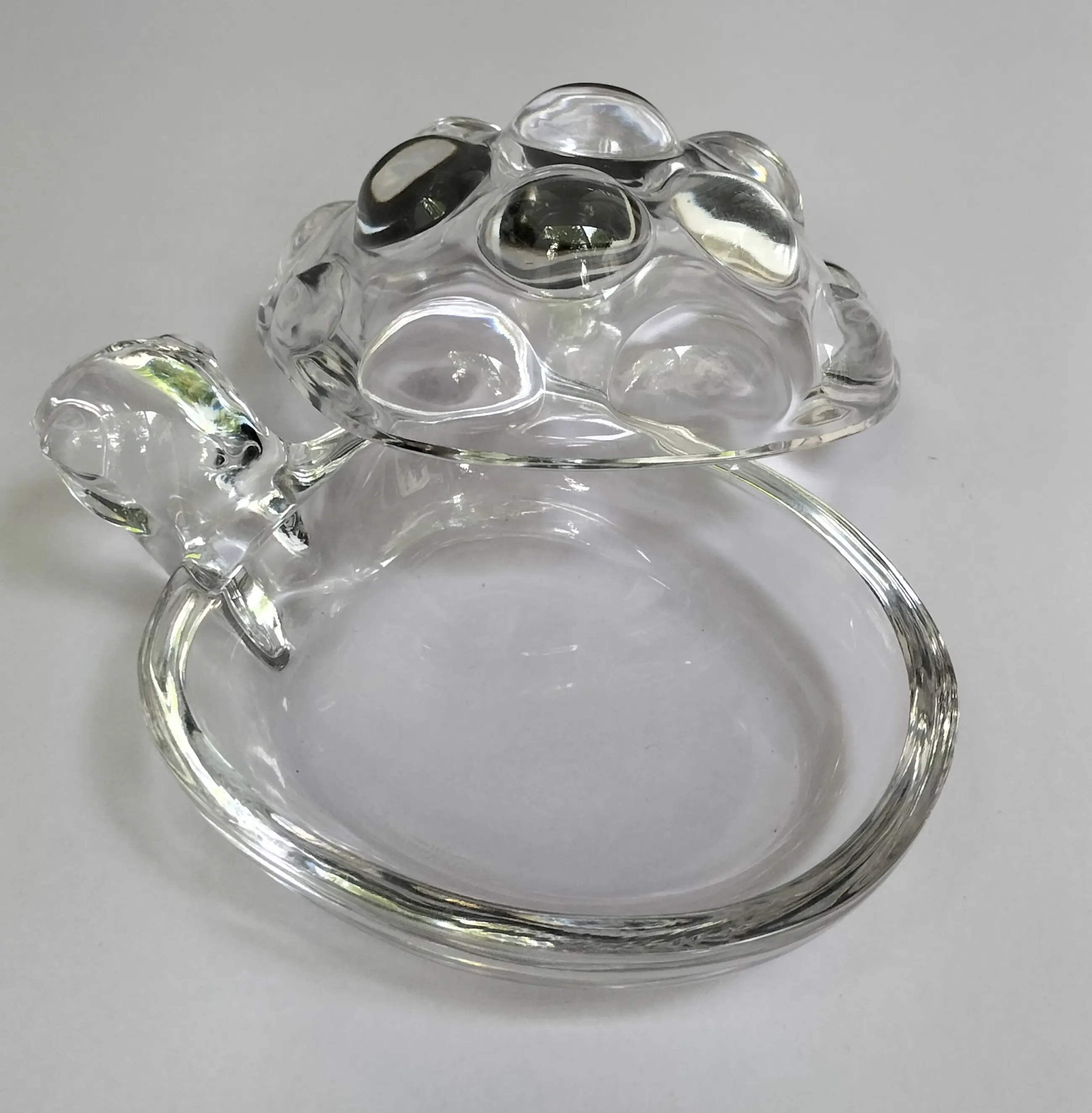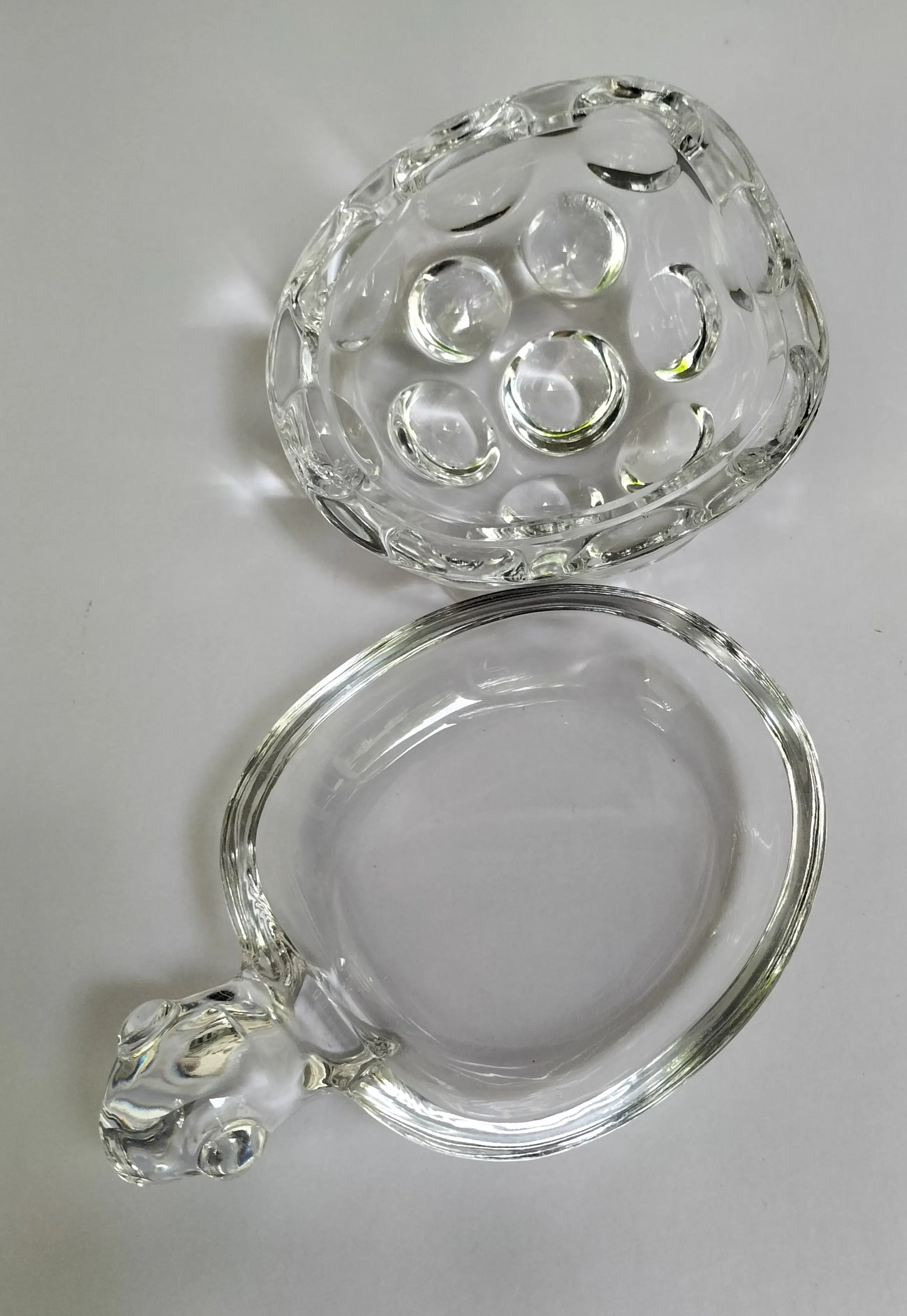 Fraaie en zeer decoratieve kristallen bonbonnière/snoepschaaltje met deksel in de vorm van een schildpad met mooie halve glazen bollen op het zgn. schild. Geproduceerd tussen 1975 en 1999 in België. In zeer goede staat met helder glas, minimale gebruikssporen. Wel op de onderzijde van het deksel een bijna niet zichtbaar chipje (zie laatste foto). De randen bij beide oogjes voelen wat scherp aan, maar dat hoort kennelijk zo, zijn niet beschadigd. De onderzijde is voorzien van het geëtste merk Val St. Lambert. De kleur die u ziet op de foto's komt van de reflectie van de omgeving: het glas is kleurloos/transparant. Een leuk object, dat met zorg verpakt en verzonden zal worden.