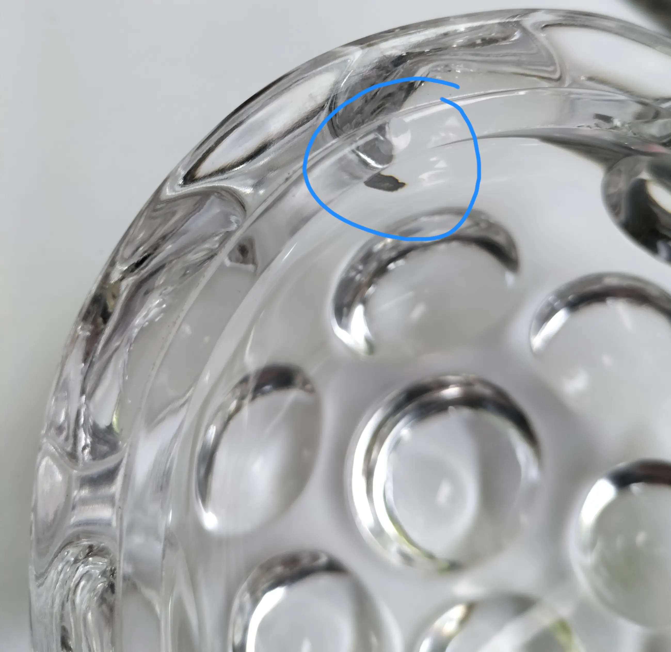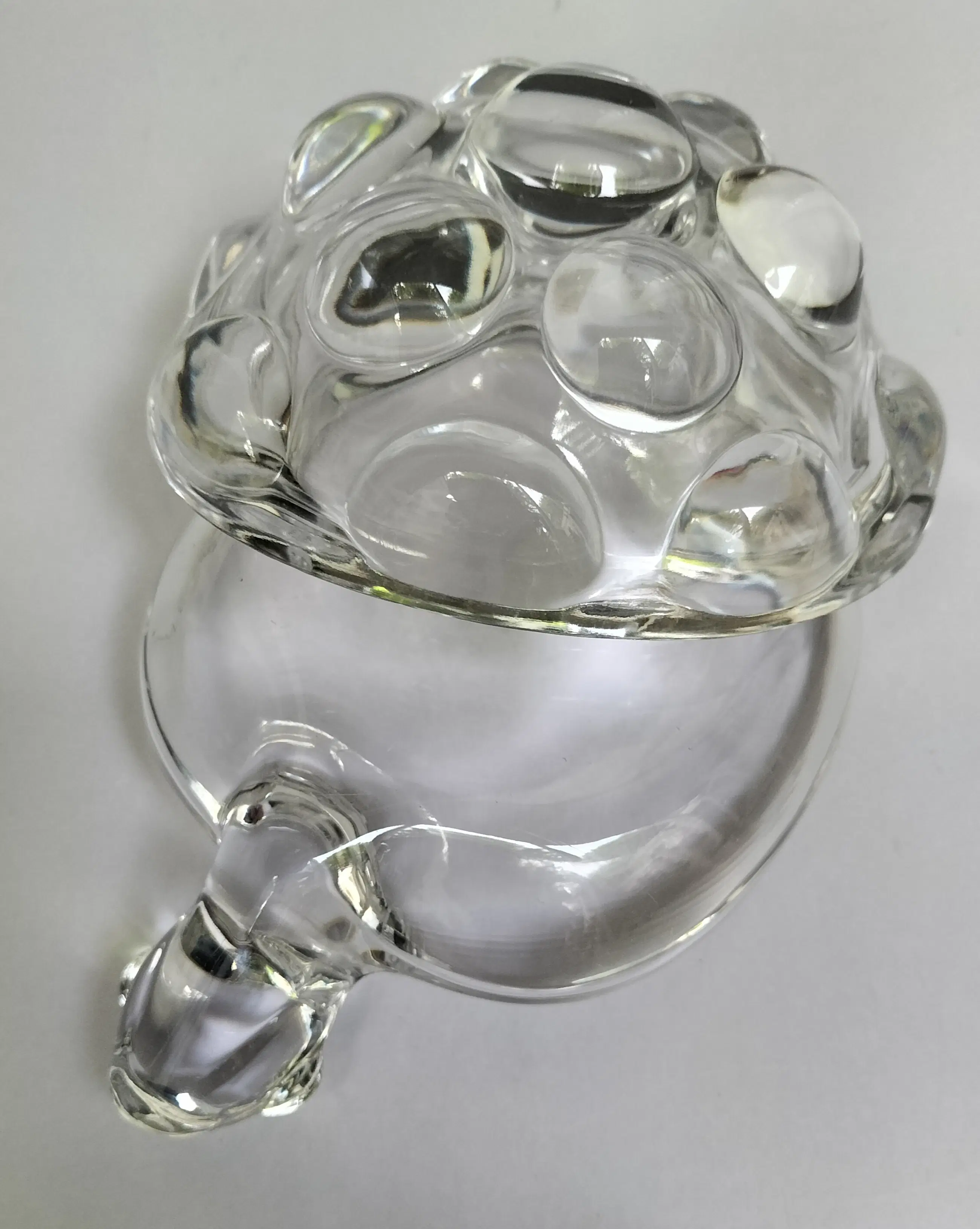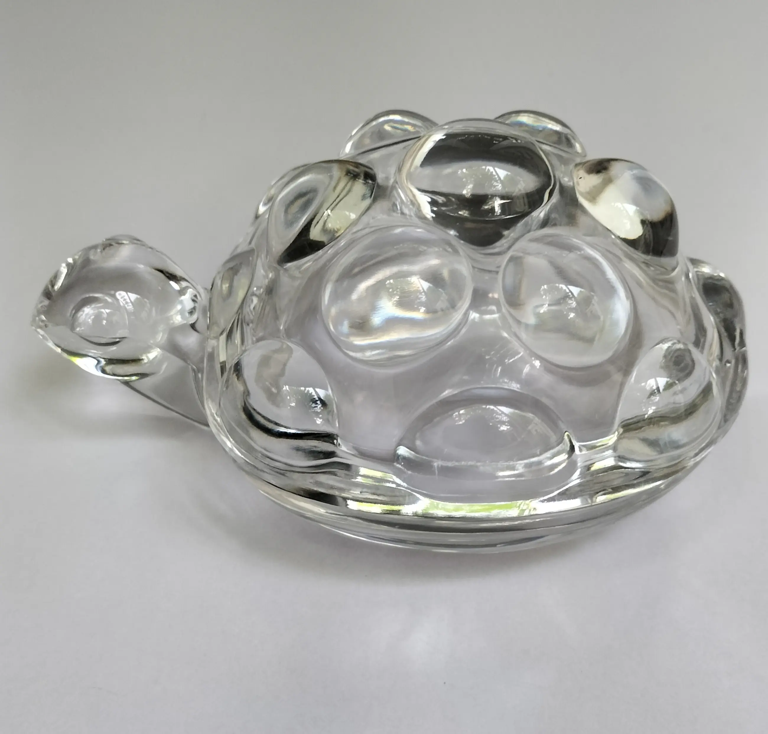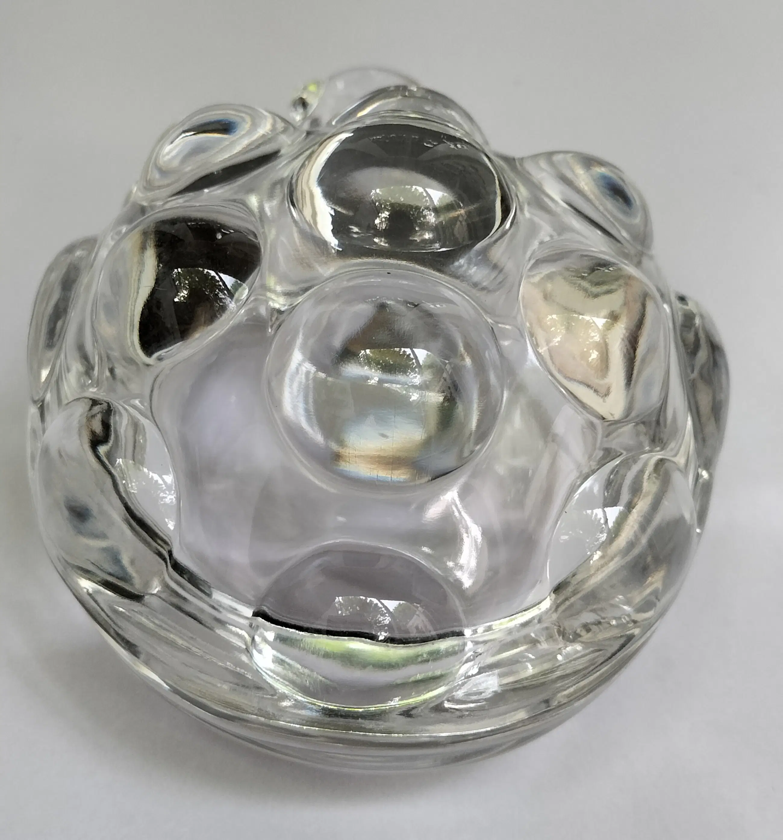 Fraaie en zeer decoratieve kristallen bonbonnière/snoepschaaltje met deksel in de vorm van een schildpad met mooie halve glazen bollen op het zgn. schild. Geproduceerd tussen 1975 en 1999 in België. In zeer goede staat met helder glas, minimale gebruikssporen. Wel op de onderzijde van het deksel een bijna niet zichtbaar chipje (zie laatste foto). De randen bij beide oogjes voelen wat scherp aan, maar dat hoort kennelijk zo, zijn niet beschadigd. De onderzijde is voorzien van het geëtste merk Val St. Lambert. De kleur die u ziet op de foto's komt van de reflectie van de omgeving: het glas is kleurloos/transparant. Een leuk object, dat met zorg verpakt en verzonden zal worden.