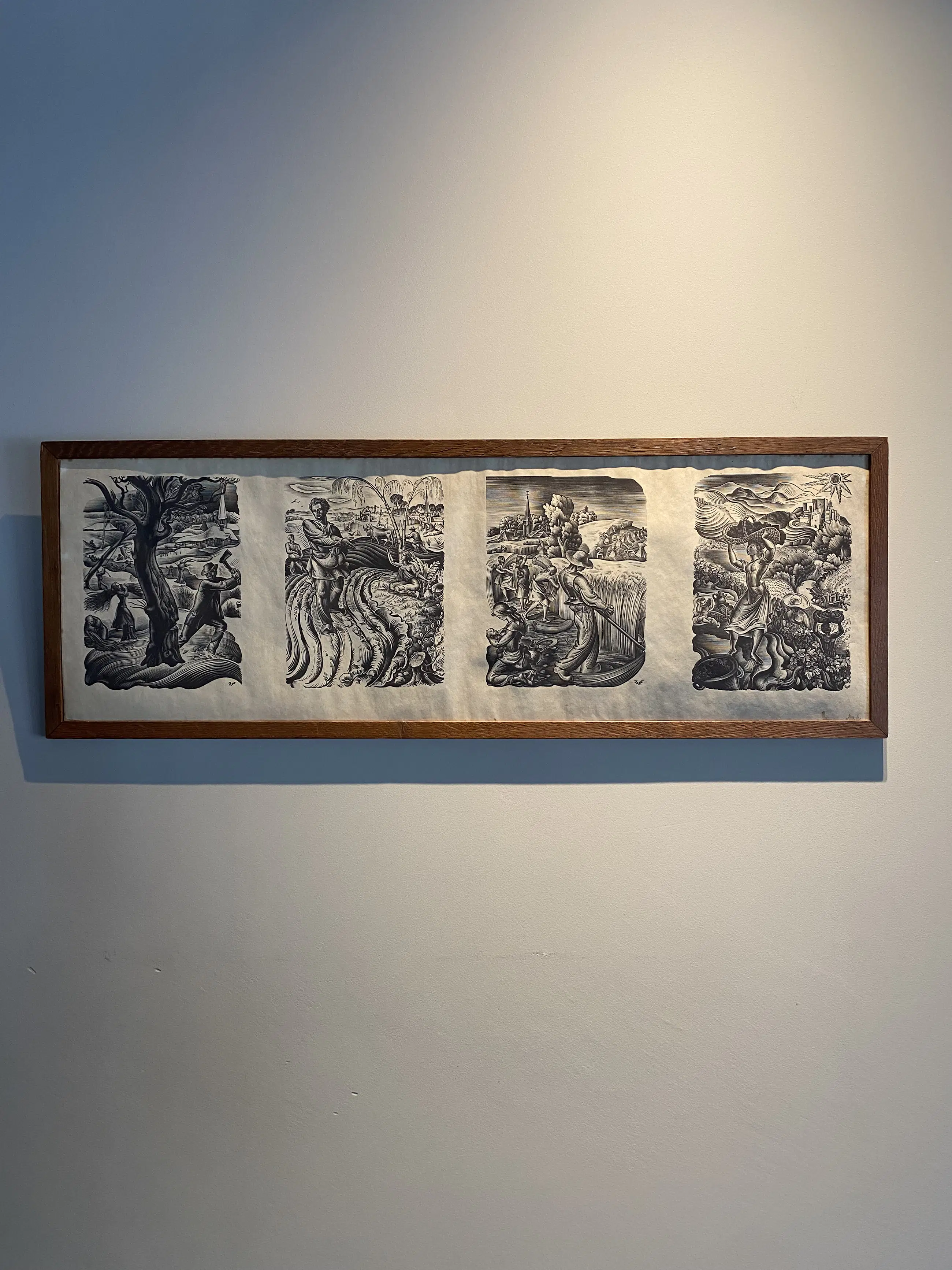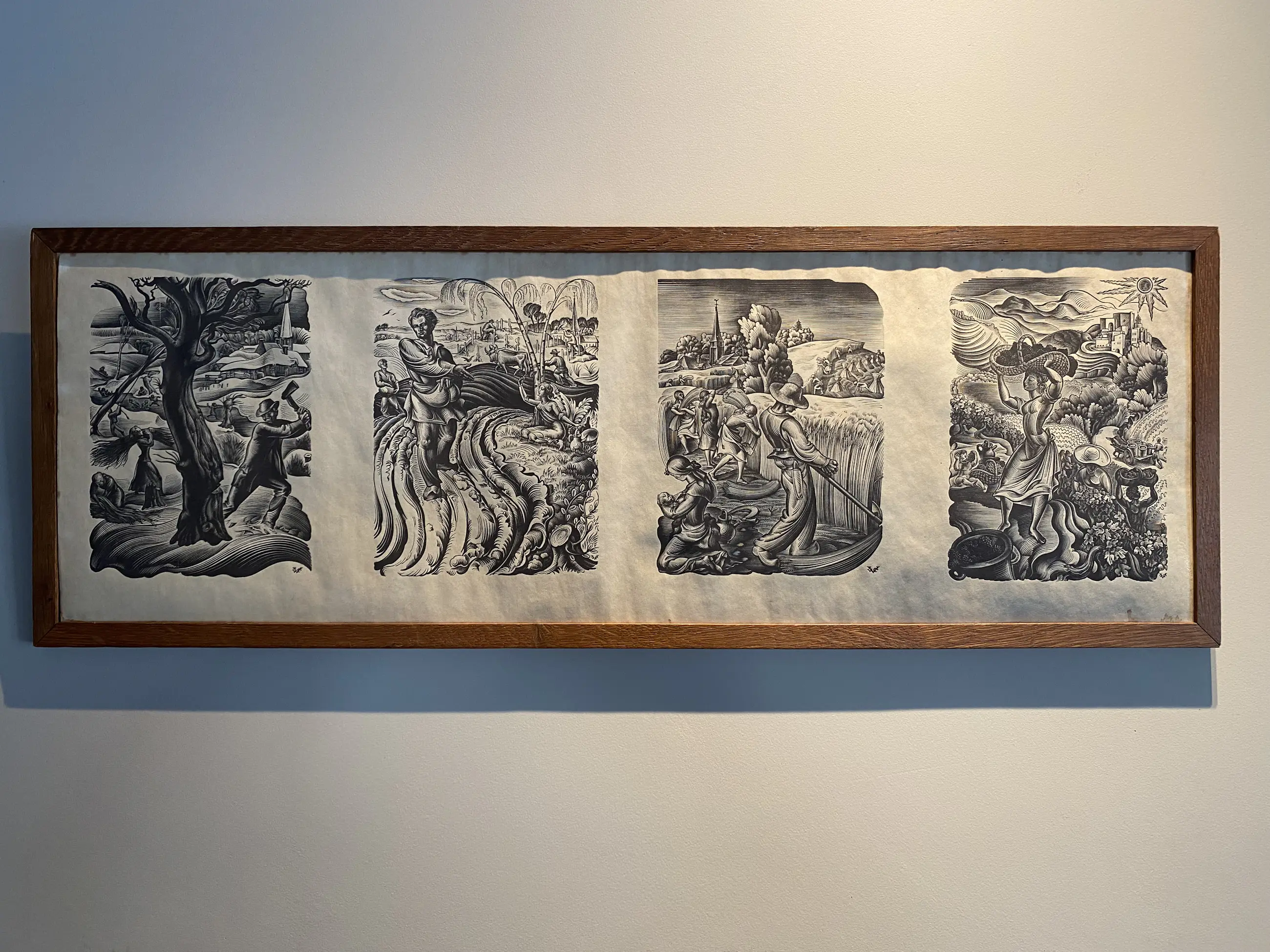 Een reeks van vier houtsneden waarin de seizoenen centraal staan, vermoedelijk bedoeld als een verbeelding van het agrarisch leven door het jaar heen. Elk paneel laat een scène zien die past bij een specifiek seizoen, met herkenbare werkzaamheden en elementen uit het landschap.