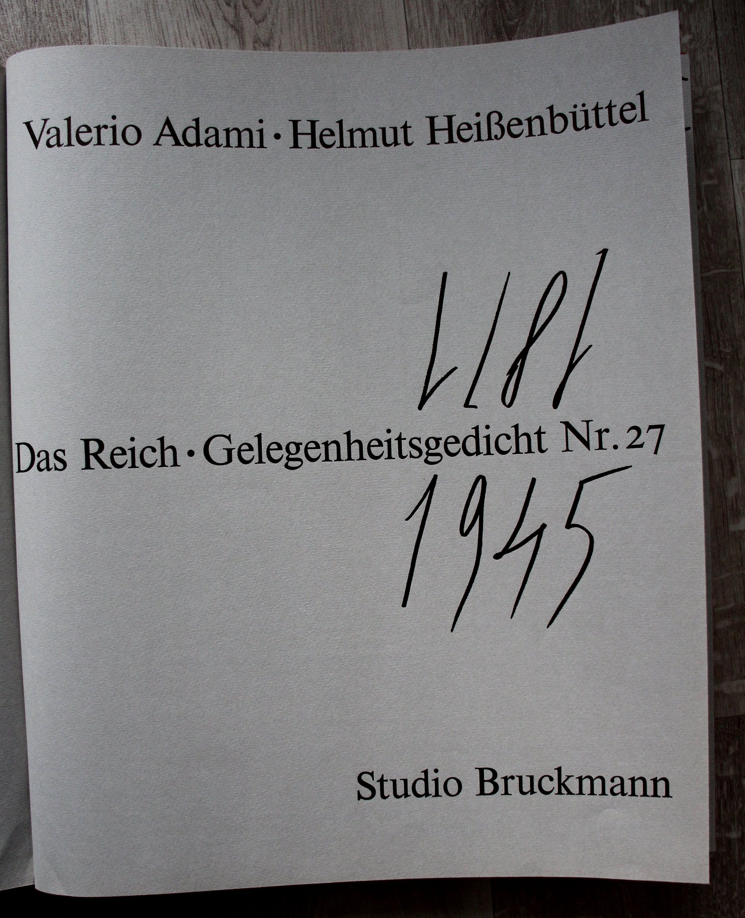 Boek met 10 gesigneerde zeefdrukken van Valerio Adami. Titel: Das Reich. Nummer: 19/20. Jaar: 1974. Uitgegeven door Maeght. Afmetingen boek: H51 x b43cm. Het boek is ook met potlood gesigneerd door de auteur. (Heissenbuttel). Alle werken zijn rechtsonder gesigneerd door de kunstenaar. De authenticiteit van het aangeboden werk wordt volledig gegarandeerd. Een certificaat van echtheid kan, op aanvraag, worden gemaild.