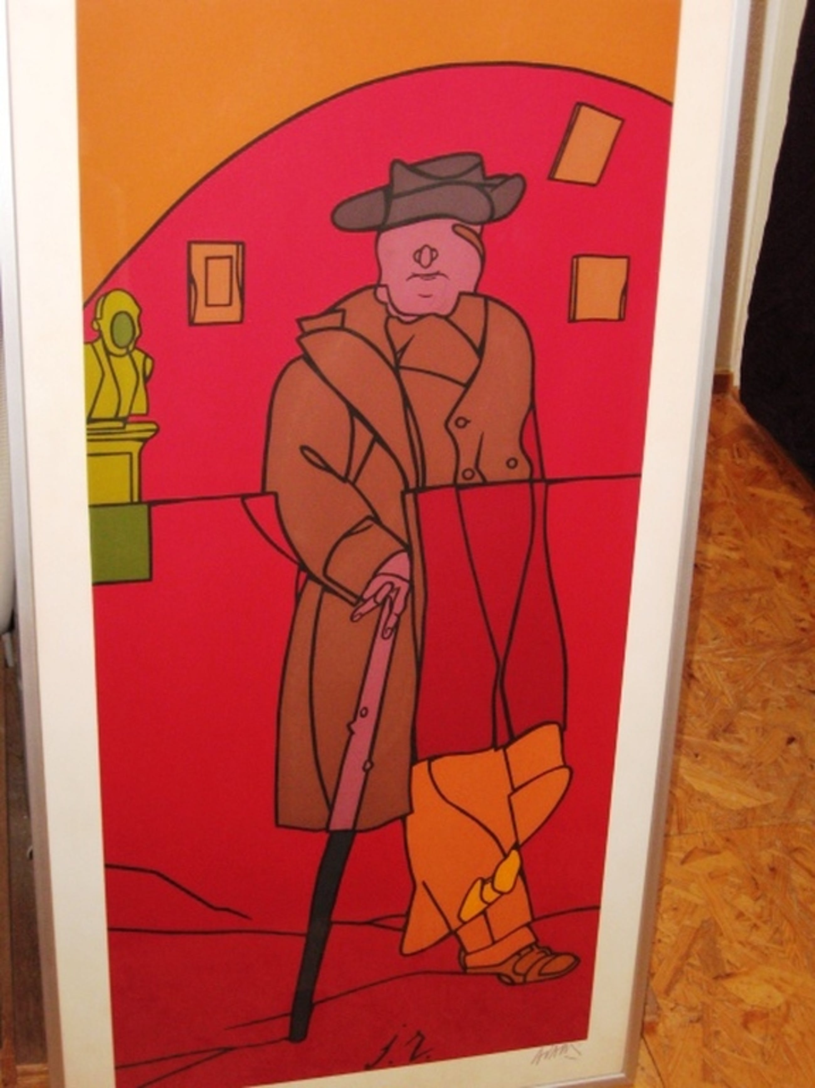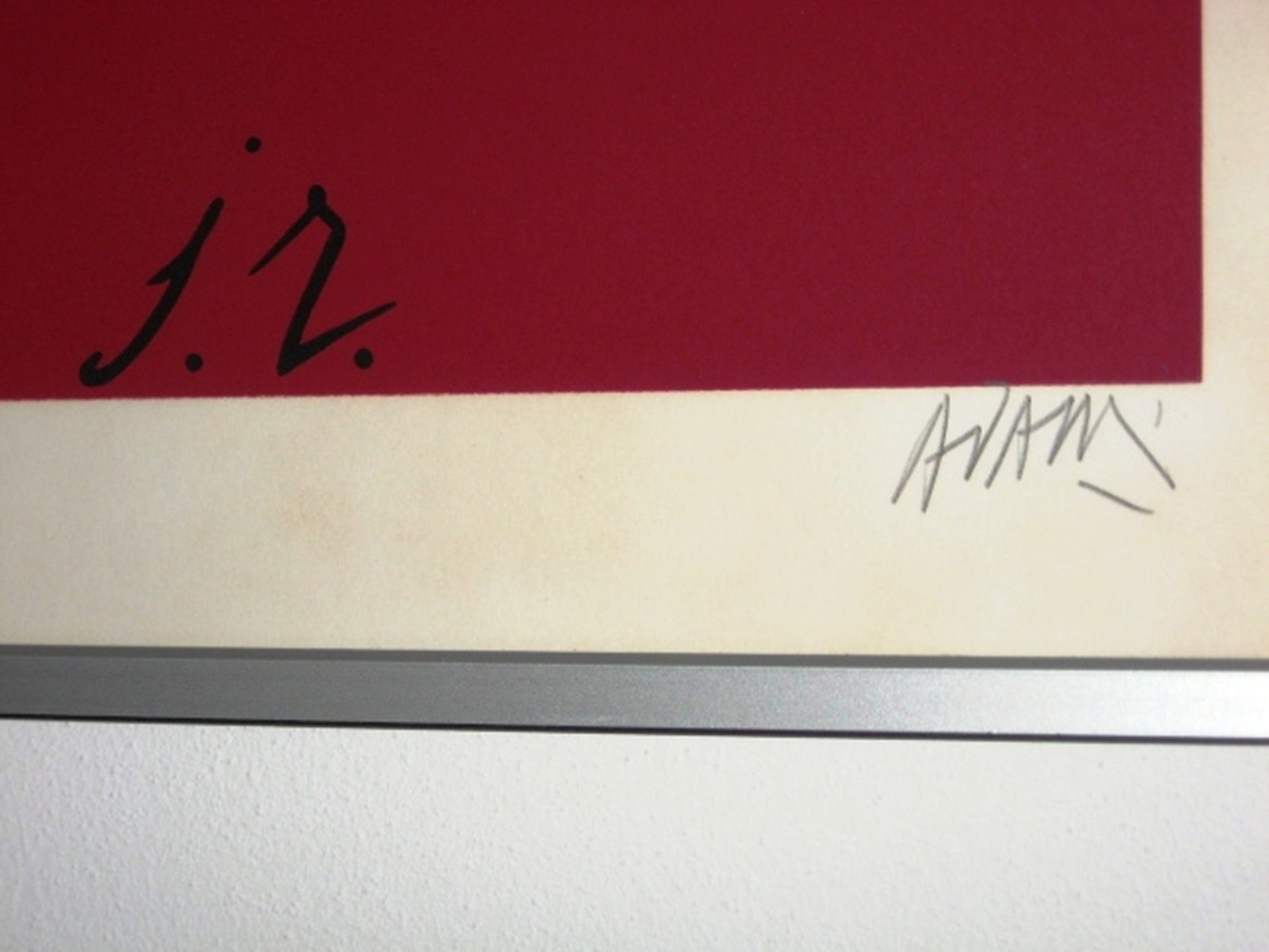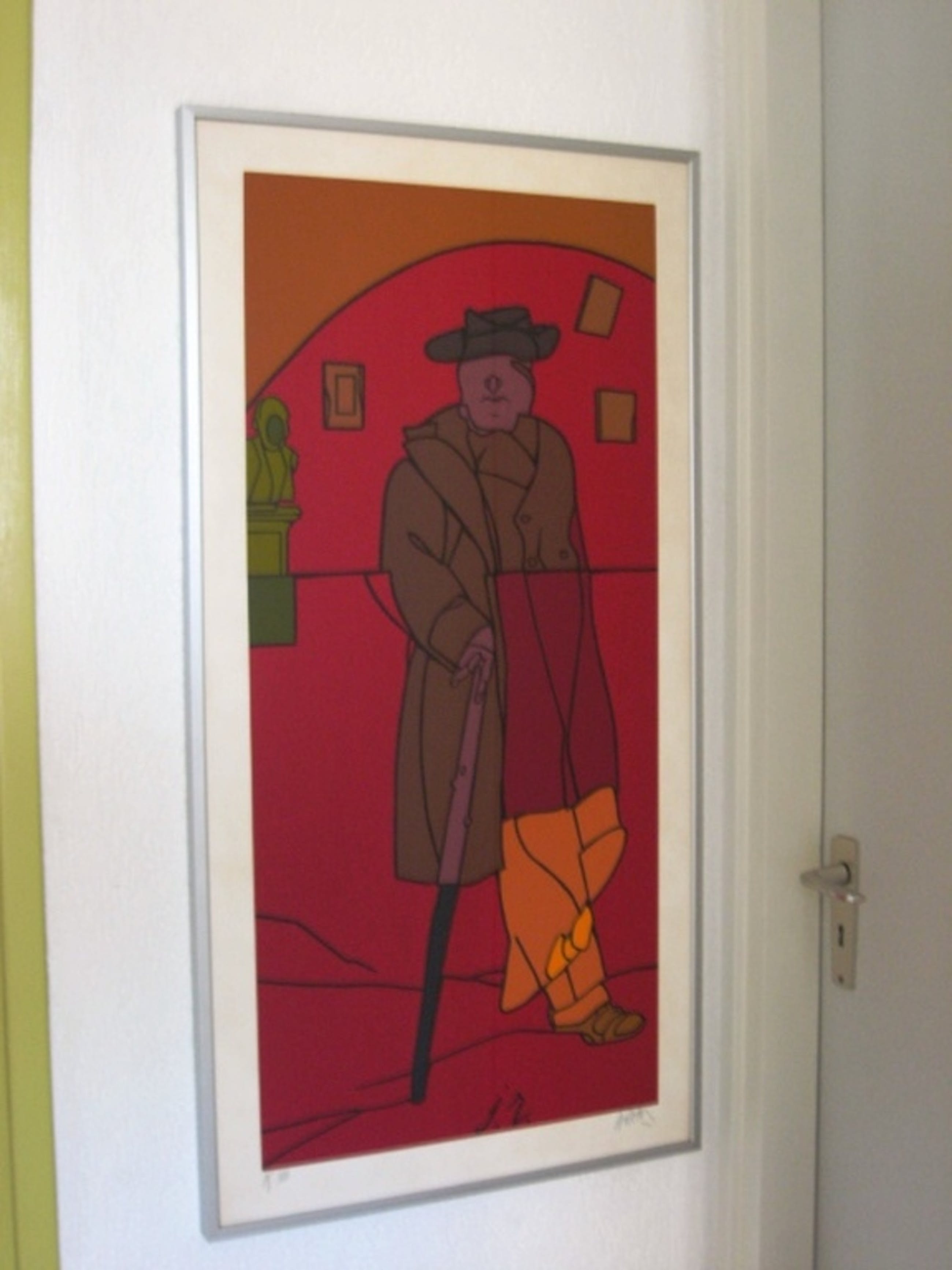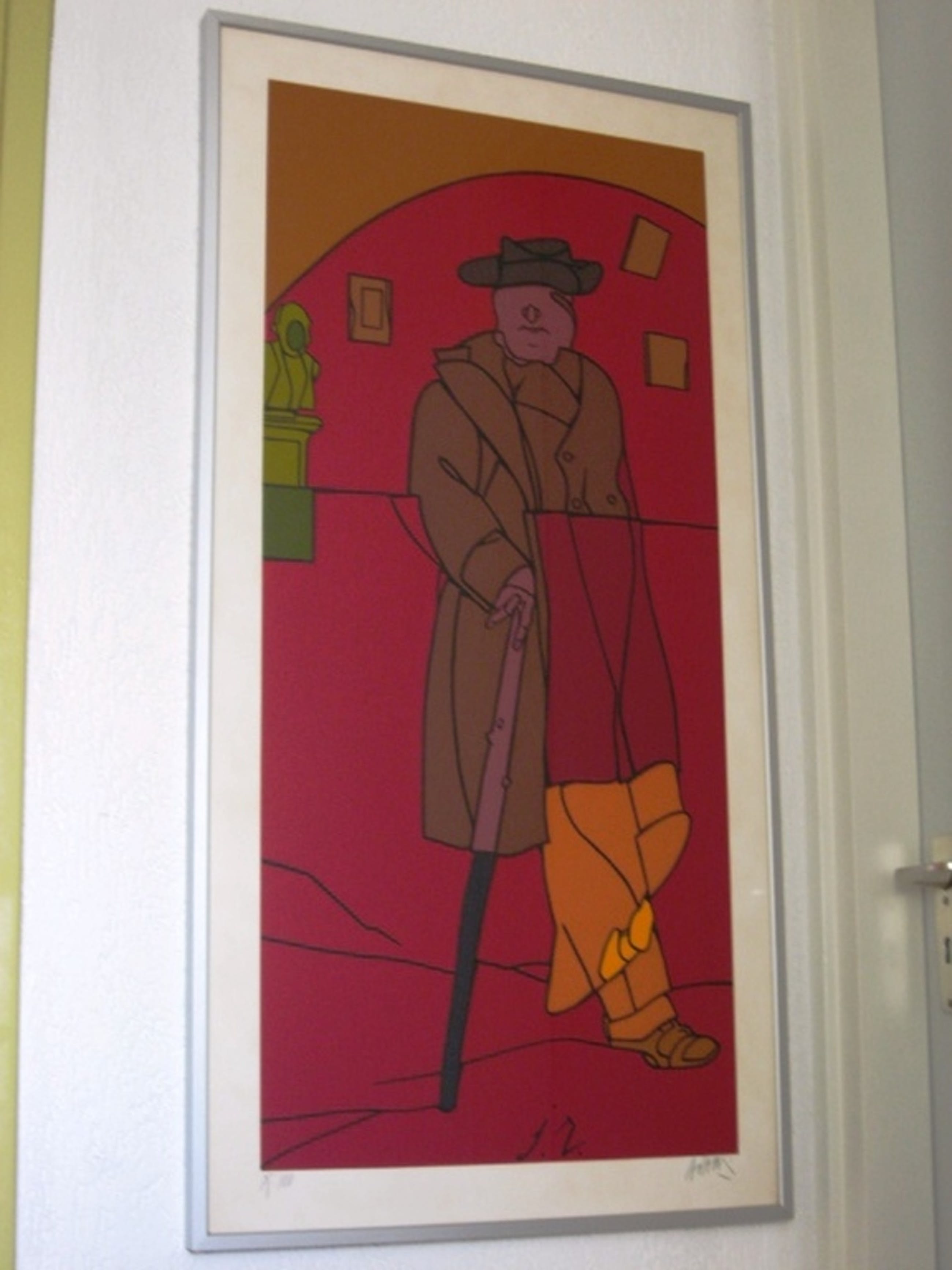 Grote zeefdruk ( JR 1979 ) van de internationaal bekende kunstenaar Valerio Adami. ( 1935 Bologna ) Ingelijst in kwalitatief zware aluminium lijst ( met extra rugsteun ). Afmeting totaal 100 x 52 cm. Oplagenummer 75 uit 100 stuks. Hand gesigneerd door de kunstenaar.Afkomstig uit de Peter Stuyvesant Grafiek collectie uit 1980. De Grafiek collectie maakte deel uit van de bekende moderne Peter Stuyvesant Collectie, die ontstond in de jaren 60. Grote moderne werken van internationaal bekende kunstenaars, hingen destijds in de kantoren en in de fabriek van Turmac Tobacco Company, respectievelijk in Amsterdam en Zevenaar. De grafiek collectie ontstond in 1980, toen aan 20 kunstenaars ( tien Nederlanders en tien buitenlanders ) opdracht werd gegeven een grafisch werk te maken. Valerio Adami was een van hen. De oplages waren gemaximaliseerd op 100 stuks per kunstenaar. Het werk is uitgevoerd op 320 grams Fabriano papier.