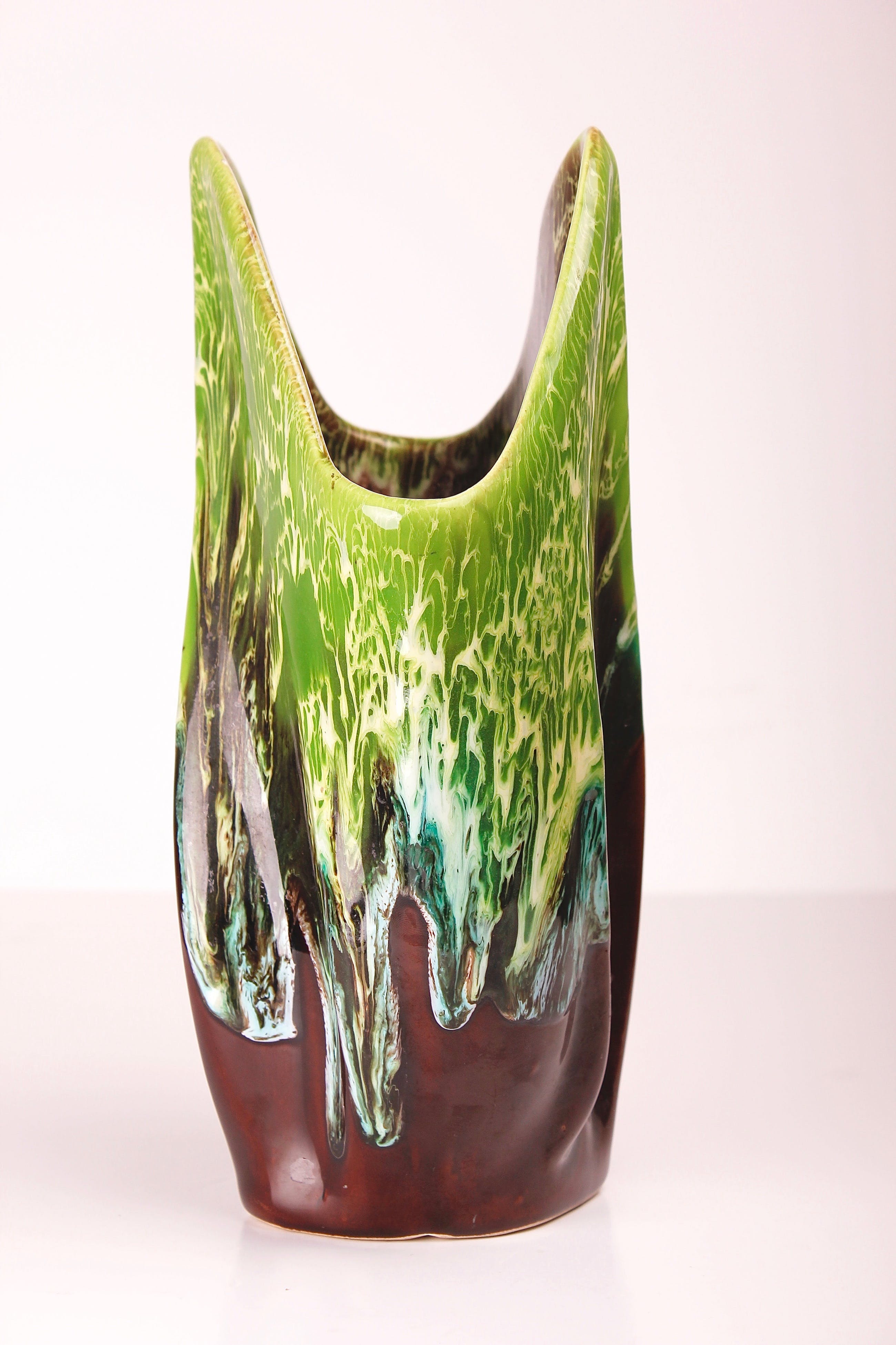 Sierlijke organische Vallauris vaas met groene en bruine accenten. Een van de mooiere groen decors die Vallauris in die tijd heeft gemaakt. Interessante is dat de vallauris signatuur is ingekrast met sierlijke letters. Dat zou er op kunnen wijzen dat het hier gaat om een unieker stuk. We verzenden internationaal met een extra veilige Track & trace code.