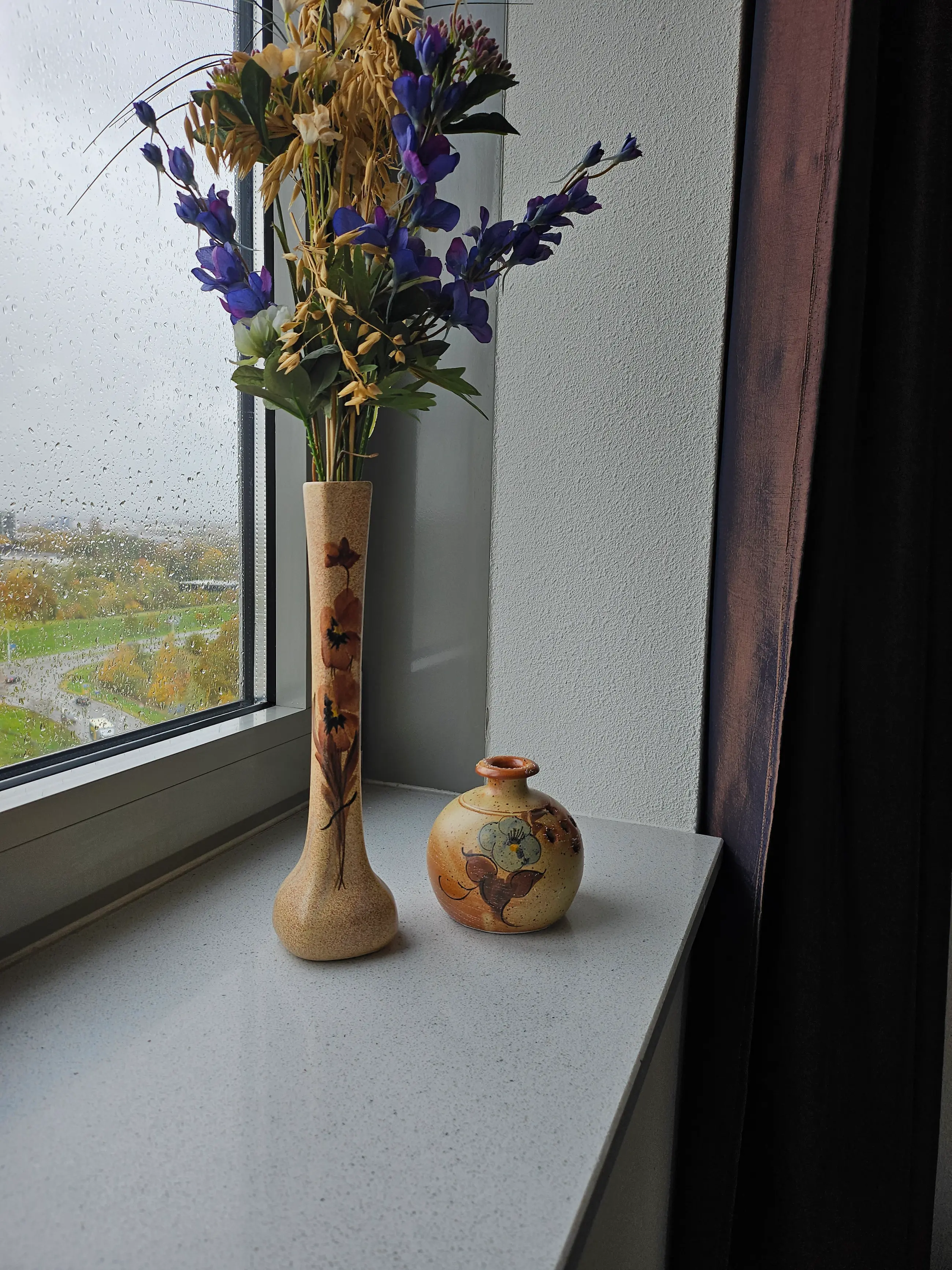 Sierstukken/woonaccessoires uit Vallauris Frankrijk, bestaande uit een hoog vaasje, laag vaasje en fruitschaal. Keramiek