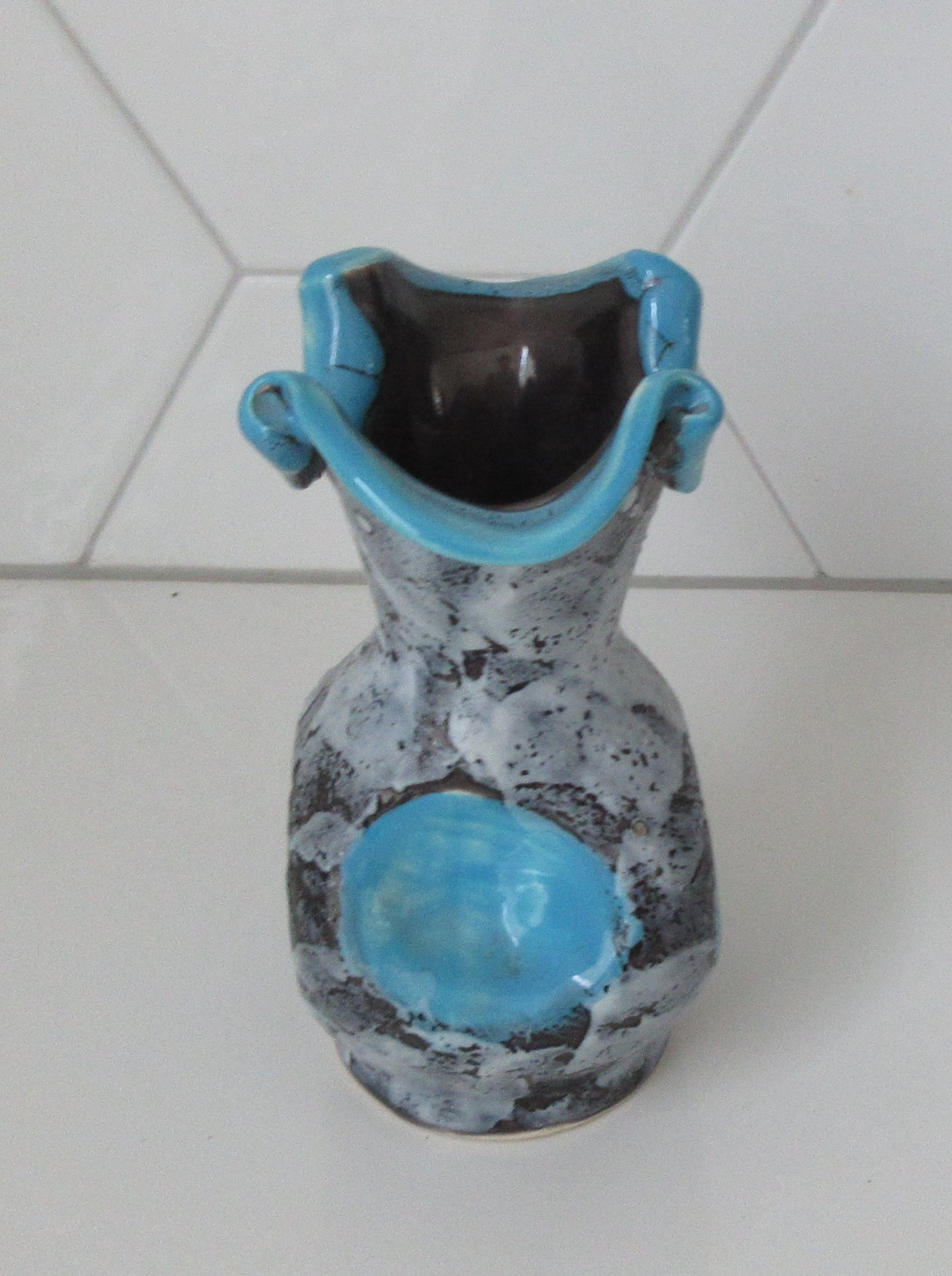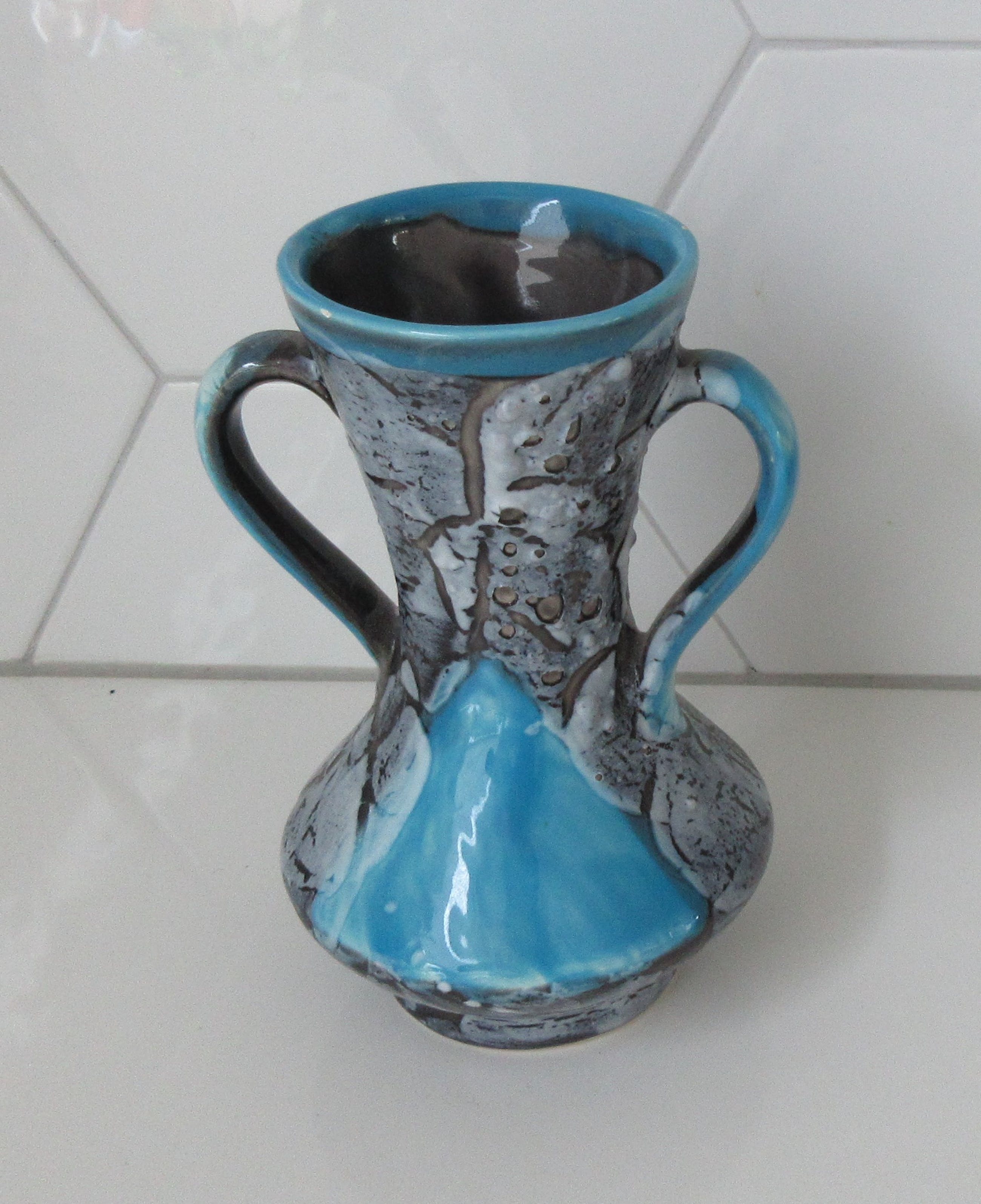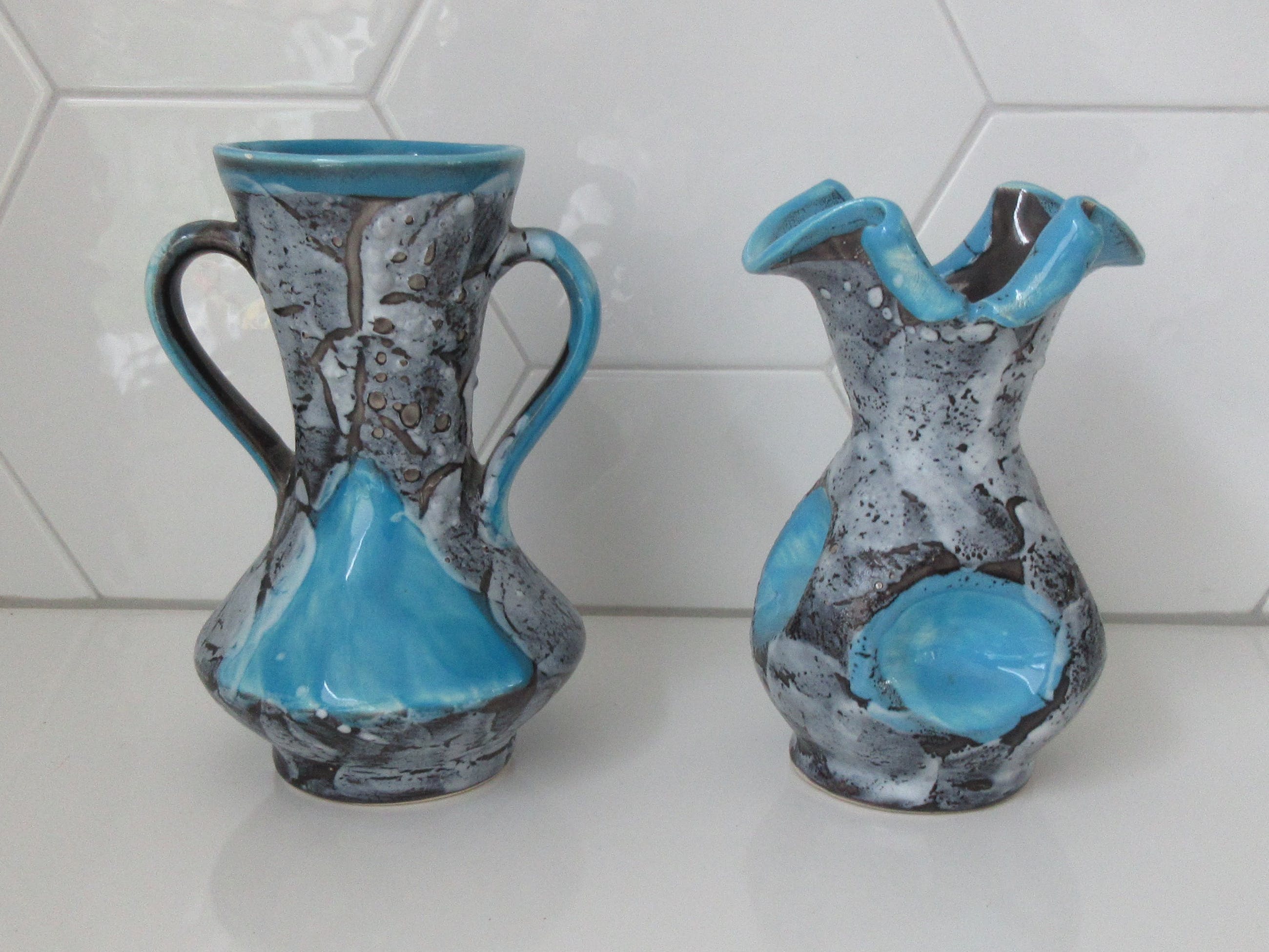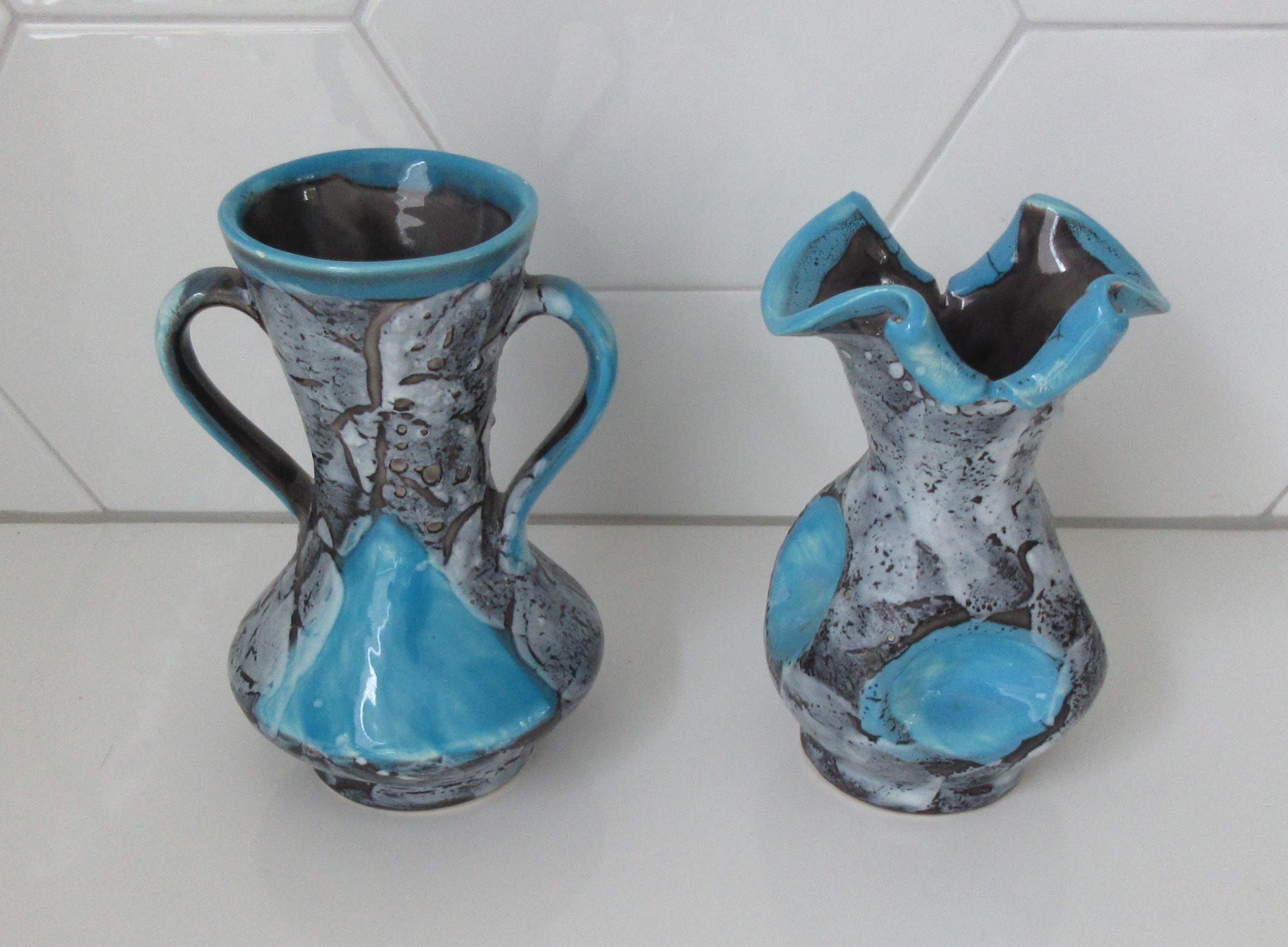 Twee Vallauris Sixties lichtblauwe Fatlava vaasjes. Een amfoor vaasje en een vierkant ingedeukt vaasje. Beide voorzien van ingedrukt blindmerk.