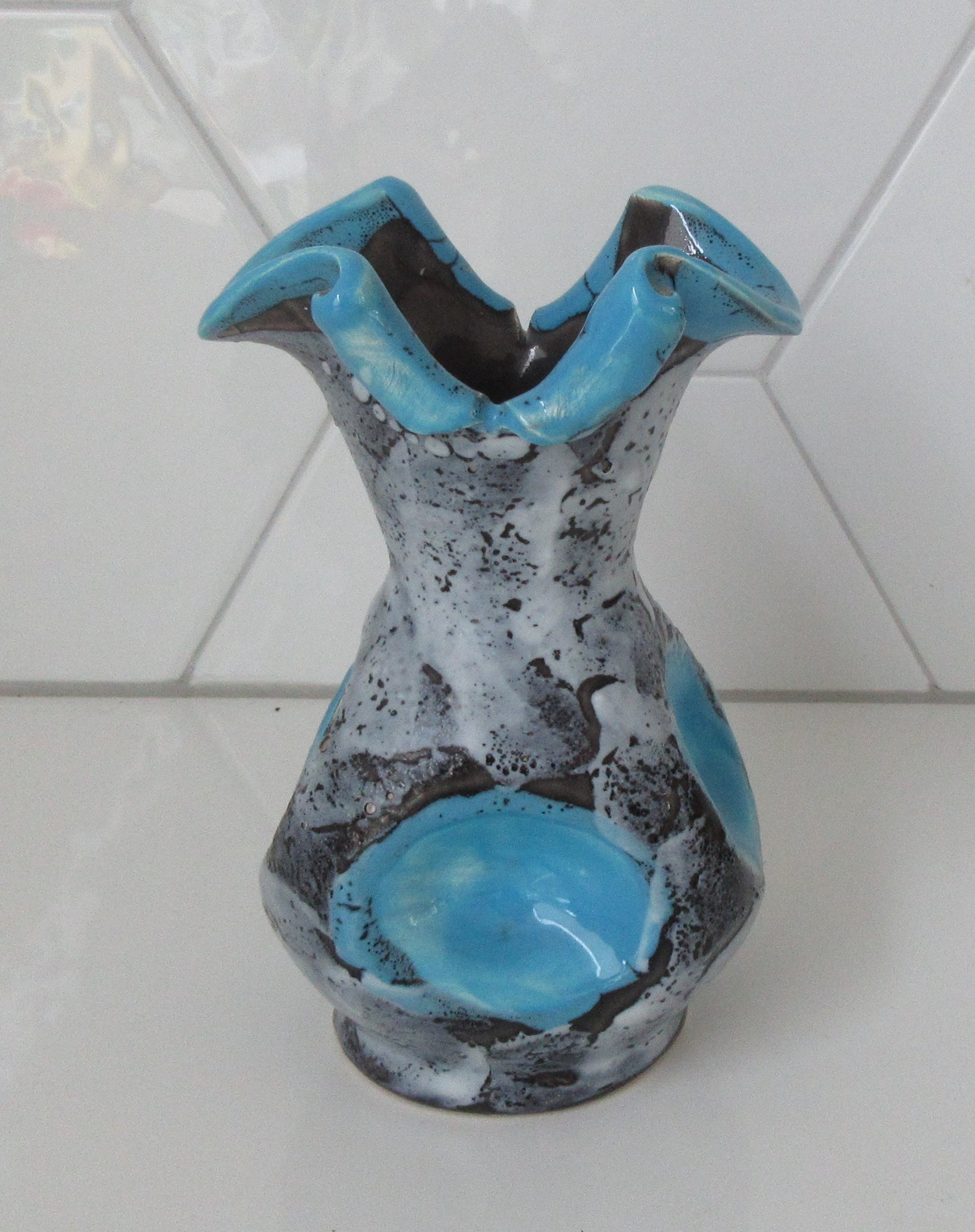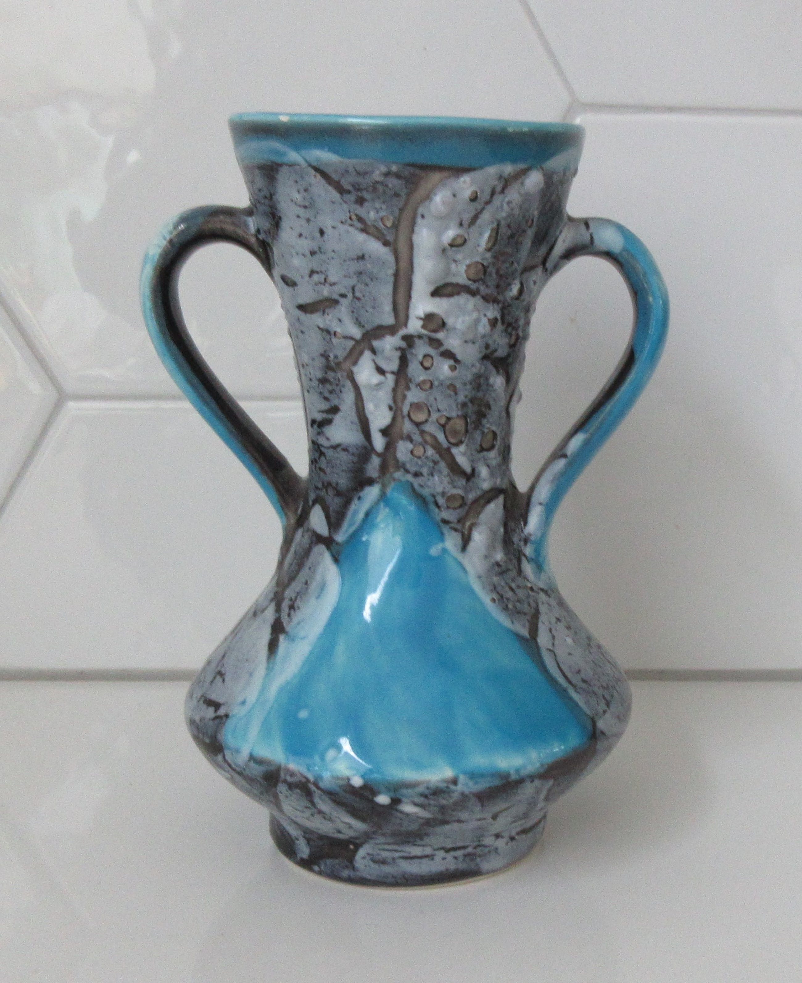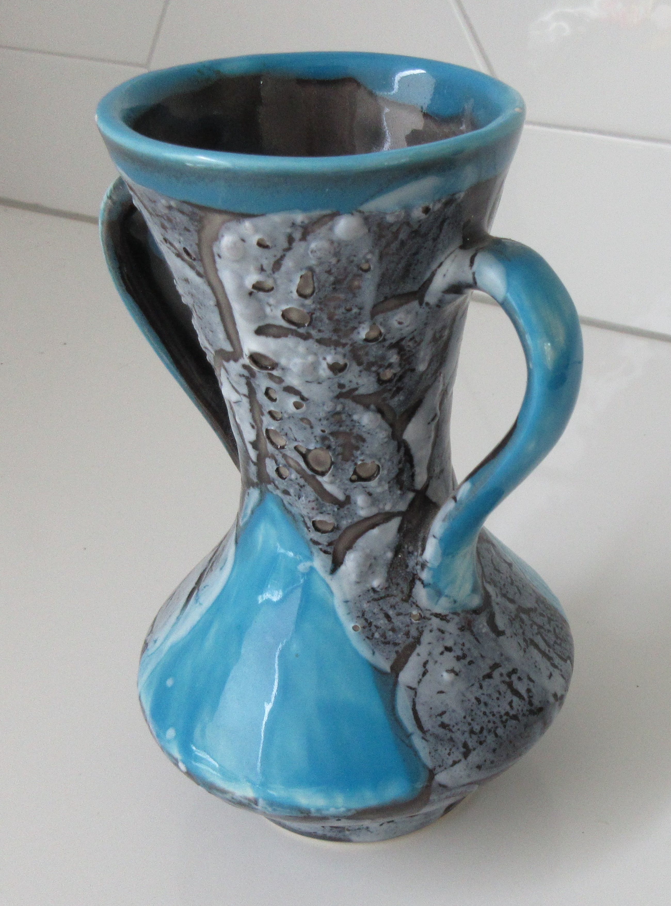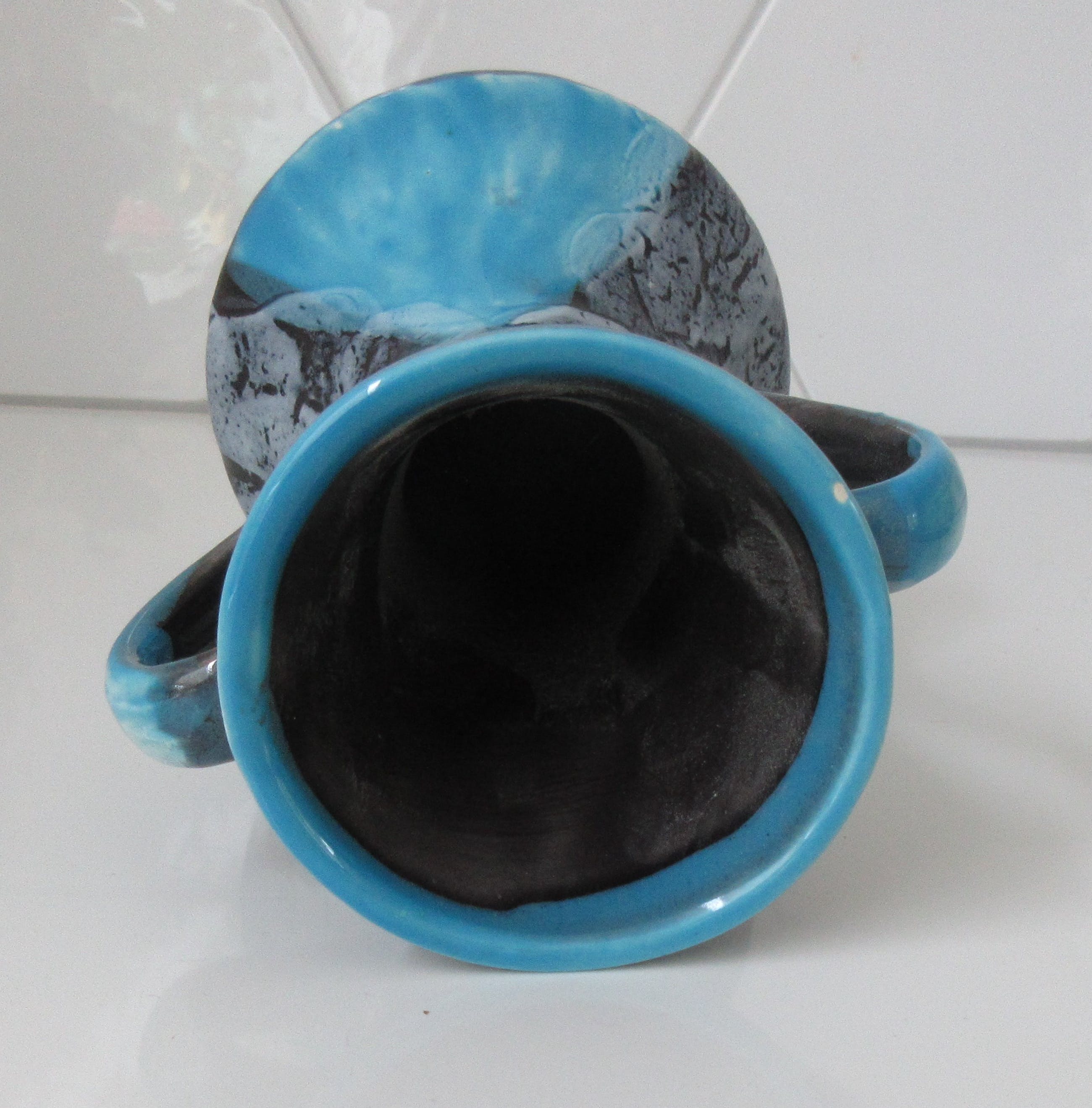 Twee Vallauris Sixties lichtblauwe Fatlava vaasjes. Een amfoor vaasje en een vierkant ingedeukt vaasje. Beide voorzien van ingedrukt blindmerk.