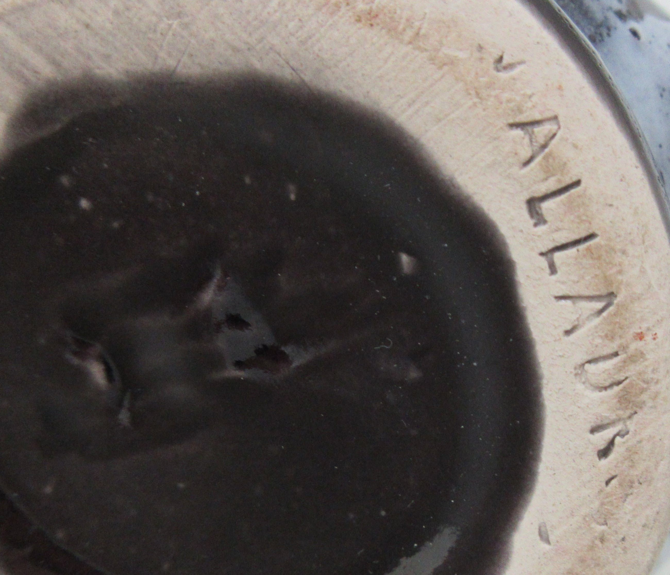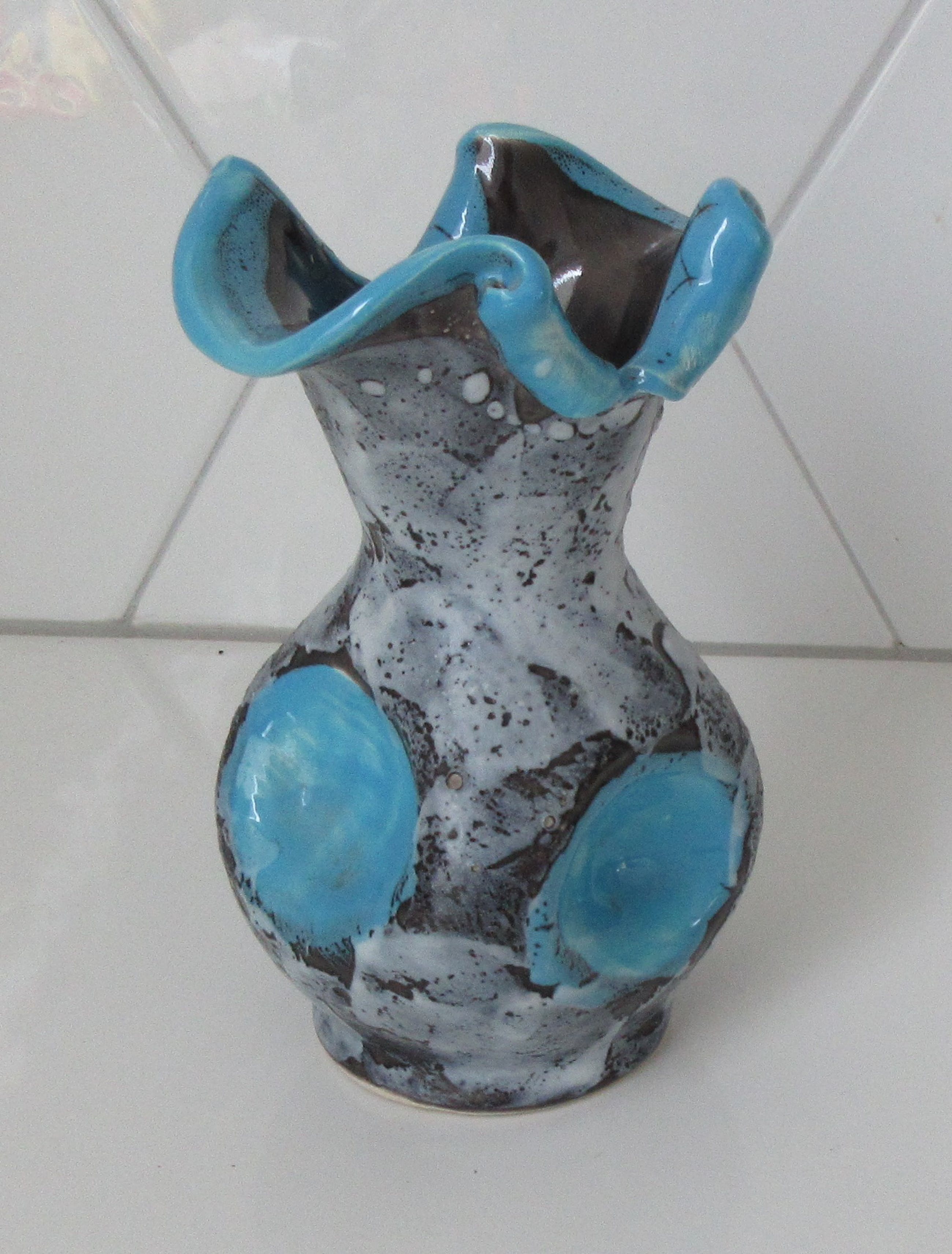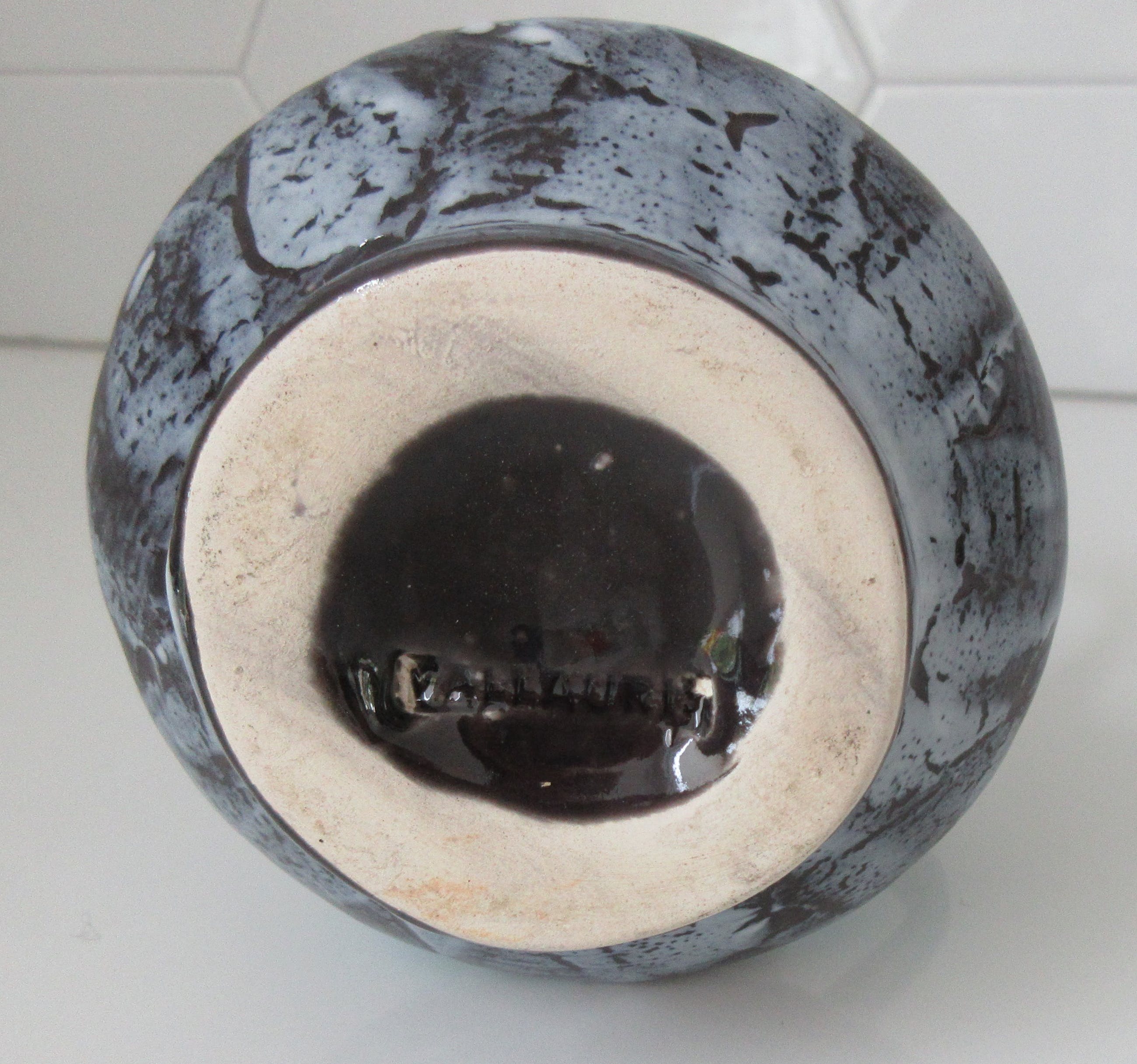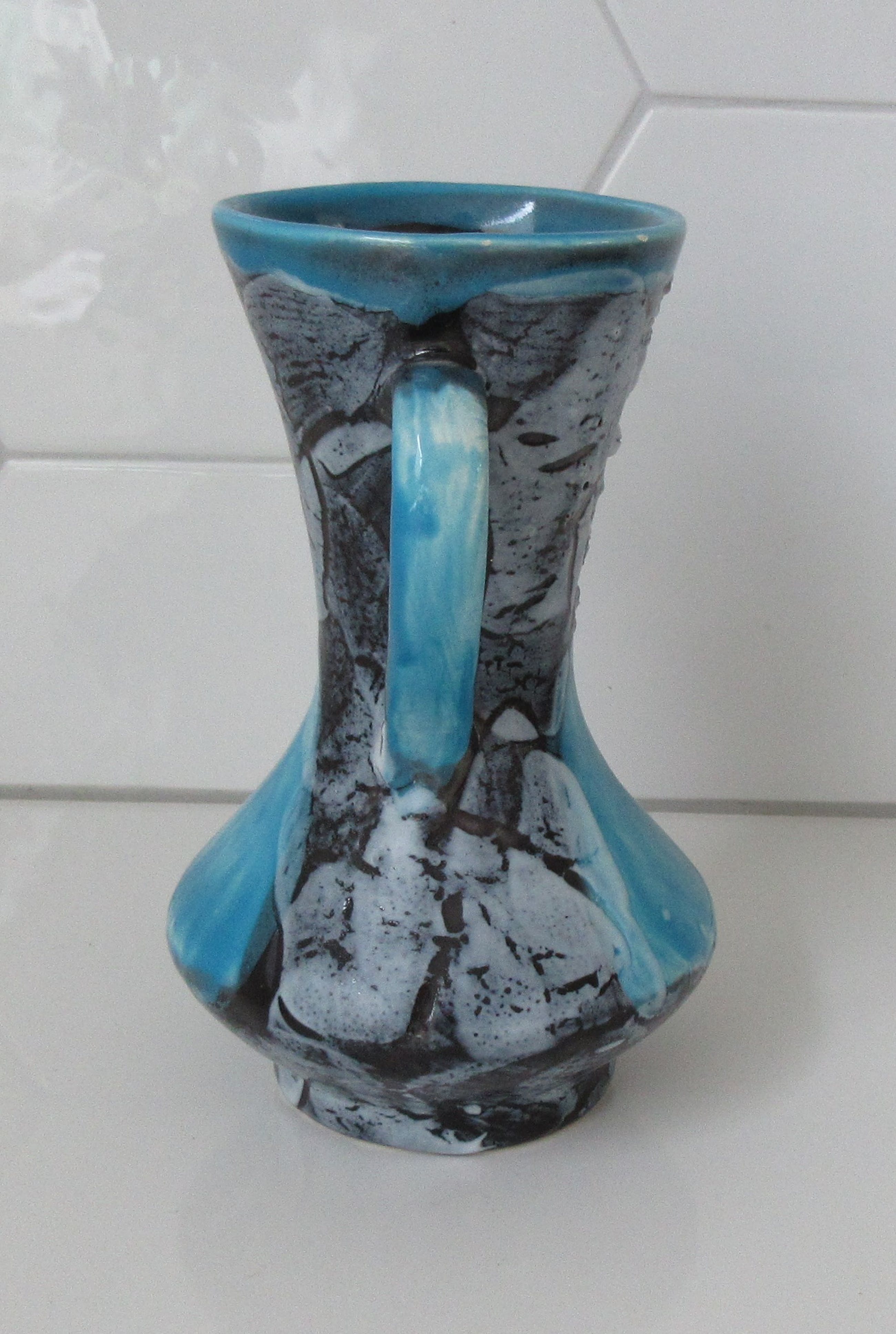 Twee Vallauris Sixties lichtblauwe Fatlava vaasjes. Een amfoor vaasje en een vierkant ingedeukt vaasje. Beide voorzien van ingedrukt blindmerk.
