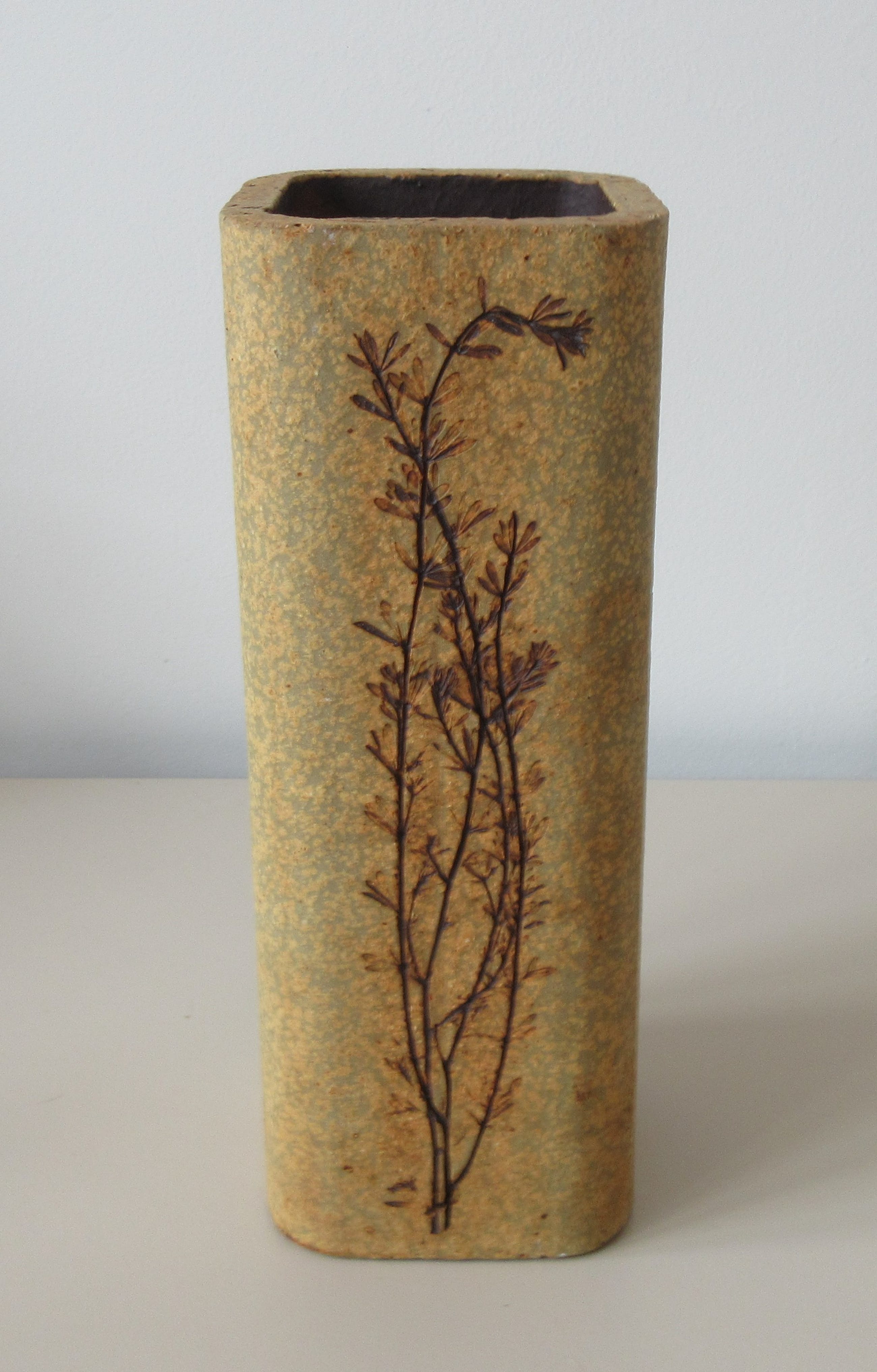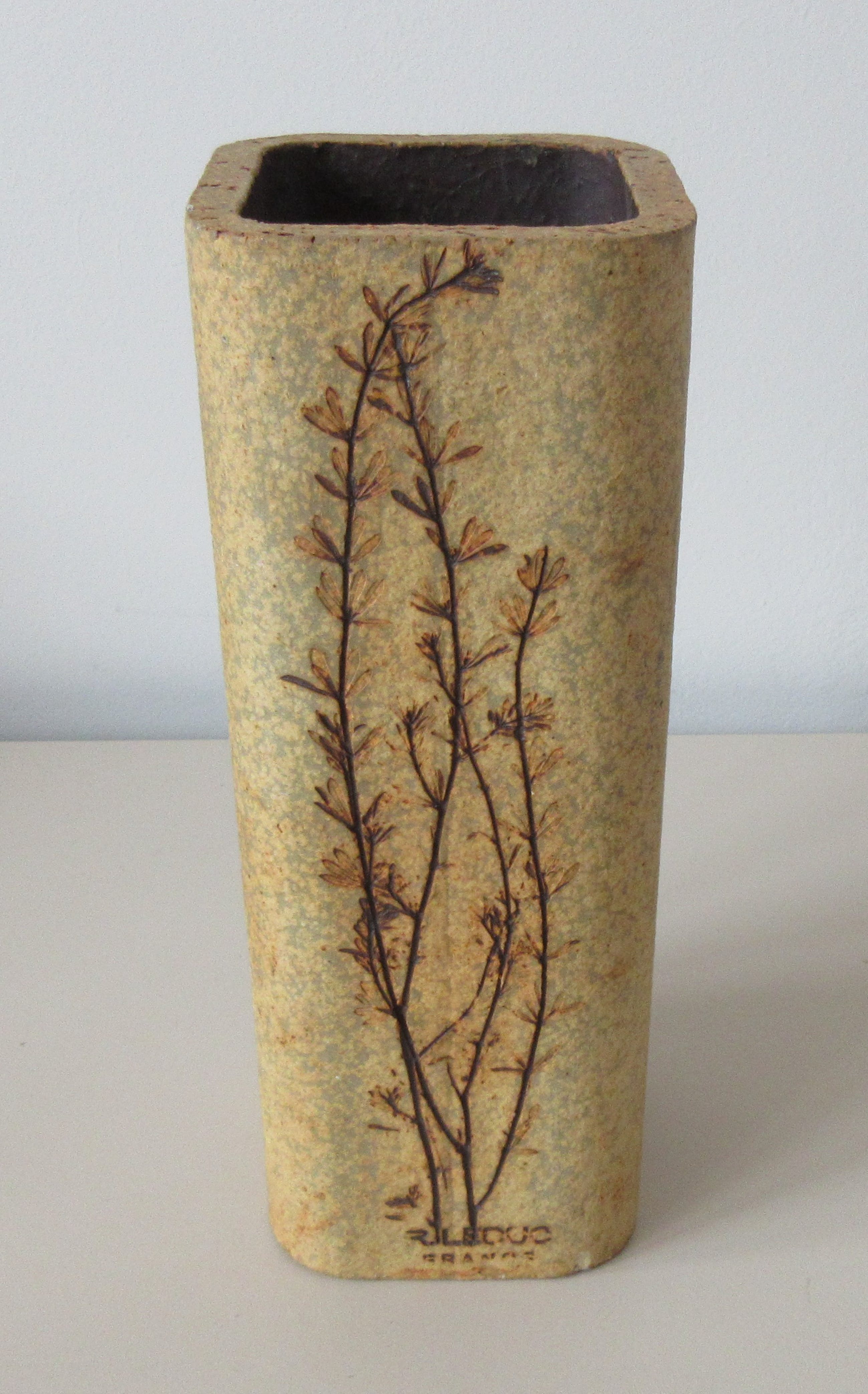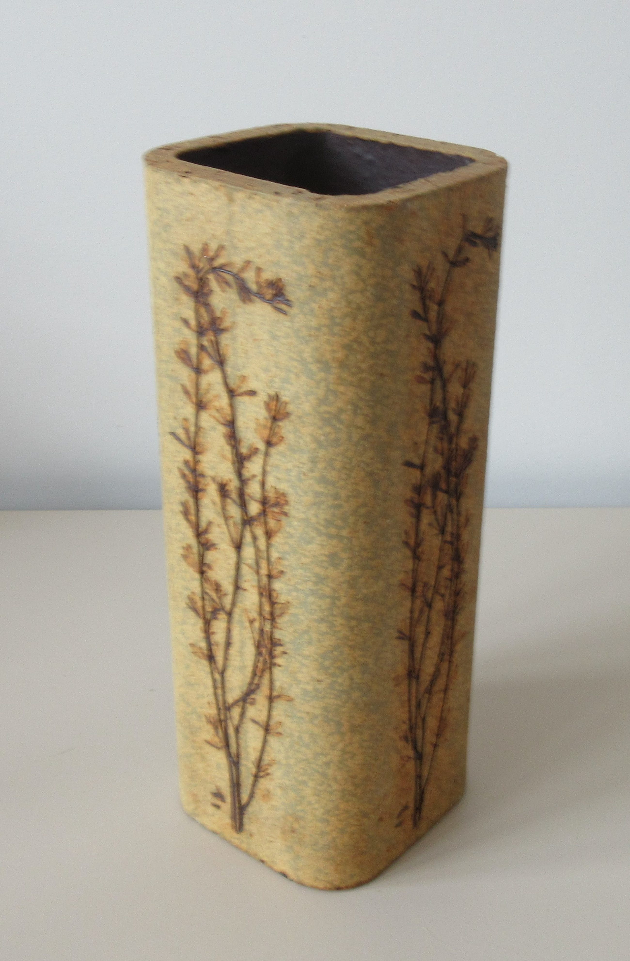 Vierkante gres aardewerken Herbier vaas - Raymonde Leduc. Handgemaakt in eigen atelier in Vallauris Zuid-Frankrijk.