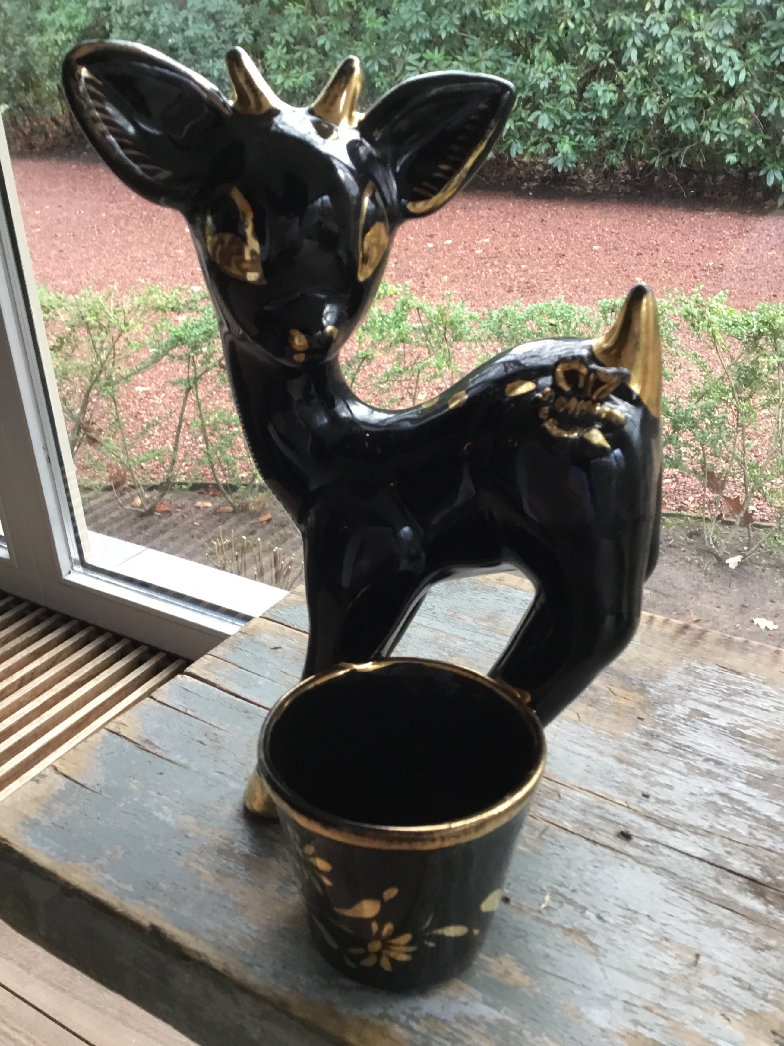 Origineel Bambi beeldje met cachepot in zwart. Kan eventueel ook als kandelaar gebruikt worden. Deze zwarte uitvoering is zeldzaam (meestal wit).