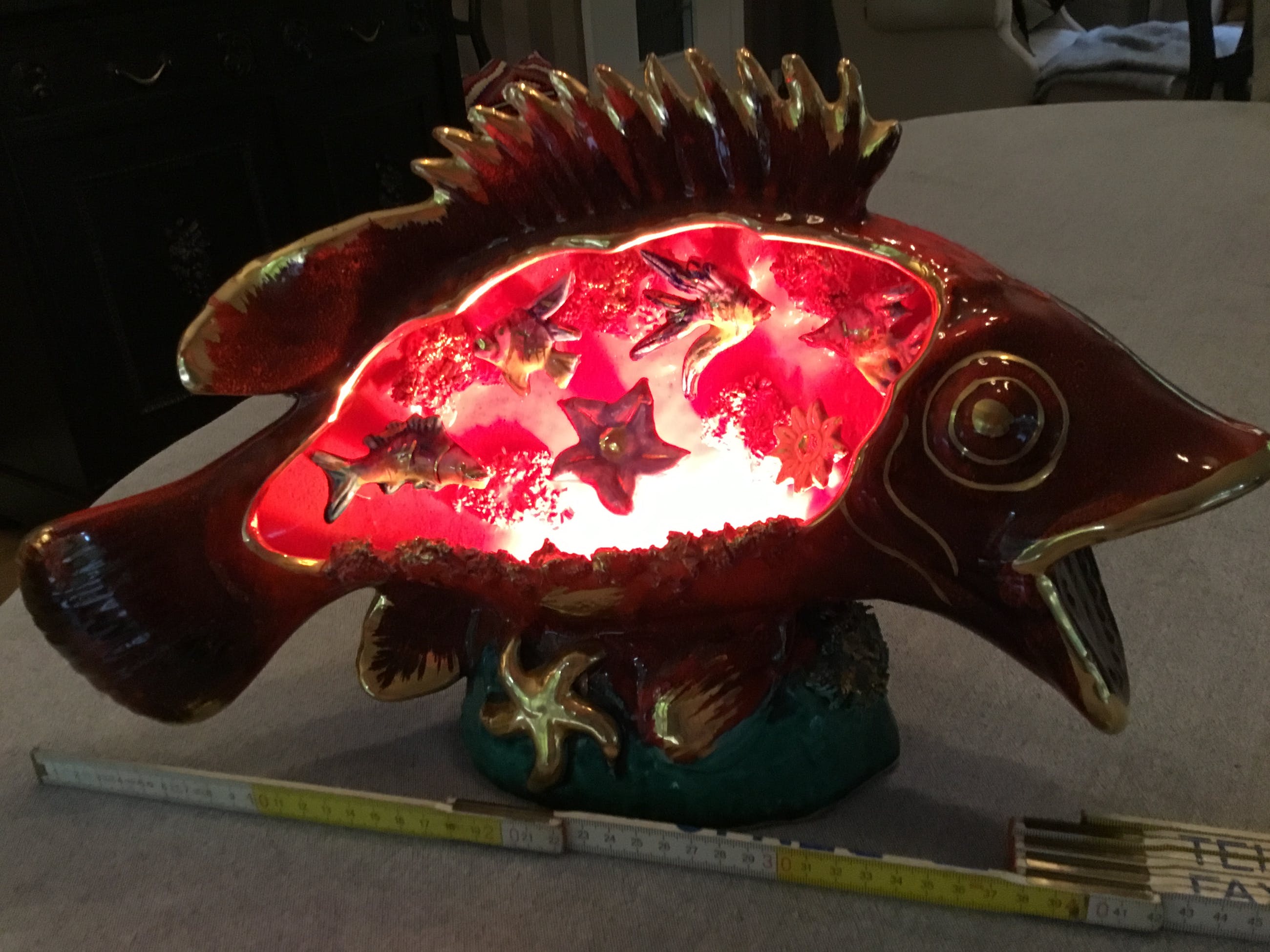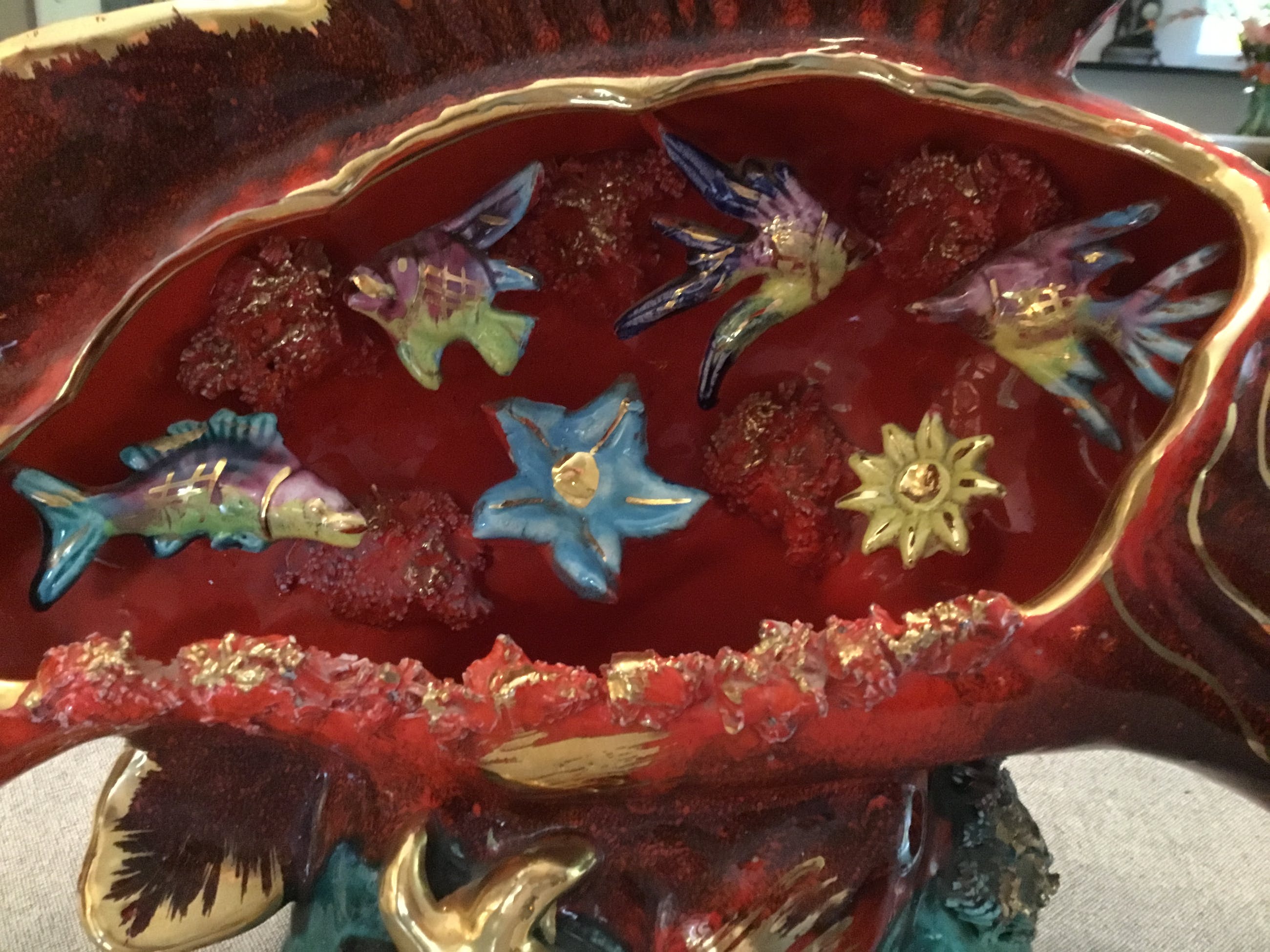 Schitterende Vallauris tafellamp “VIS”. Rood keramieken lamp met vissen, schelp- en schaaldieren. Uniek stuk, zeer gedetailleerd en prachtig afgewerkt in het Mediterrane Vallauris. Schubben, rugvin en tanden zijn verfijnd uitgevoerd. Voor de echte liefhebber een ware “must”. Eyecather in optima forma!