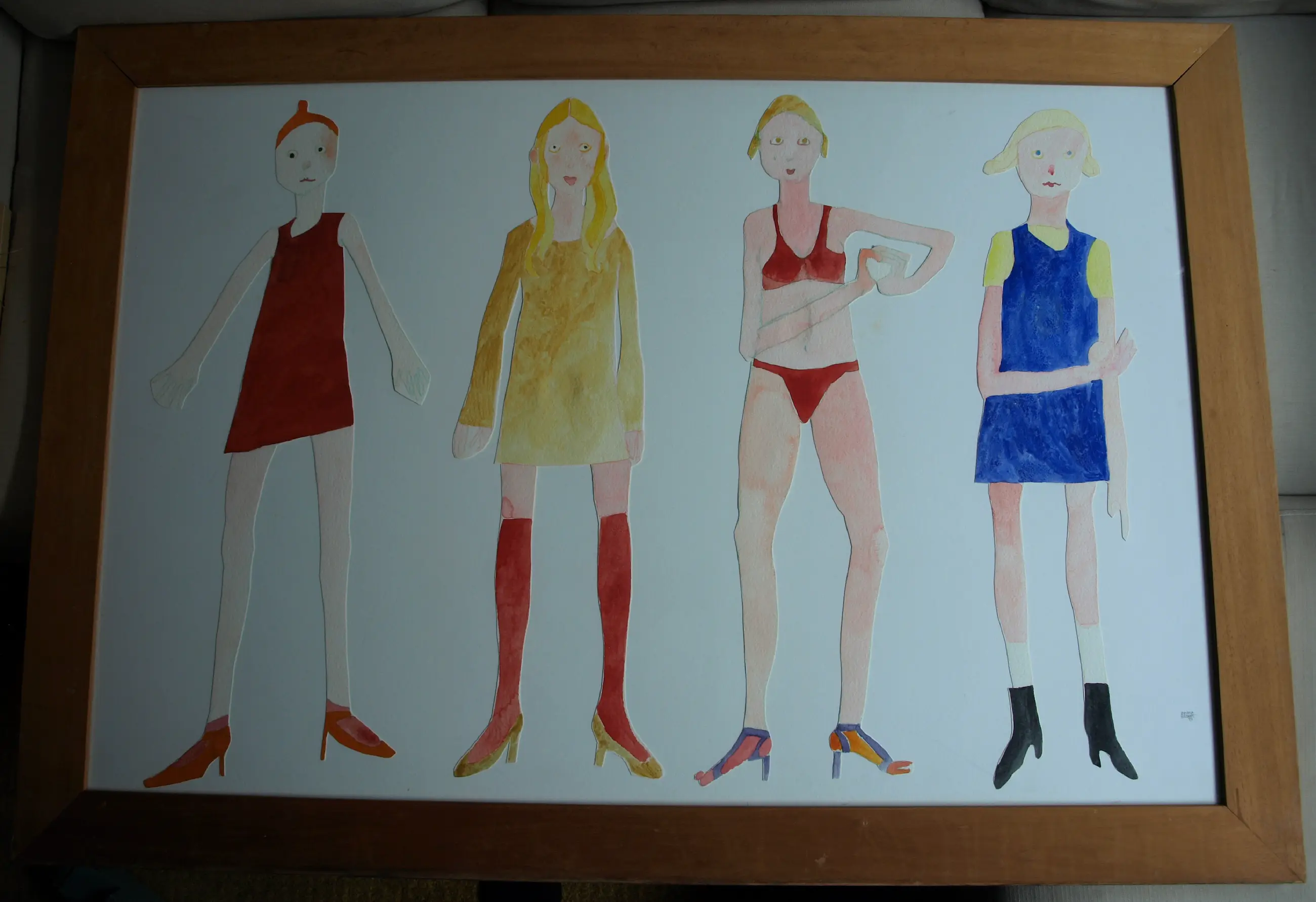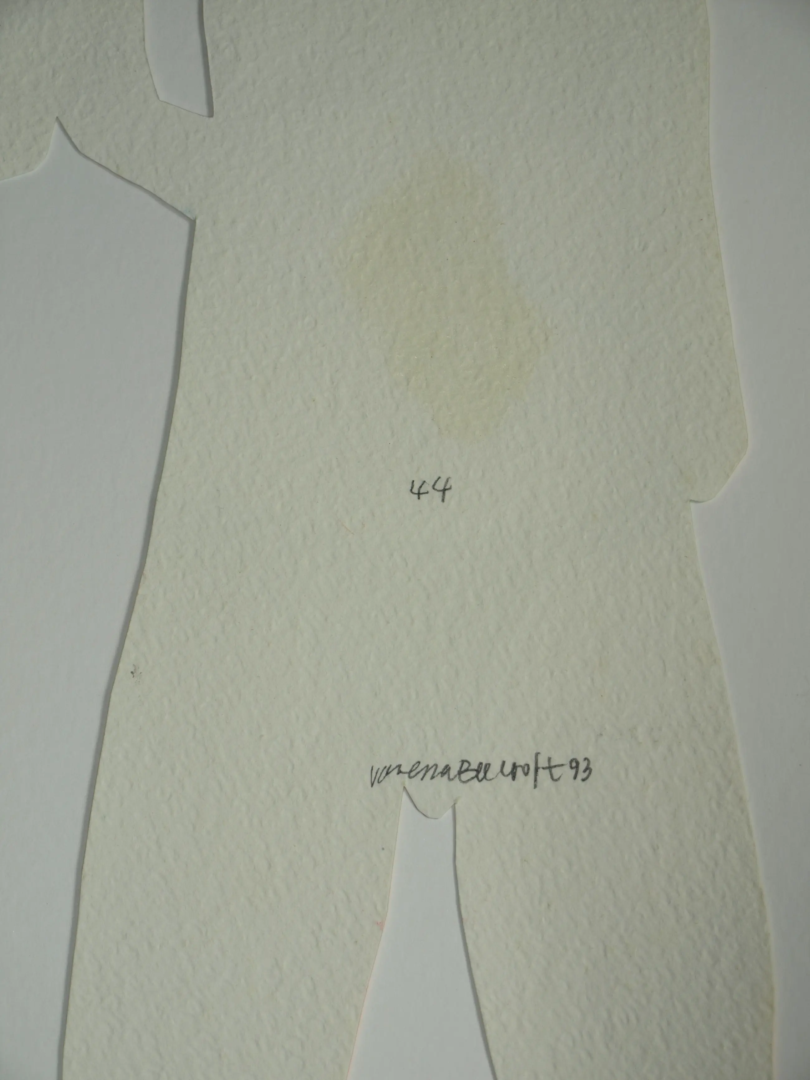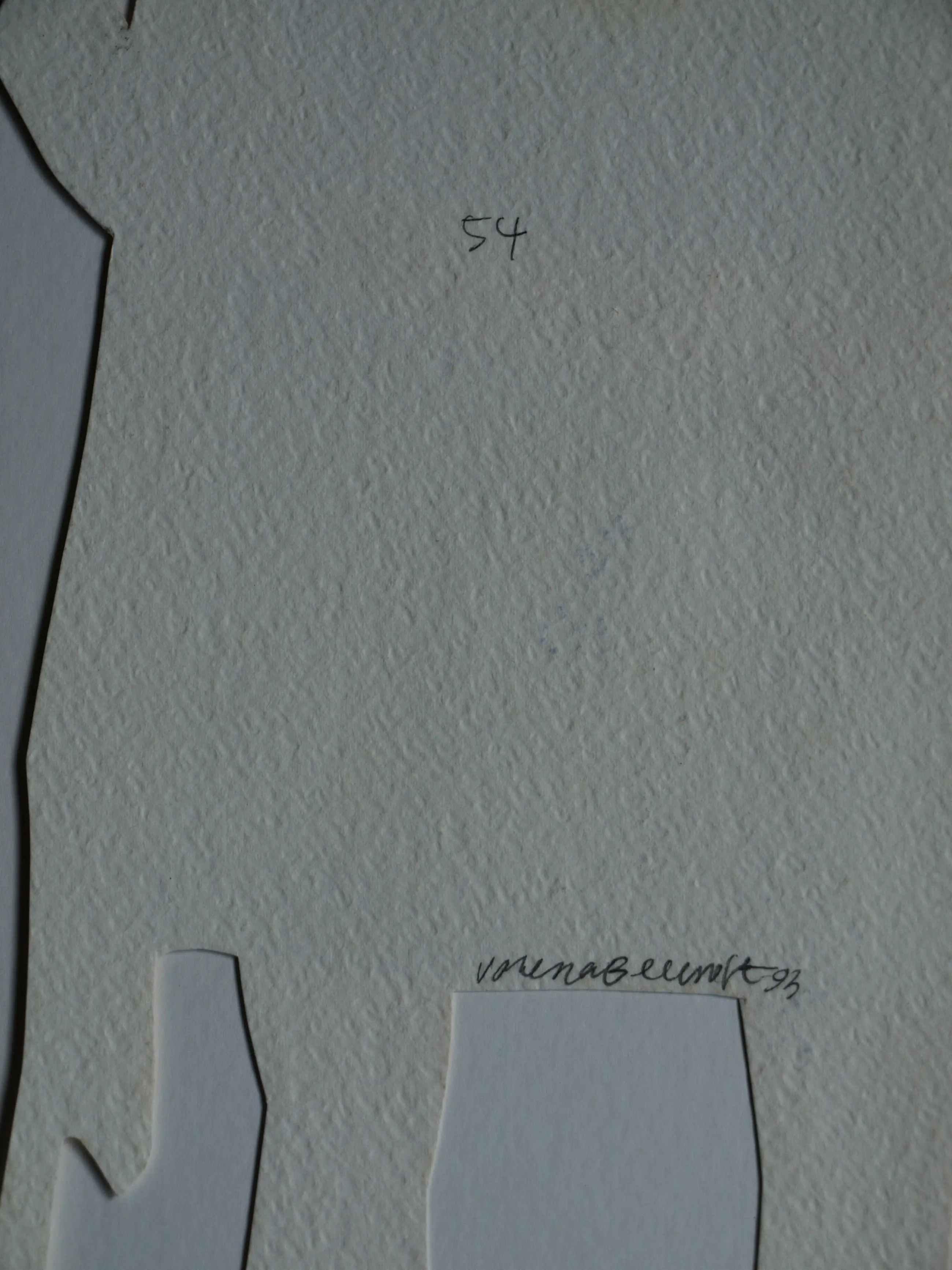 Een vroeg en groot werk van de Italiaans / Amerikaanse kunstenares Vanessa Beecroft (1969). Het werk is uit 1993 en is autobiografisch van aard. -De collage bestaat uit 4 uitgeknipte en beschilderde stukken papier, opgeplakt op een vel karton. -Het werk is gesigneerd en gedateerd rechtsonder. Ook is elk stuk papier gesigneerd en gedateerd op de achterkant (zie de foto’s). -Ingelijst in een robuuste houten lijst met glasplaat. -Afmetingen: Lijst, 94 x 134 x 3 cm. Beeld, 79 x 119 cm. -Herkomst: uit de privé-collectie van de in Italië wonende kunstverzamelaar Jan Willem Tuytel (1947-2001). Hij kocht het werk in 1993 waarschijnlijk rechtstreeks van de kunstenares. Zij woonde en werkte toen in Milaan, Italië. -Conditie: In goede staat. De houten lijst heeft slijtplekjes en vlekjes. Zie ook de foto’s voor een eigen indruk.
