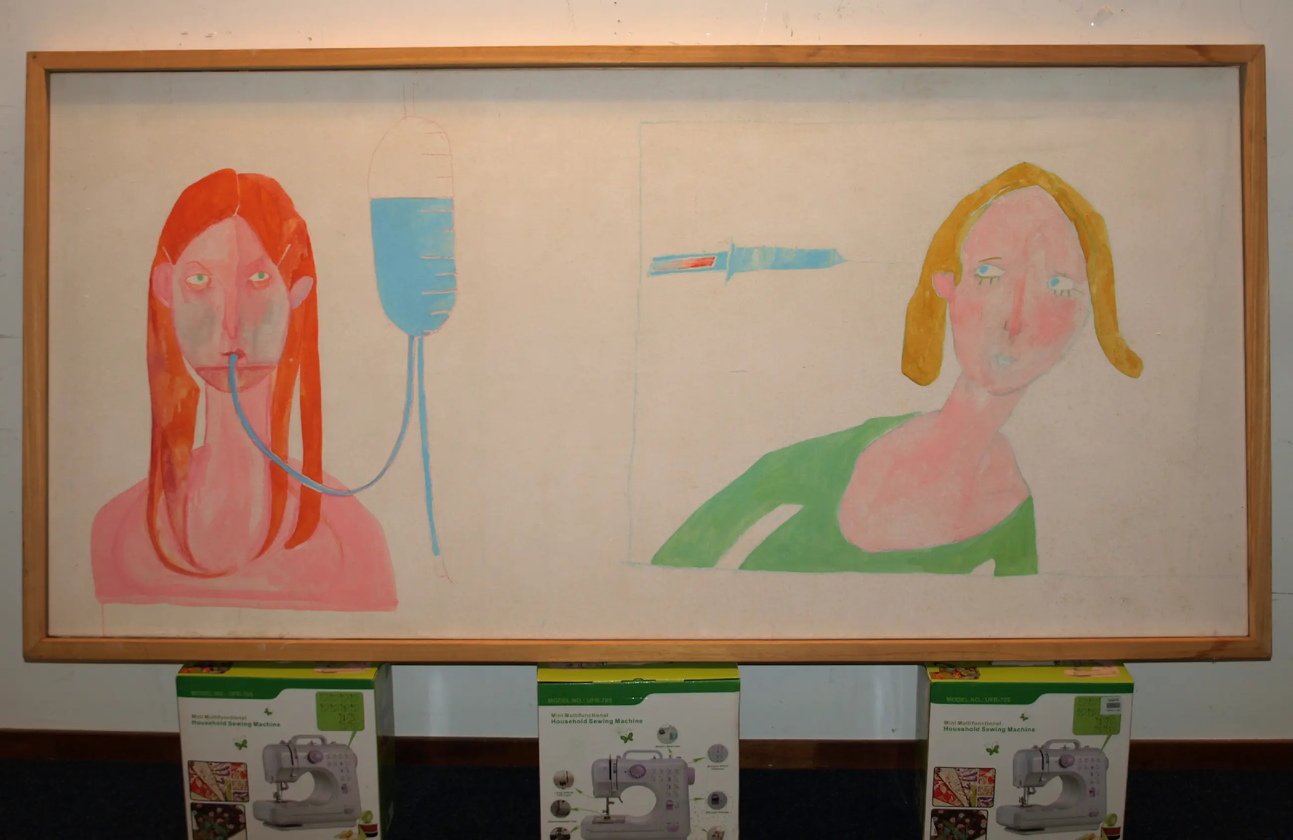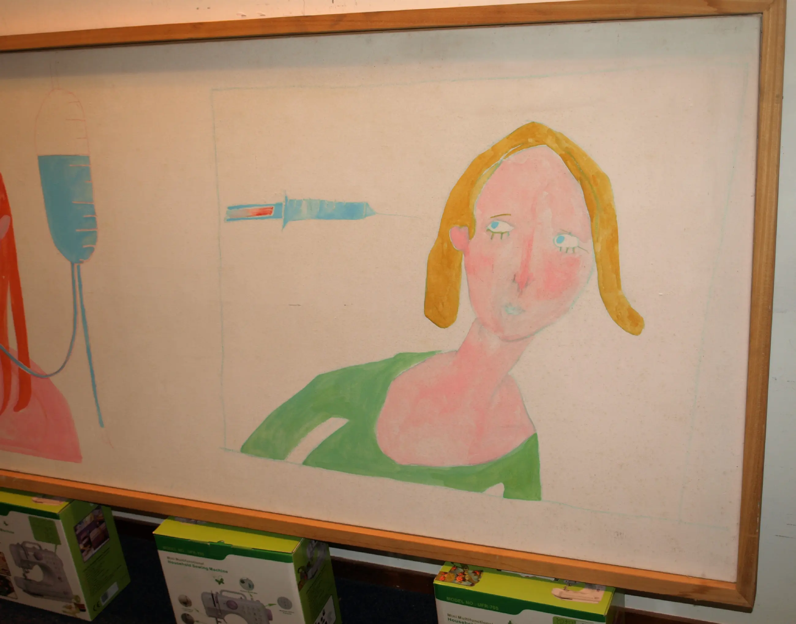 4. “Aan de sonde en met injectiespuit….” (ca. 1993) -Acrylverf op doek, op spieraam. -Ongesigneerd. -Houten lijst. -Lijst, 96 x 196 cm. Beeld, 90 x 190 cm.