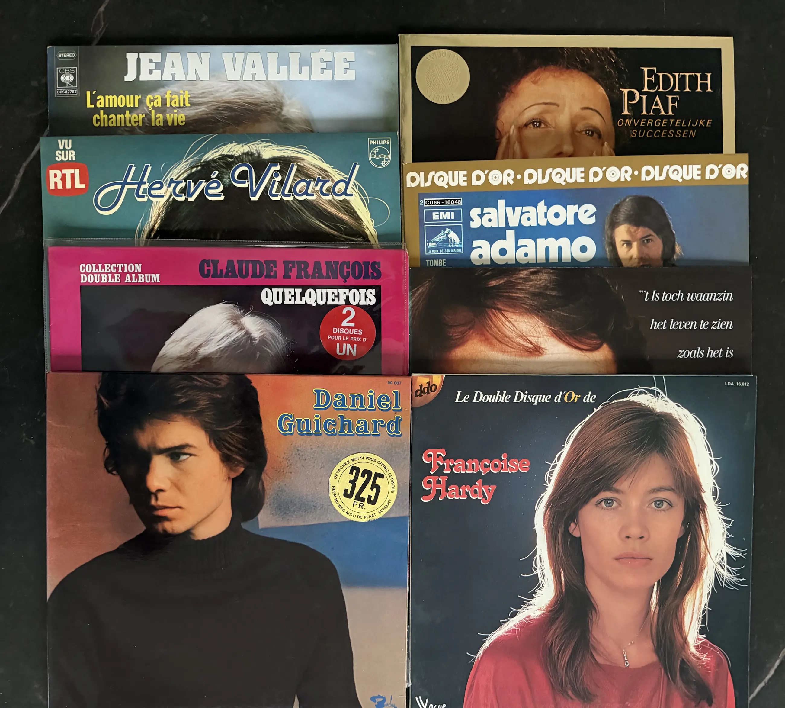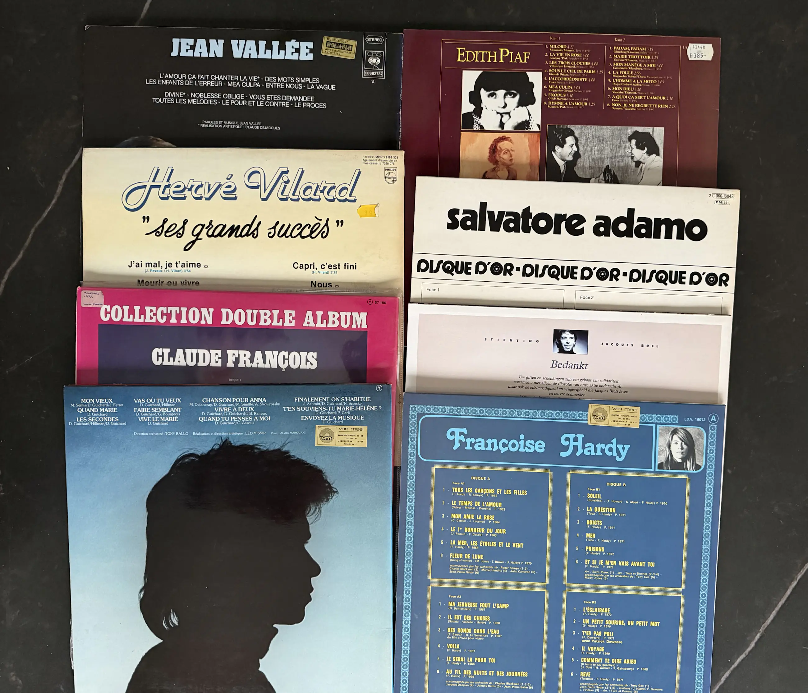 Dit zijn vinylalbums van bekende Franse en Belgische artiesten, waaronder Jean Vallée, Edith Piaf, Hervé Vilard, Claude François, Salvatore Adamo, Daniel Guichard en Françoise Hardy.