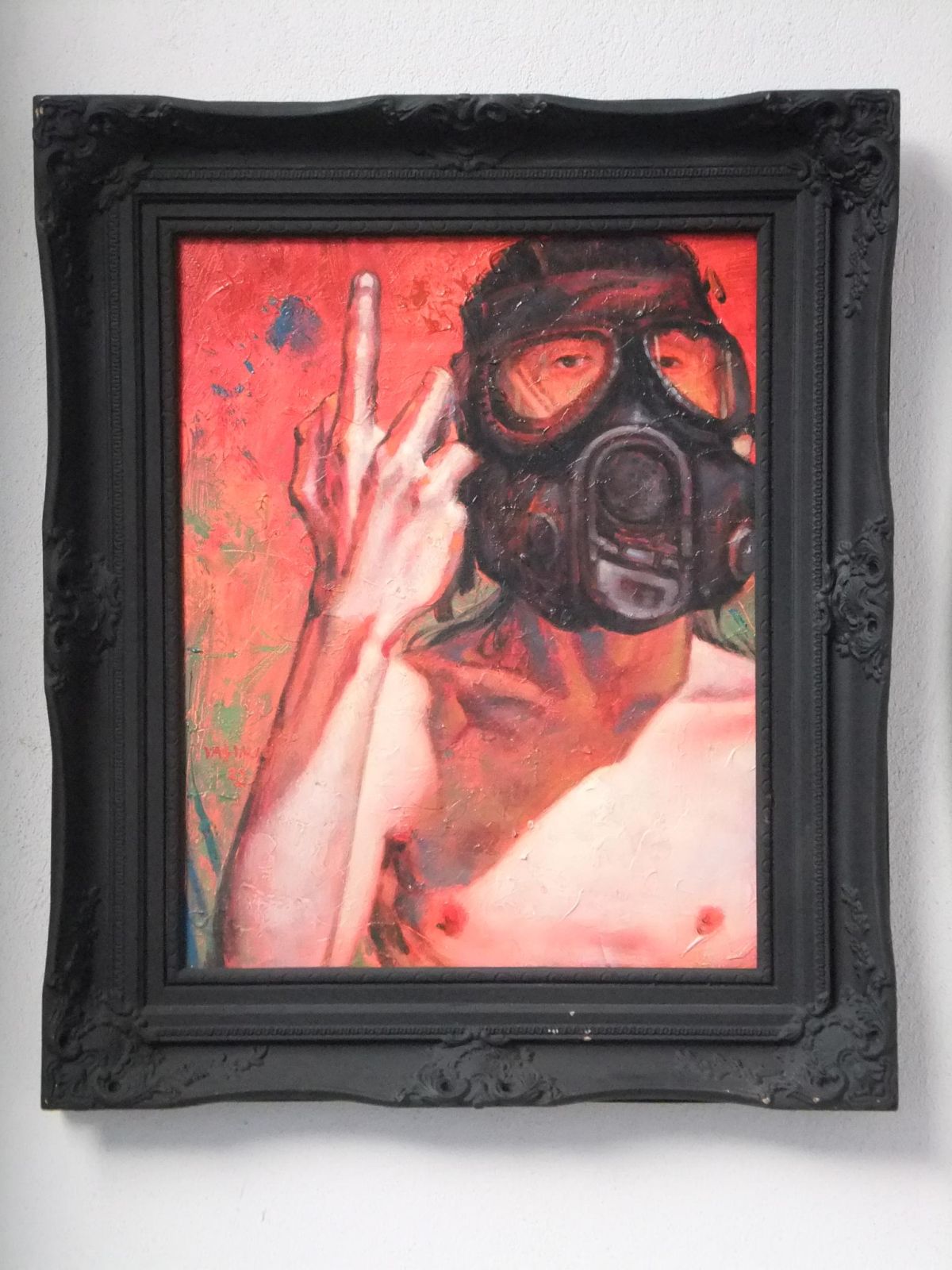 >>>>> Stunning original oil painting, commenting on contemporary issues, created by successful Thai artist VASIN SUTTIKASEM (aka SIVA), around 2009, motive: Portrait with gas mask and upraised forefinger, c. 67 x 57 cm (outside dimension of the frame), oil on canvas, stretched on wooden frame, below on the right hand-signed and dated "22" (could it be the year according to Thai calender?). Colour freshness preservation, in the original artist's frame (baroque style, black painted), the frame with slight traces of handling, painting in excellent condition !