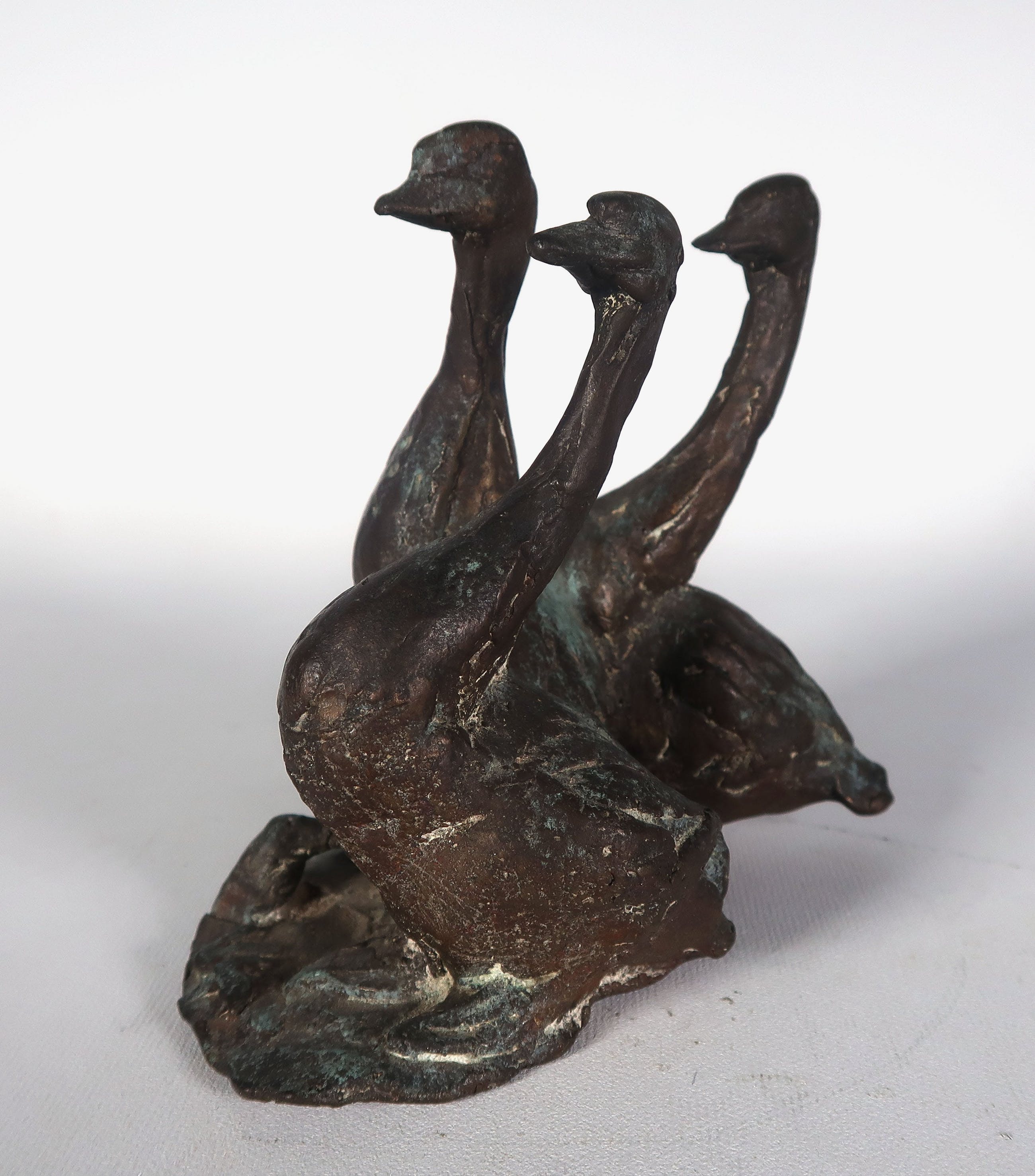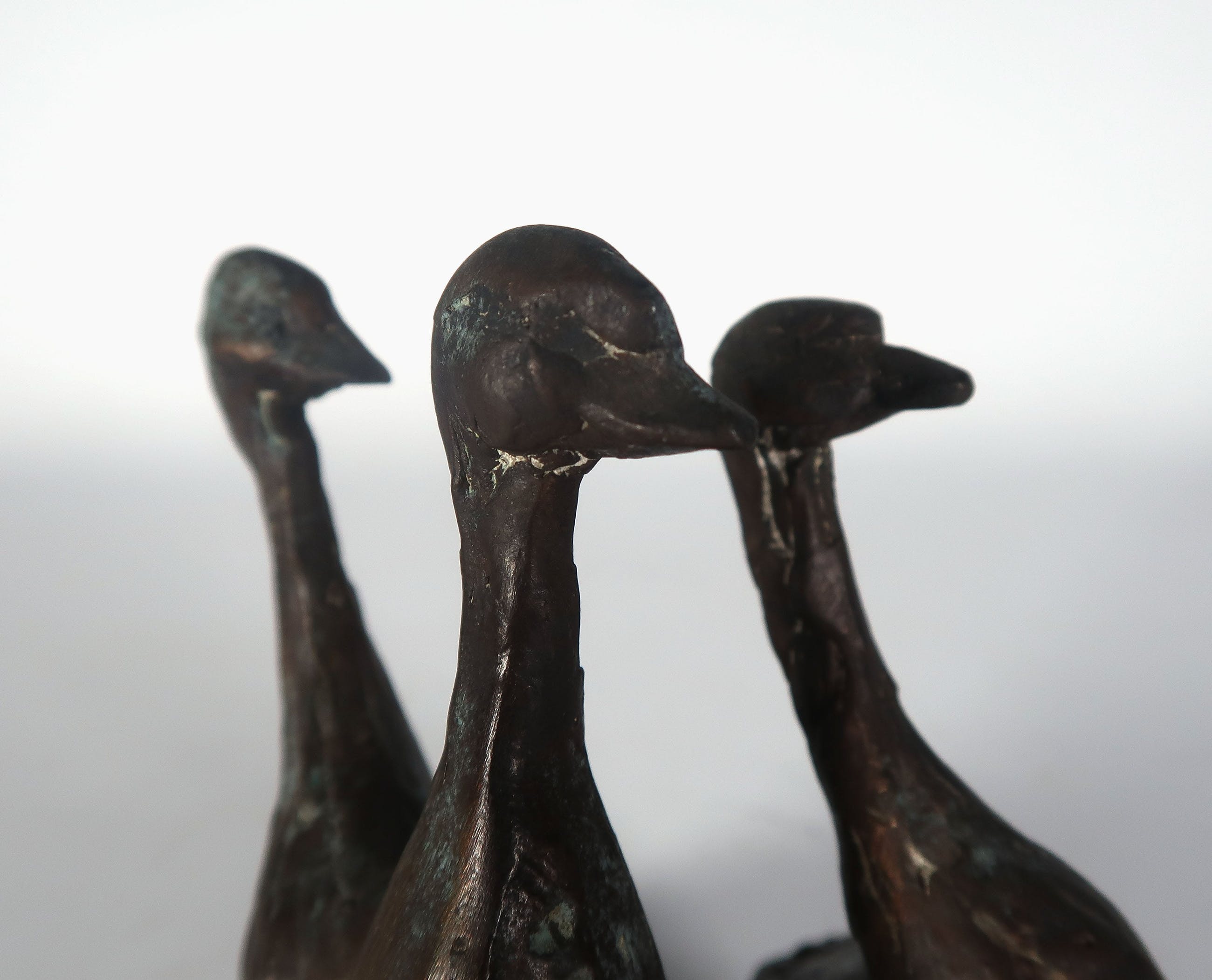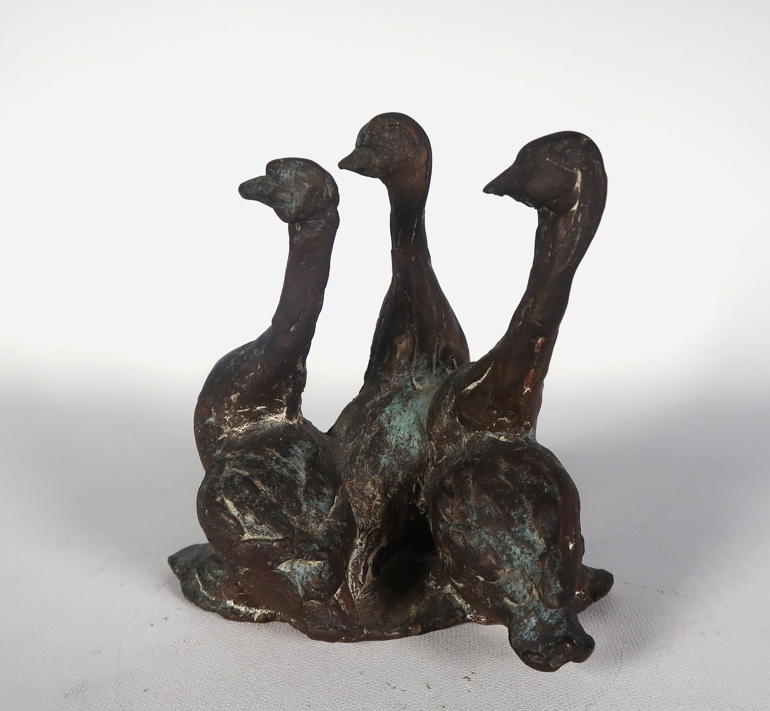 Een groep van drie gansjes in dynamische houdingen. Het werk, van de beeldhouwer Vera de Haas, is uitgevoerd in brons verkeert in zeer goede staat. Het plateau waar de gansjes op staan, is voorzien van De Haas' monogram.
