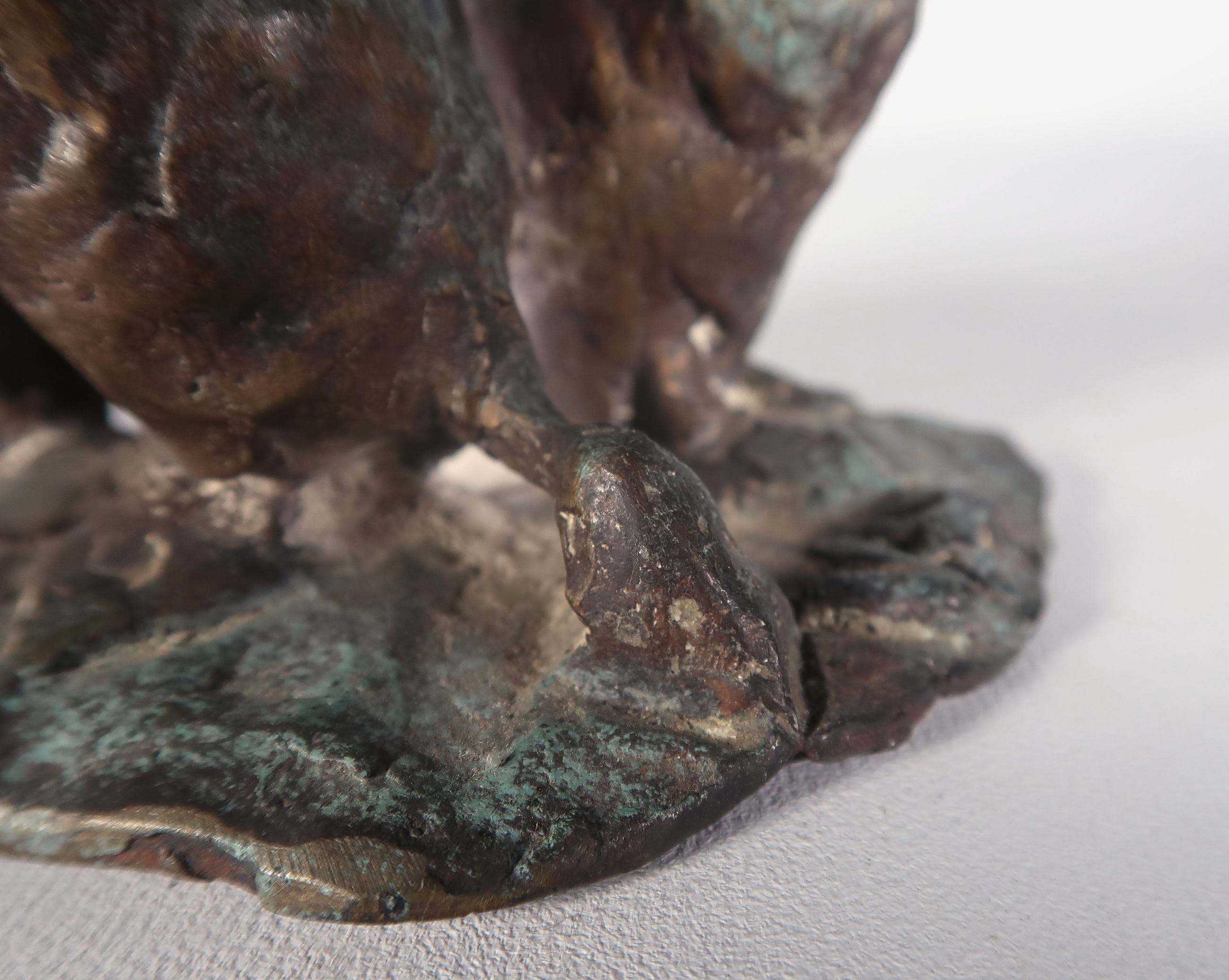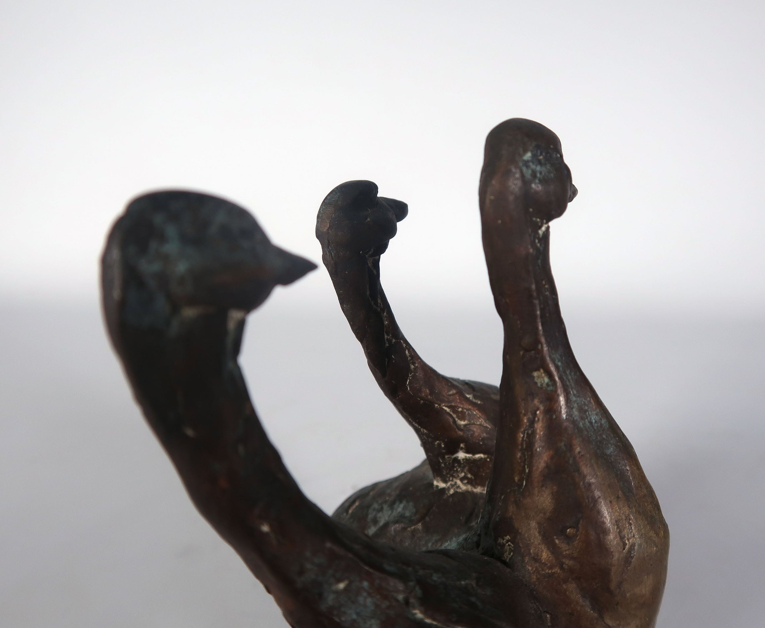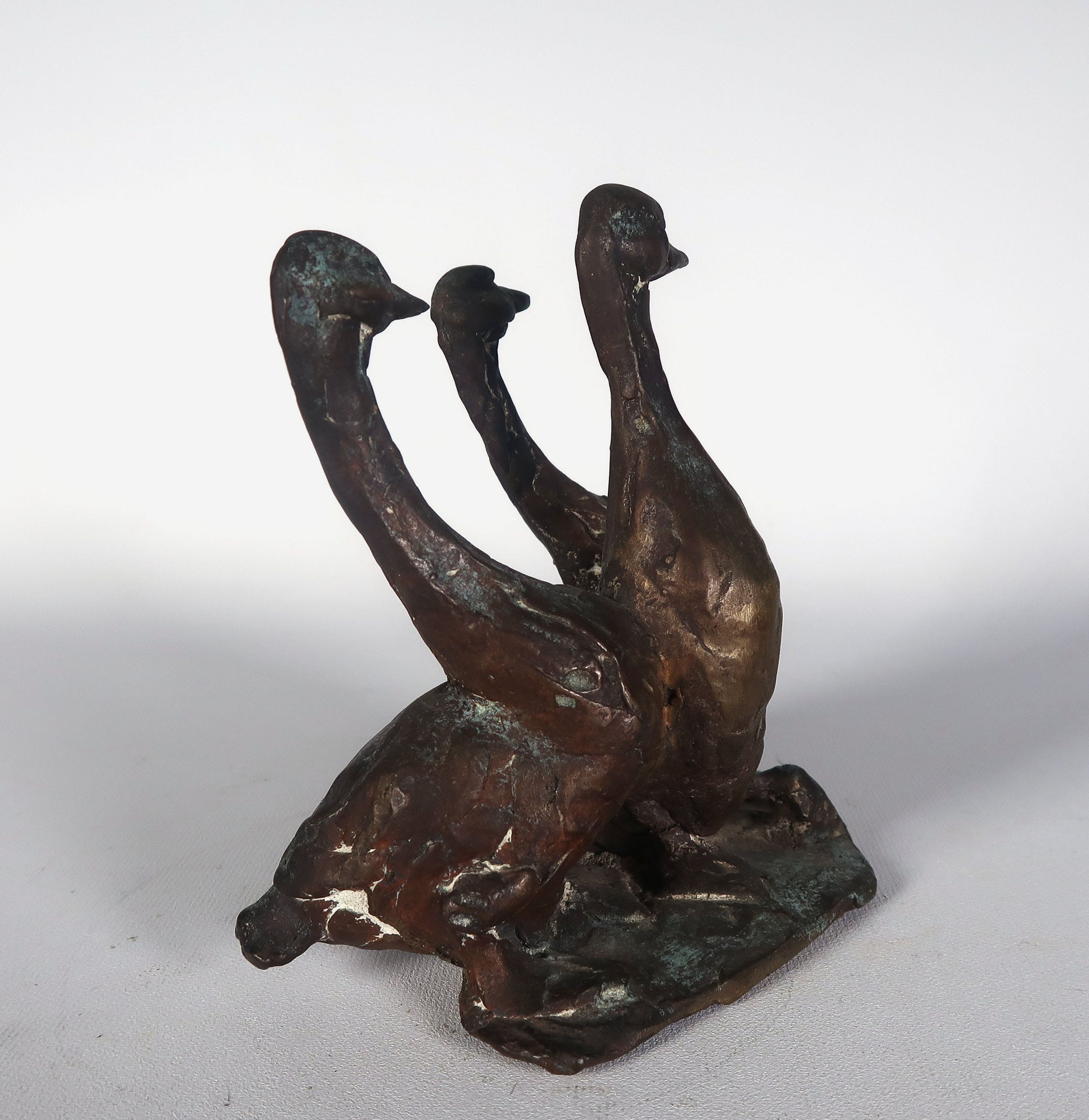 Een groep van drie gansjes in dynamische houdingen. Het werk, van de beeldhouwer Vera de Haas, is uitgevoerd in brons verkeert in zeer goede staat. Het plateau waar de gansjes op staan, is voorzien van De Haas' monogram.