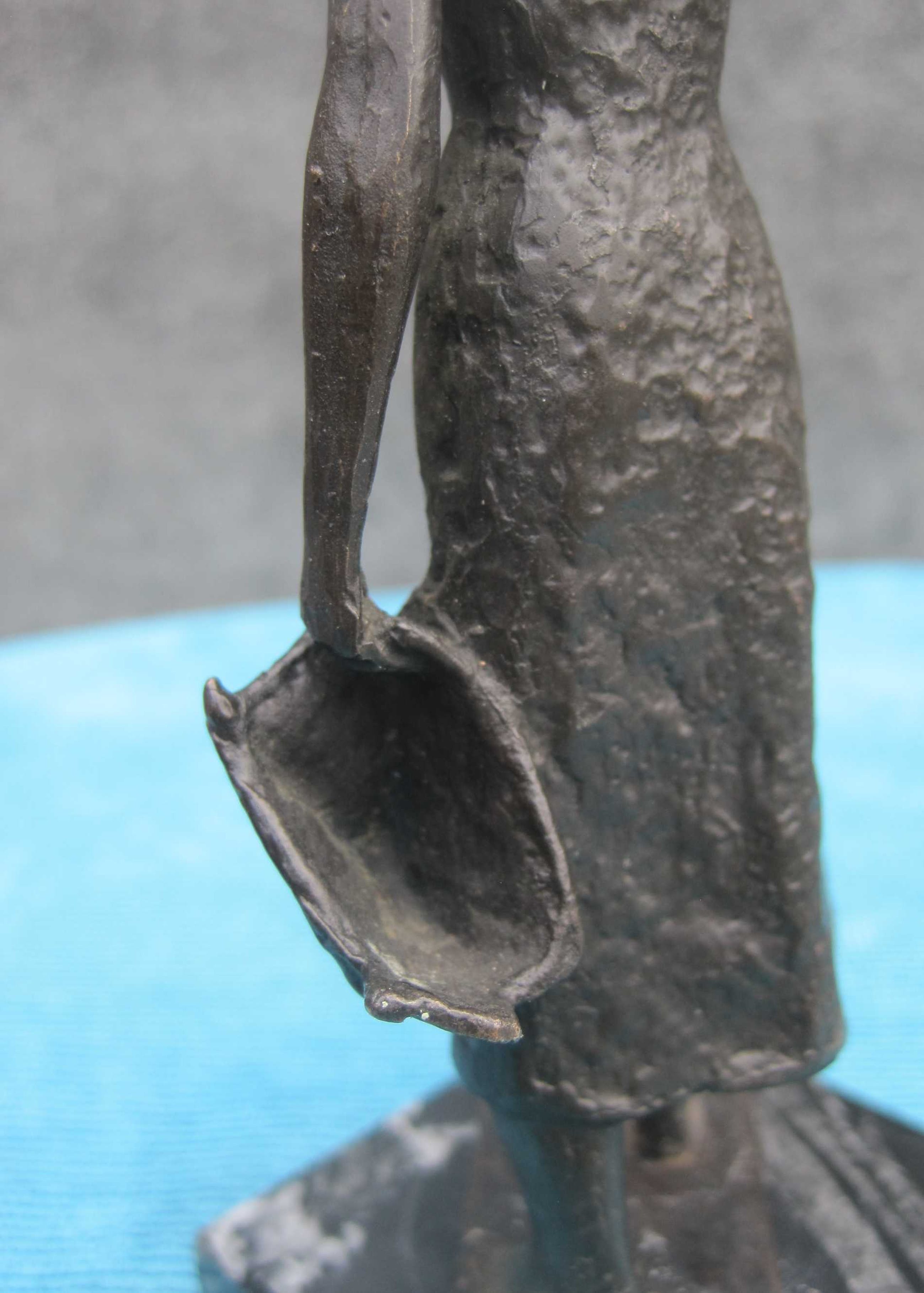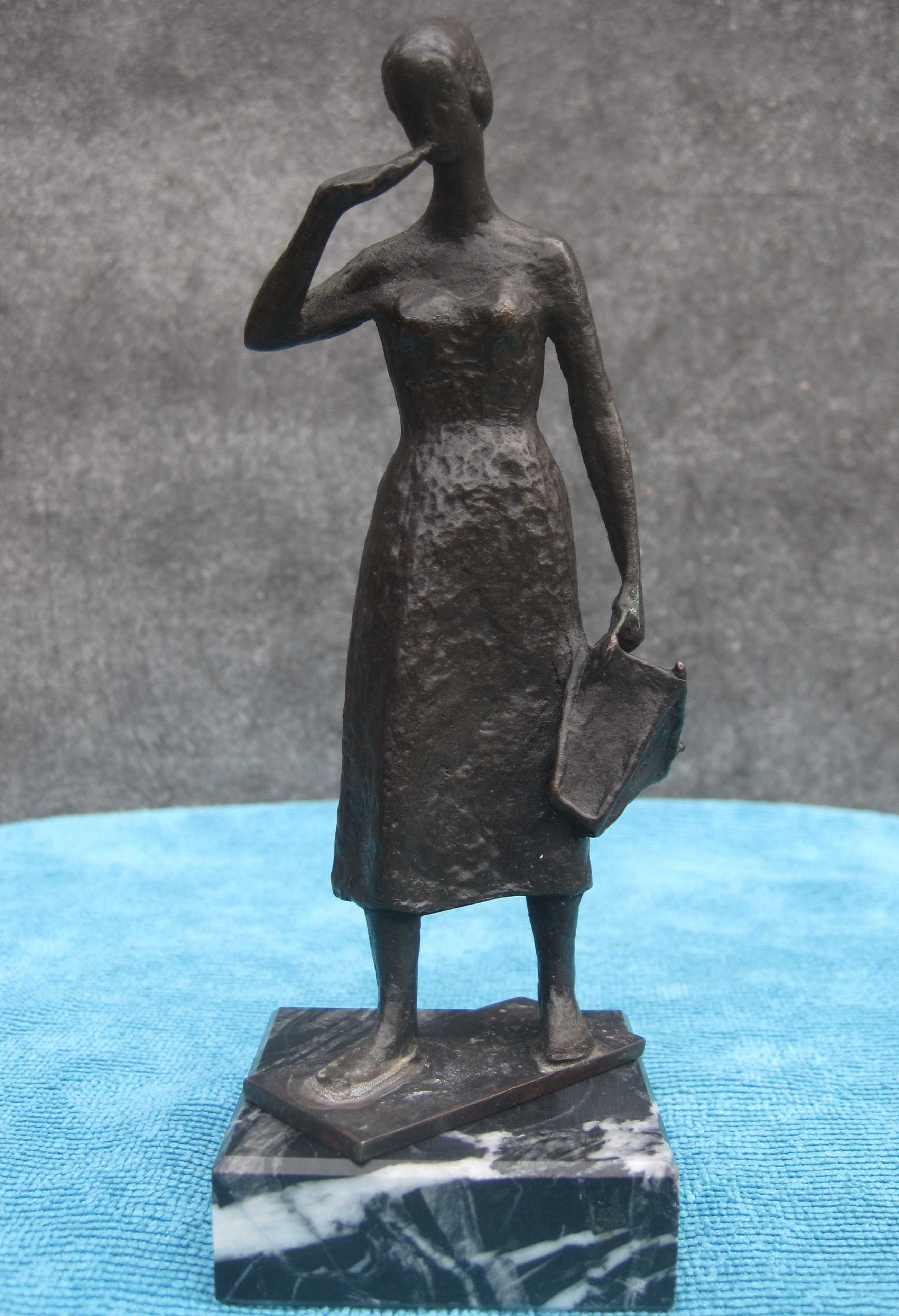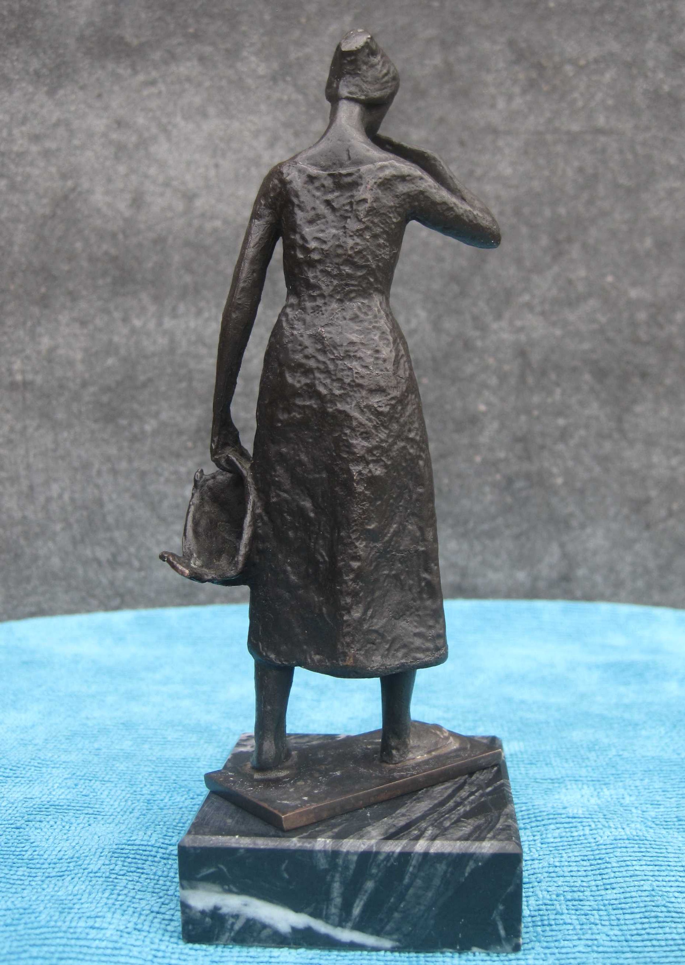 Mooi massief bronzen beeldje naar het origineel van Vera Tummers-van Hasselt, welke staat op de Kerkboog te Nijmegen.Het beeld is aan de stad geschonken door Vroom en Dreesman N.V. te Nijmegen. Het bedrijf wilde op deze wijze haar dank betuigen aan de gemeente 'voor de zorg en de ontzaglijke moeite die men zich getroostte voor de wederopbouw van de gehavende stad en speciaal voor de objectiviteit en het vele werk dat men over heeft gehad voor het herstel van ons bedrijf'. Het beeldje is niet gesigneerd en naar mijn mening is het sokkeltje niet origineel. De afmetingen zijn zonder het sokkeltje