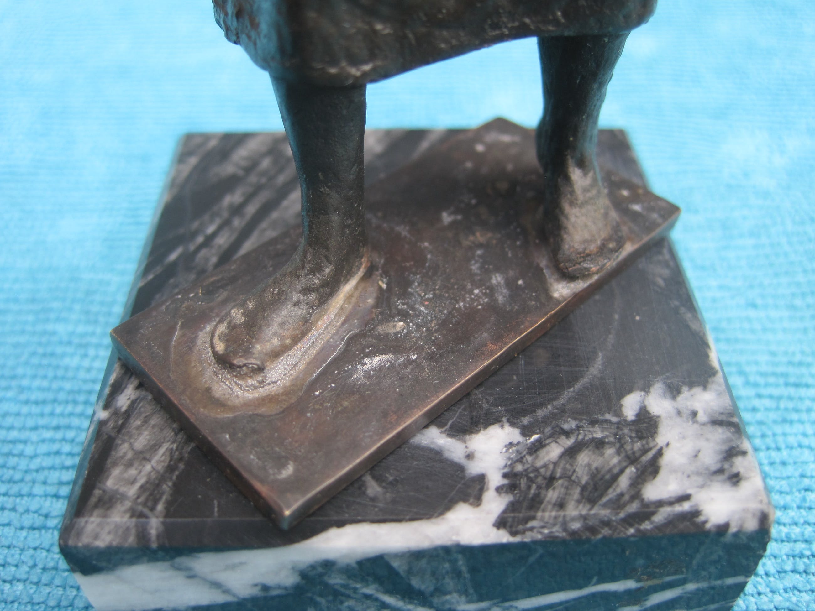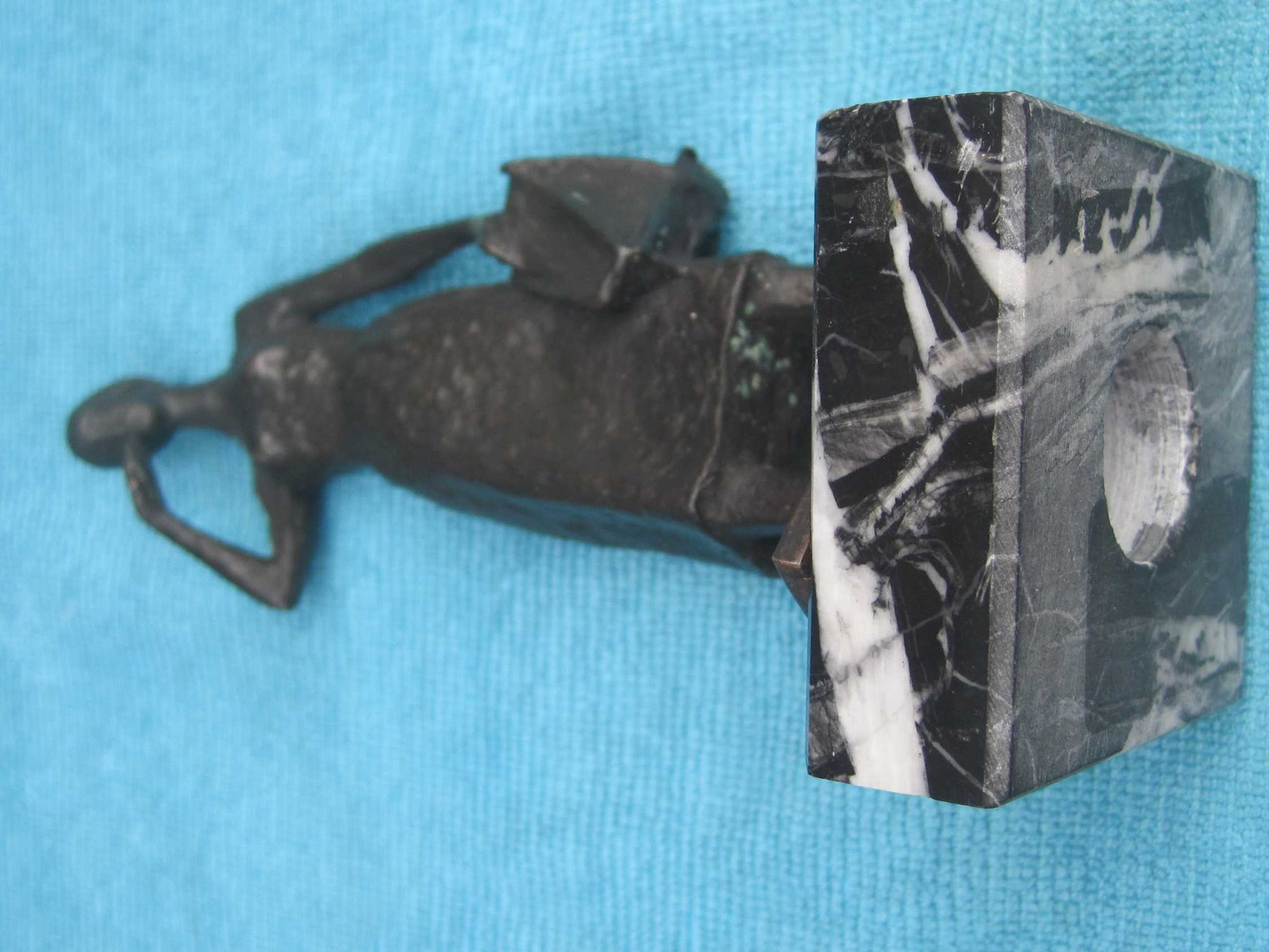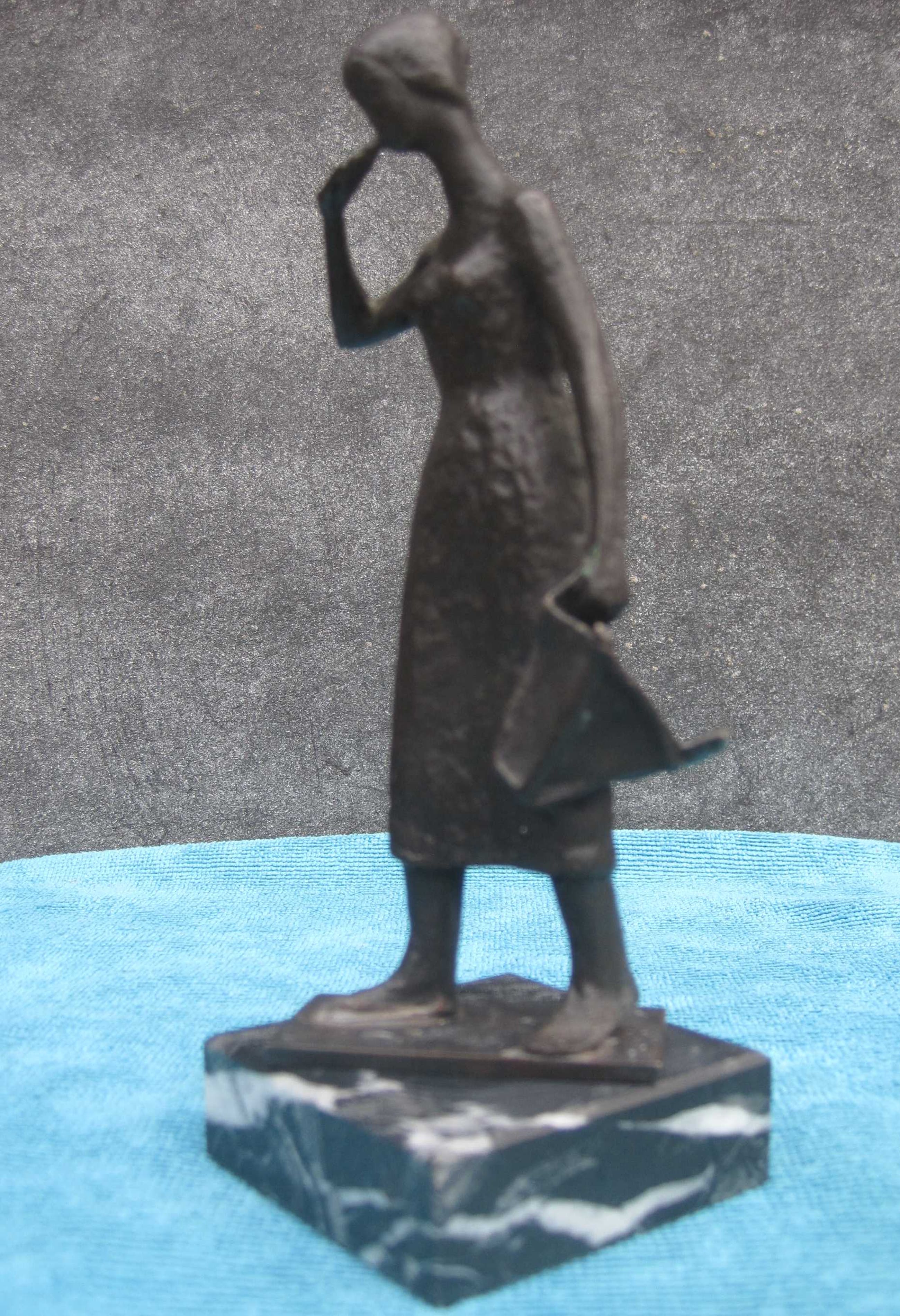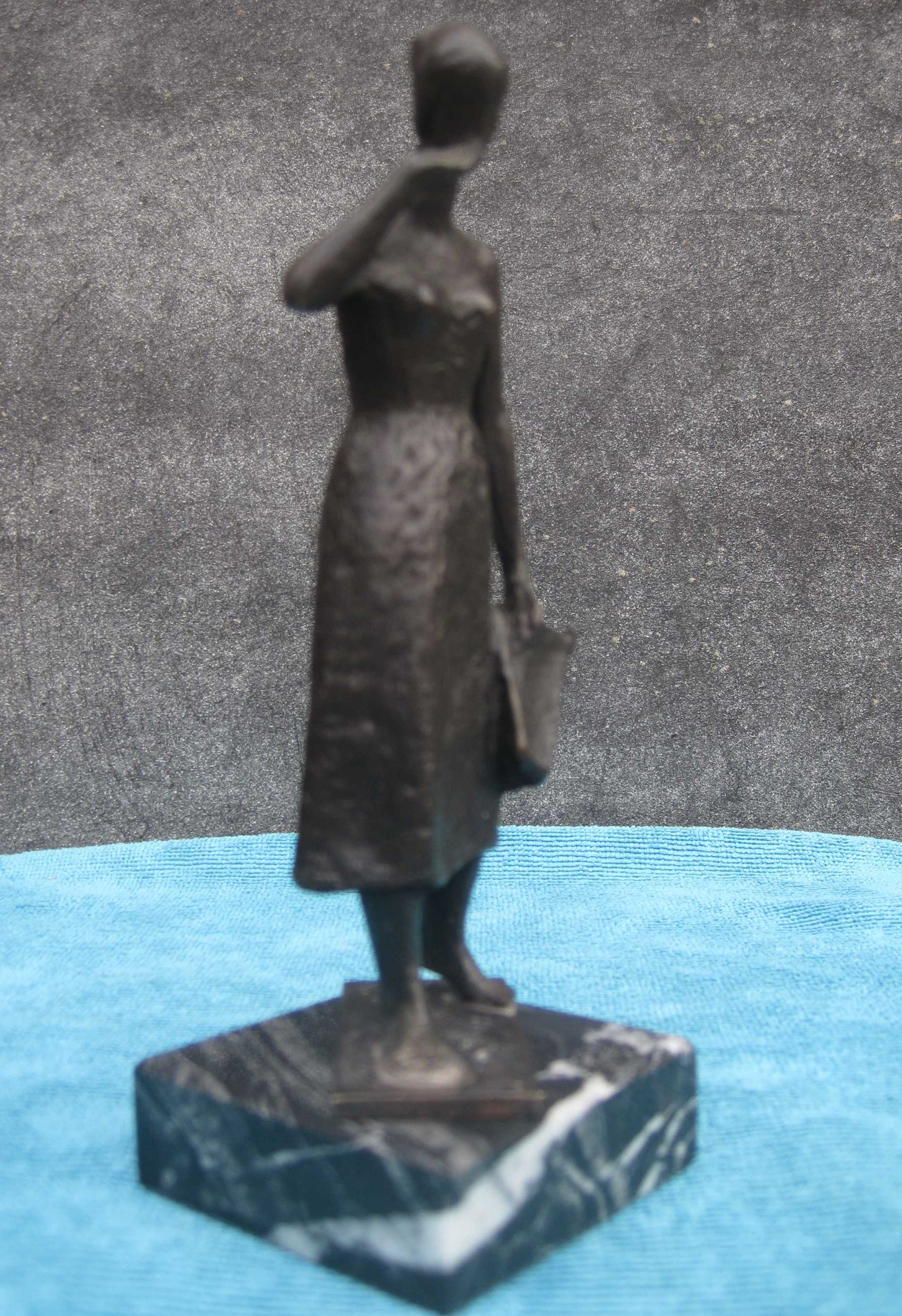 Mooi massief bronzen beeldje naar het origineel van Vera Tummers-van Hasselt, welke staat op de Kerkboog te Nijmegen.Het beeld is aan de stad geschonken door Vroom en Dreesman N.V. te Nijmegen. Het bedrijf wilde op deze wijze haar dank betuigen aan de gemeente 'voor de zorg en de ontzaglijke moeite die men zich getroostte voor de wederopbouw van de gehavende stad en speciaal voor de objectiviteit en het vele werk dat men over heeft gehad voor het herstel van ons bedrijf'. Het beeldje is niet gesigneerd en naar mijn mening is het sokkeltje niet origineel. De afmetingen zijn zonder het sokkeltje
