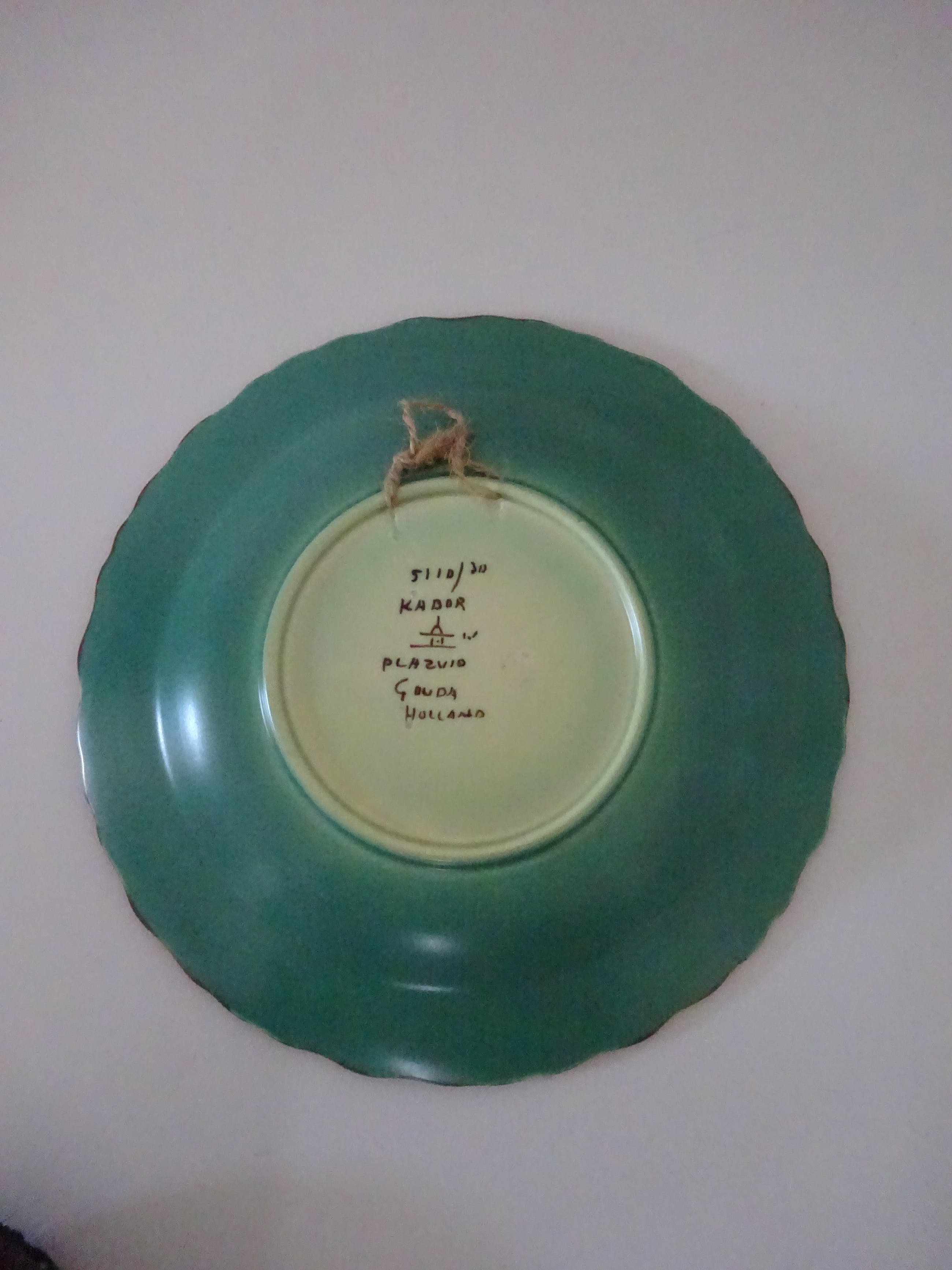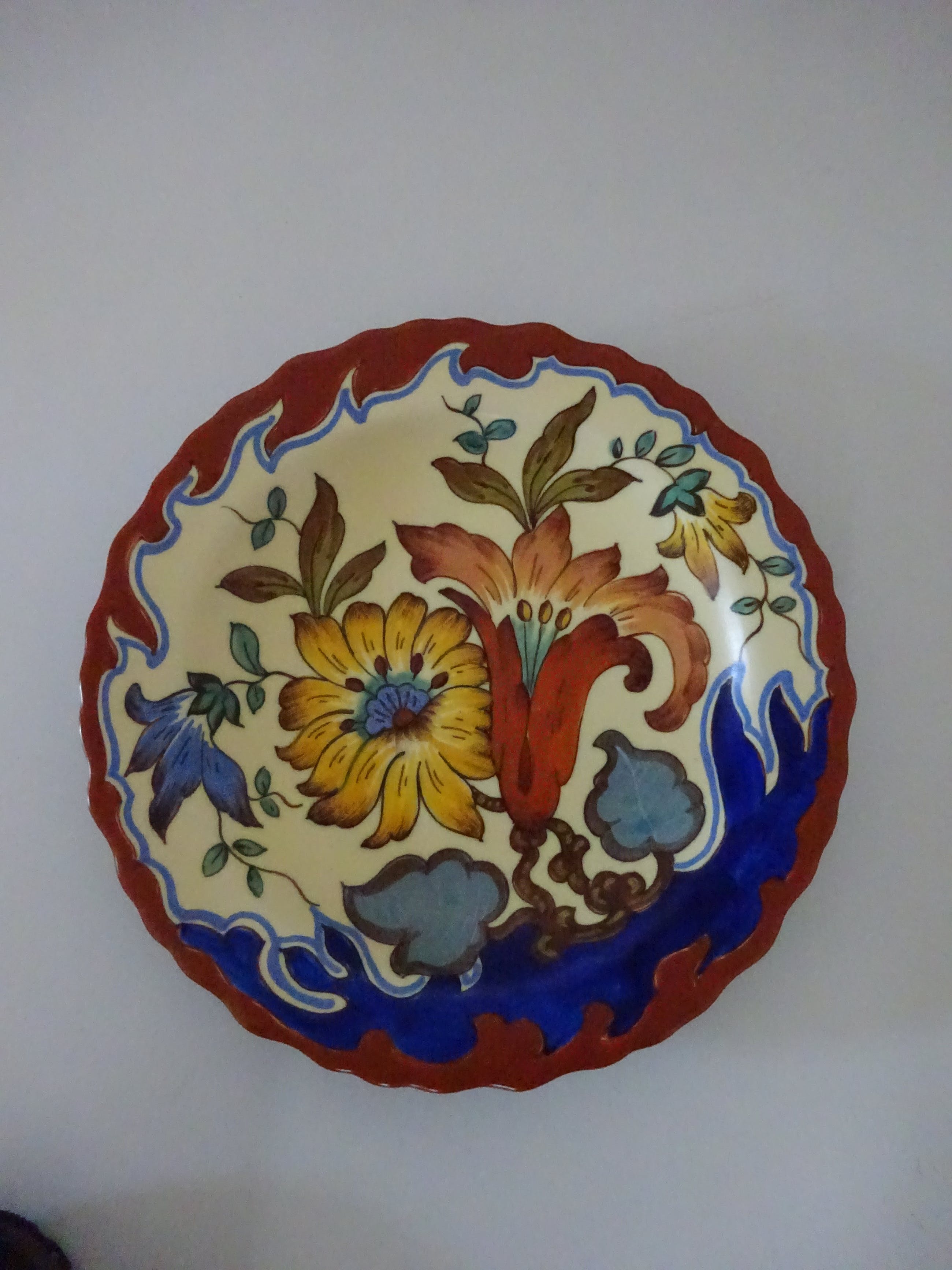 Groot plateel wandbord met ophang mogelijkheid Doorsnee 31 cm. Mooi bloemdecor