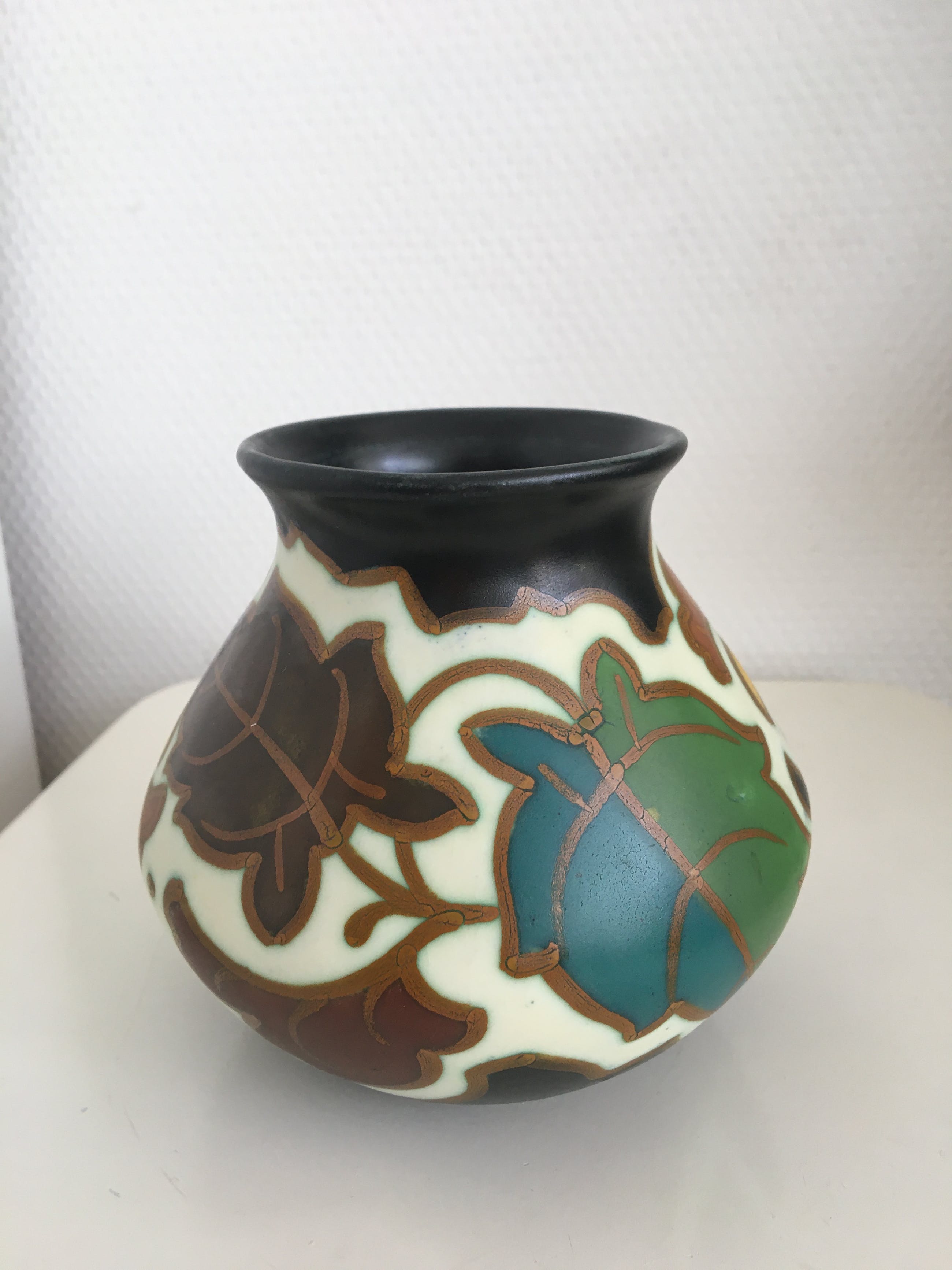 Mooi oud vaasje met prachtige felle kleuren bloem en blad motief. Gesigneerd: 262 Dec. Gouda Arnhem Holland K.D.