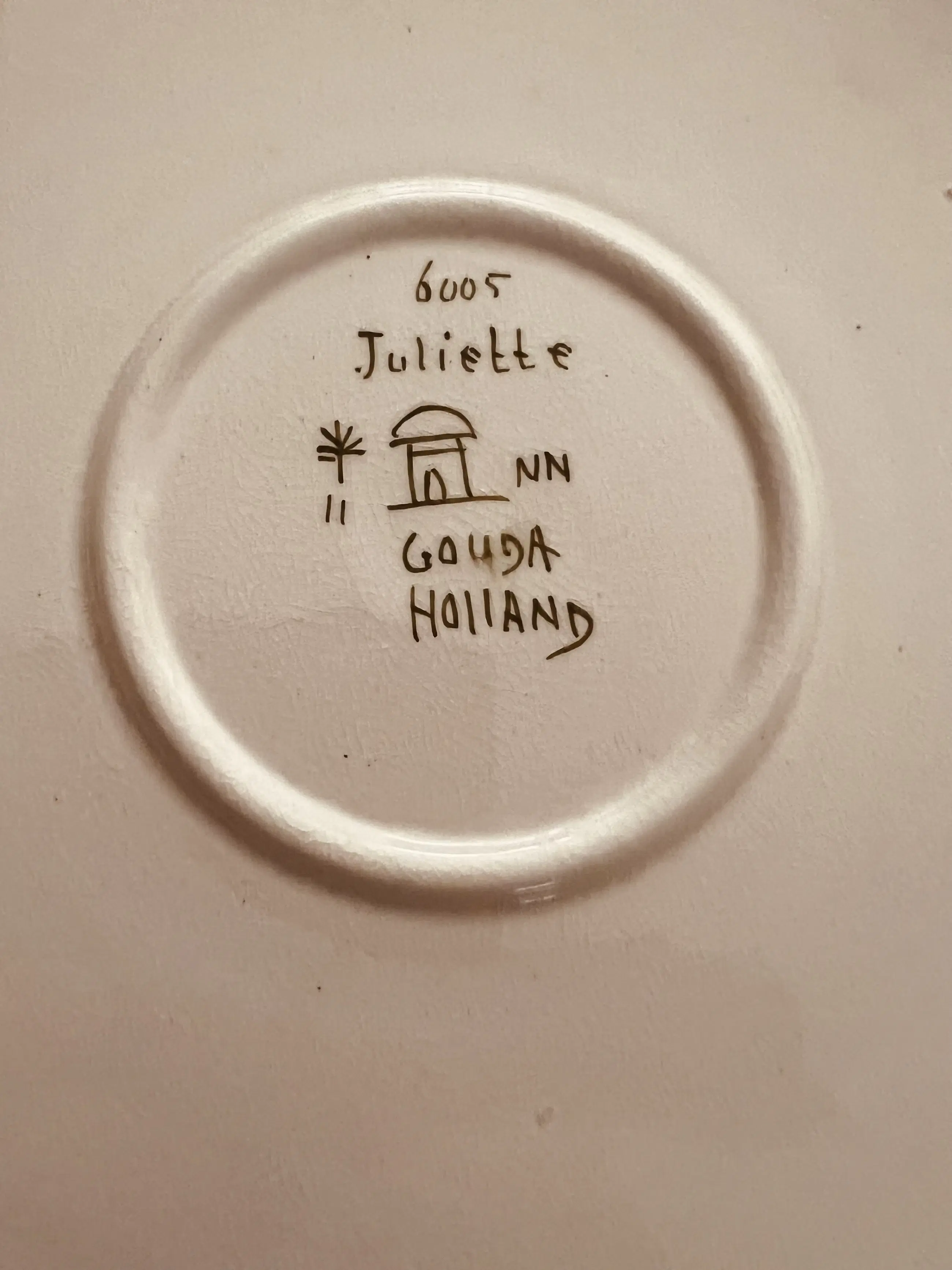 Mooi vintage bord van Gouda Holland, model Juliette. Decoratief bord met bloemmotieven en sierlijke details. Perfect voor verzamelaars of als decoratie in huis.