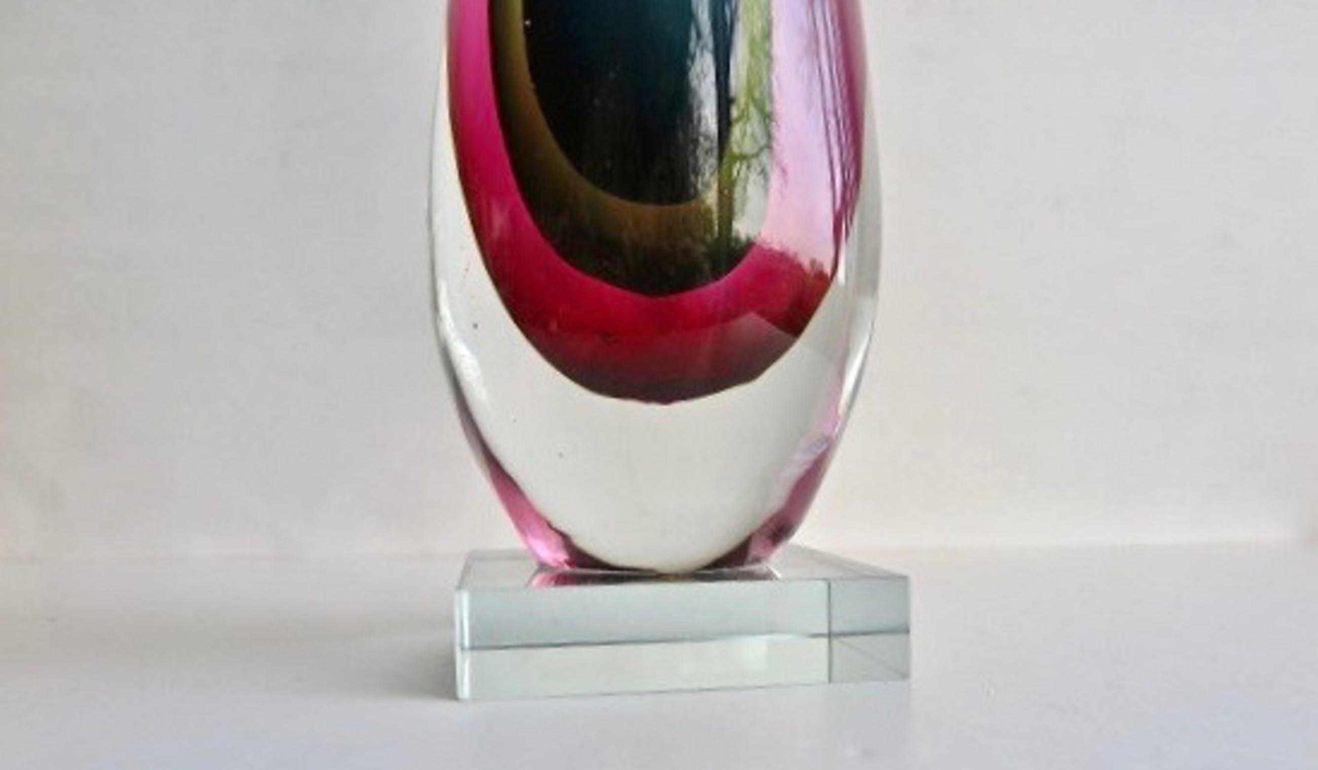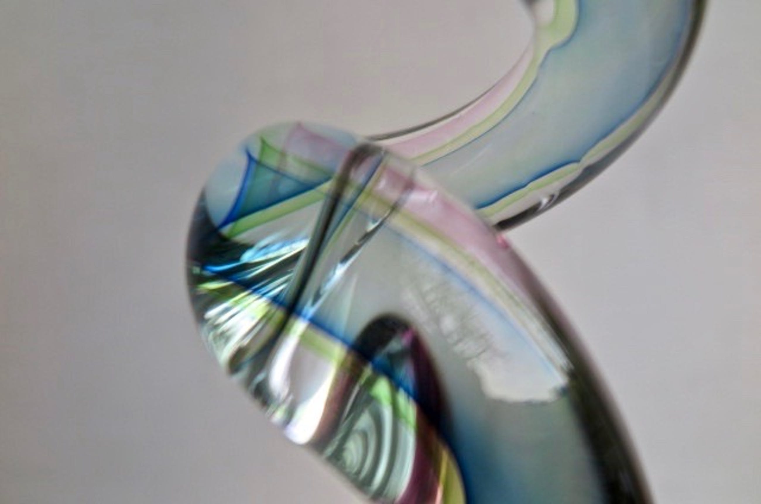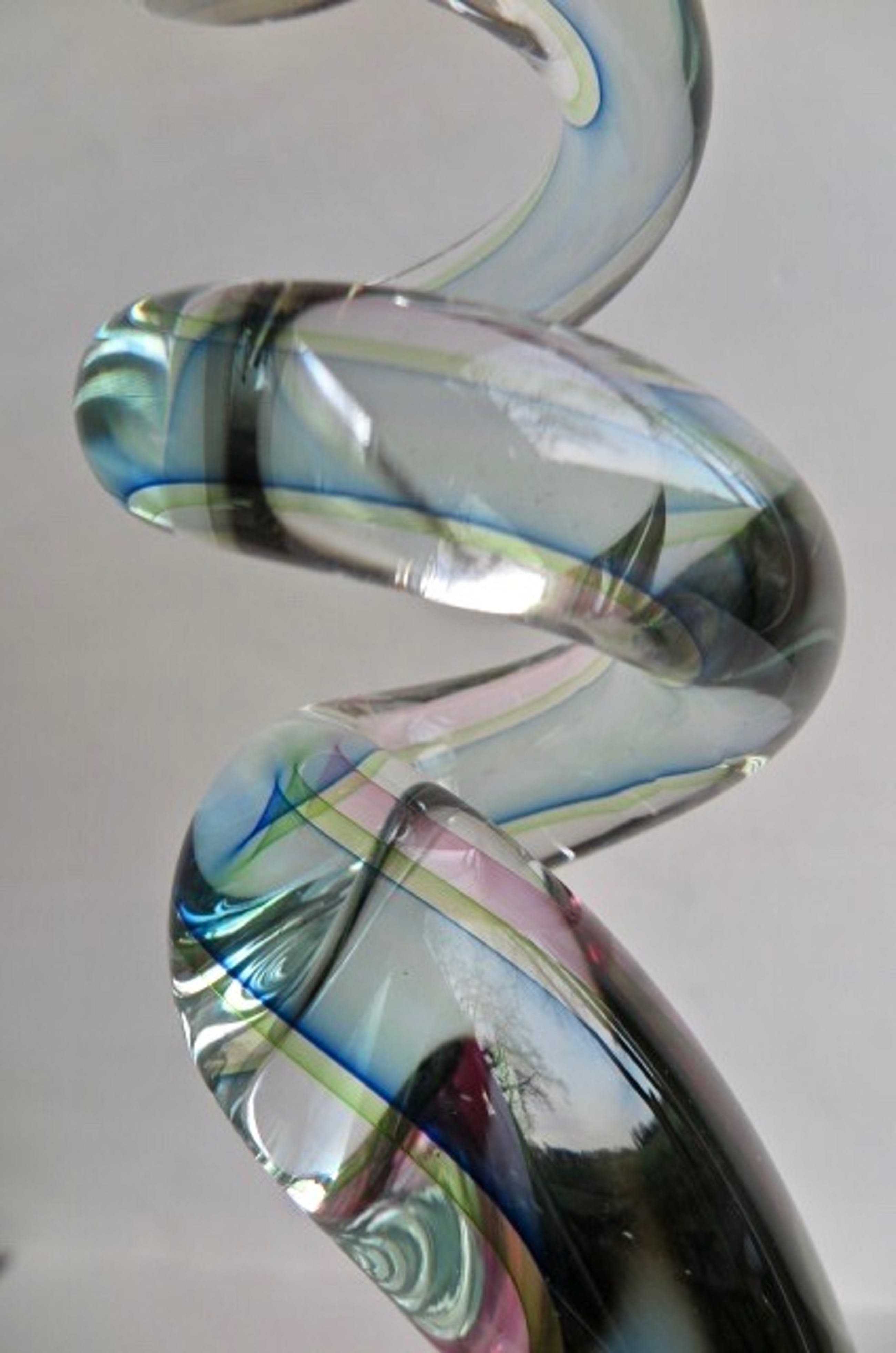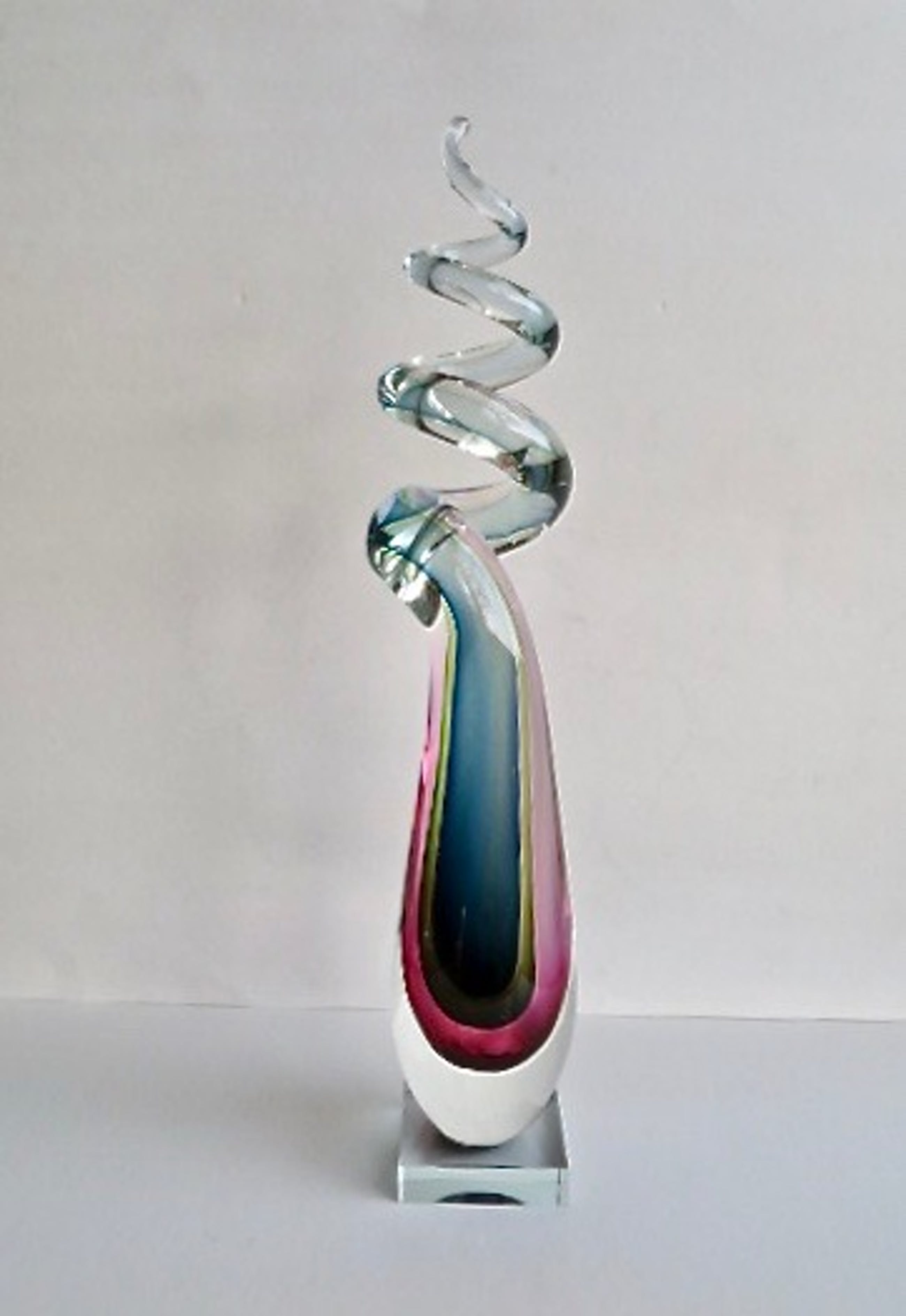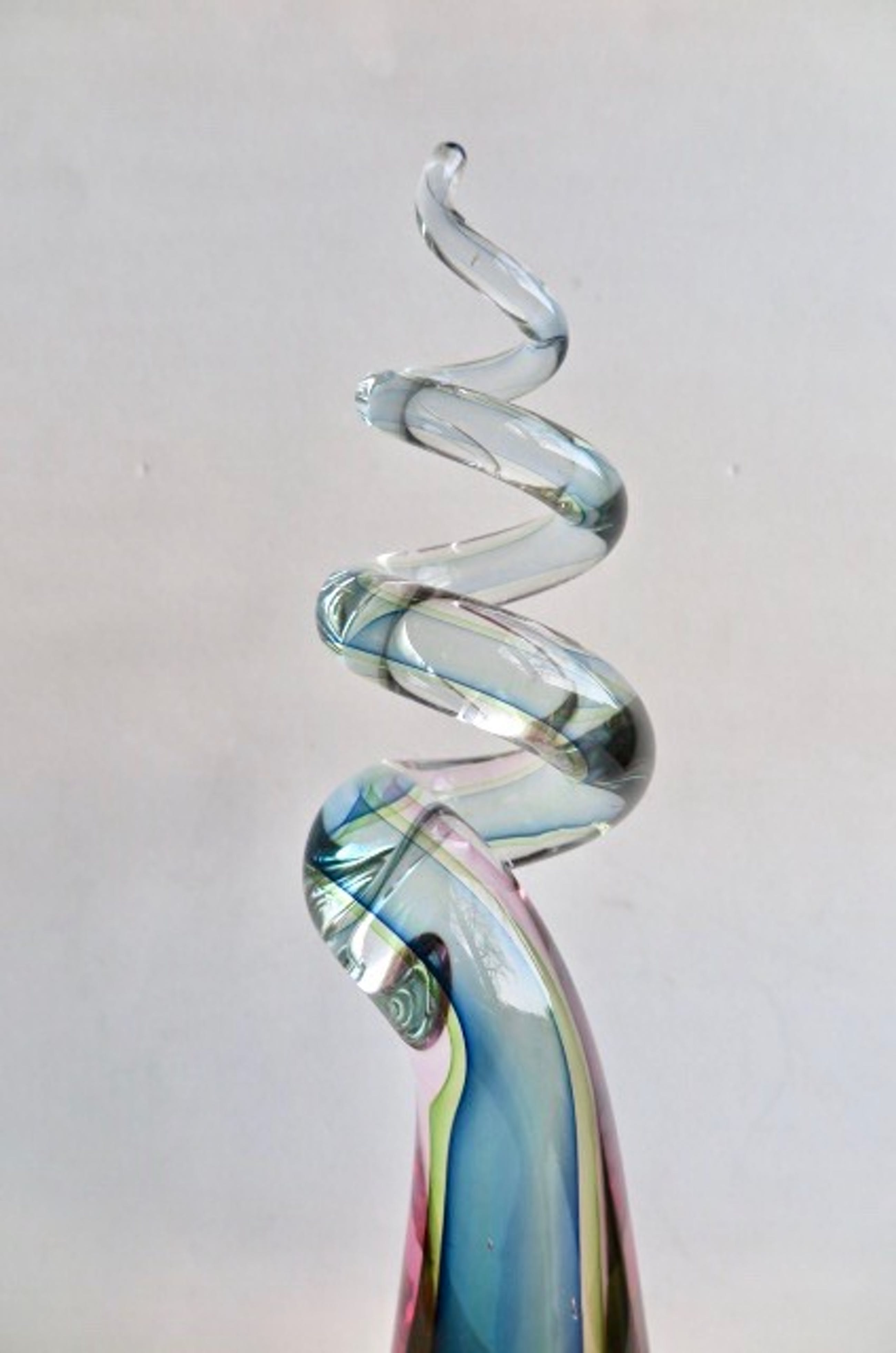 Fraaie glaskunst met mooie kleuren, overgaand in elkaar en in transparantie. Zware kwaliteit, massief glas. Handgeblazen unicum, getuige de luchtbelletjes. Vooral in de bredere basis zijn wat lucht-/trekbelletjes te zien. Dit is geen schade.