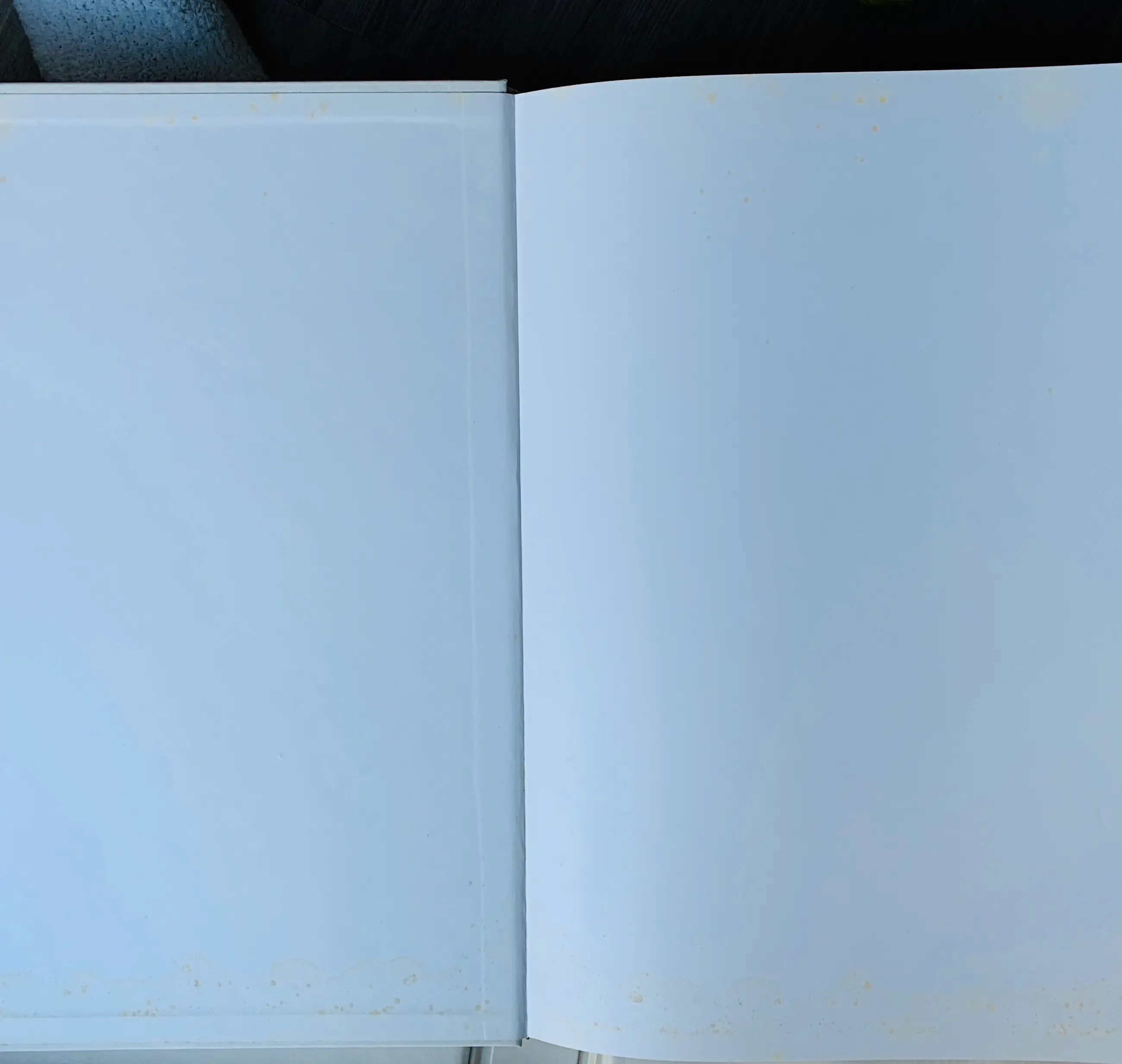 Binnenkant kaft heeft deukje door bronsje en enkele bladen hebben lichte vlekjes, zie foto.