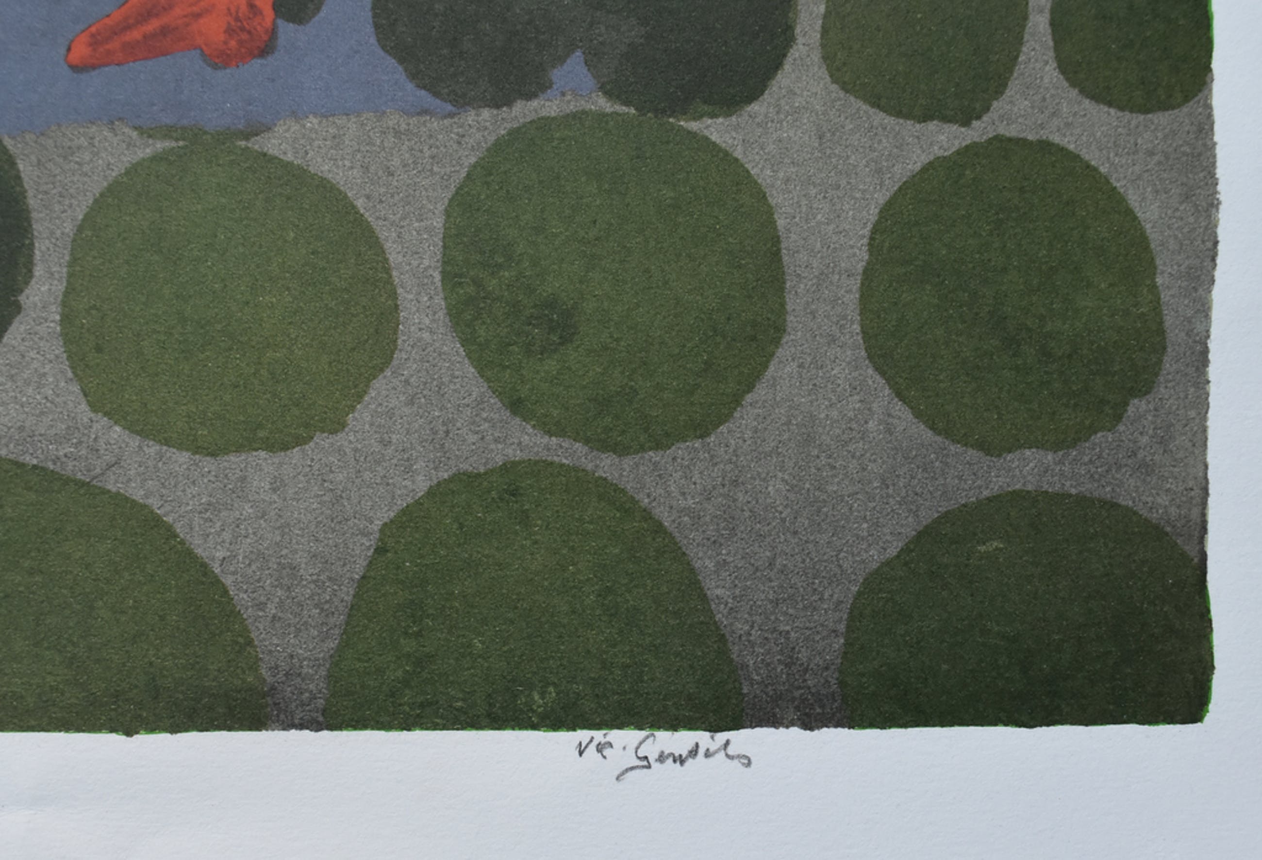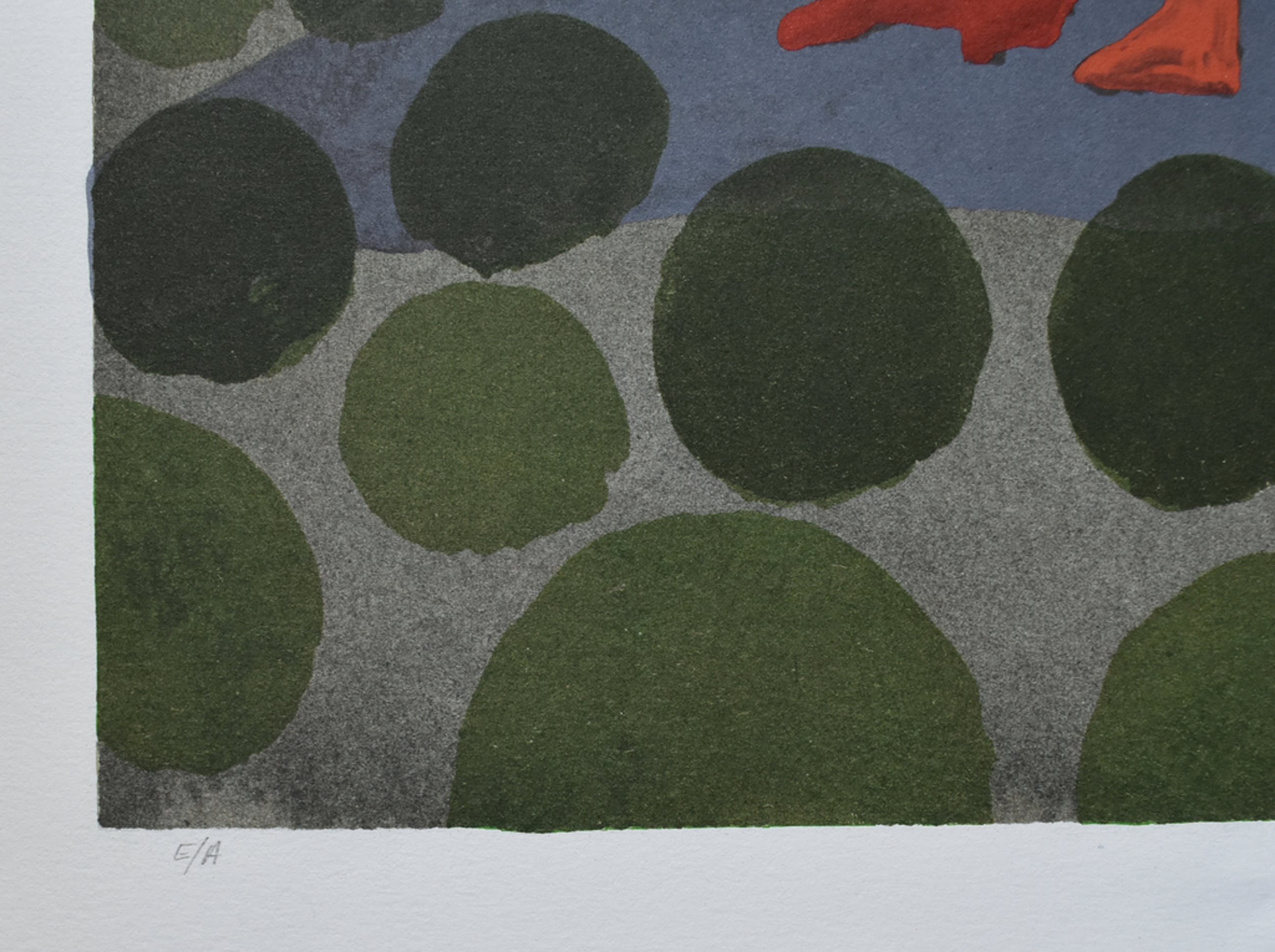 Groot formaat litho van Vic Gentils. Litho dateert uit ca. 1980 en stelt 4 geabstraheerde figuren voor in een landschap.