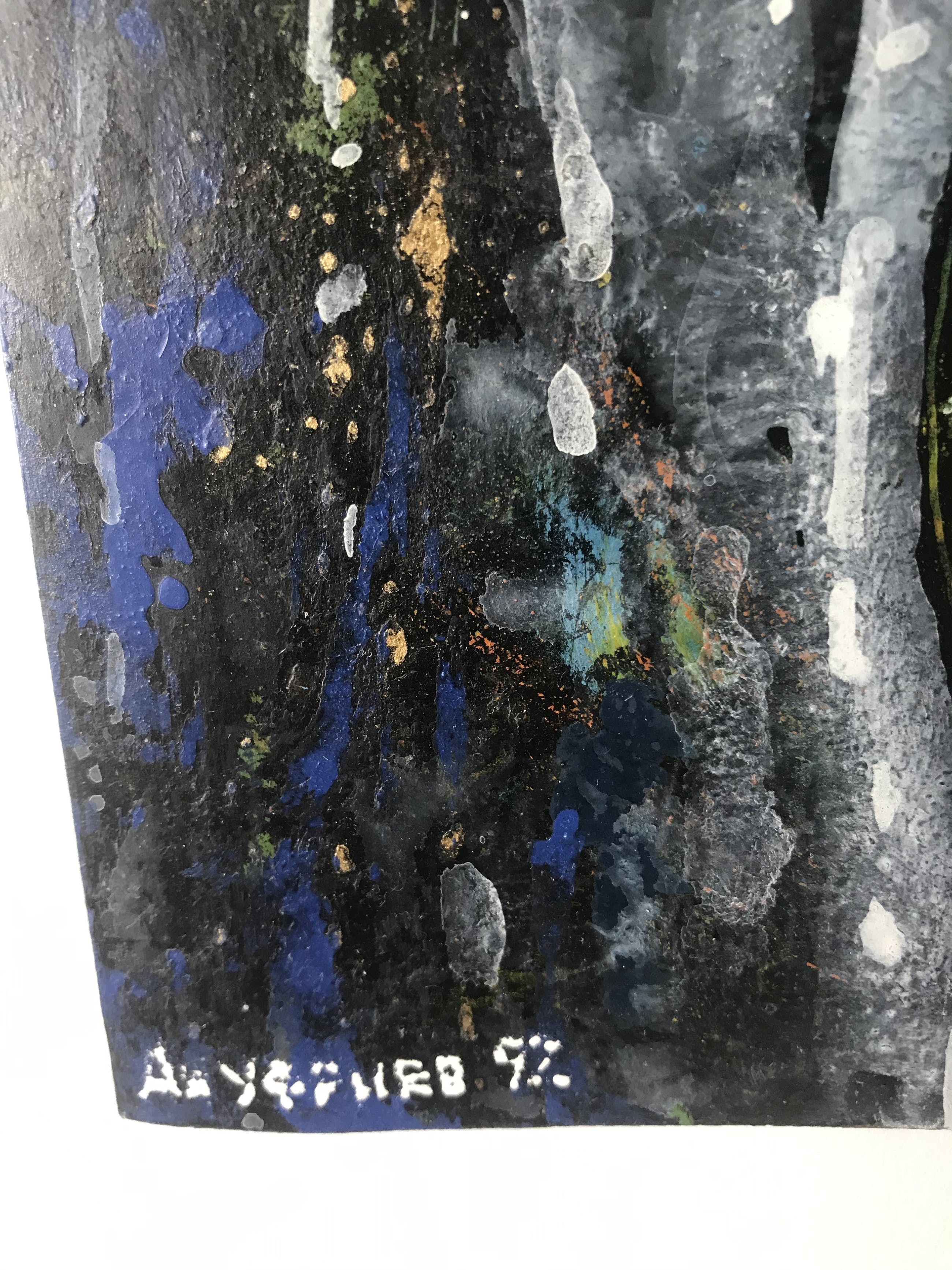 Anufriev’s opvallende techniek, samen met de verfijnde stilering leidt tot de bijzondere uitstraling van zijn werk. Zijn eigenzinnige composities, het opvallende kleurgebruik en de experimentele schildertechniek zijn typerend voor zijn altijd herkenbare, karakteristieke stijl. Of hij nu werkt op hout, op papier of linnen, de oud-Russische schildertradities vind je terug in al zijn werken.